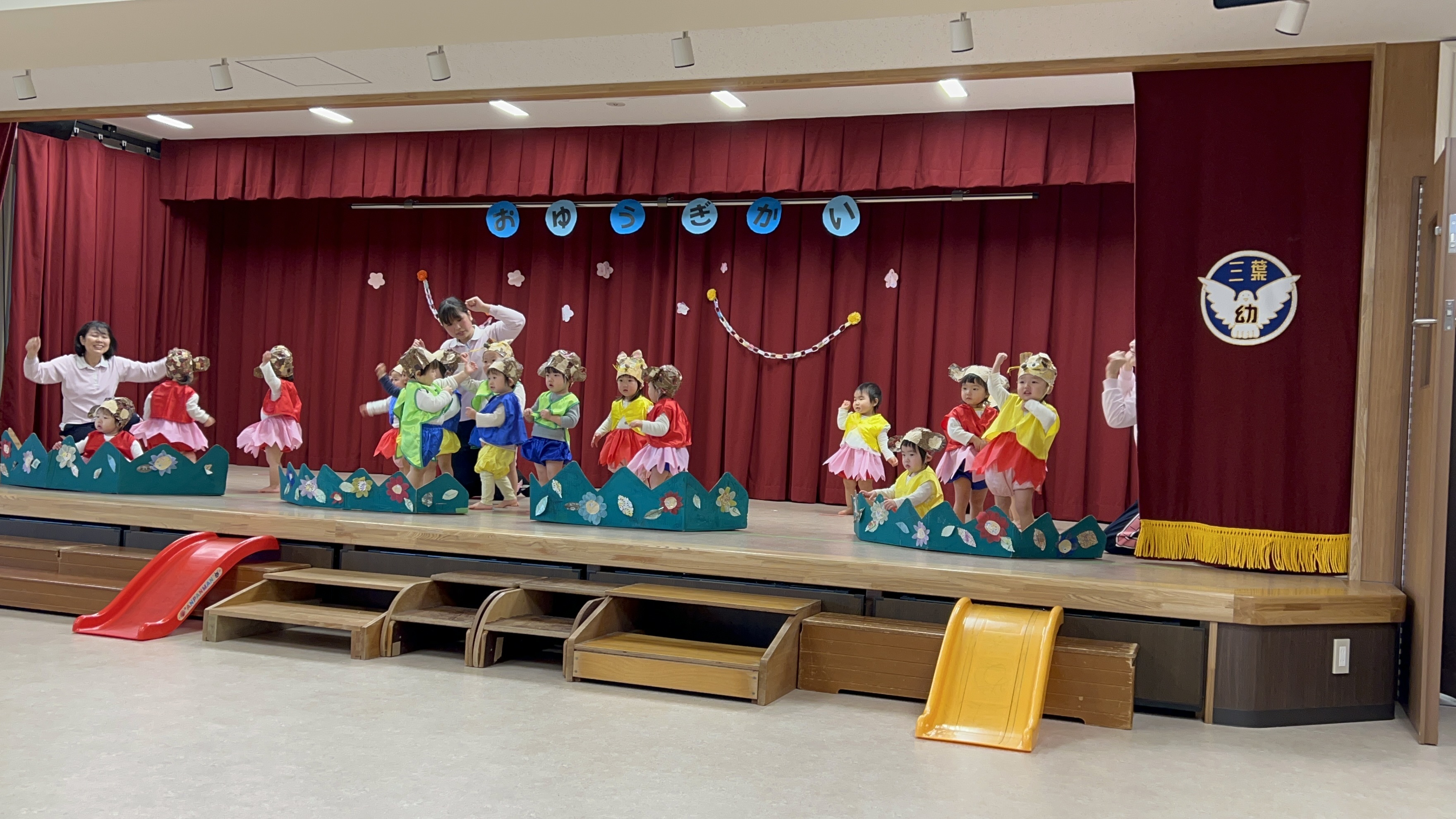 昨日から降り続いた雨から一転、天気も良く過ごしやすい気温の中、三葉幼稚園ひよこ組のおゆうぎ会が行われました。