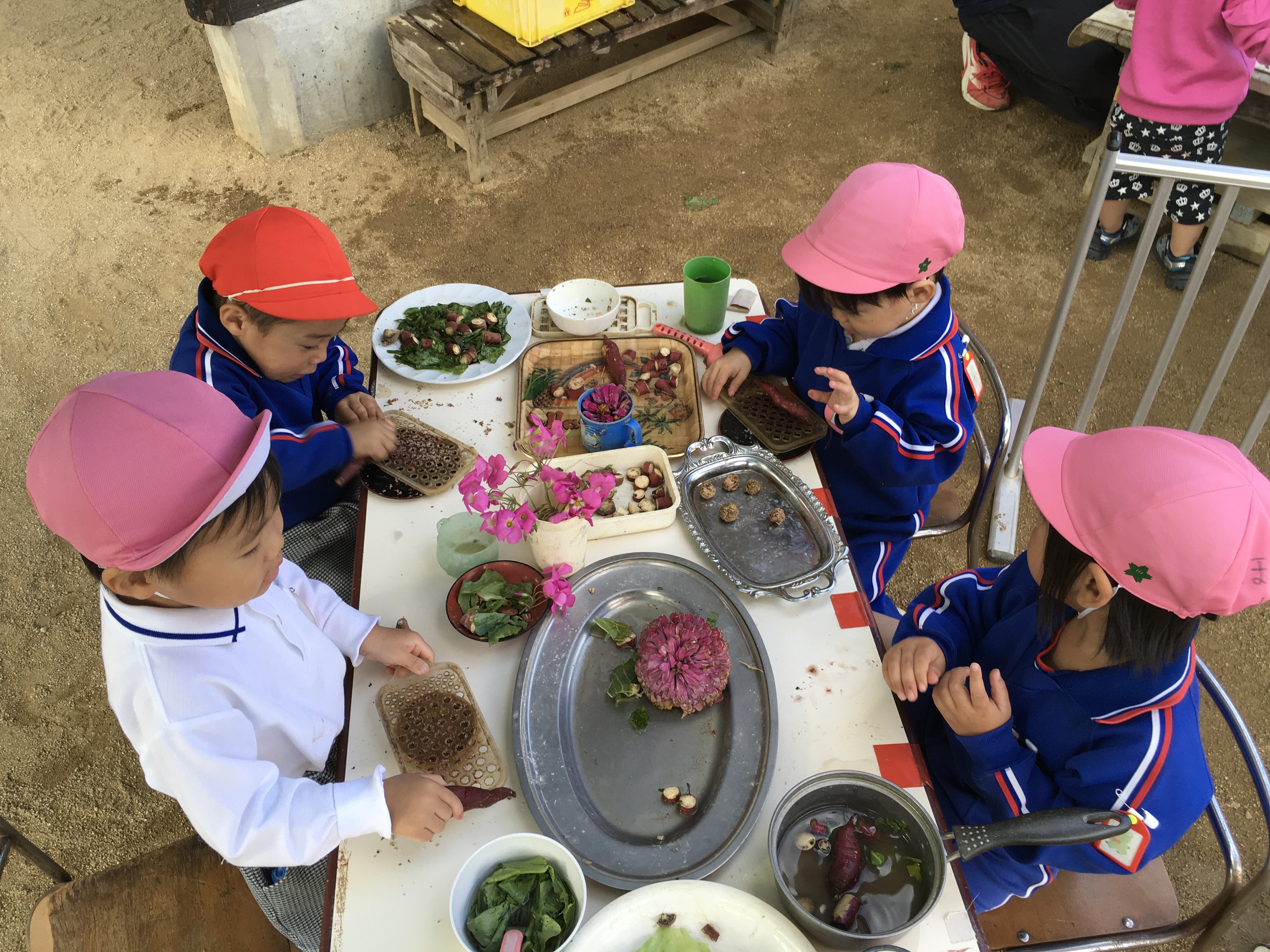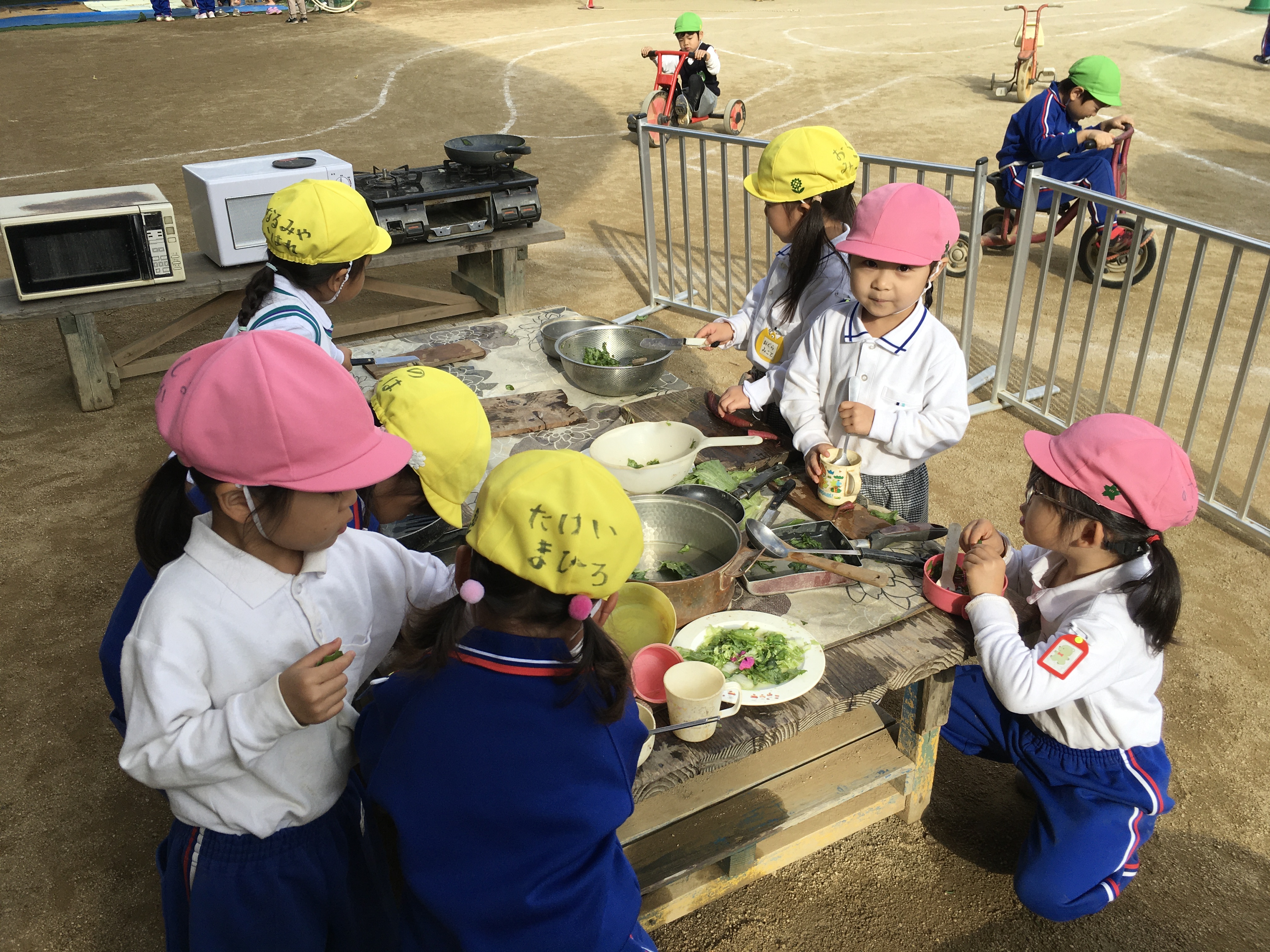 昨日までの暖かい天気とは打って変わって今日は少し肌寒い一日となりました。それと同時に秋になったなぁと感じる一日でもありました。朝、登園して戸外を見てまわると包丁ままごとの食材がさつまいも、チンゲン菜、白菜とすっかり秋。切ったり、すりおろしたり、大きい鍋も出てきていました。