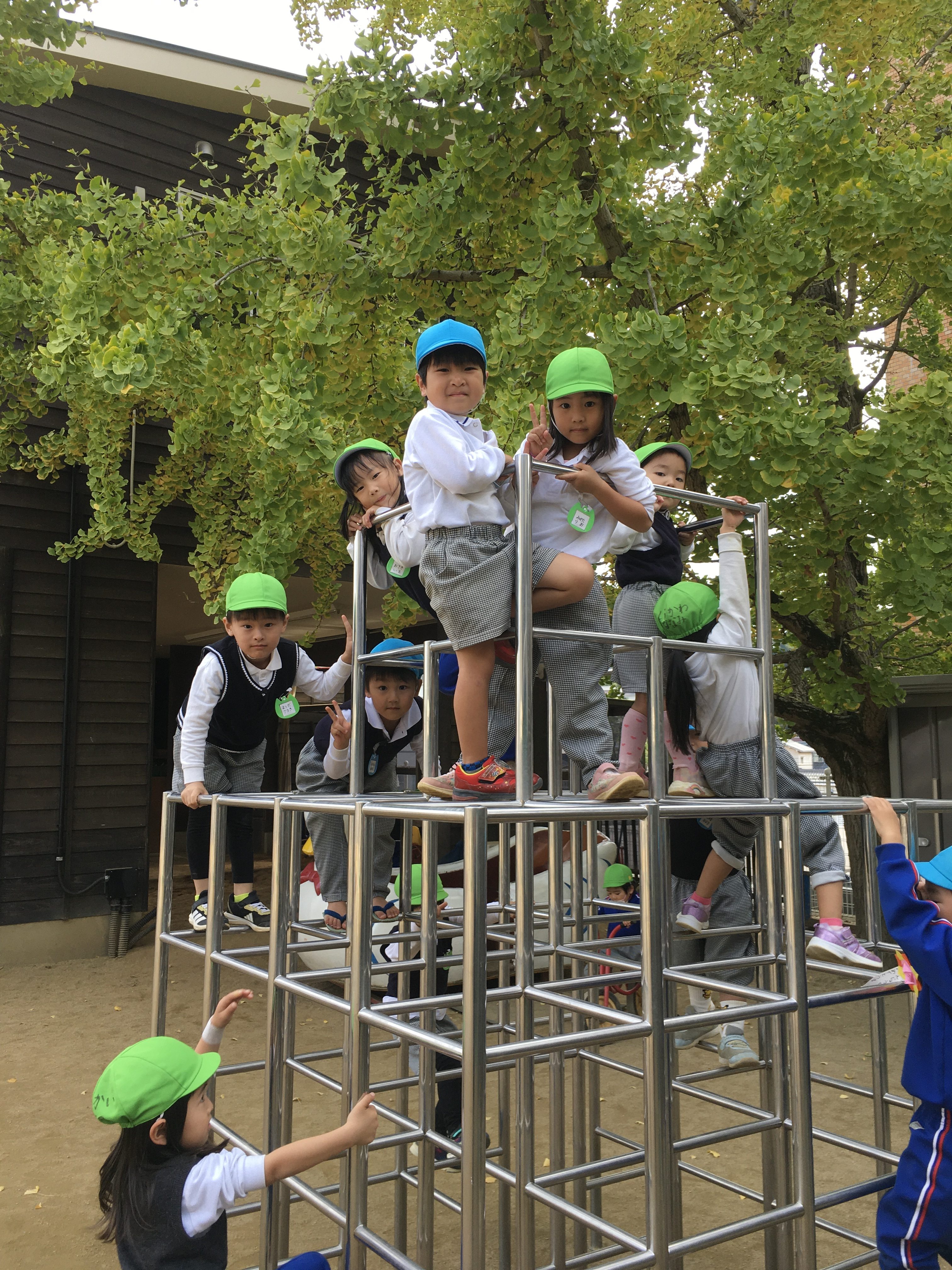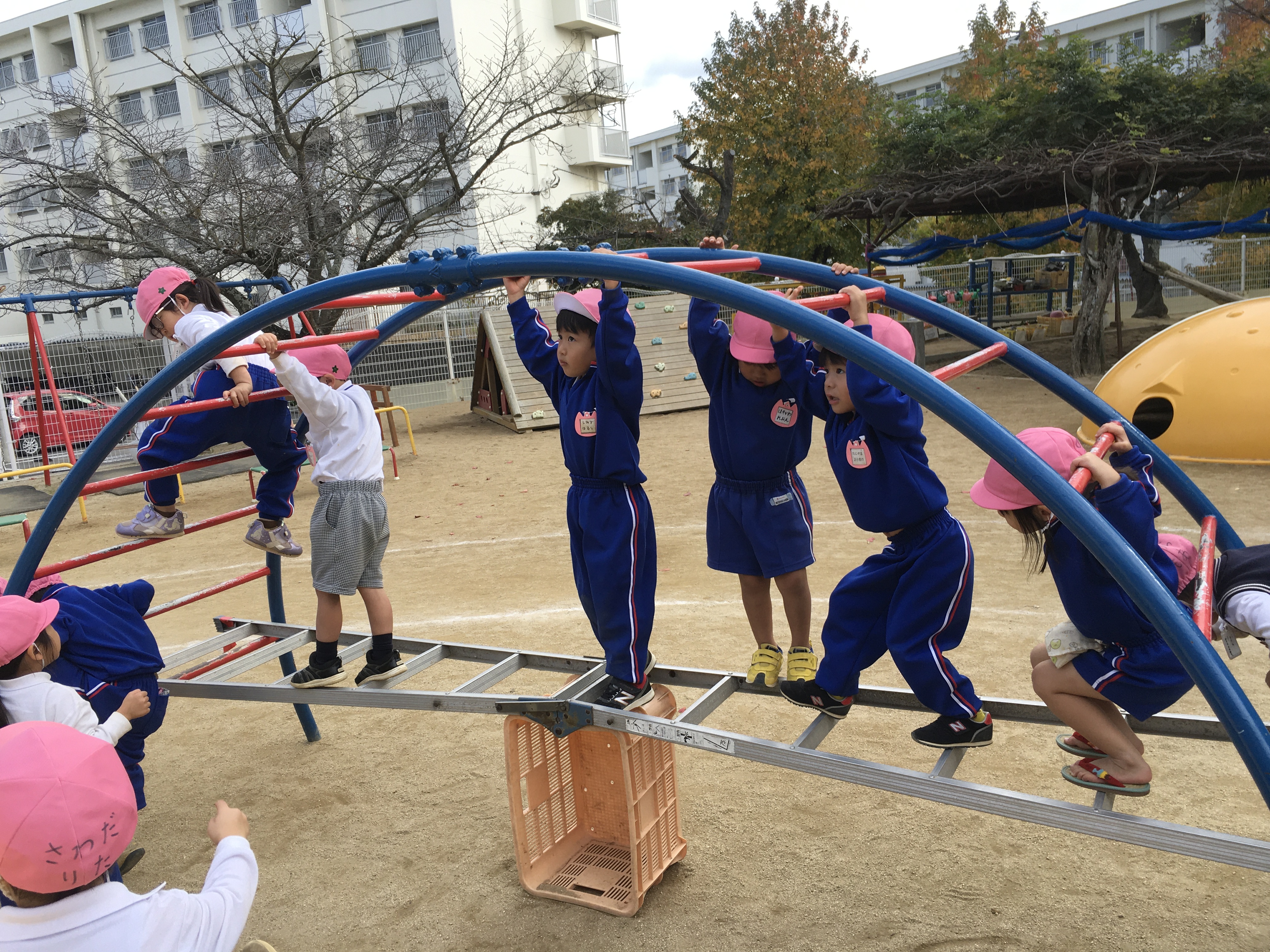 今日はちょっぴり肌寒い日となりましたが、外では、いつも通りの元気な子どもの声が響いていました。運動会を通して、体を存分に動かして遊ぶ楽しさを味わった子ども達にと園庭の中央にできたアスレチック、子ども達の様子に合わせてたいこ橋の下にはしごがついたり、途中に犬の滑り台が入ったり、柵を組み合わせて渡りながら移動できるようにしたり、・・・と考えられ、環境が少しずつ変化してきました。今日も平均台が2つ連なり、長くなっていました。子ども達は環境の変化に敏感で、アスレチックが変化していることにすぐに気付いて、楽しむ姿が見られました。そして経験して慣れてくると平均台をまっすぐに歩いていく子いれば、初心者は蟹さん歩きで渡っていきます。