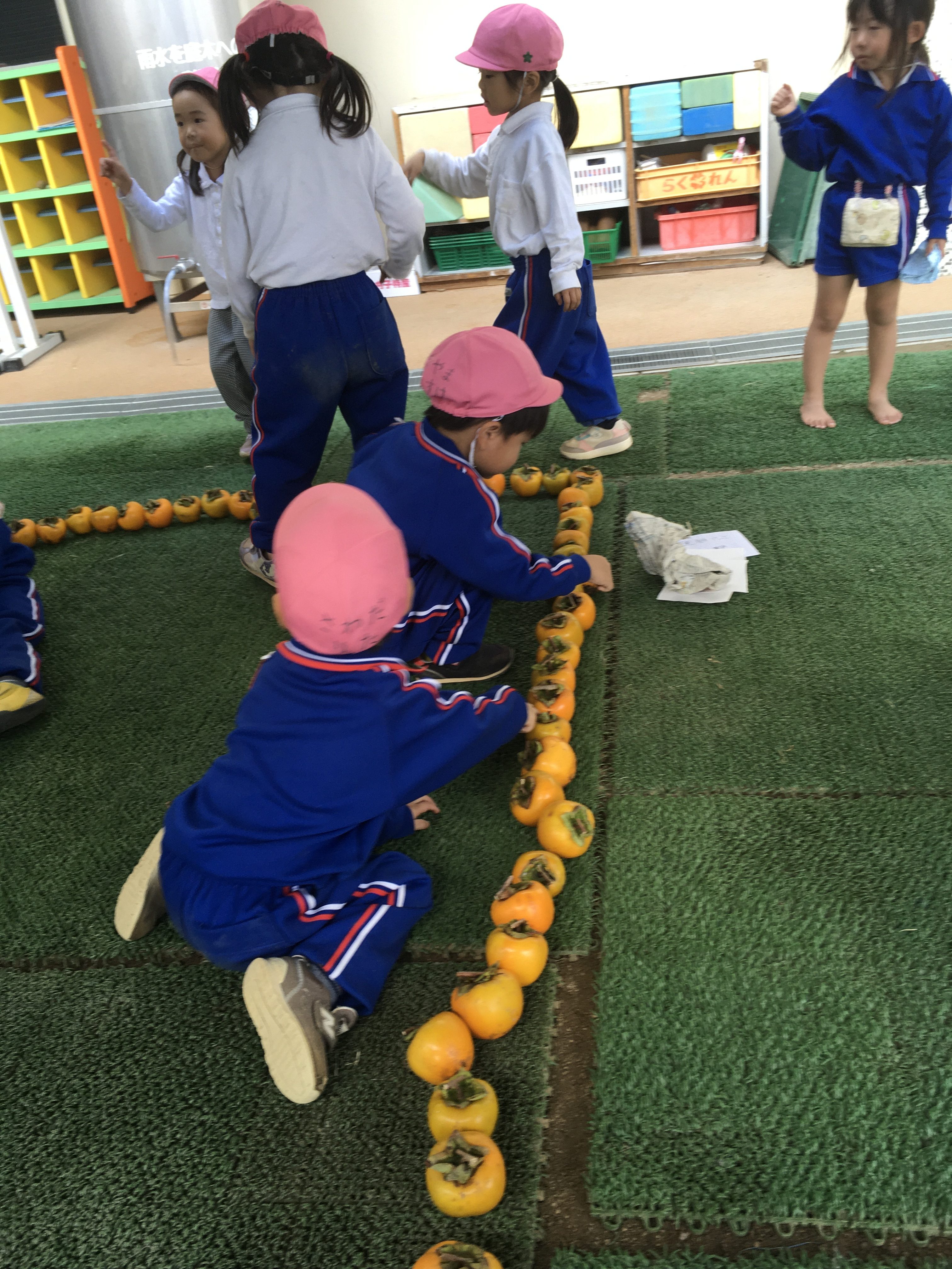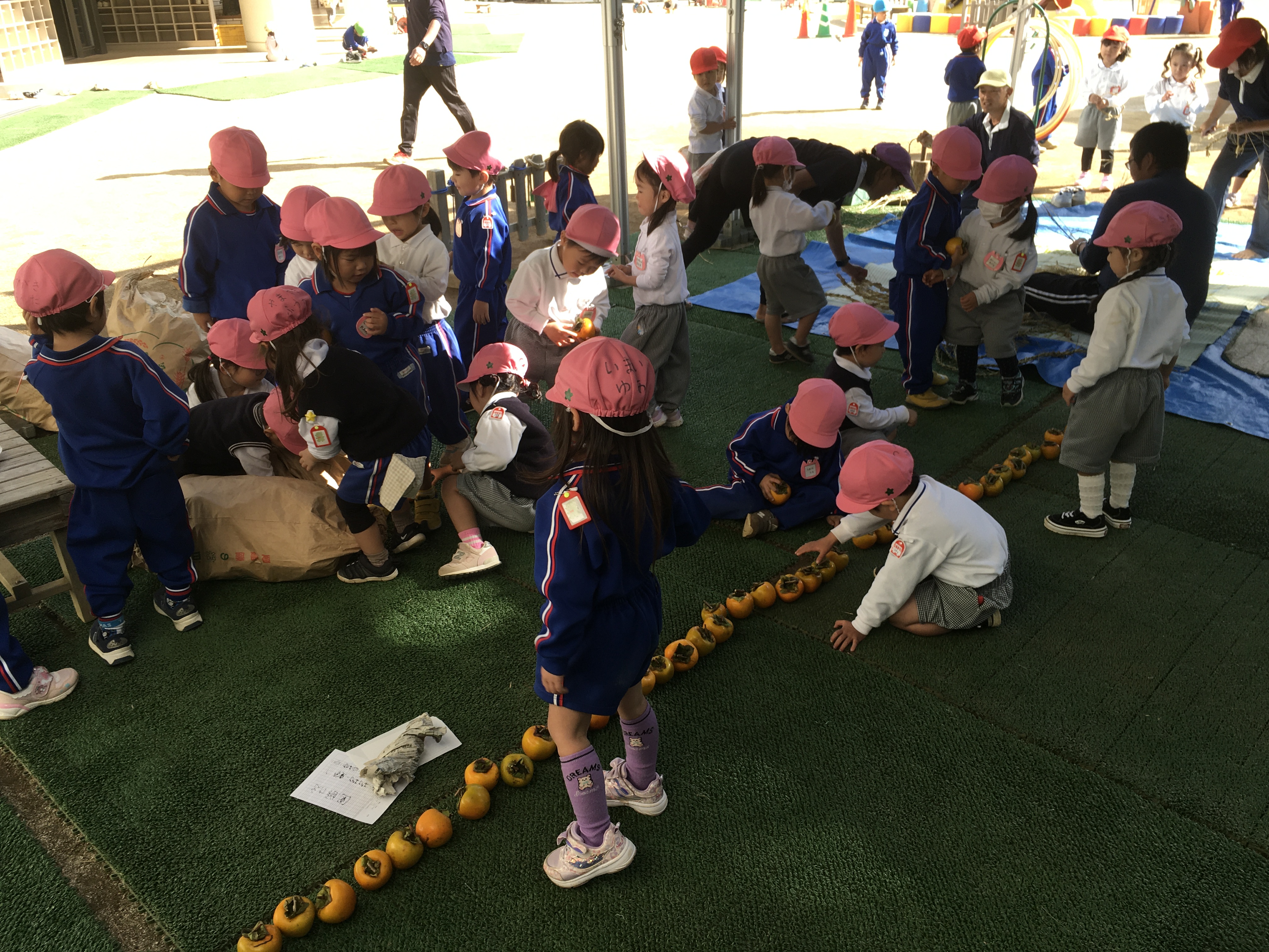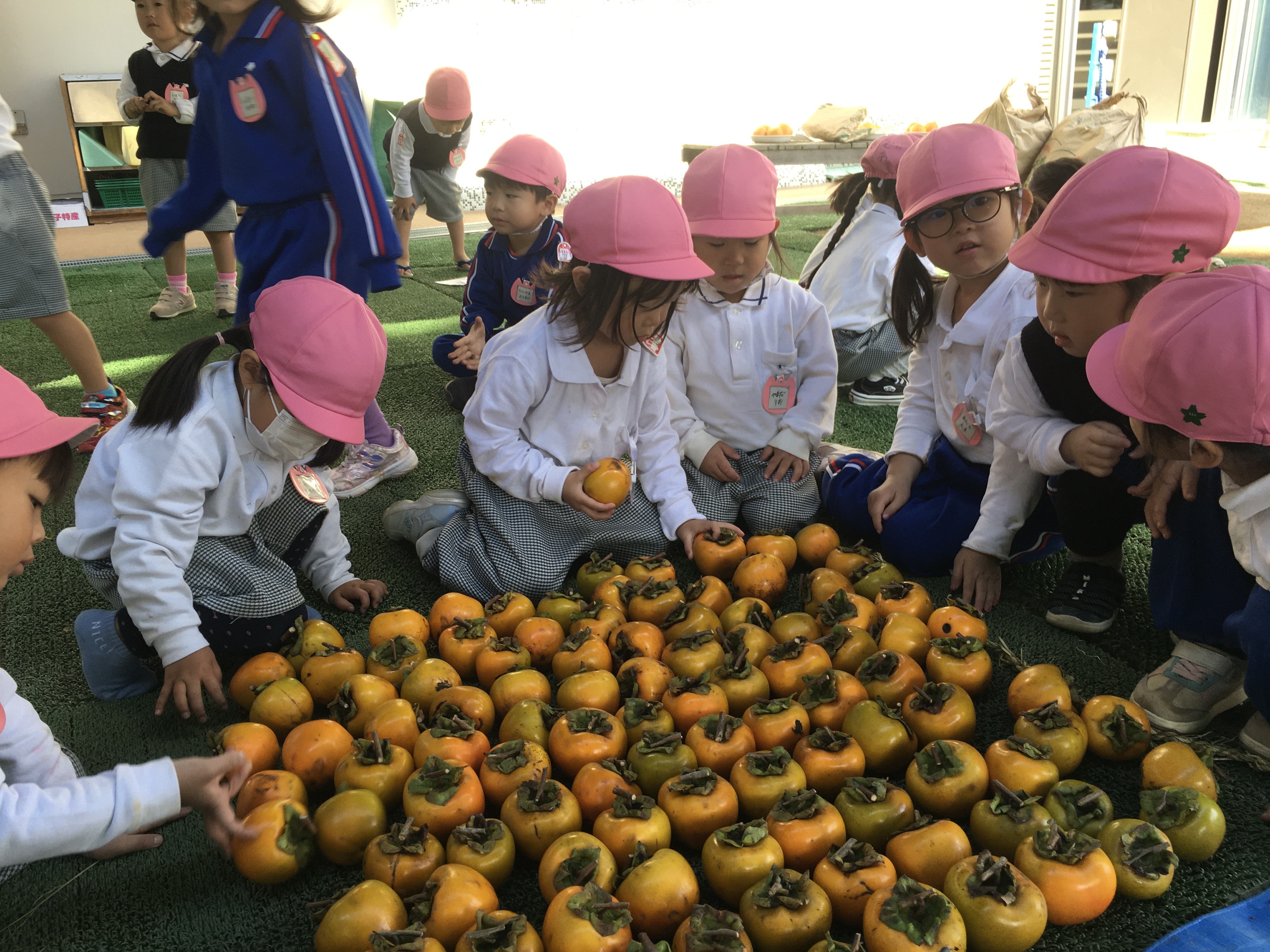 時間いっぱい戸外で遊んだあと、テント下に米袋が沢山置いてある事に気がついたさくら組の子ども達は「お米ー!!」と言いながら寄ってきてました。開けてみるとなんと柿がたーくさん入っていました。河野先生に「何個ぐらいあるんだろう?」と聞かれた子ども達は米袋から柿を1つずつ取り出し、並べ始めました。3歳児ですので10個ずつの固まりに並べるとかはできません。どのように並べていくのか見守っているとコの字のように並べてその中に子ども達が入っていました。「1.2.3.4」と10まで順調に数えていましたが10から18に飛んだり、25から34に飛んだり、年少児らしい光景に自然と笑みがこぼれました。最後「60個あるー!!」と言っていたさくら組の子達ですが教師と数えると100個ありました。この柿は、預かり保育の森さんが高知県から採って来てくれた渋柿です。米袋に100個の渋柿が5袋!!何と500個もあります。明日から少しずつ三葉伝統の干し柿作りが始まりそうです。