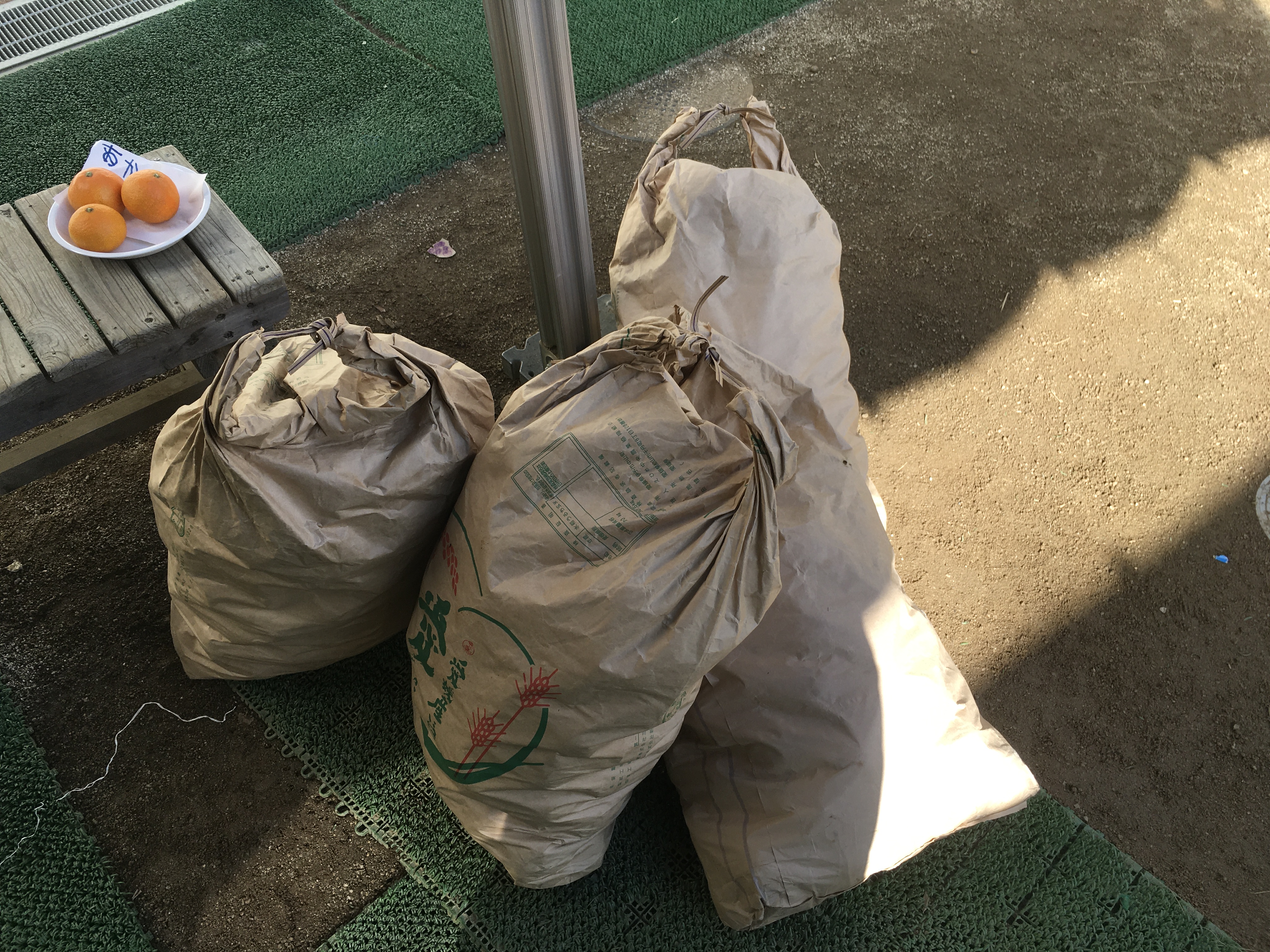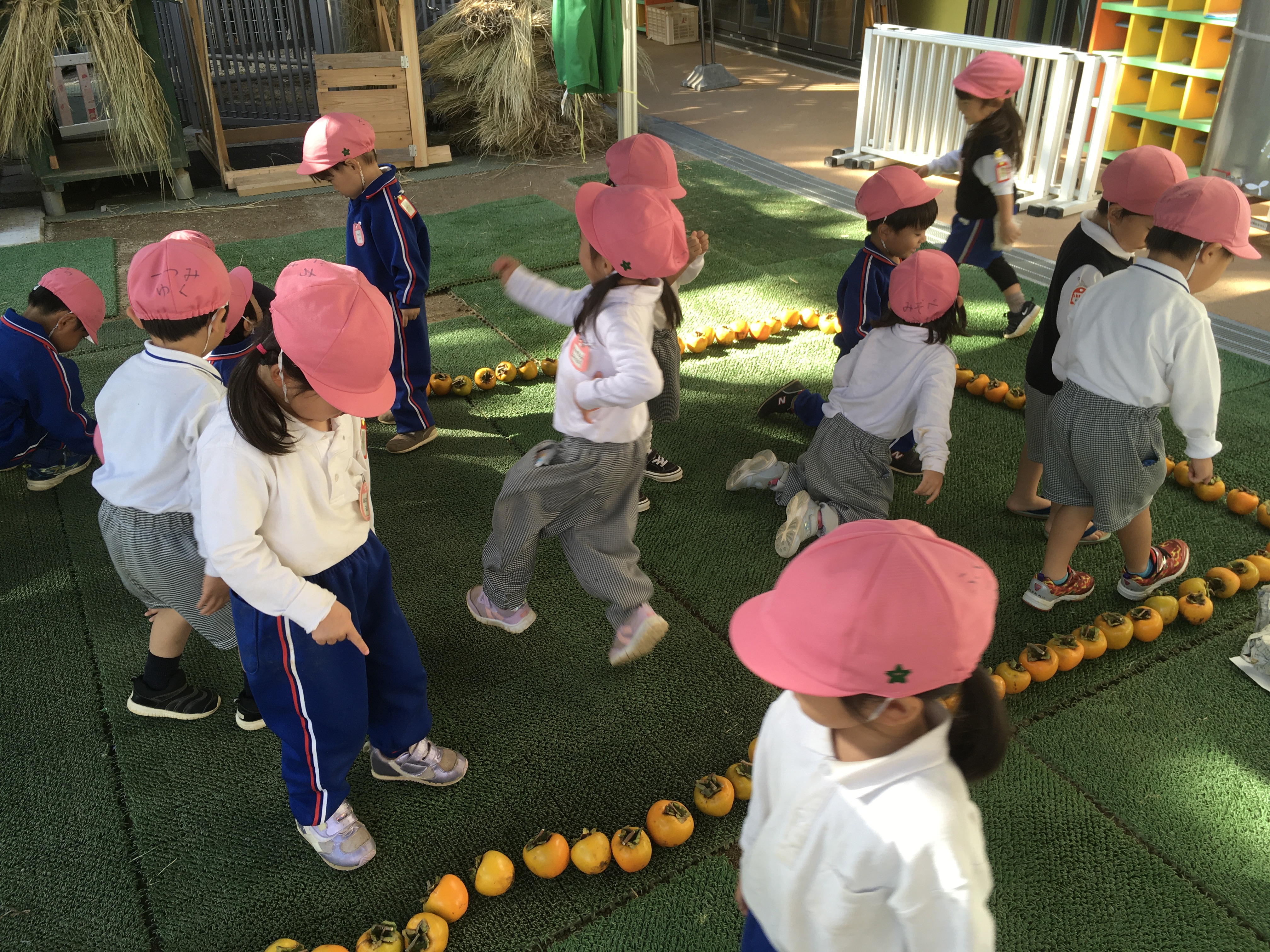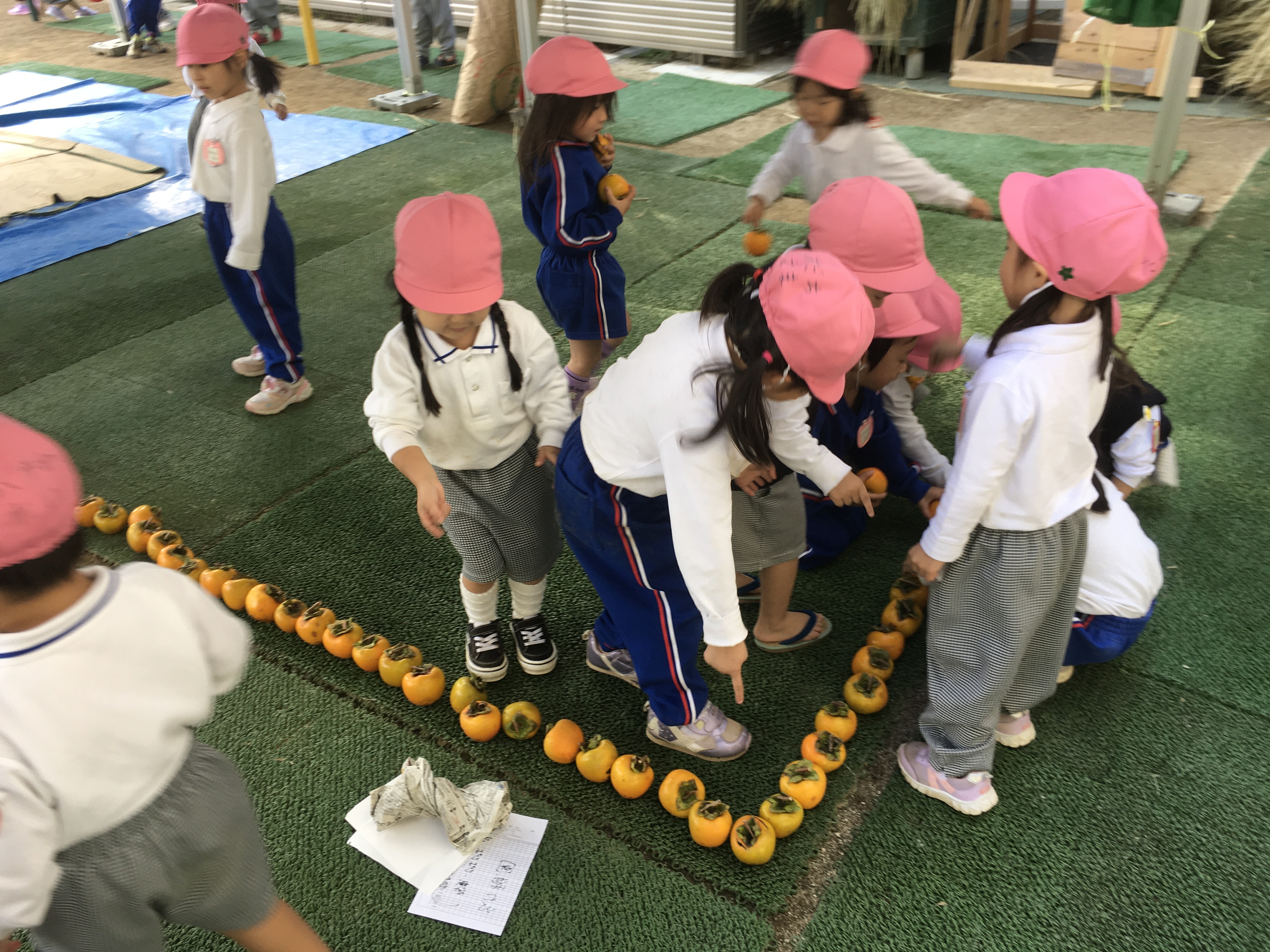 時間いっぱい戸外で遊んだあと、テント下に米袋が沢山置いてある事に気がついたさくら組の子ども達は「お米ー!!」と言いながら寄ってきてました。開けてみるとなんと柿がたーくさん入っていました。河野先生に「何個ぐらいあるんだろう?」と聞かれた子ども達は米袋から柿を1つずつ取り出し、並べ始めました。3歳児ですので10個ずつの固まりに並べるとかはできません。どのように並べていくのか見守っているとコの字のように並べてその中に子ども達が入っていました。「1.2.3.4」と10まで順調に数えていましたが10から18に飛んだり、25から34に飛んだり、年少児らしい光景に自然と笑みがこぼれました。最後「60個あるー!!」と言っていたさくら組の子達ですが教師と数えると100個ありました。この柿は、預かり保育の森さんが高知県から採って来てくれた渋柿です。米袋に100個の渋柿が5袋!!何と500個もあります。明日から少しずつ三葉伝統の干し柿作りが始まりそうです。
