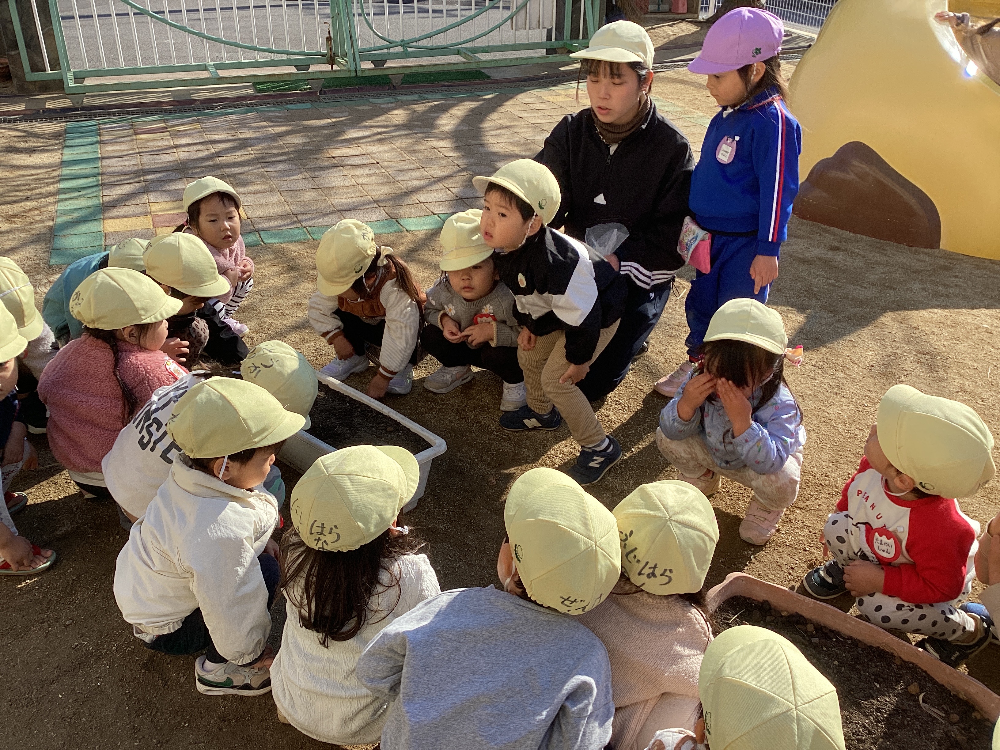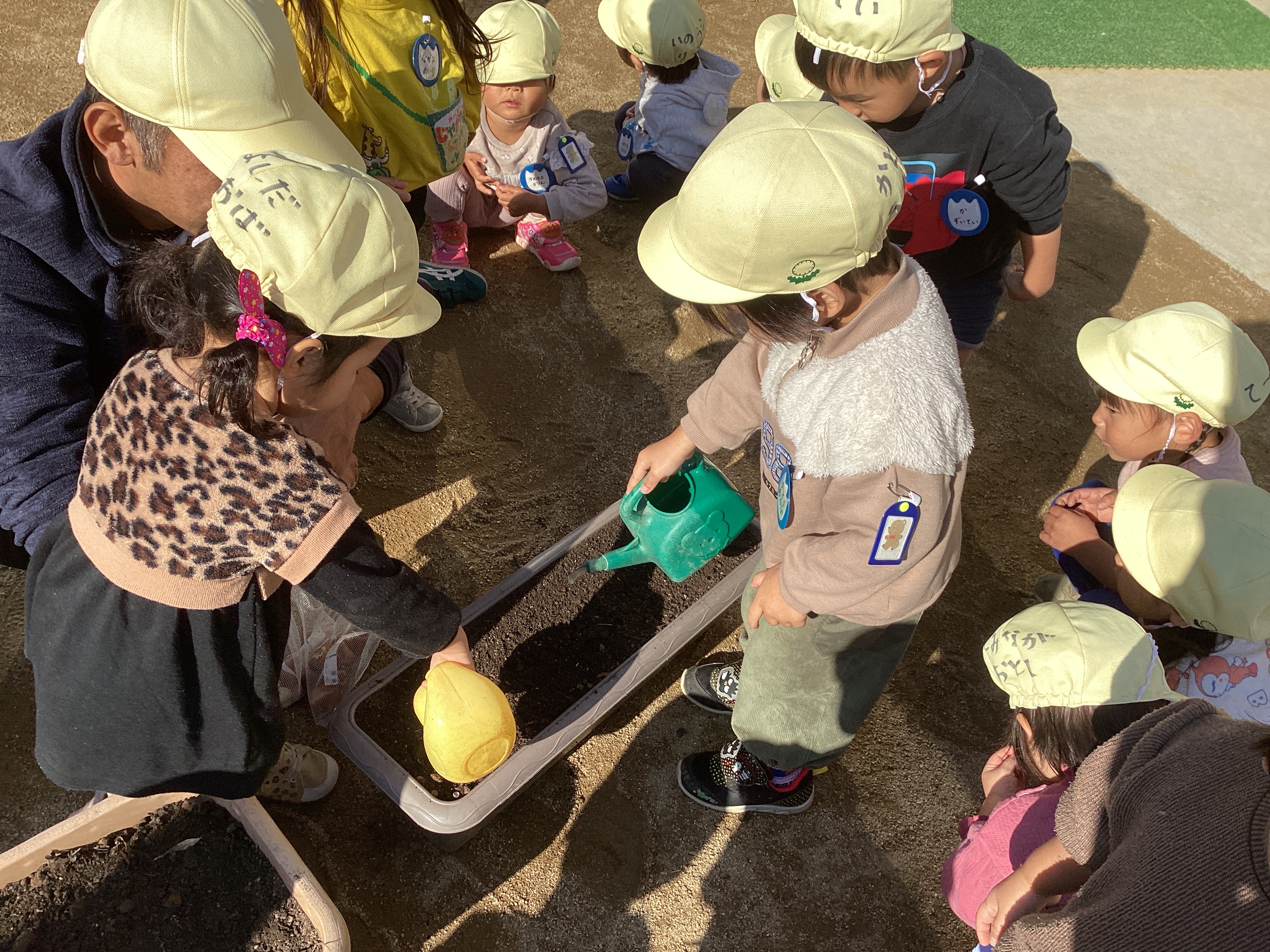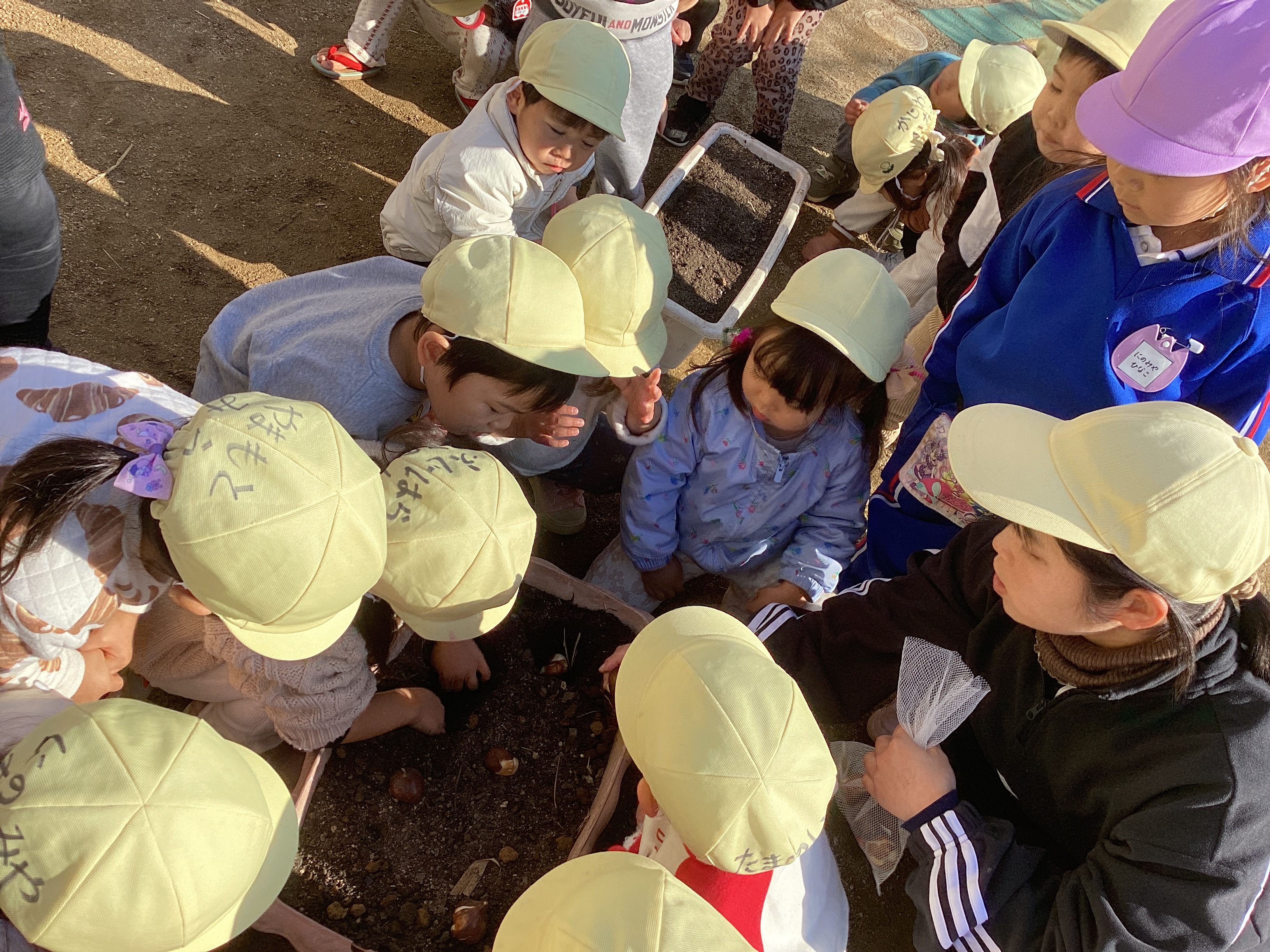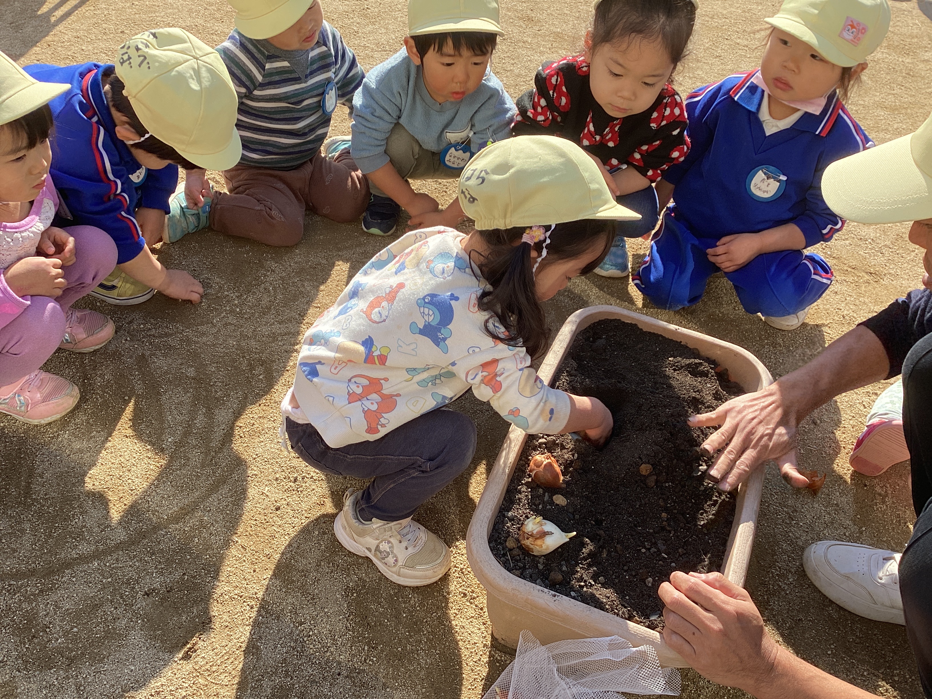 「球根に付いている皮は、みんなの服と同じだから剥いたら寒くなるのでそのままで植えてあげてね。そして、球根のとんがっているところを上にして穴に置いて土のお布団を優しくかけてあげてね。土を被せたら手でギュッギュッと押えないでね。みんなも頭を押さえられたら痛いでしょ?水はたくさんあげなくていいよ。みんなもお水をいっぱい飲んだらしんどくなるでしょう?」とたんぽぽ組でも分かるように説明してくれました。Hちゃんは昨日球根を植えたのですが、その時の事を思い出しながらたんぽぽ組に教えてくれていたのです。教師顔負けの説明の仕方に私たちも驚きまた感心させられました。その後無事に球根を植えることができました。Hちゃんありがとう!!