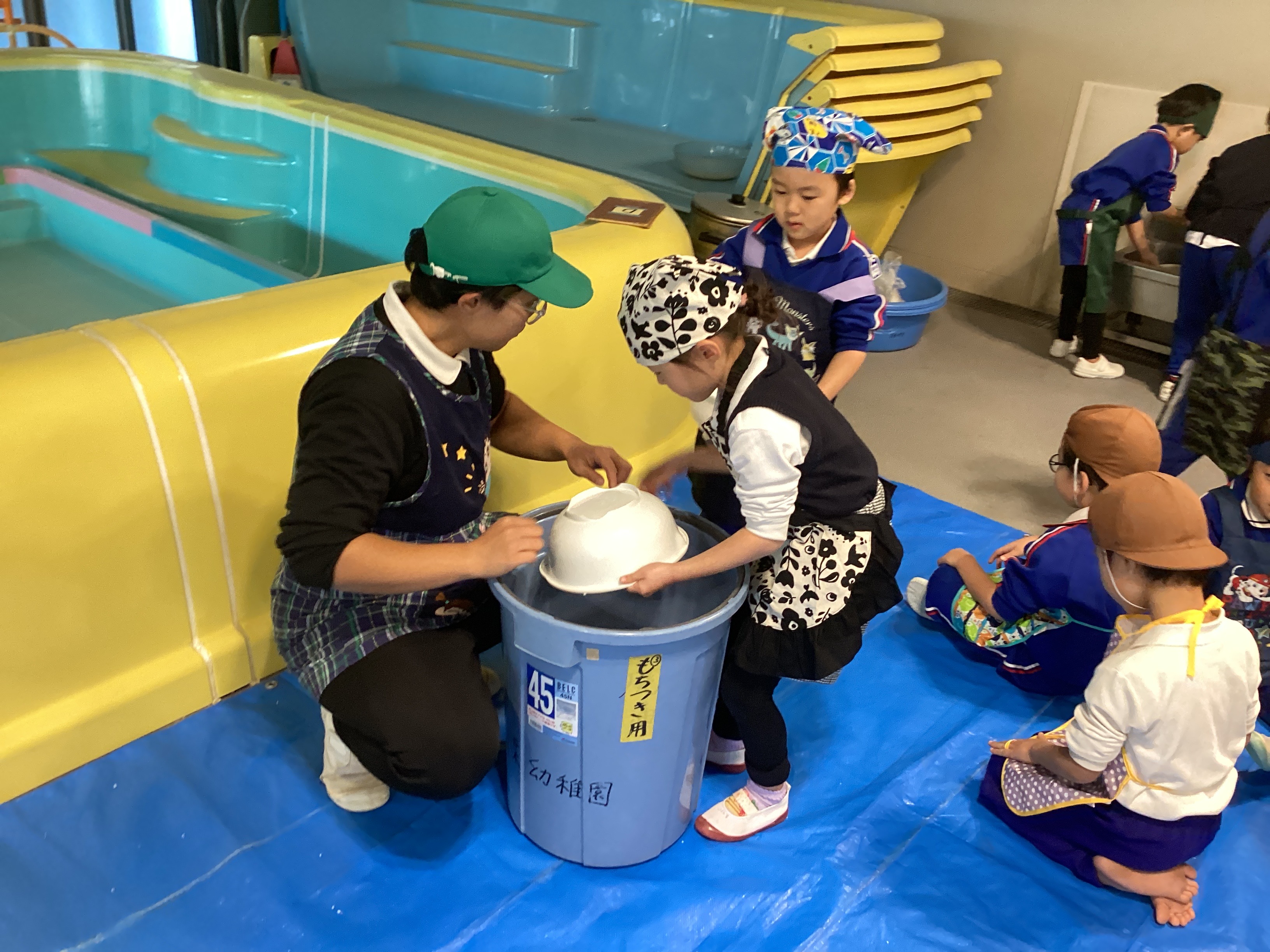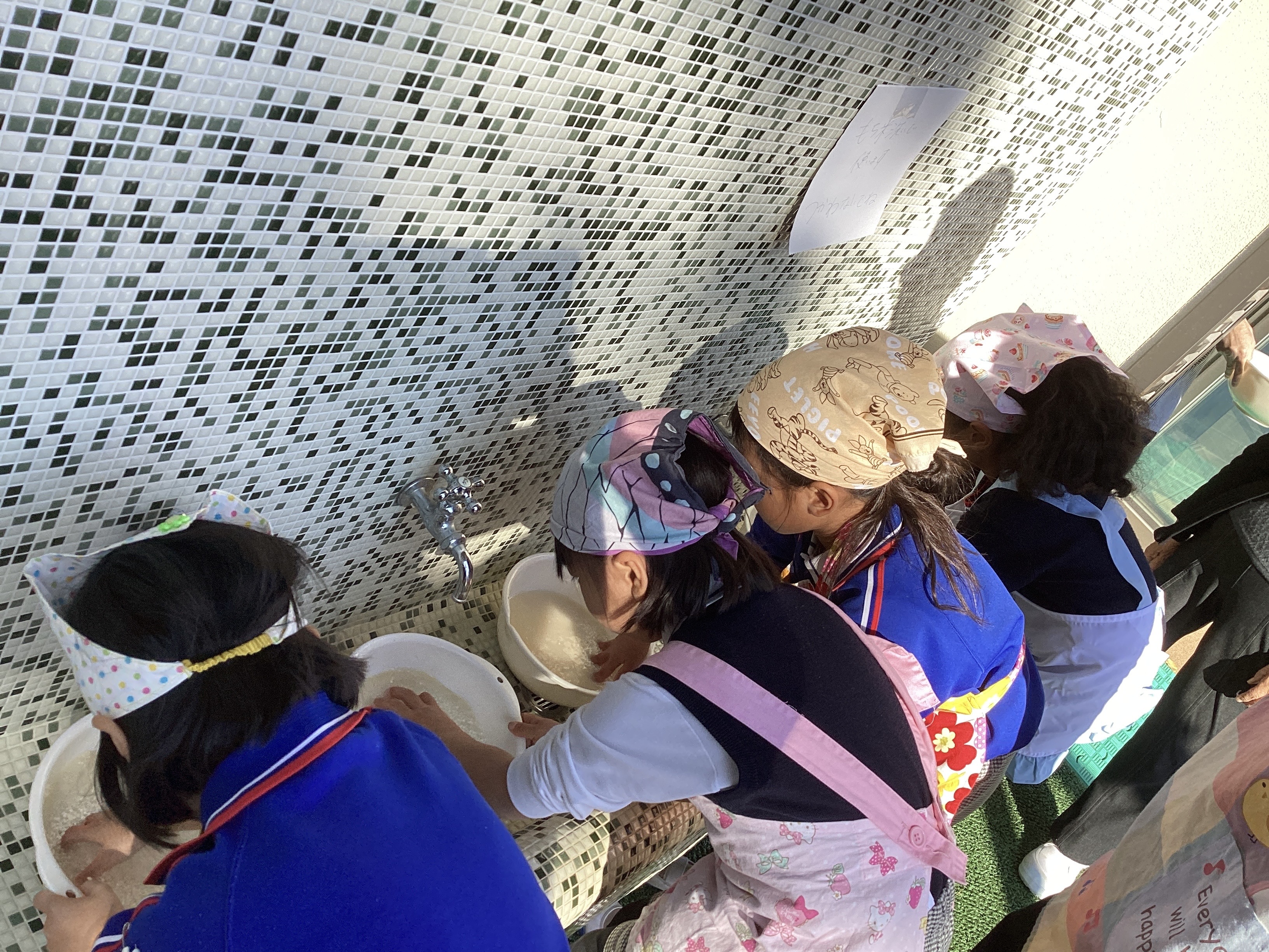明後日もちつきがあるということで、年長組が忙しく準備を始めました。そうです!毎年恒例のもち米洗いです。子どもたちは、昨日から水に浸けておいたもち米と今日水を入れたもち米を見て、ずっと水に浸していたもち米が膨らんで量が増えていることに気付きました。