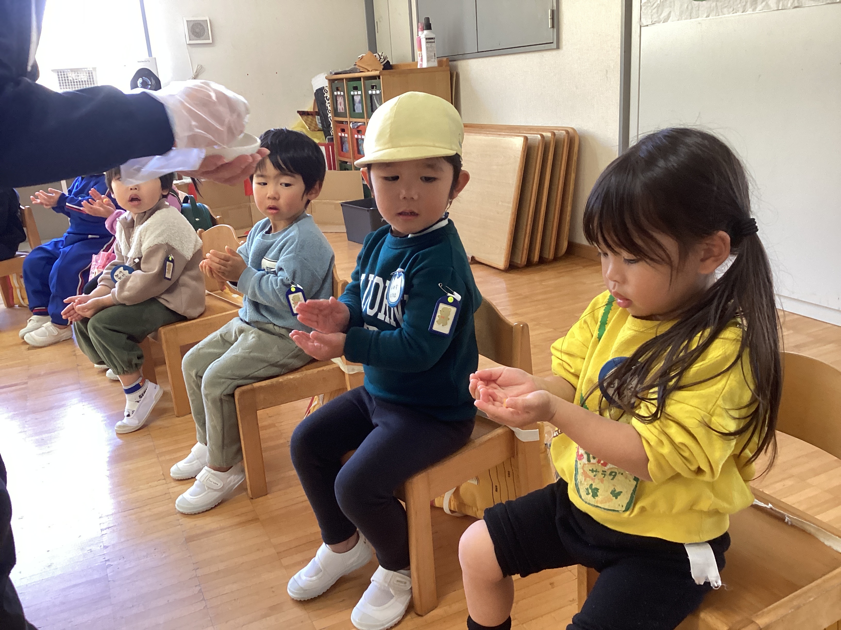 登園してきたたんぽぽの子どもたちとシール帳などの片付けをしていて、ふと新園舎に目を向けるとちゅうりっぷぐみのベランダで古森先生と子どもたちが何やらしていました。気になって様子を見に行ってみると食べごろな干し柿を前に話をしていました。しかし、そこにいた年長児の口がモグモグと動いていたように見えたので、口の動きをよく観察してみると食べた種周りについている実を味わっていたのでした。その様子に気がついたのは自分だけではなく、下の園庭で遊んでいる子どもたちも気が付いていたのです。楽しいことを嗅ぎつける嗅覚はさすがみつばっ子!!園庭の芝生のところで「柿食べたーい」と手を出している子どもたちにも分けようと餅まきならぬ干し柿まきが始まりました。上から落としてくれる干し柿を教師が受け取り、またおいしそうな干し柿を探しては教師に渡しを繰り返しました。そして干し柿を受けった教師の周りにはそれを察した子どもたちが集まり小さな集まりがたくさん出来ていました。その様子を見ていた古森先生から縄ごとクラスに持っていき分けたらと言ってもらったので、各クラスで取りに行くことになりました。教師と一緒に二階のベランダに行った来た子どもたちは、すぐに干し柿を数え「八個あるよ!」「こっちは九個ついてる!!」と一つでも多くそして大きくて美味しそうな干し柿を見つけては嬉しそうに各クラスへ持って帰っていきました。部屋に戻り青組の子どもたちに伝えに行くと「干し柿いるー!」「いっぱい食べる!!」と大喜びしていました。代表の子どもと選んだ干し柿を持ち帰ると「Aちゃんこれがいいな」「僕これやけんね!」と早速自分が食べたい干し柿を選んでいました。昨日食べた干し柿がよっぽど美味しかったようです。