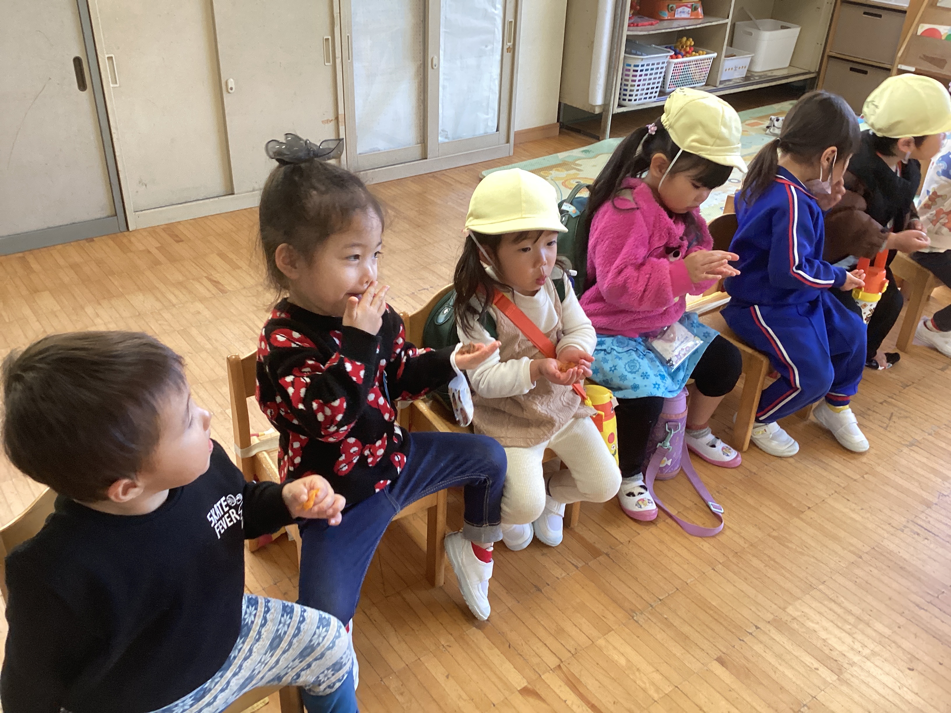 昼食後、先月渋柿の皮をむいて干しておいた干し柿が食べられるようになっているということで、クラスに持ち帰り少しずつ分け合って味見してみました。干す前の渋柿と干し柿を両方食べた子どもたちはどちらの柿も「甘~い!」と言って食べていたのですが、渋柿は口の中で渋味が残りザラザラするので干し柿の方がおいしかったとニコニコして「また食べたい!!」と言っていました。お正月が終わったら食べられるから楽しみにしていてね!!太陽さんおいしい柿を作ってくれてありがとう!!