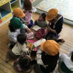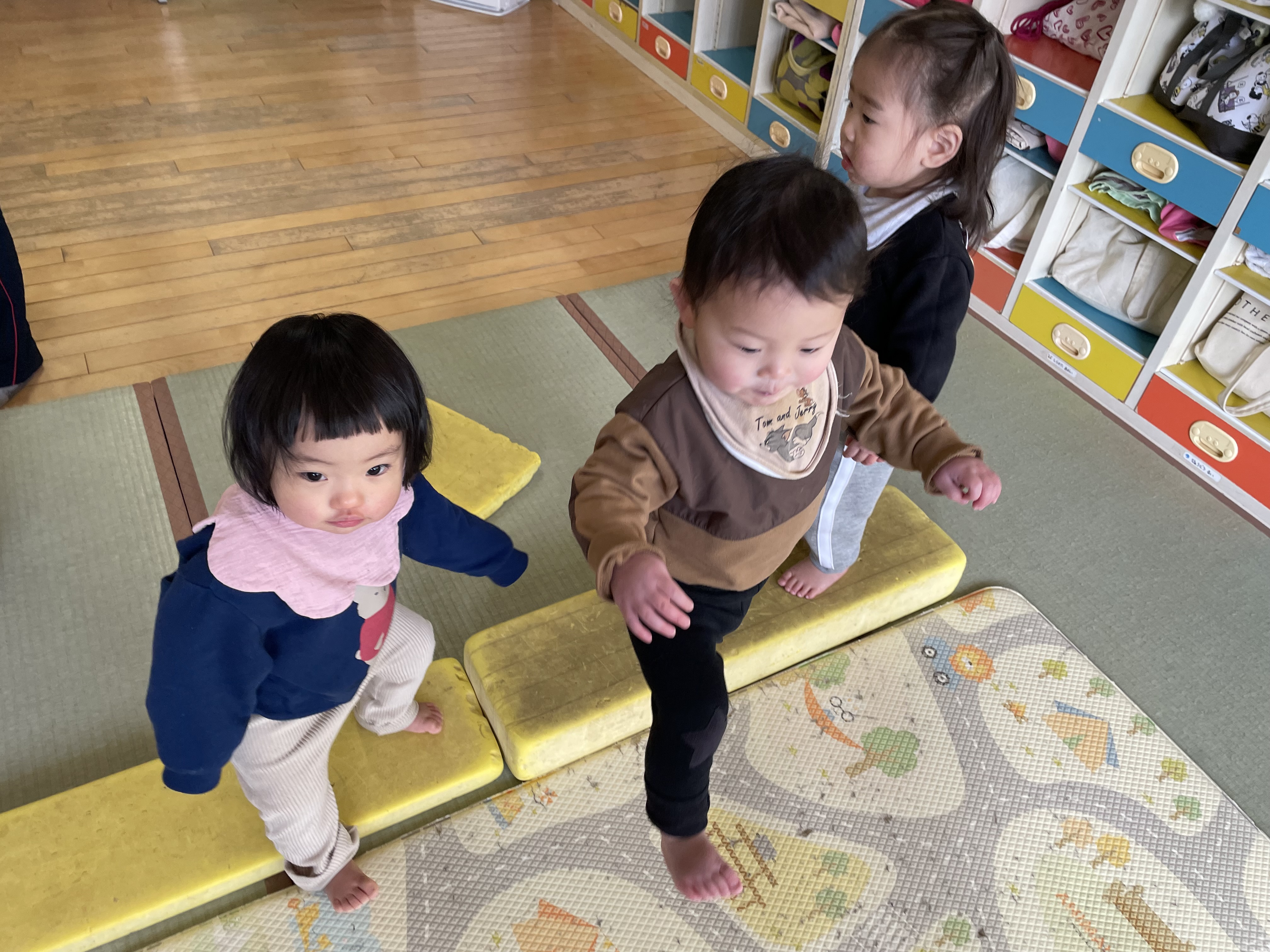 体を動かす事が好きな子どもたちに大型積み木を平均台の様に歩いてもらおうと部屋の隅に積み上げていると、それに気が付いた子が1個づつ運び始めました。それを見た他の子たちも運んできて並べていきます。そして、チョコンと並ぶように座ったので手遊びの曲をかけてみると、立っていた子もどうにか座り、手遊びを一緒にし始めました。気が付くと、どうやら先生役らしい子も出てきて、保育園ごっこになっていて微笑ましい場面を見る事が出来ました。言葉がはっきり出るようになった子もたくさんいて、上手に歌を歌いながら手遊びをしている姿を見ていると、自然と笑顔になります。やっと1歳になった子たち、そして2歳のお兄ちゃん・お姉ちゃんになった小さな子どもたちですが、いろいろな事を考えやってみようとして発達していく姿はたくましく思えます。友達と関わりながら遊ぶ事が増えている分、トラブルが沢山見られるようになりますが、その場面場面を見守ったり仲裁に入ったりしながら、友達と関わって遊ぶ事の楽しさを感じさせ、その中でおもちゃの貸し借りやルールの大切さに気付かせて楽しく過ごす事が出来るようにしていきたいと思います。昨日出来なかった事が次の日には出来るようになっている発達、成長が著しいこの時期の子どもですが、その形は様々です。一人一人の発達の姿を大切に過ごしていきたいと思います。