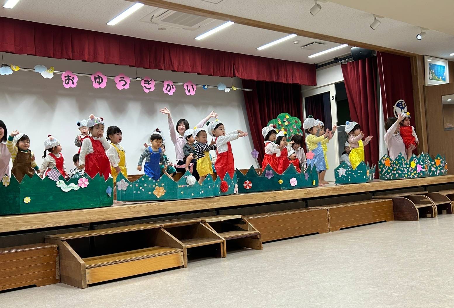 “親子の踊り”はお父さん、お母さんとたくさんスキンシップを取りながら、とても可愛いく踊る事ができました。「ぴよピヨ行進曲」の止まる所では「ピタッ」と言いながら笑顔で止まると、ジャンプしたり、抱っこでグルグル回してもらったり、追いかけっこをしてとても嬉しそうな子ども達でした。「おたまじゃくしの体操」では、れもん組はお父さん、お母さんに教えてあげているのかな?と思える位に堂々と踊っていて、最後のカエルになる所はとても可愛いカエルがたくさんいました。