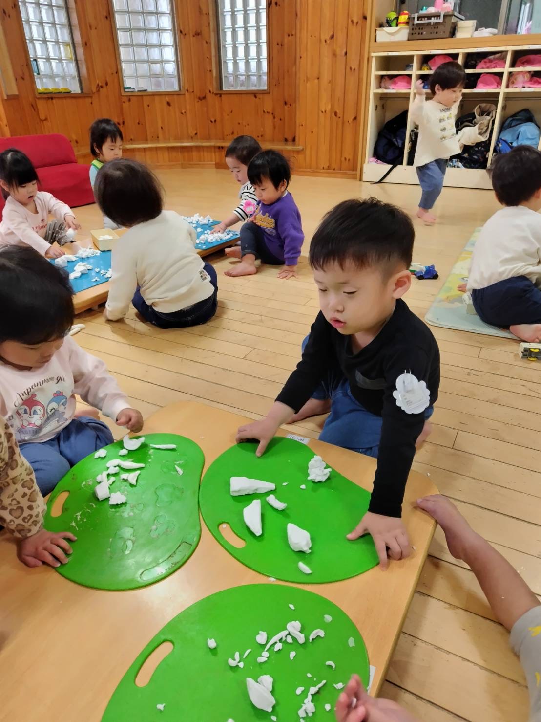 言葉遊びを楽しみながら、身体を動かしたり、手先を使ったあそびを取り入れたりなど、様々な工夫をしながら、身近な物を使った遊びを取り入れ、日々の保育を変化させながら、子ども達の「できた!」を増やしていきたいと思います。