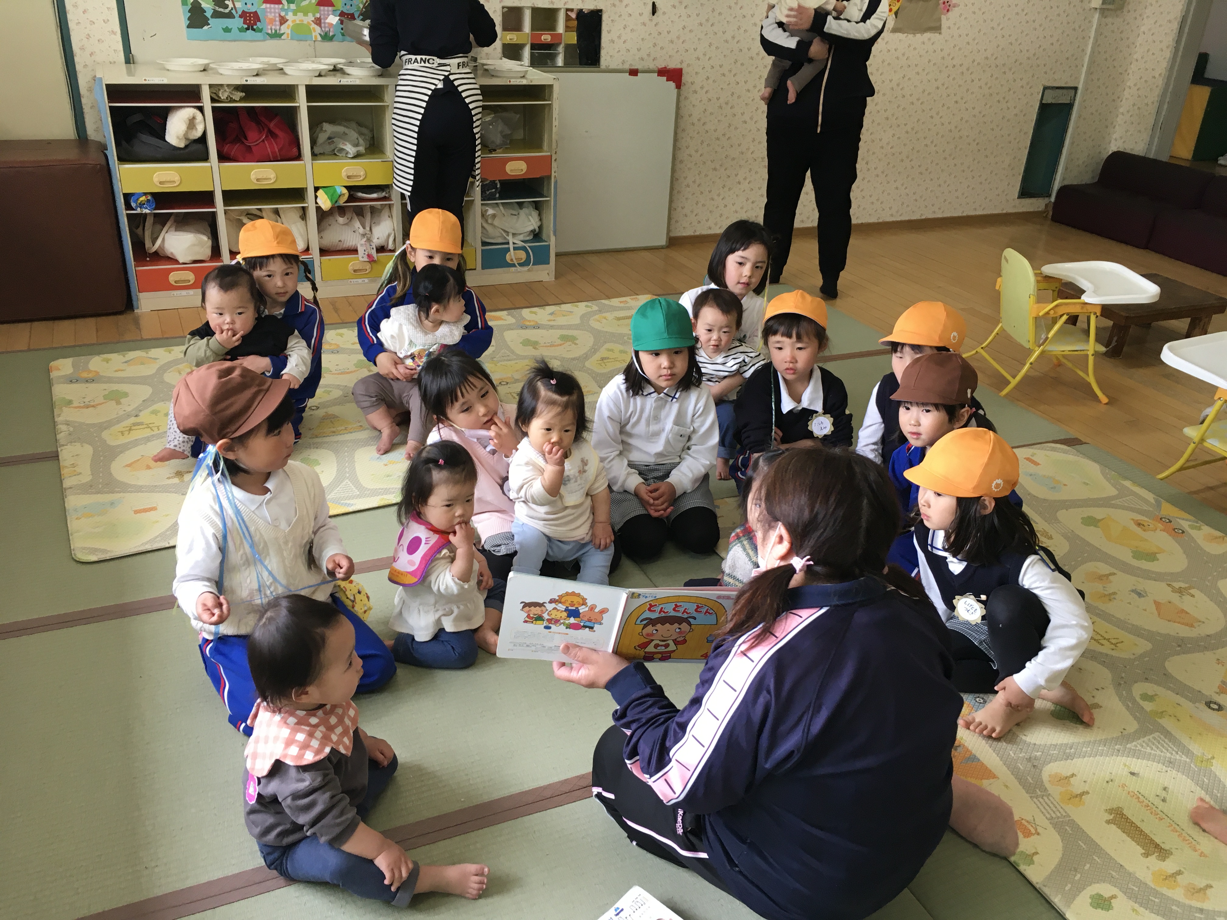 Mちゃんが「どんないろがすき?」の絵本を開いて見ていると、周りには数人の友だちが集まってきて座ります。そしてページをめくると、「あか!」と口々に言う子ども達。「あか」を認識している子もいれば、中には絵本を繰り返し読んでいるので、順番を覚えていて、言っている子もいます。
