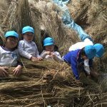 朝みんなが登園してしばらくすると、「お外で楽しいことをしているからパソコン(iPad)を持ってきてください。」とぱんだ組の子どもたちが呼びにきてくれました。どうやらおもしろいこと、楽しいことがあると私たちが写真を撮ること、そしてブログにのることを知っているようです。何があるのだろう・・・わくわくしながら急いで行きました。するとなんと、わらの上でとっても気持ちよさそうに寝そべっています。「あ〜あったかい。」「ずっと寝ていられる。」「お友達も一緒に寝れるの楽しい。」「温泉みたい。」といい表情、幸せそうなうっとりした表情で寝ていました。そして、「これはお金持ちの家だ!!!」こんな言葉まで出てきました。わらの家というと、昔話の・・・、馬小屋のわらということを思い出しがちな私が恥ずかしくなりました。子どもたちの素直な心、素直な表現っていいなぁ〜、大人って色々なことを知ってしまったなぁと。映画やまんがの世界が味わえた、なかなかできない体験をした子どもたちでした。