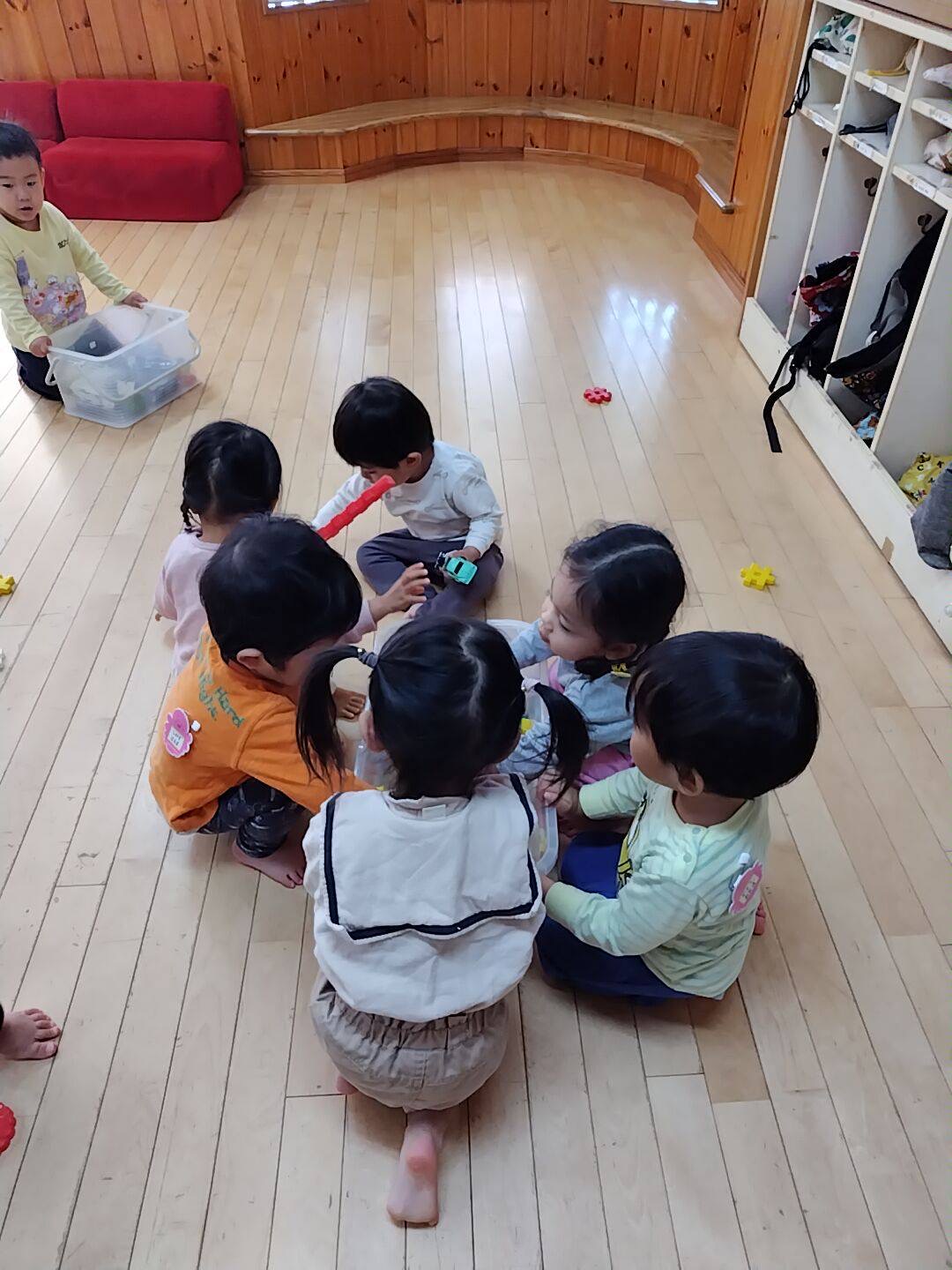 「おかたづけしようね!」と声をかけると子ども達も同じように「おかたづけ~」と声をかけながら使っていたソフトブロックや電車、車の玩具を集め始めます。おもちゃを集める子ども、「ここ!ここ!」とケースを持って待っている子ども、いつの間にかそれぞれ役割分担ができています。ケースを持っているBくんが周囲を見ながら何個か落ちているおもちゃを見つけて「あそこにある!」と指さして教えると、そこを目指して走っていったAちゃん。おもちゃをひとつ拾い得意気に片付けていました。保育教諭が「あともうちょっと!頑張って!」と声をかけるとケースを持っていたBくんも走っていき、最後のおもちゃを見つけて片付けていました。