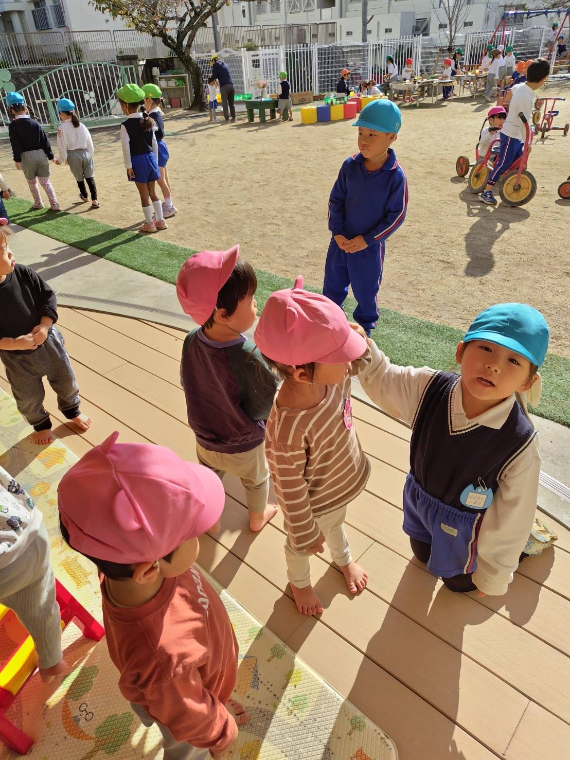 先週までの暖かさからうって変わって今日は、急に冷えを感じる日となりました。バスに乗ってきた子どもたちも「今日、お母さんが寒いって言ってた!」「〇〇くんのお母さんも寒そうにしていたね」等と話していました。また、ぞうぐみのYくんは「今日は太陽さんが負けてるんじゃない?」「幼稚園のみんな外で遊んでいるかな〜」と心配していました。でも大丈夫です。バスの中から園庭が見えてくると「ぱんだの帽子が見えた!」「みんな遊んでる!」と、三葉っ子は寒さに負けず、今日も元気に遊んでいました。