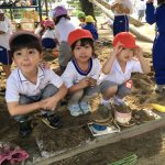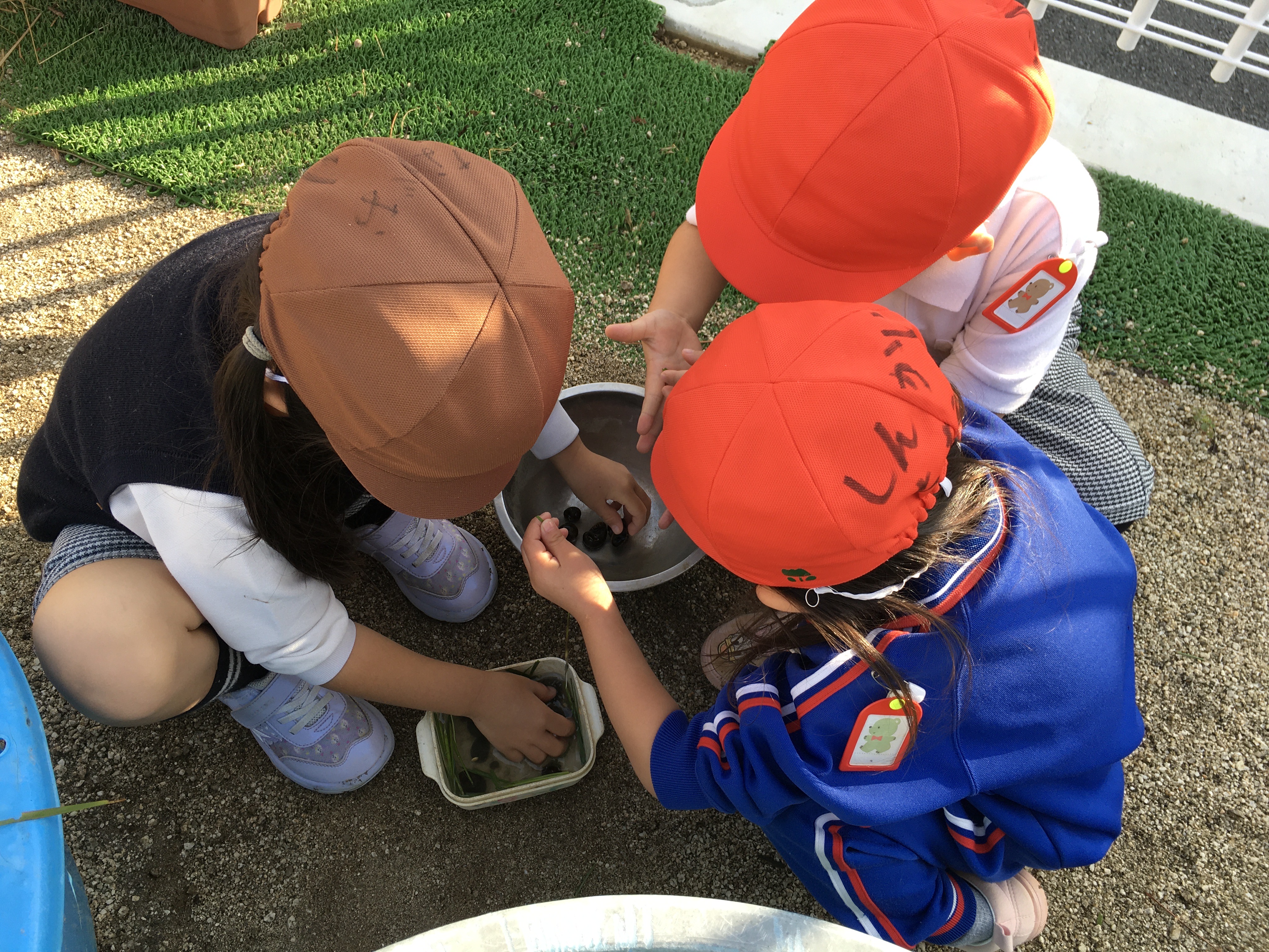 連休明けの清々しい秋空の下、幼稚園の園庭では今日も子ども達の賑やかな声と砂場や遊具、リレー等で楽しむ姿で溢れていました。ちゅうりっぷ組のI君とTちゃんは園庭で育てた稲を刈り終えた後の土が入ったたらいの中にいるタニシを発見!!近くにいた年長さんに「とっていい?」と尋ねて「いいよ。タニシはお米食べるけん。」と許可をもらうと水の中をじっと覗いて、容器いっぱいに捕まえていました。年長さんの言葉から稲がえさになると思った2人は、お米をちぎって一緒に入れていました。年長さんの話をよく聞いているなという事と捕まえるだけではなく餌をあげようという優しい気持ちに感心しました。