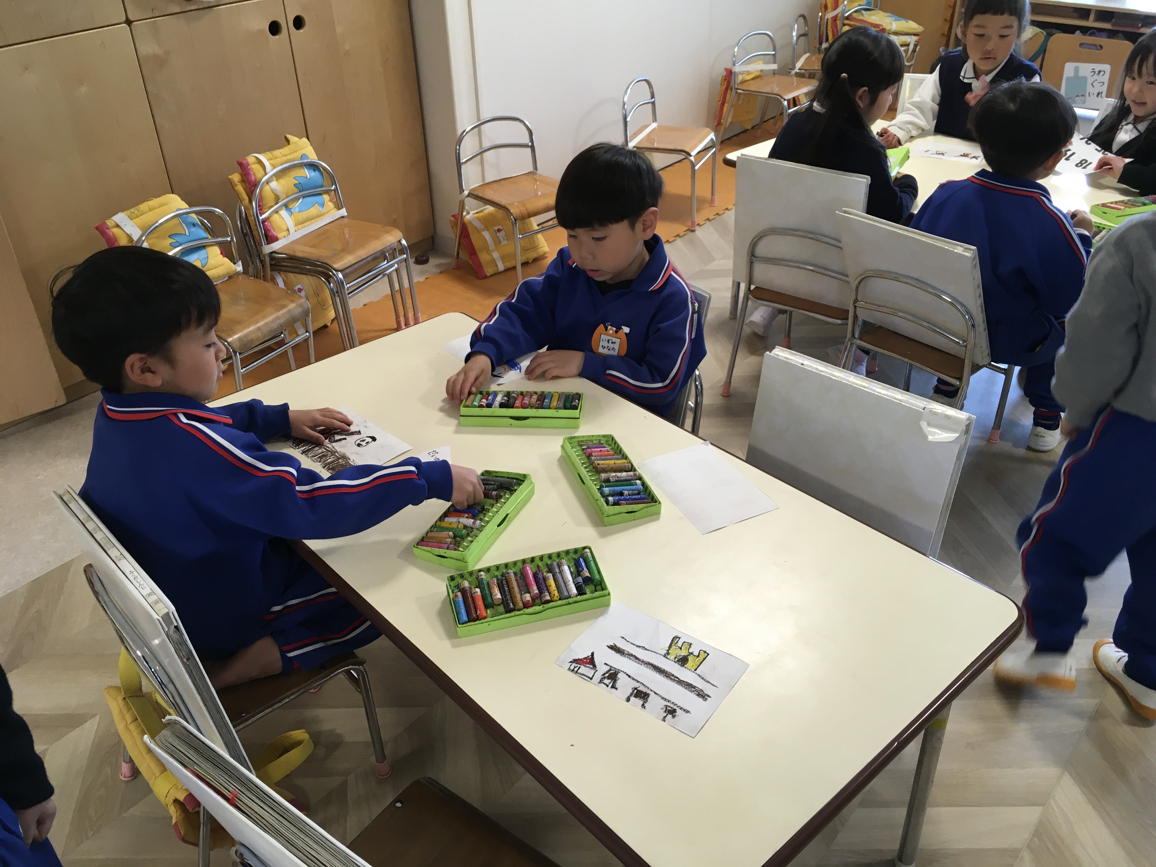 室内では各学年卒園式の練習や進級へ向けての活動を進める中、年中児は生活発表会のアルバム整理をしました。どんな写真が貰えるか子ども達もワクワクしながら写真を貰うと「歌の写真だ〜!」「ジャックと豆の木だ〜」等と思い思いに話していました。そして、発表会の絵を描き始めると「きみいろの歌の時の後ろの色から描こう」と背景から描き始めたりAちゃんは「私はジャックと豆の木を描こう!!」と言うと可愛い衣装を着た自分を描いたりと一人一人が素敵な絵を描いていました。それを見た教師も自然と笑みが出て「あ〜𓏸𓏸君がこんな絵を」「あ〜ここの場面を描いたんだ〜」と話を聞きながら1年間の絵の変化に驚いたり感動したりと一緒に楽しみながら整理することが出来ました。発表会の表紙は白紙のリボンです。そのリボンに一人一人が『きみいろ』をイメージしながらデザインしています。みんなの素敵なリボンをみてさらに笑顔になった1日でした。