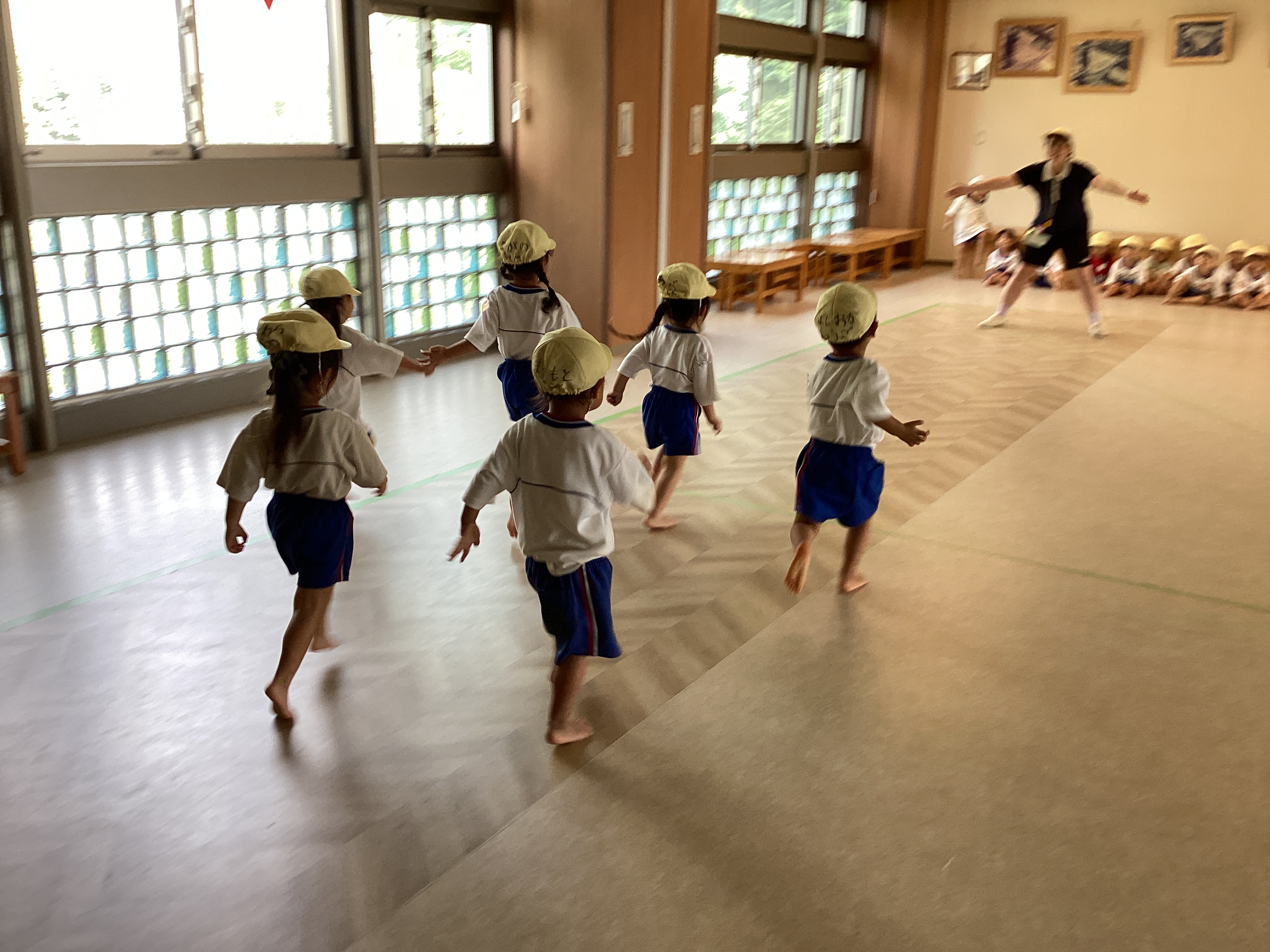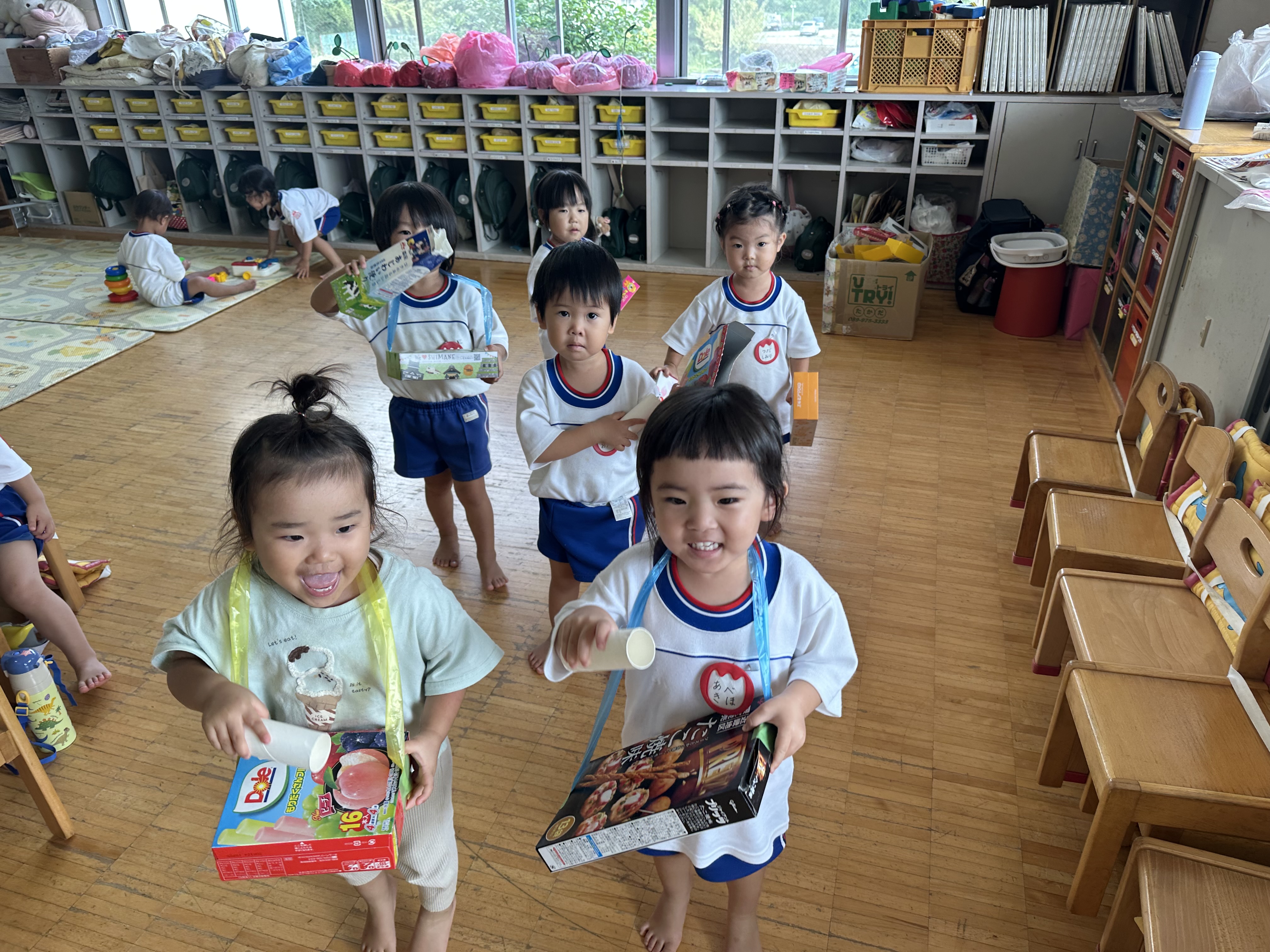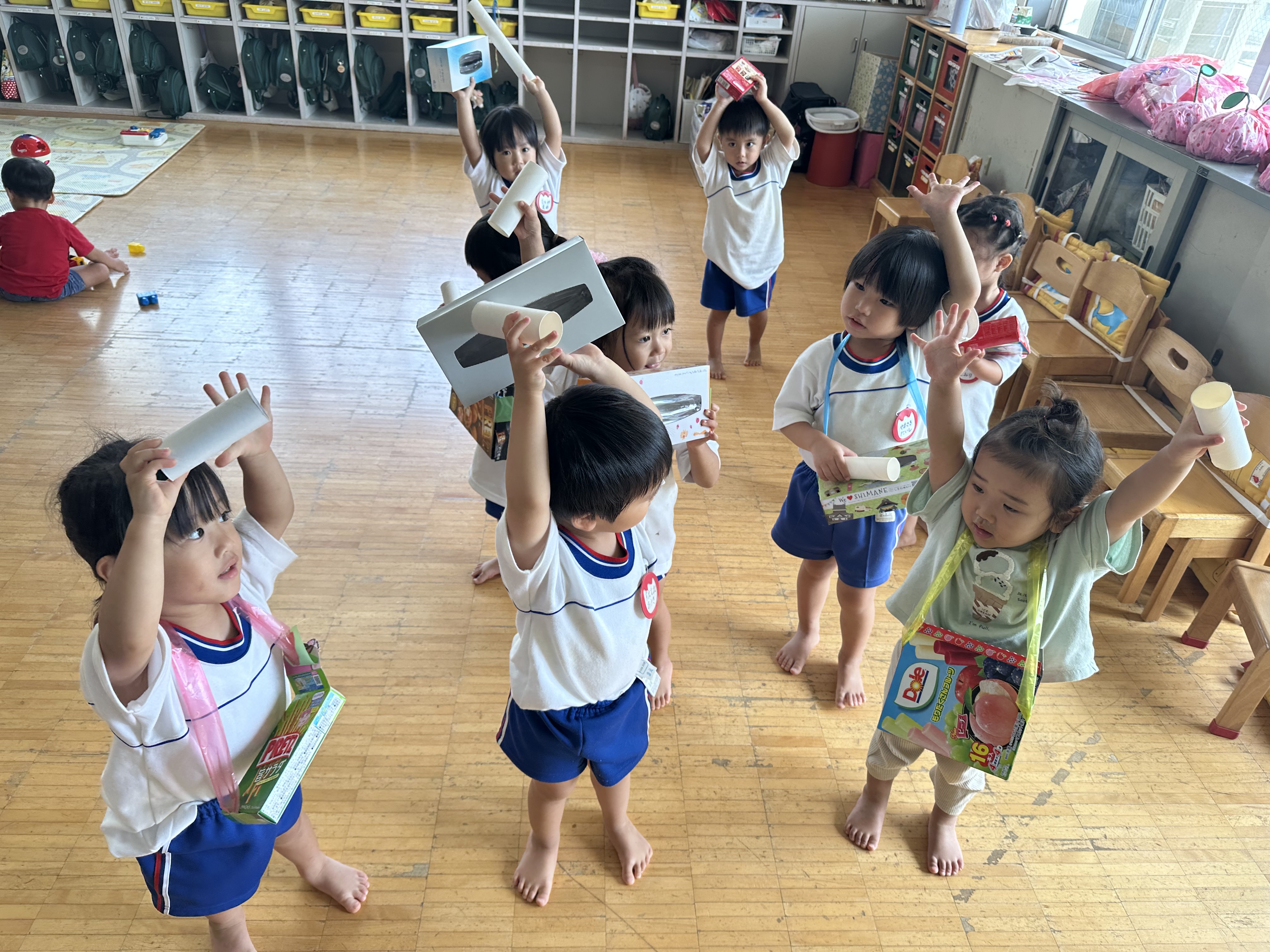 給食が終わると、「年長さんの太鼓作りたい!」と言って廃材で作って叩き始めたᎢ君。曲をかけるとそれに合わせて?叩きます。それを見ていた子ども達は「私もしたい!」とみんなで叩きはじめました。たんぽぽ組の子ども達にとって年長さんは憧れです。年長児の練習を見て沢山の刺激を受けている姿がありました。かけっこでは自分の名前をマイクで言ったり、踊りをニコニコで踊ったりと頑張っています。本番で楽しんで参加している姿を保護者の皆様に見てもらえるようにみんなで頑張ります。