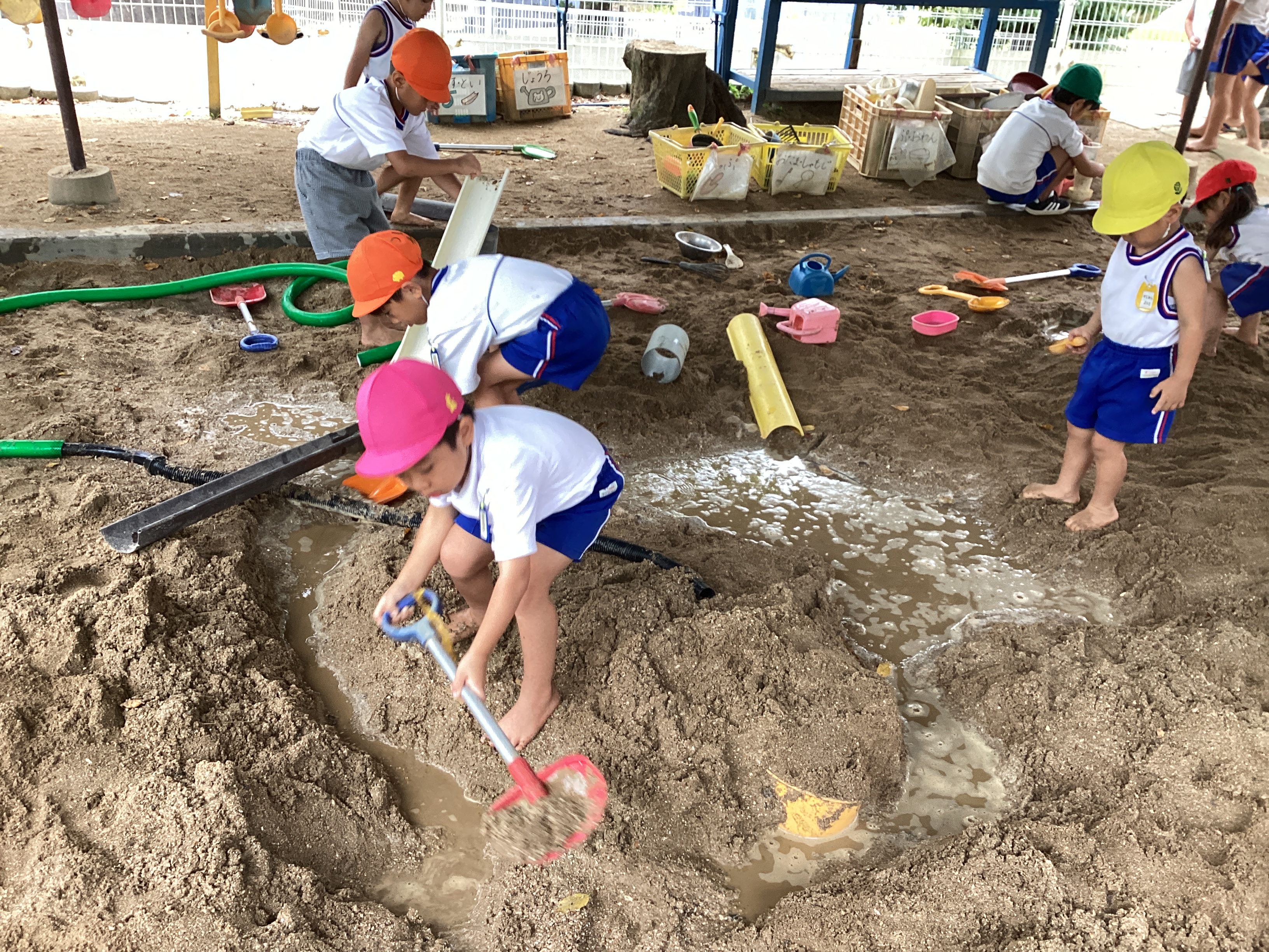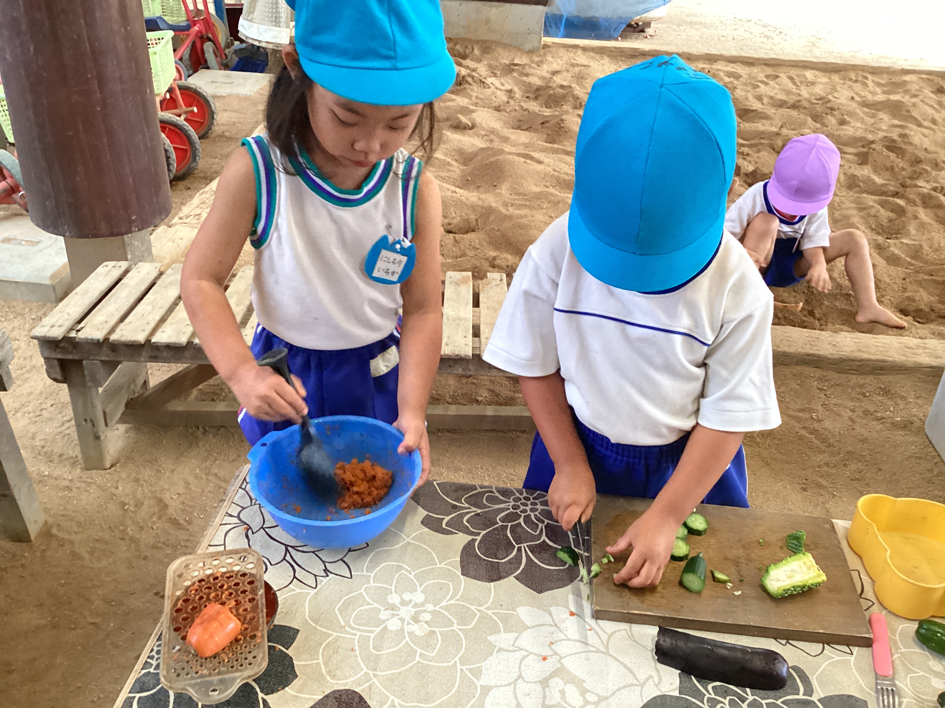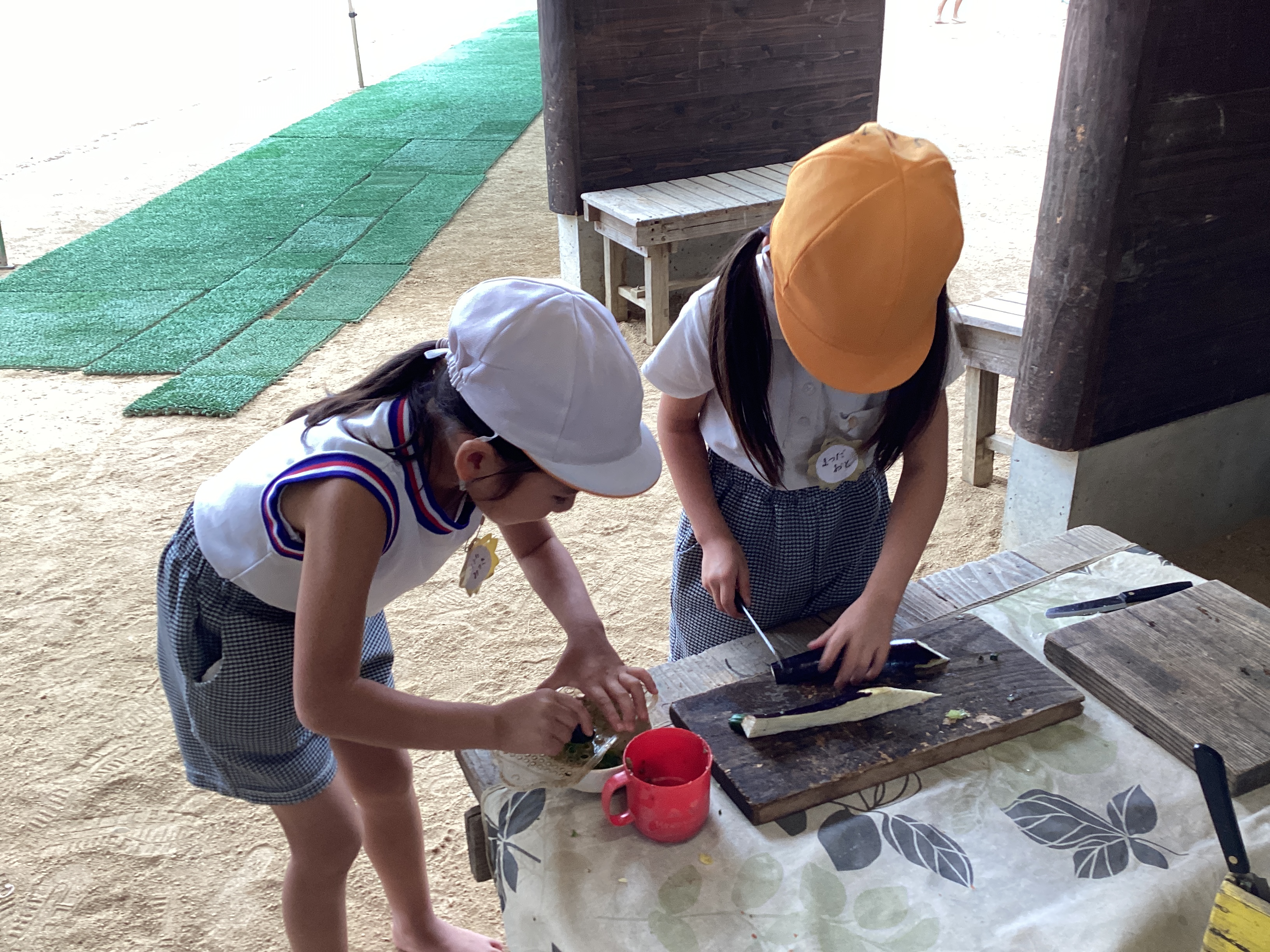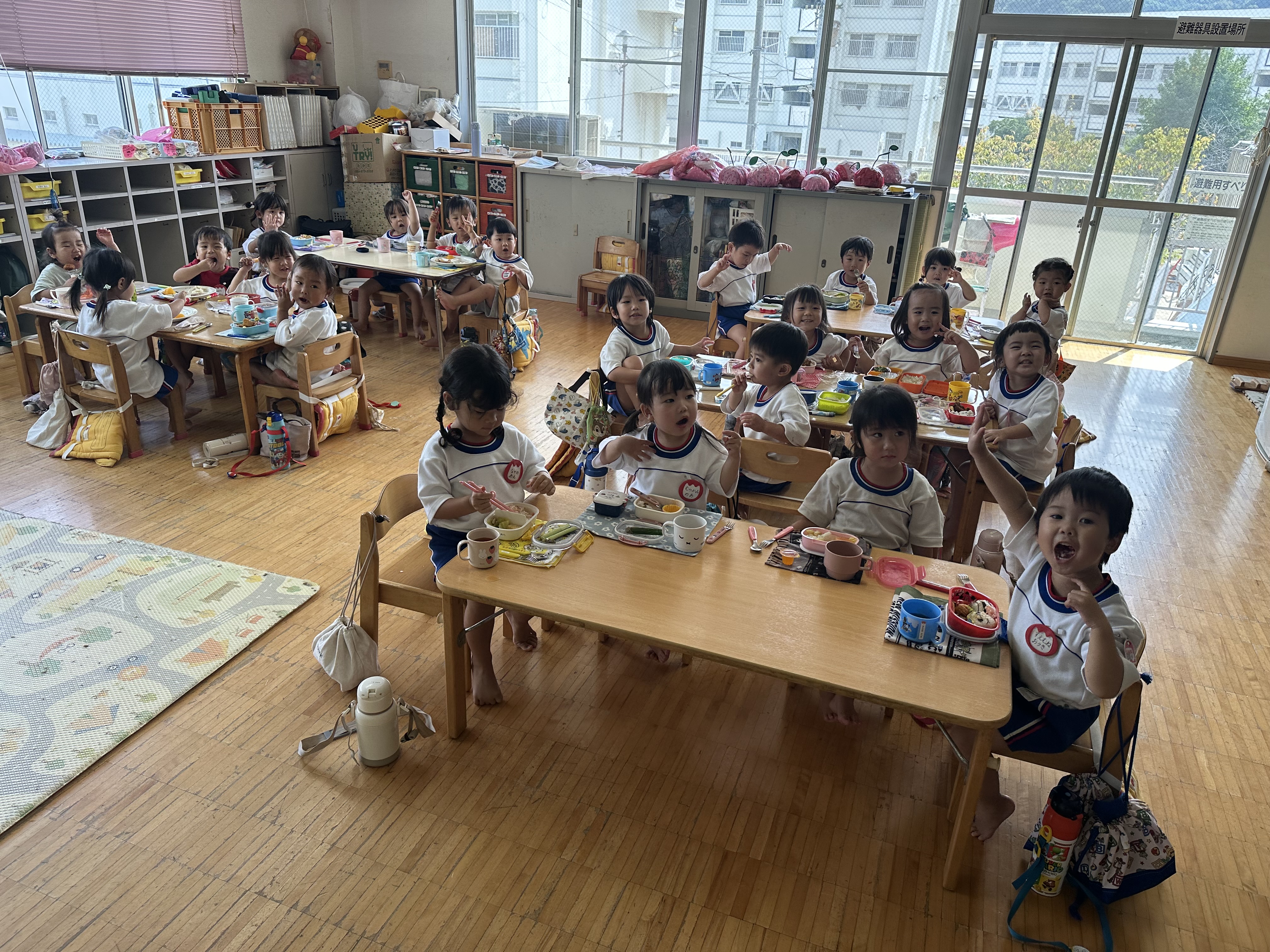 給食が終わると、「年長さんの太鼓作りたい!」と言って廃材で作って叩き始めたᎢ君。曲をかけるとそれに合わせて?叩きます。それを見ていた子ども達は「私もしたい!」とみんなで叩きはじめました。たんぽぽ組の子ども達にとって年長さんは憧れです。年長児の練習を見て沢山の刺激を受けている姿がありました。かけっこでは自分の名前をマイクで言ったり、踊りをニコニコで踊ったりと頑張っています。本番で楽しんで参加している姿を保護者の皆様に見てもらえるようにみんなで頑張ります。