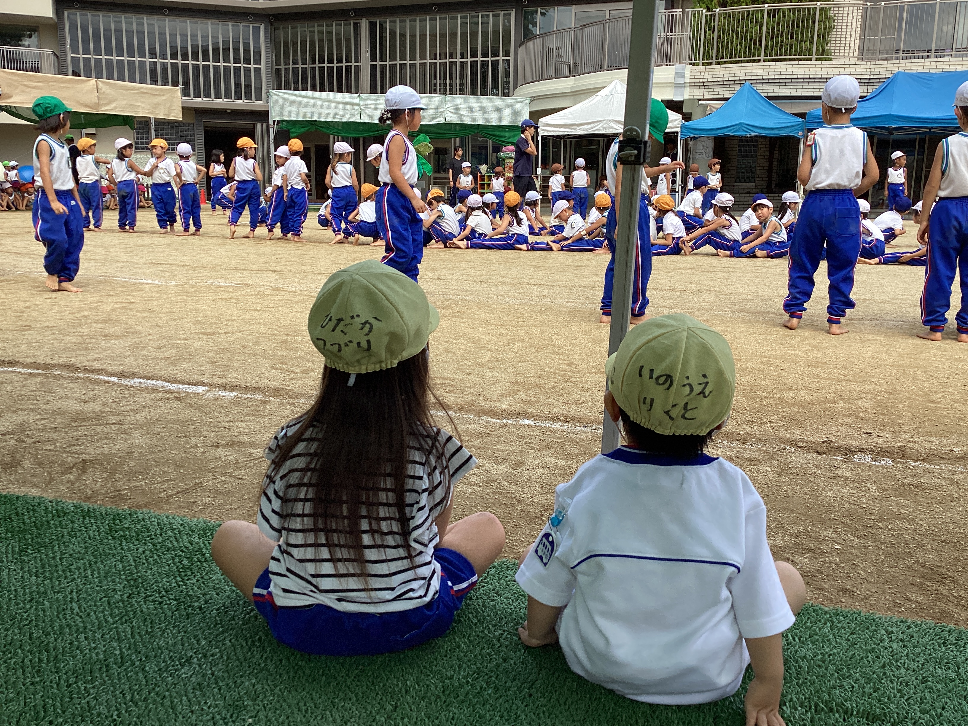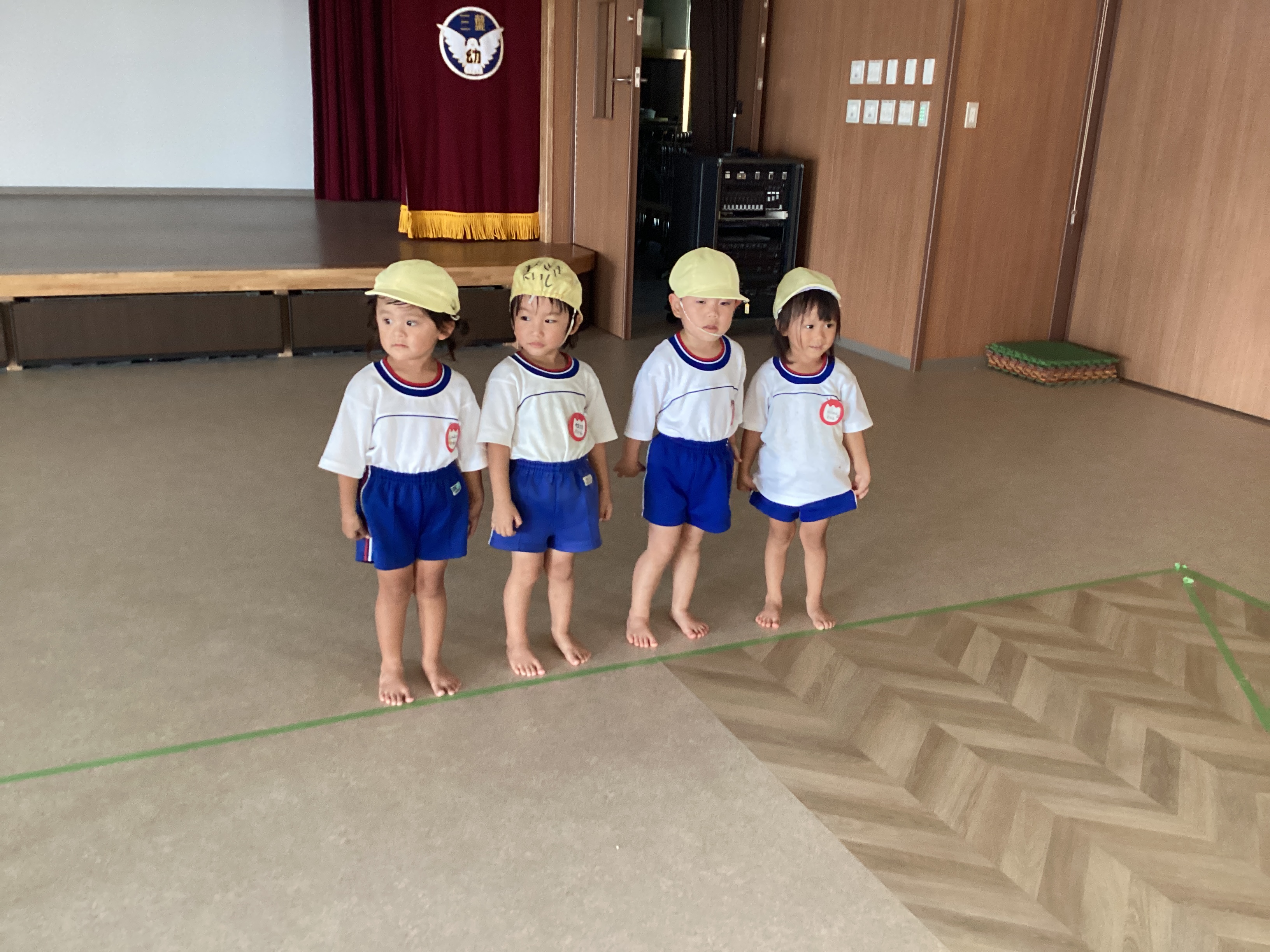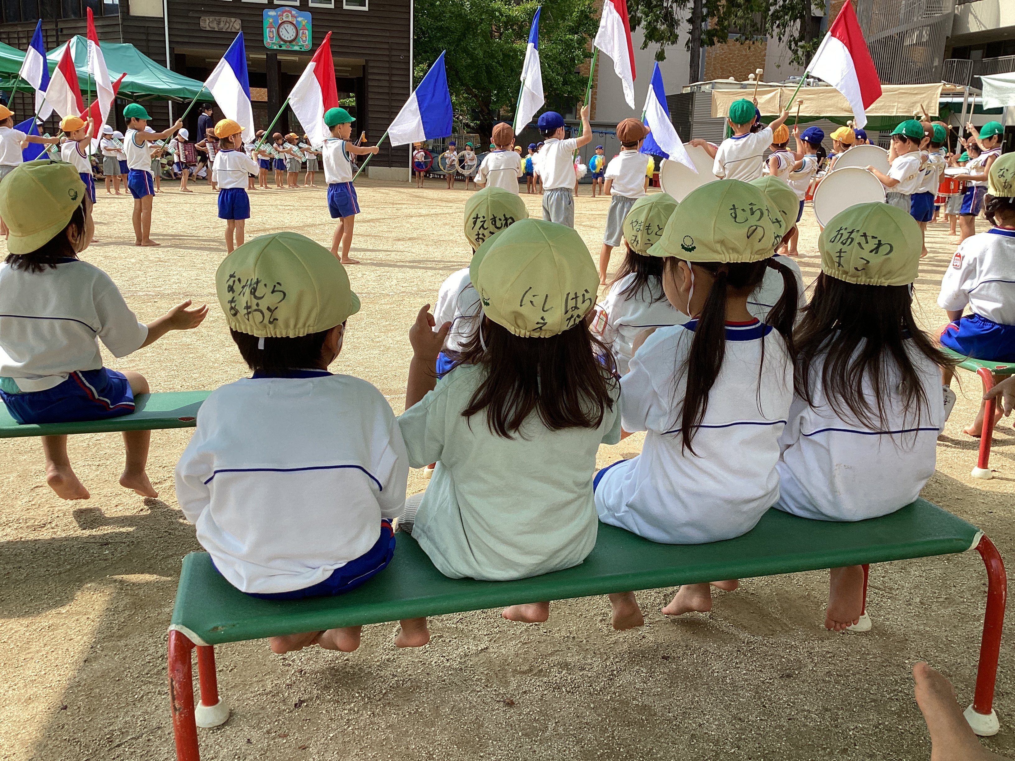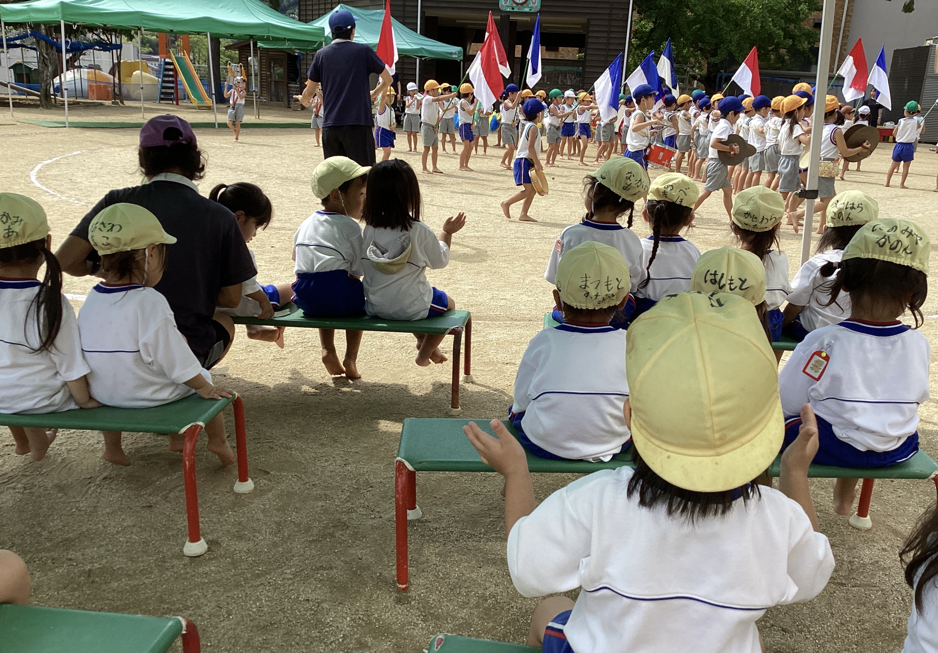 その後、年長児の鼓笛隊もお客さんになって見せてもらいました。部屋で遊んでいる時から太鼓や鍵盤の音が聞こえてくるたびに「年長さんの音がする!」と言っていたたんぽぽ組さん。椅子に座って実際に目のあたりにすると、とてもかっこよかったようで、目をキラキラさせながら見ていました。「旗大きいね!」「赤色と青色がある!」と見たことを口々に友達同士で話していました。たんぽぽ赤組のT君は、くま組にお姉ちゃんがいて曲を悪くたびに喜んで歌っていました。そして、太鼓の音が印象的だったのか年長児の叩く音に合わせて手拍子をしていました。Ꭲ君が手を叩いて真似しているのを見て、周りの子ども達も手拍子をして真似して遊んでいました。そして部屋に入ろうと声を掛けても気が付かない程見入っている子の姿もありました。