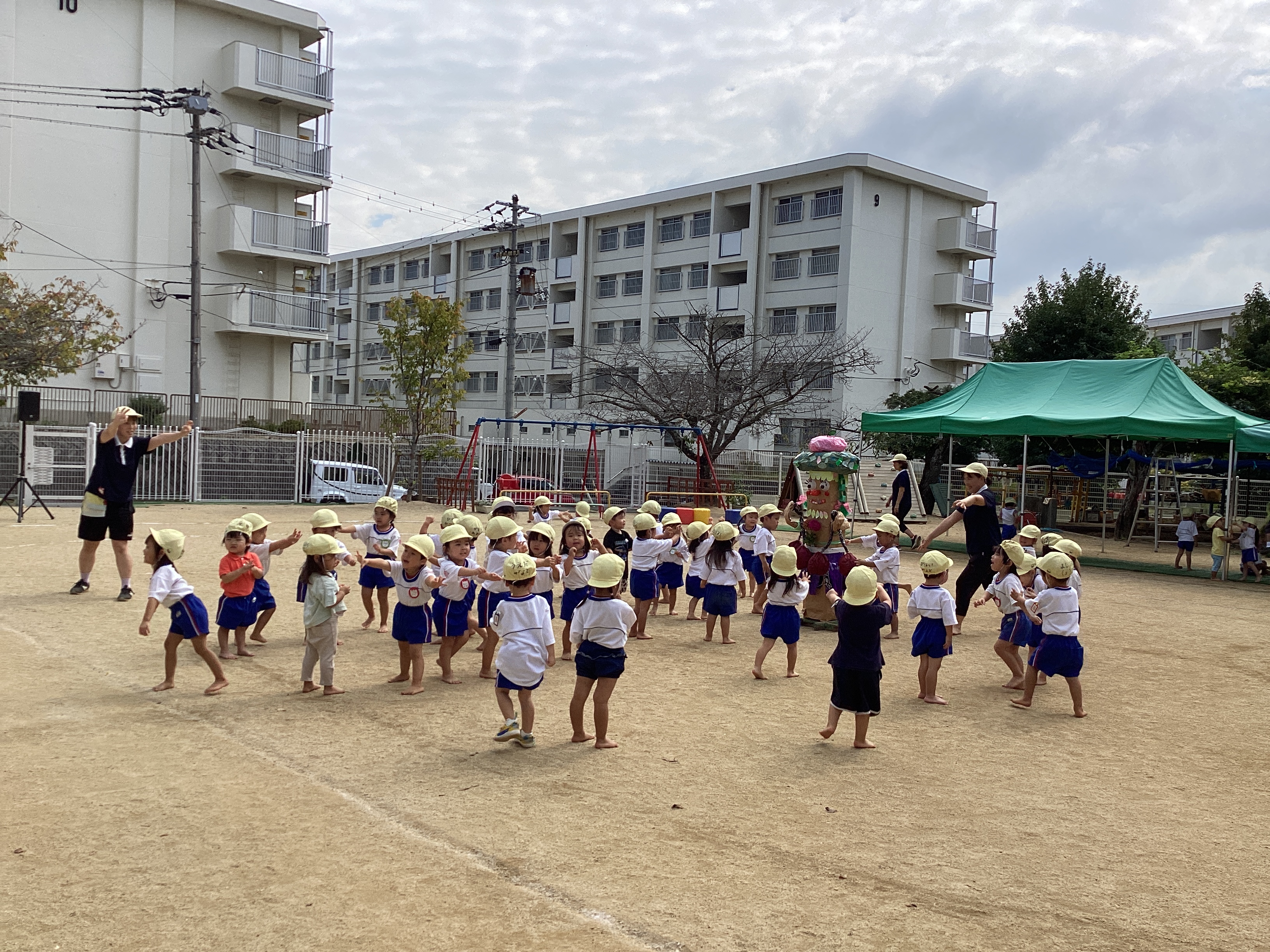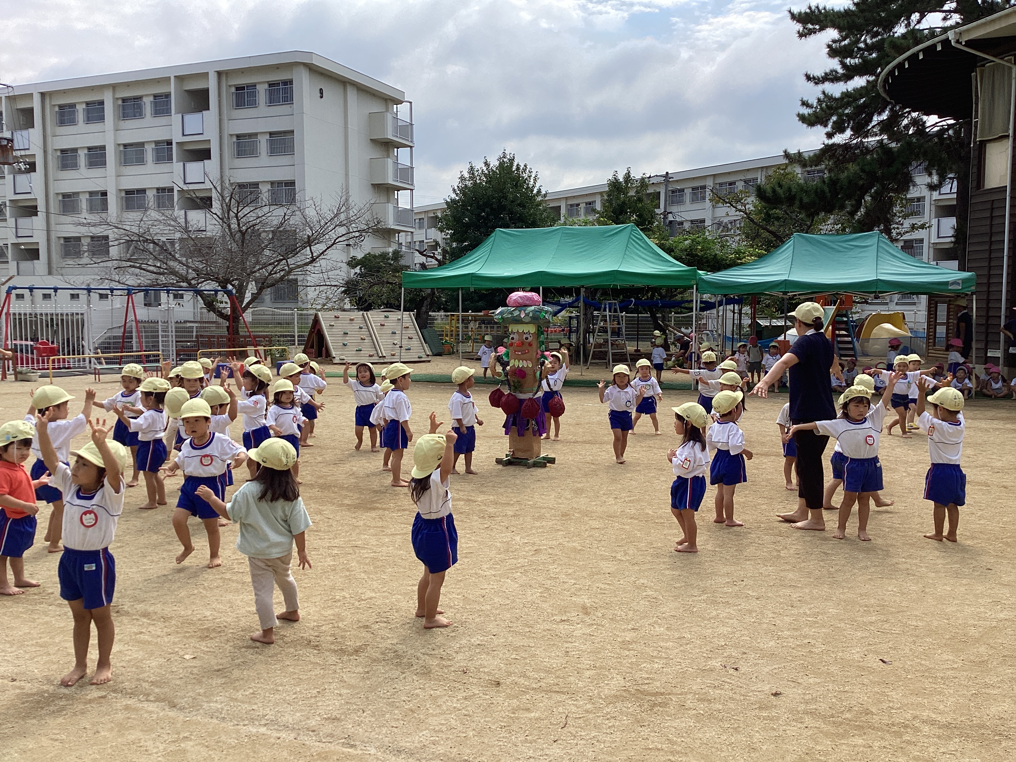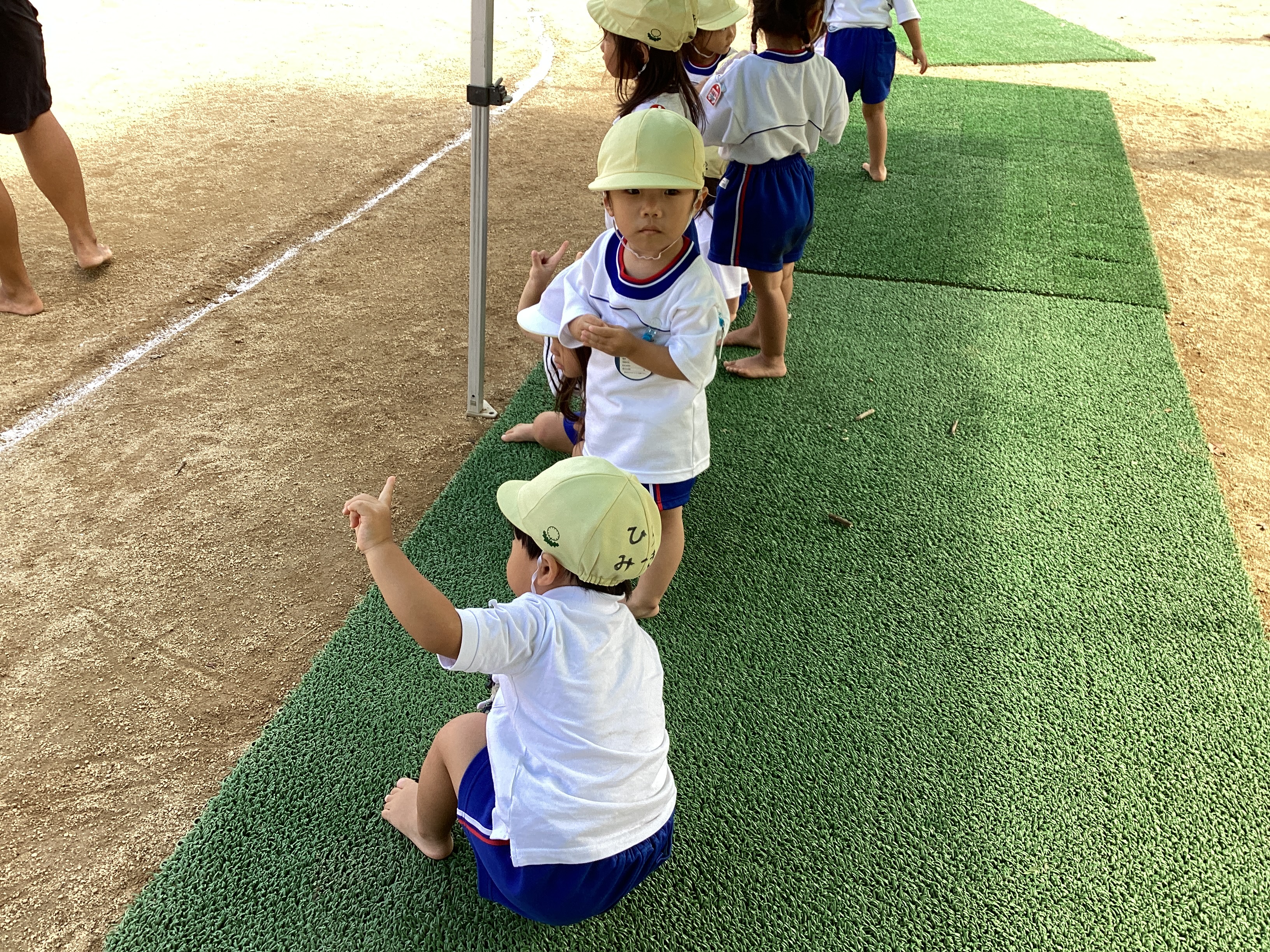 昨日は、地方祭。休み明けの登園日になりました。子ども達は何事もなかったように元気いっぱいで友達を誘ってリレーをしたり、砂場で遊んだりしていました。年長児達は、登園してみんながそろうと、早速園庭で運動会の練習を始めました。組体操のわざを年長児がするたびに、拍手をしたり、じーっと見て応援をするたんぽぽ組さん。見ていて楽しくなってきたのか、ブランコで遊んでいたKちゃんが近くで遊んでいたM君を呼んで足を上げて2人でくっつけるなど真似をして遊び始めました。3歳になったばかりの子ども達ですが、身体を使って形を表現する組体操が楽しかったようで、小さいながらに真似をする姿はとても可愛いらしく、思わず笑顔で見つめていました。