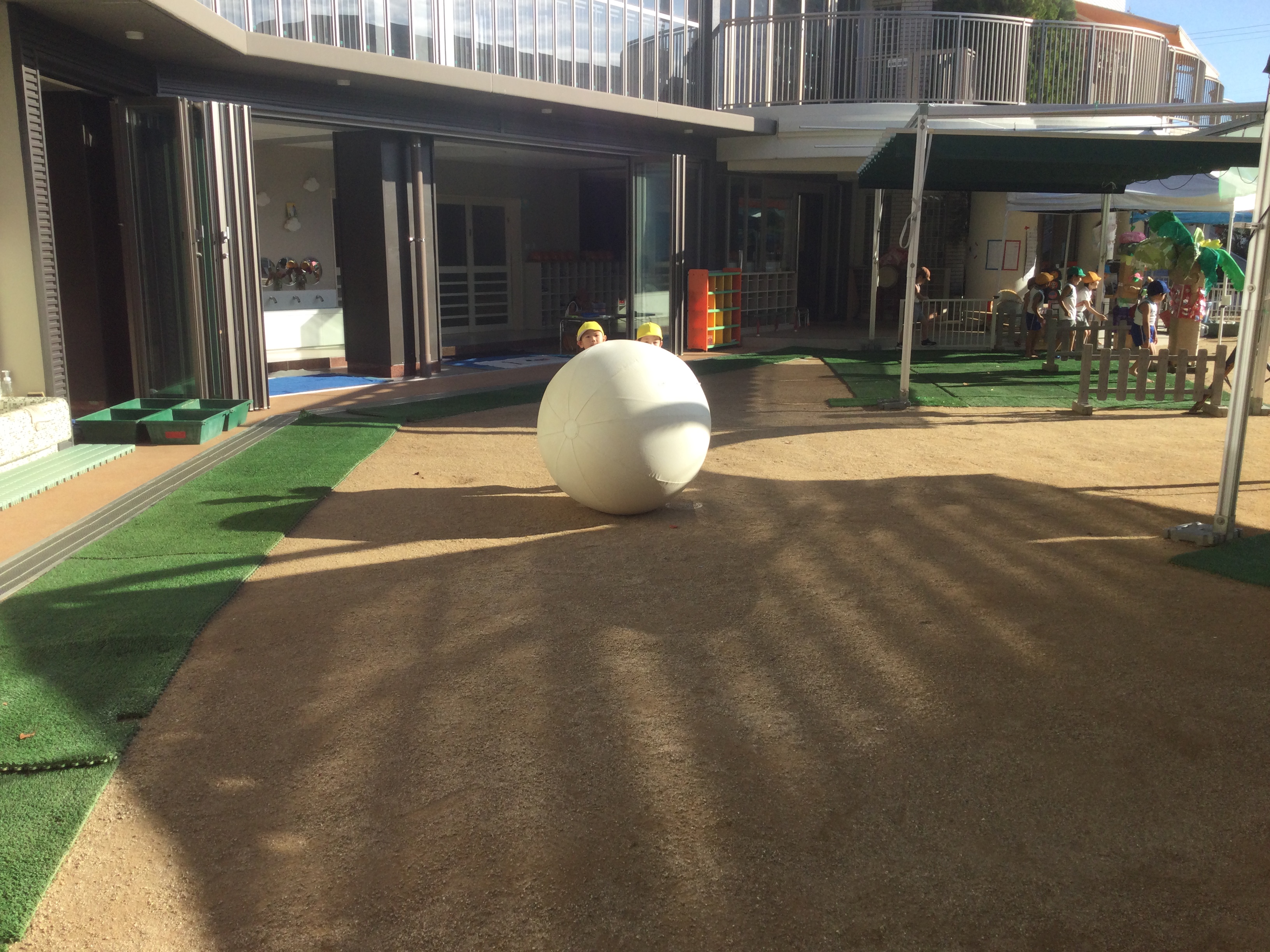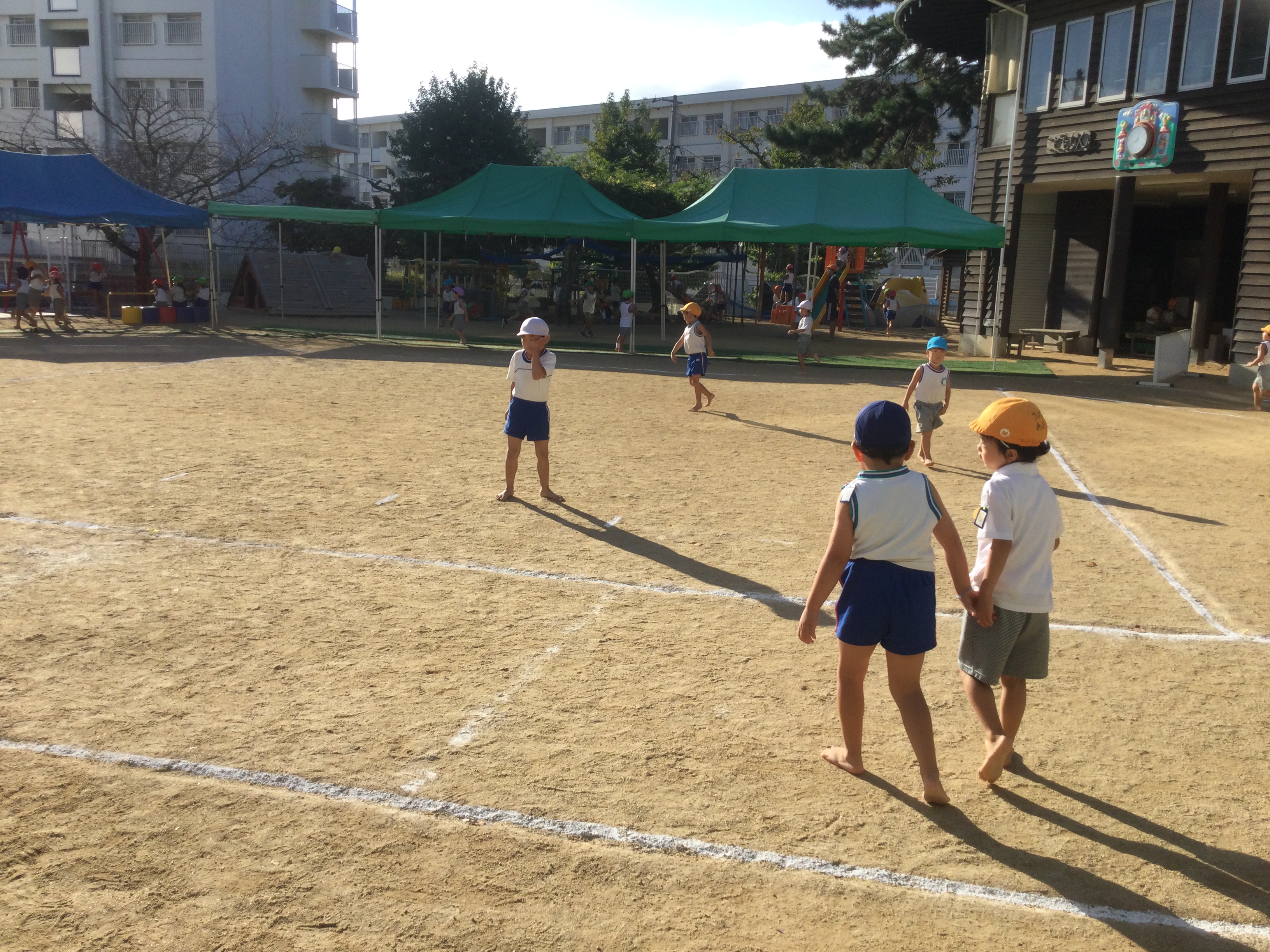 一方、円周の外、プールの前では年少児達が大玉転がしをしていました。特にひまわり組は大玉がどこかへ行ったらいけないと思うのか、ゆっくりゆっくり歩いて回って来てしまうので、なかなか次のお友達に大玉が行きません。またお休みが多く、「次は誰?」「誰とするの?」かが分からないので、声をかけてみました。