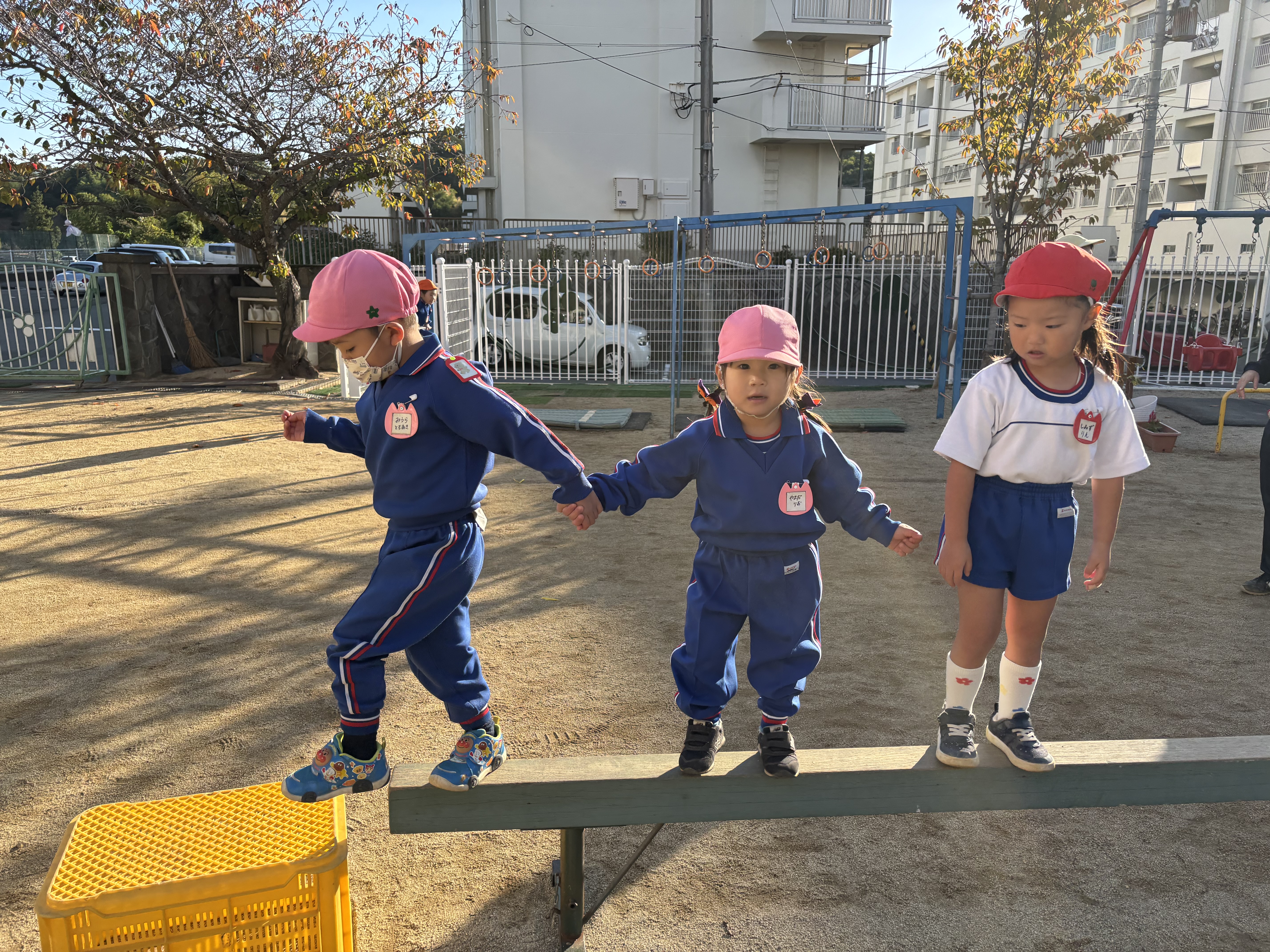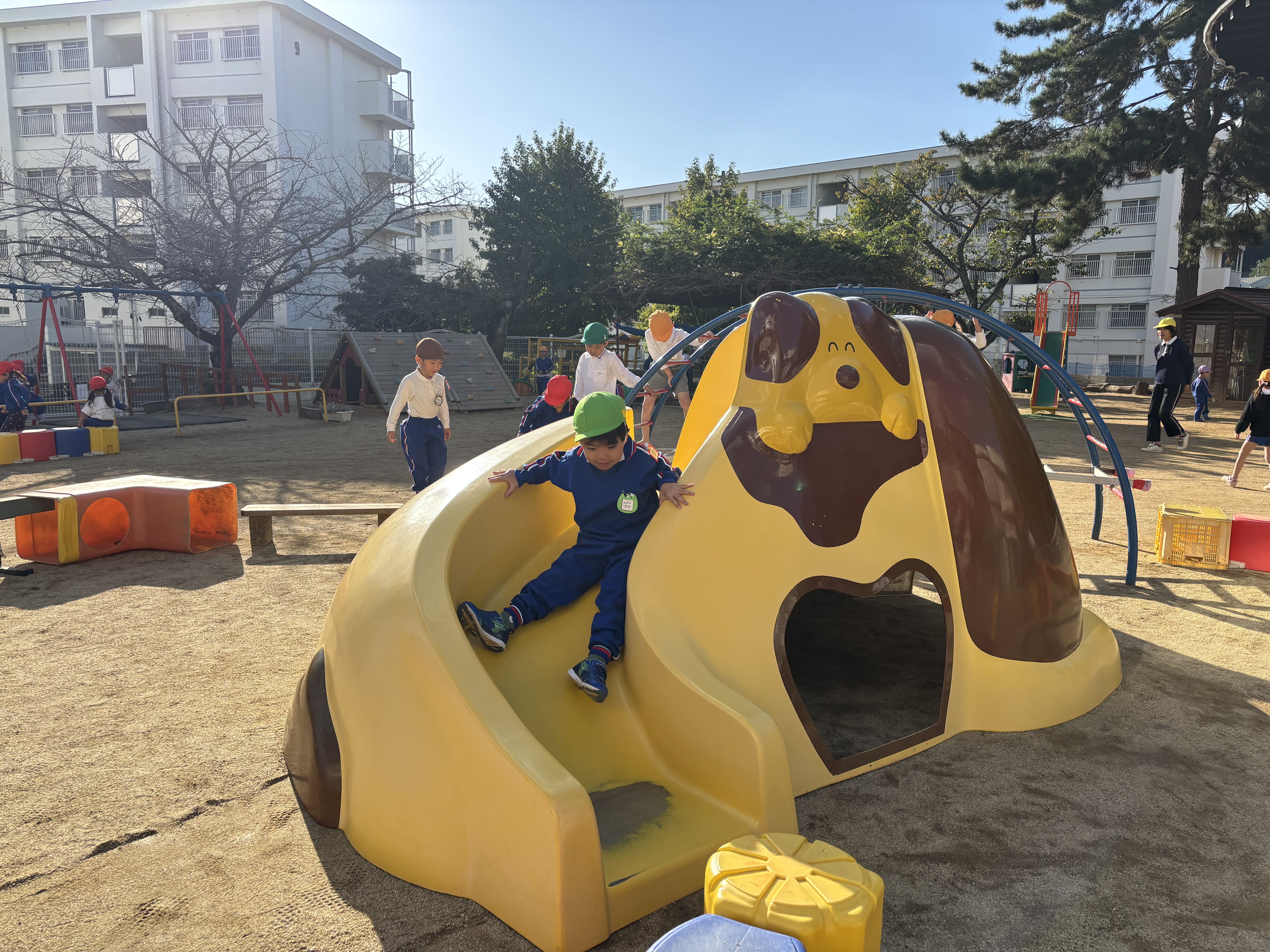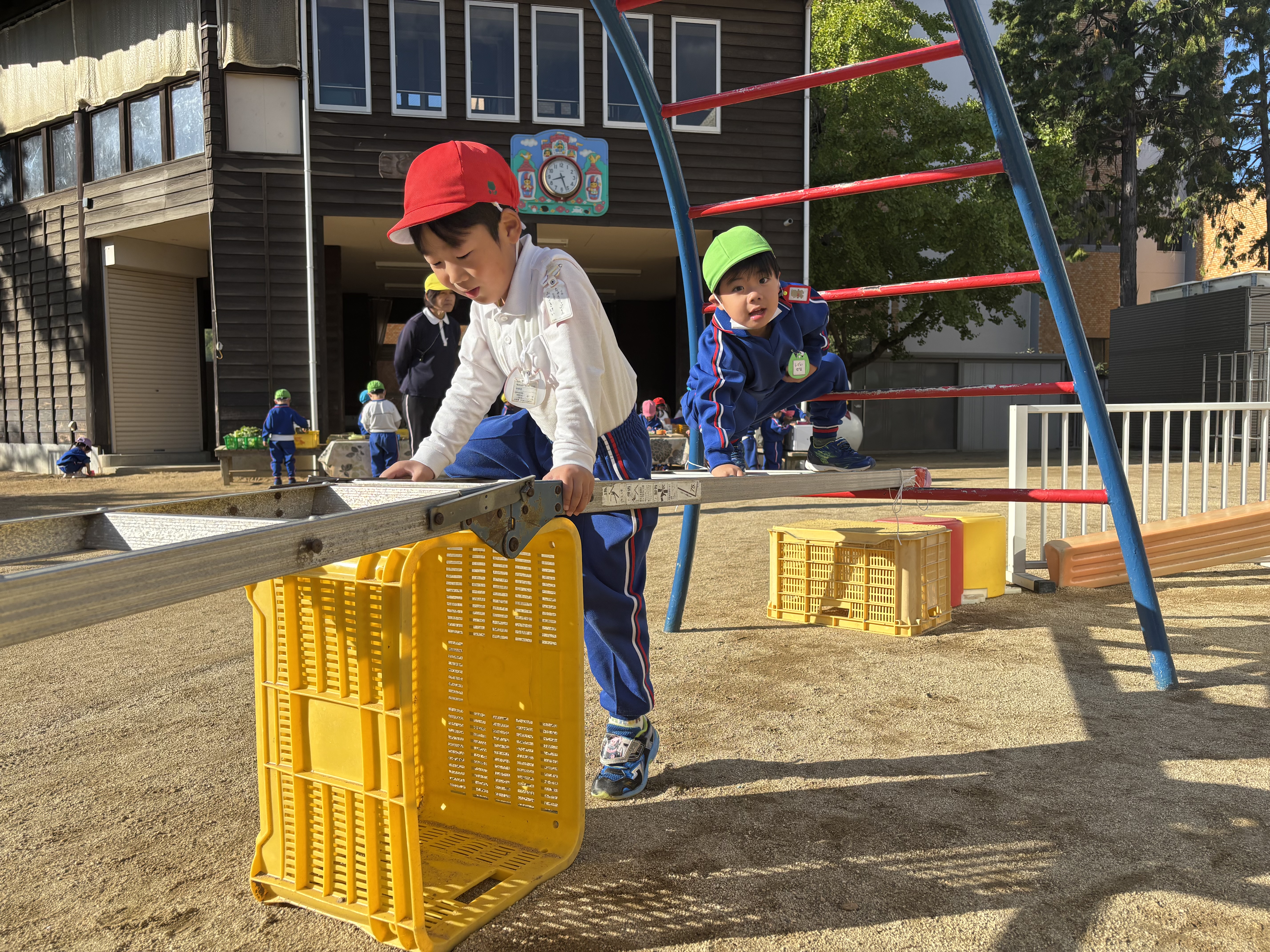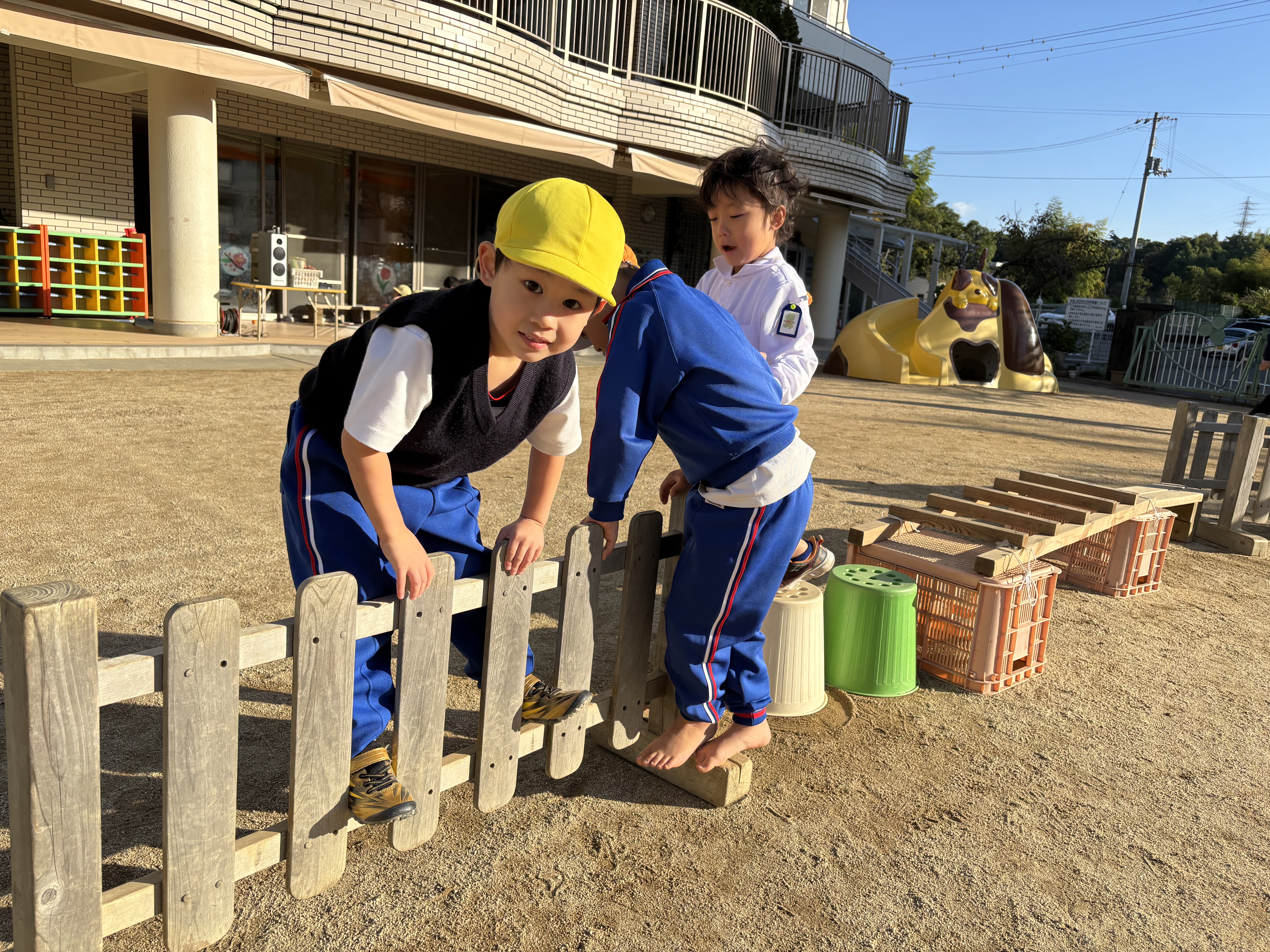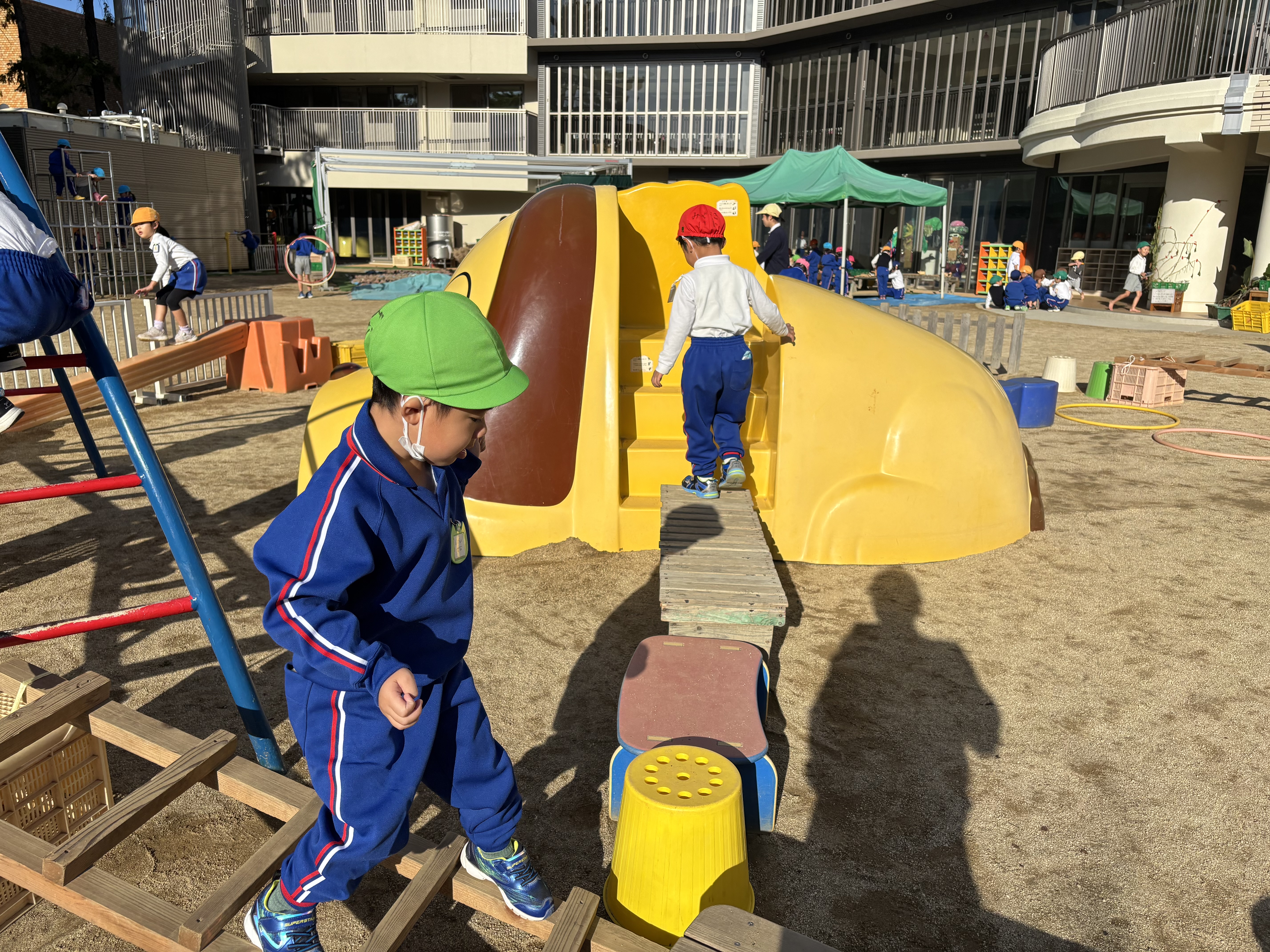 そしてそして、、今日はなんと!アスレチックに犬のすべり台が追加されました。滑ってゴールではなく、その後もま道が続いているので、どんどん進みます。年少さん達もバランスをとりながら上手に平均台を渡り、柵の橋がユラユラするけれど、グっと力を入れて楽しそうに笑っていました。外で遊ぶにはぴったりの気候だなぁ、みんなの笑顔かわいいなあと思う朝でした。