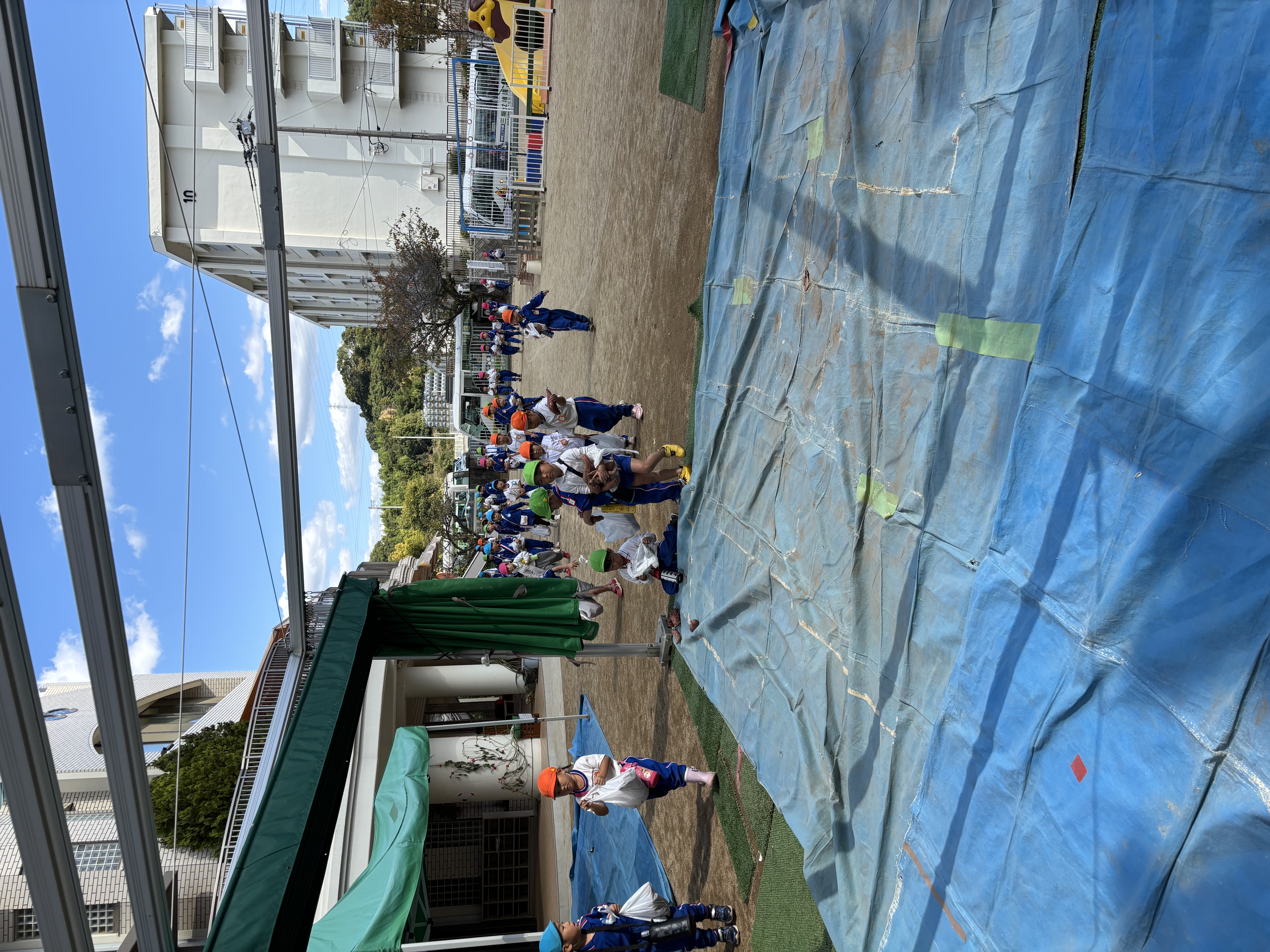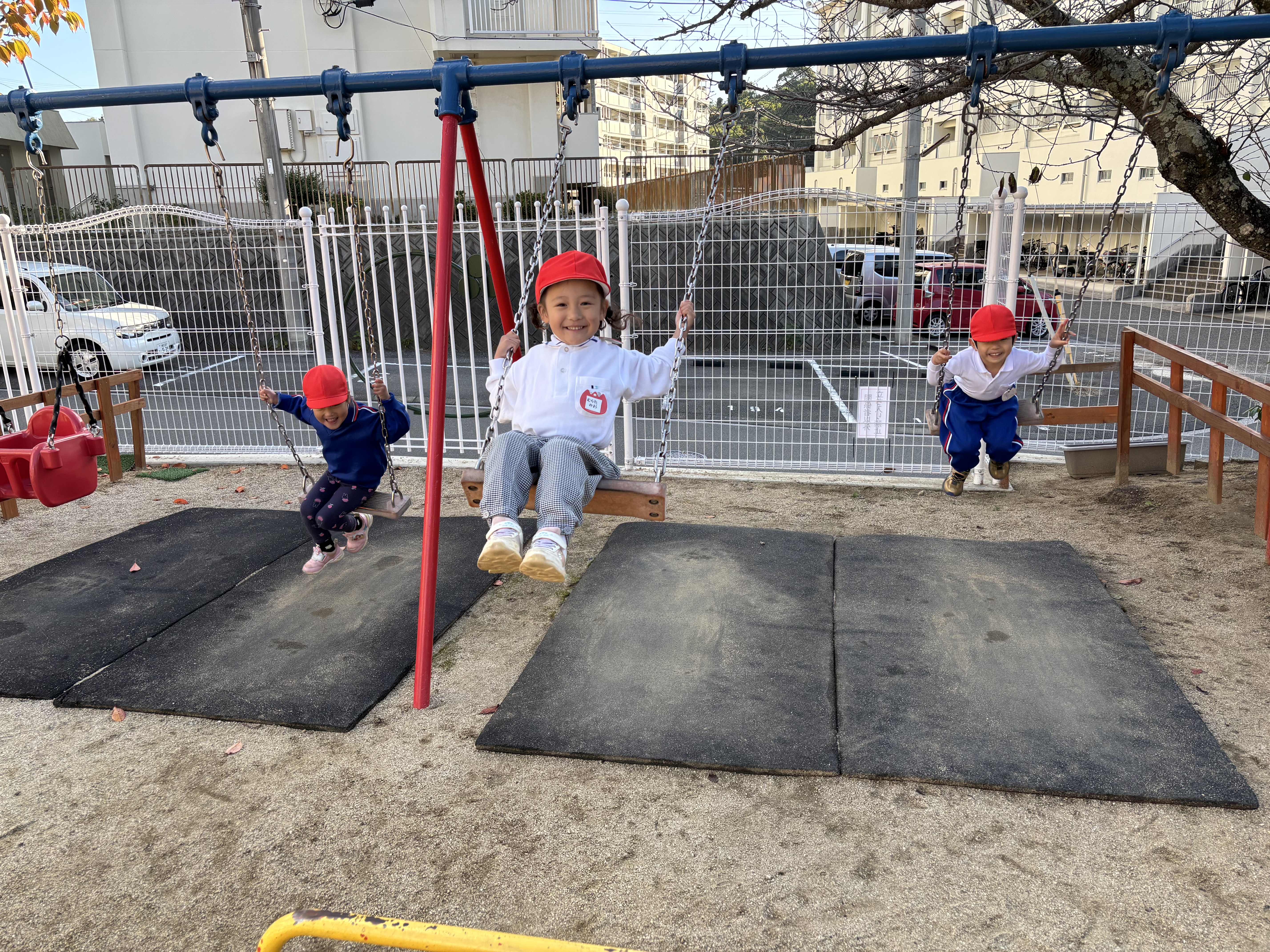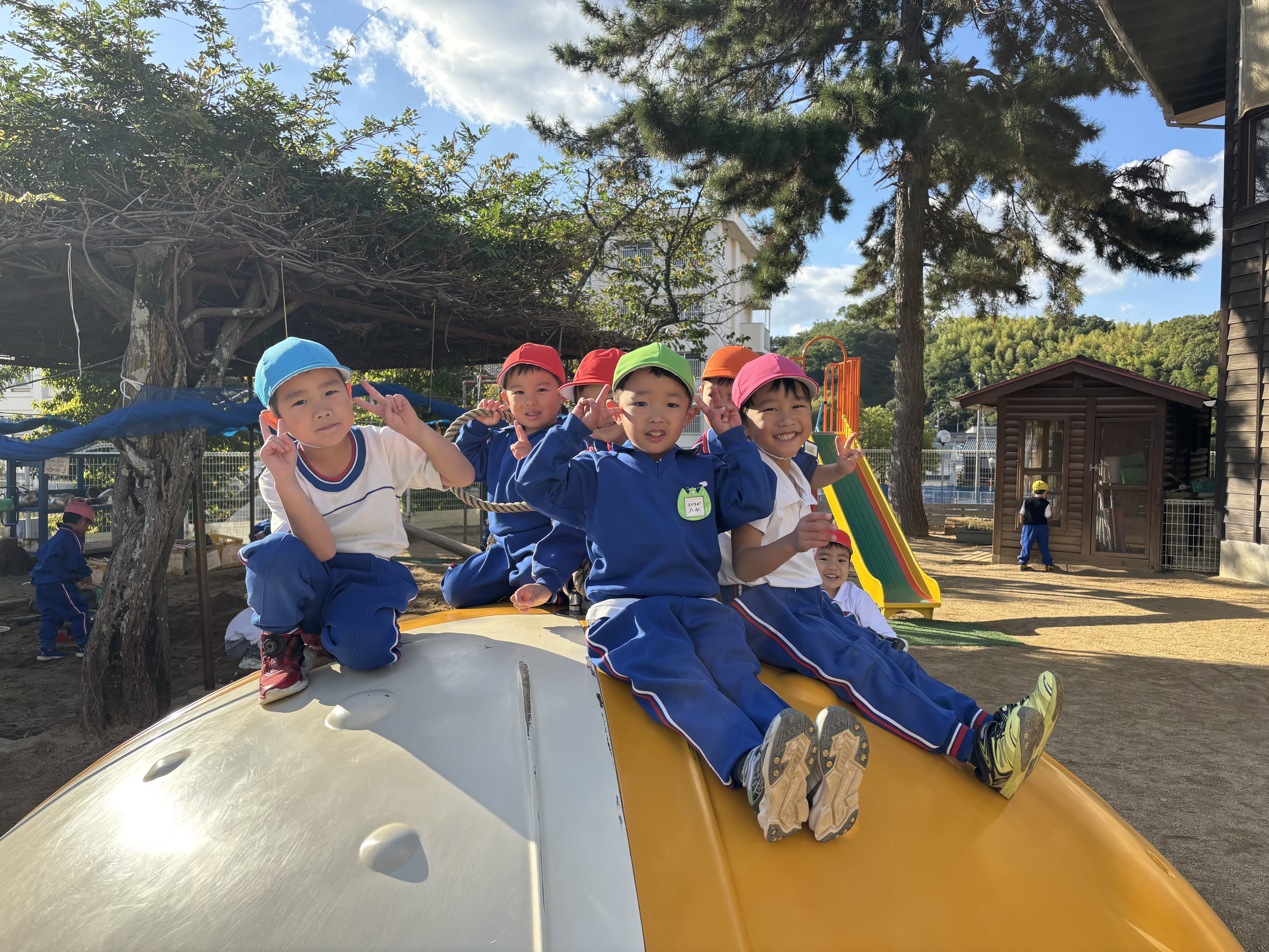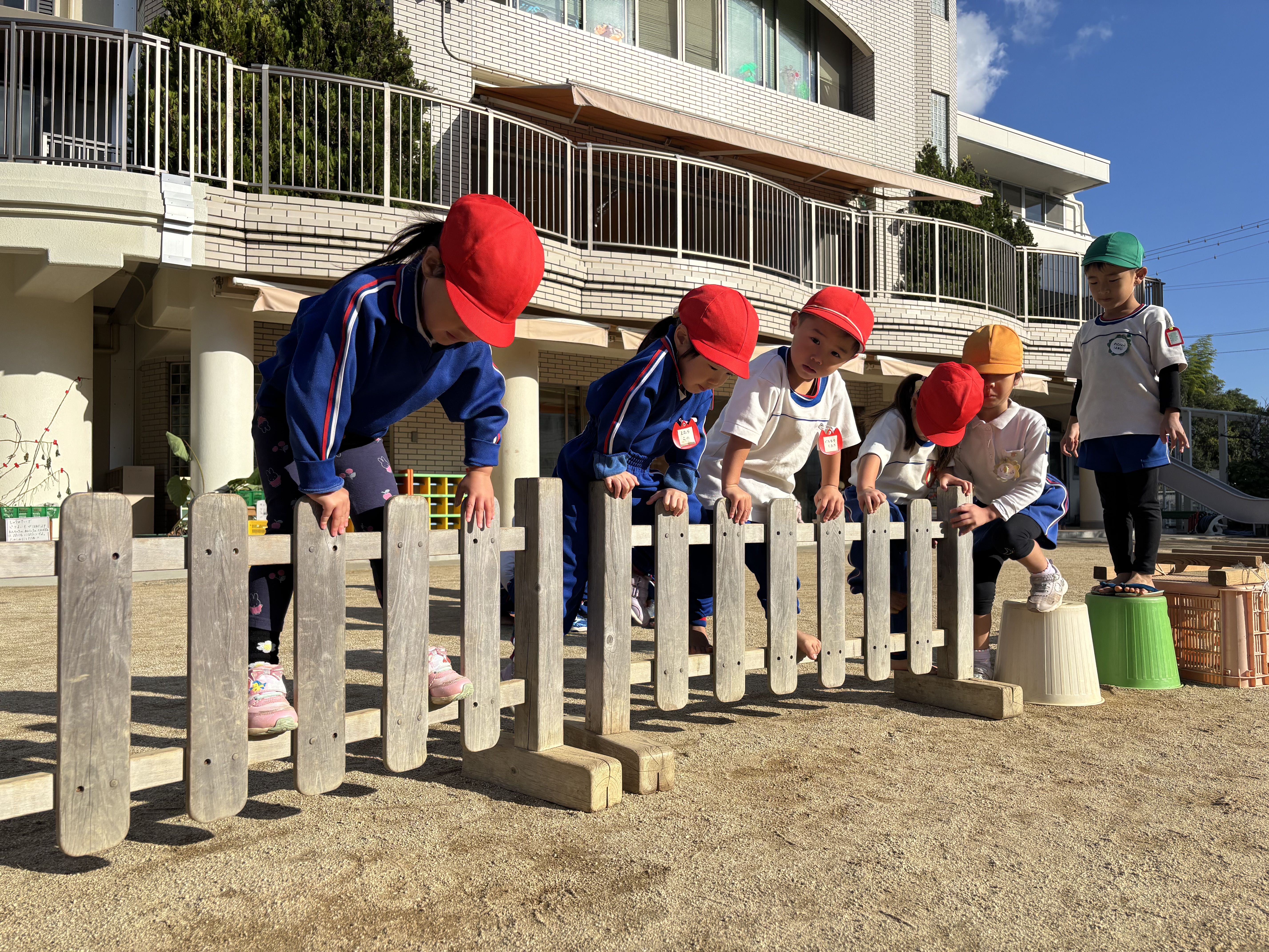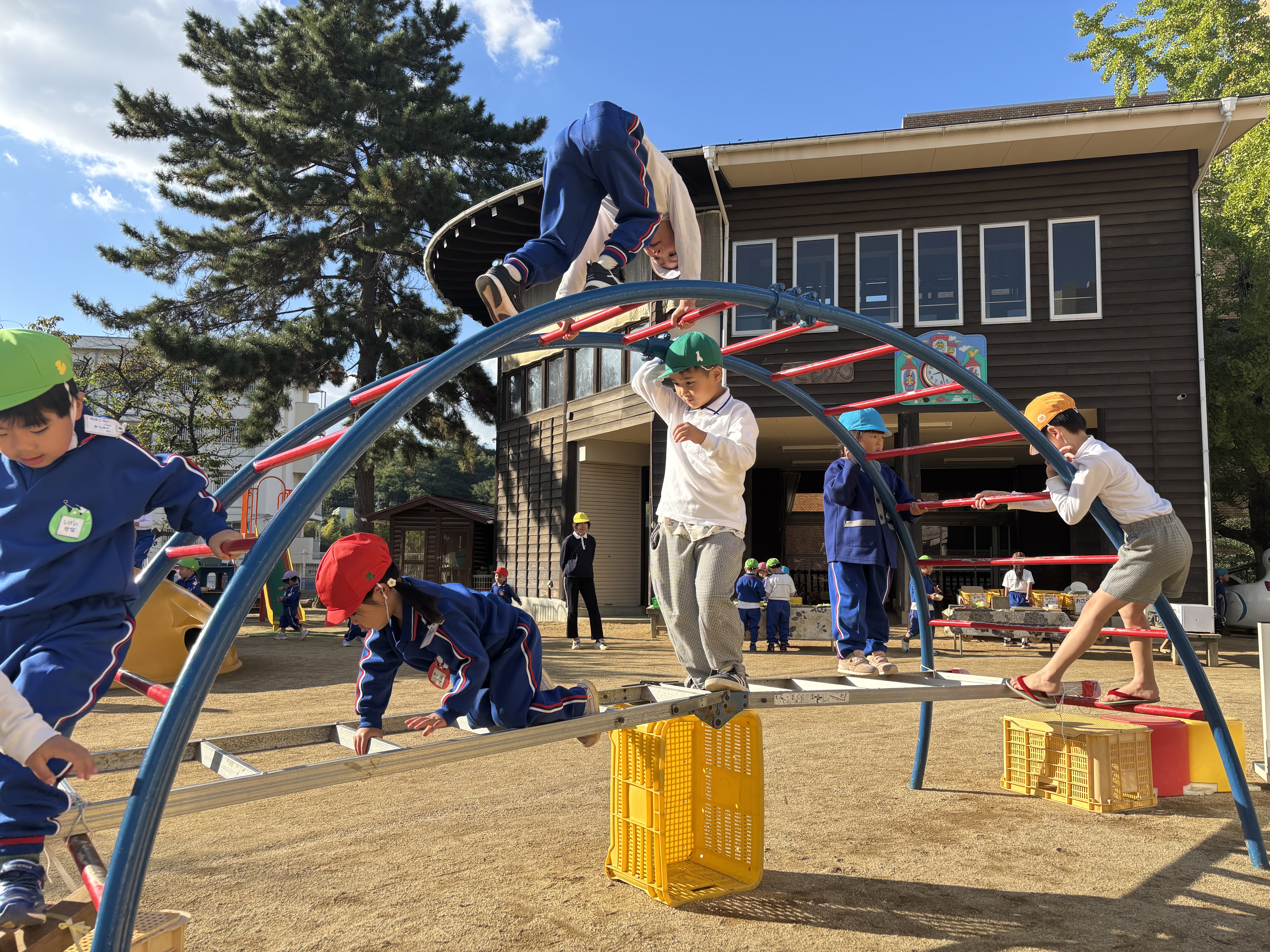 そしてそして、、今日はなんと!アスレチックに犬のすべり台が追加されました。滑ってゴールではなく、その後もま道が続いているので、どんどん進みます。年少さん達もバランスをとりながら上手に平均台を渡り、柵の橋がユラユラするけれど、グっと力を入れて楽しそうに笑っていました。外で遊ぶにはぴったりの気候だなぁ、みんなの笑顔かわいいなあと思う朝でした。