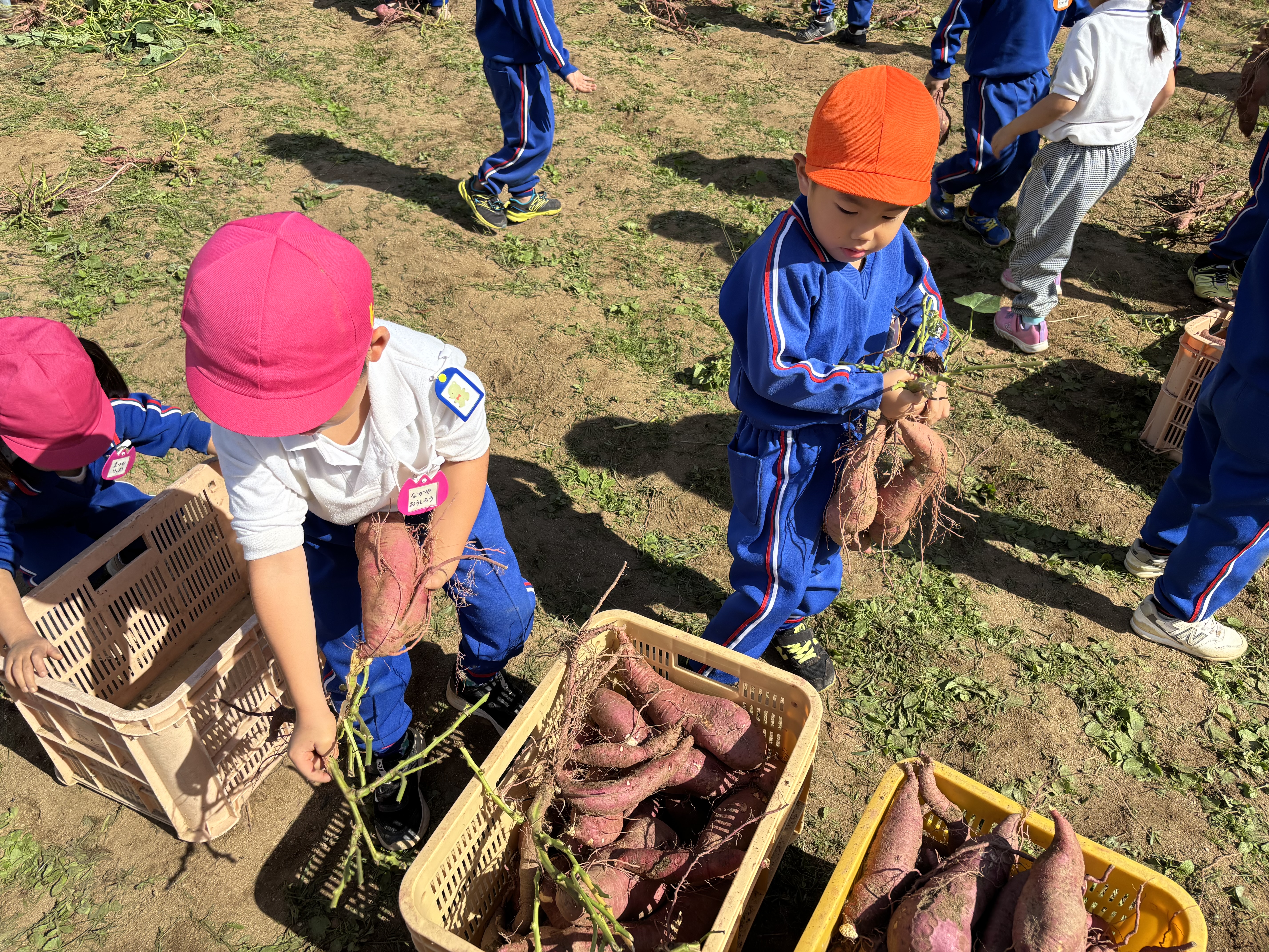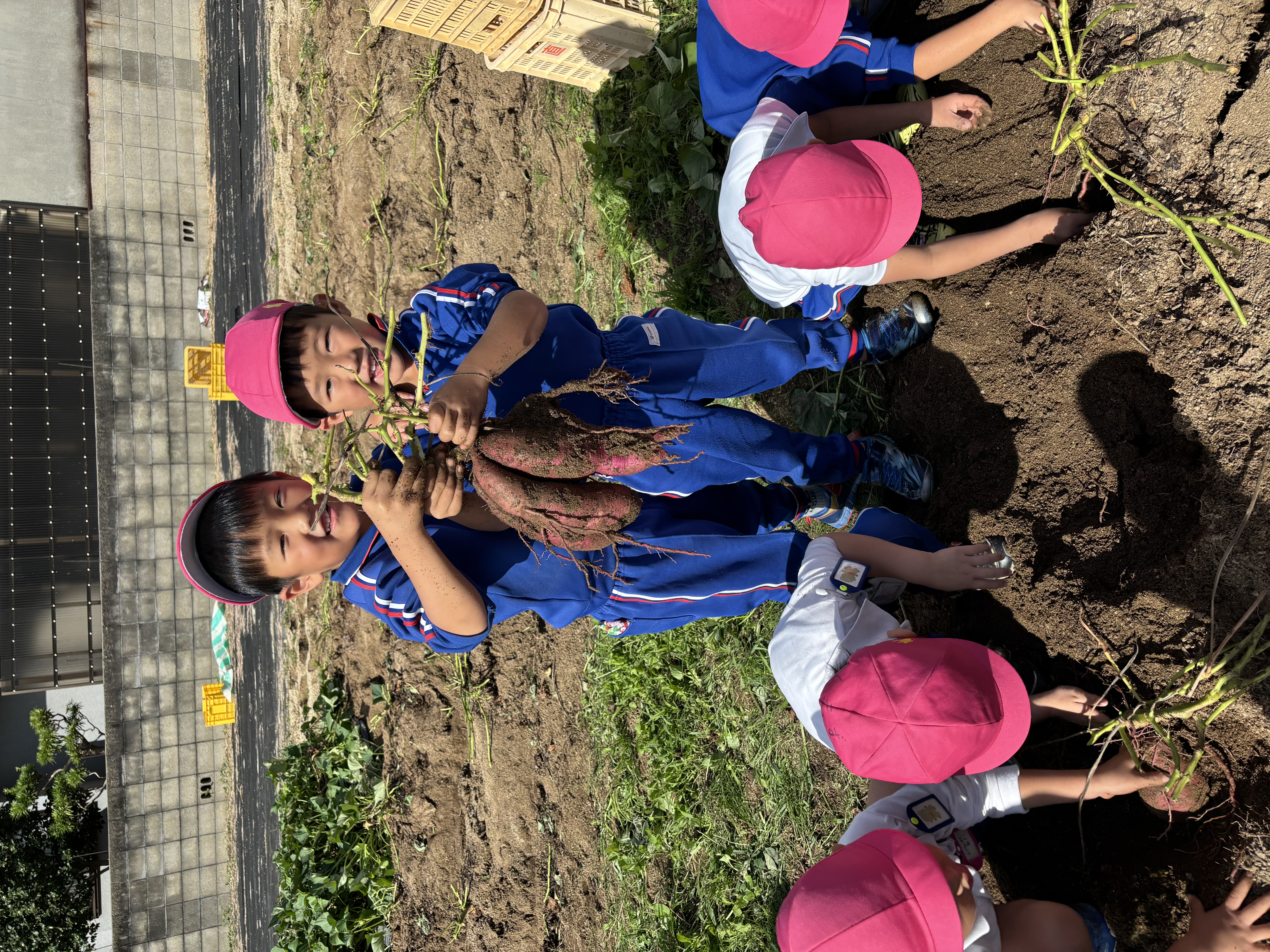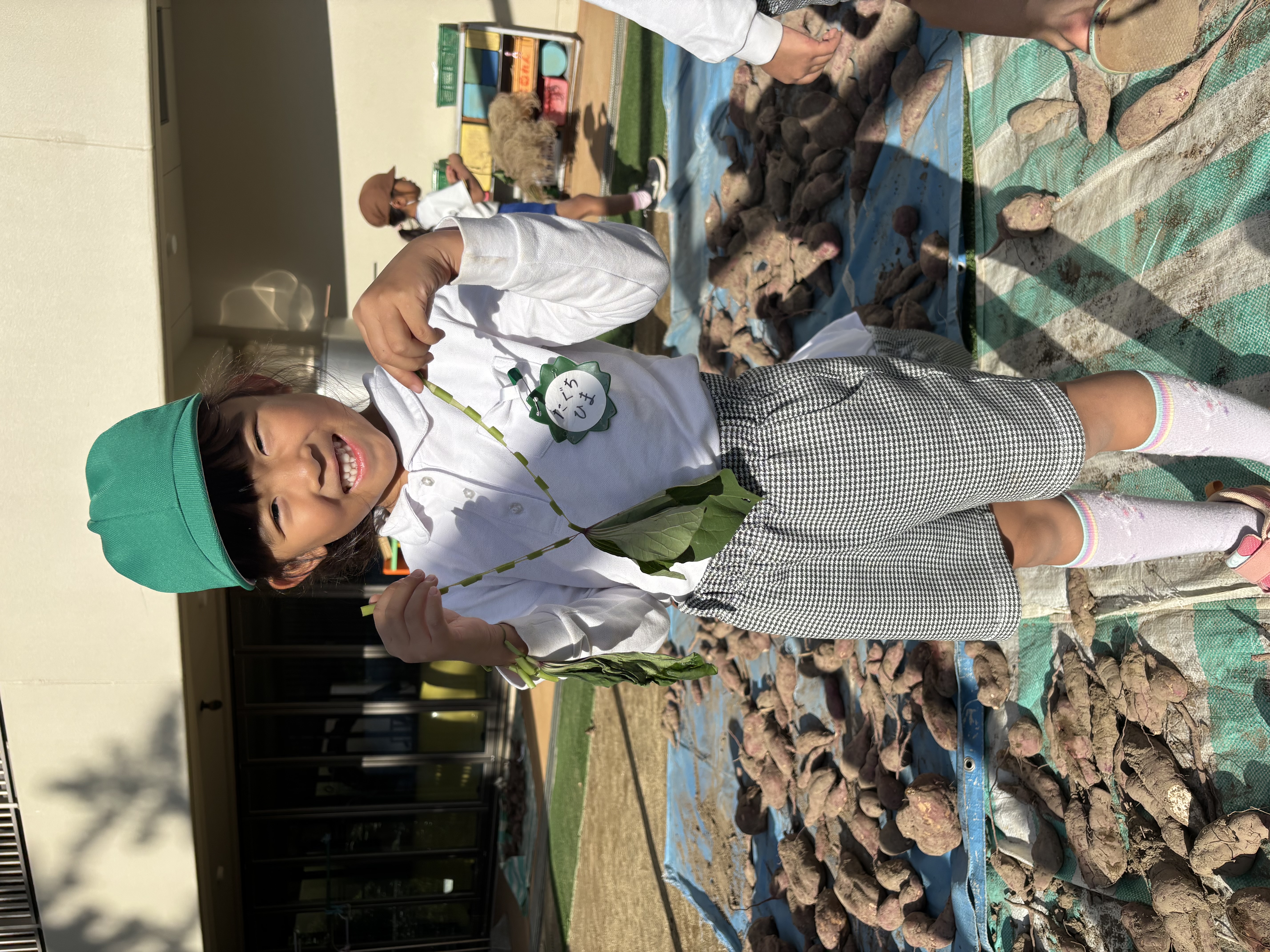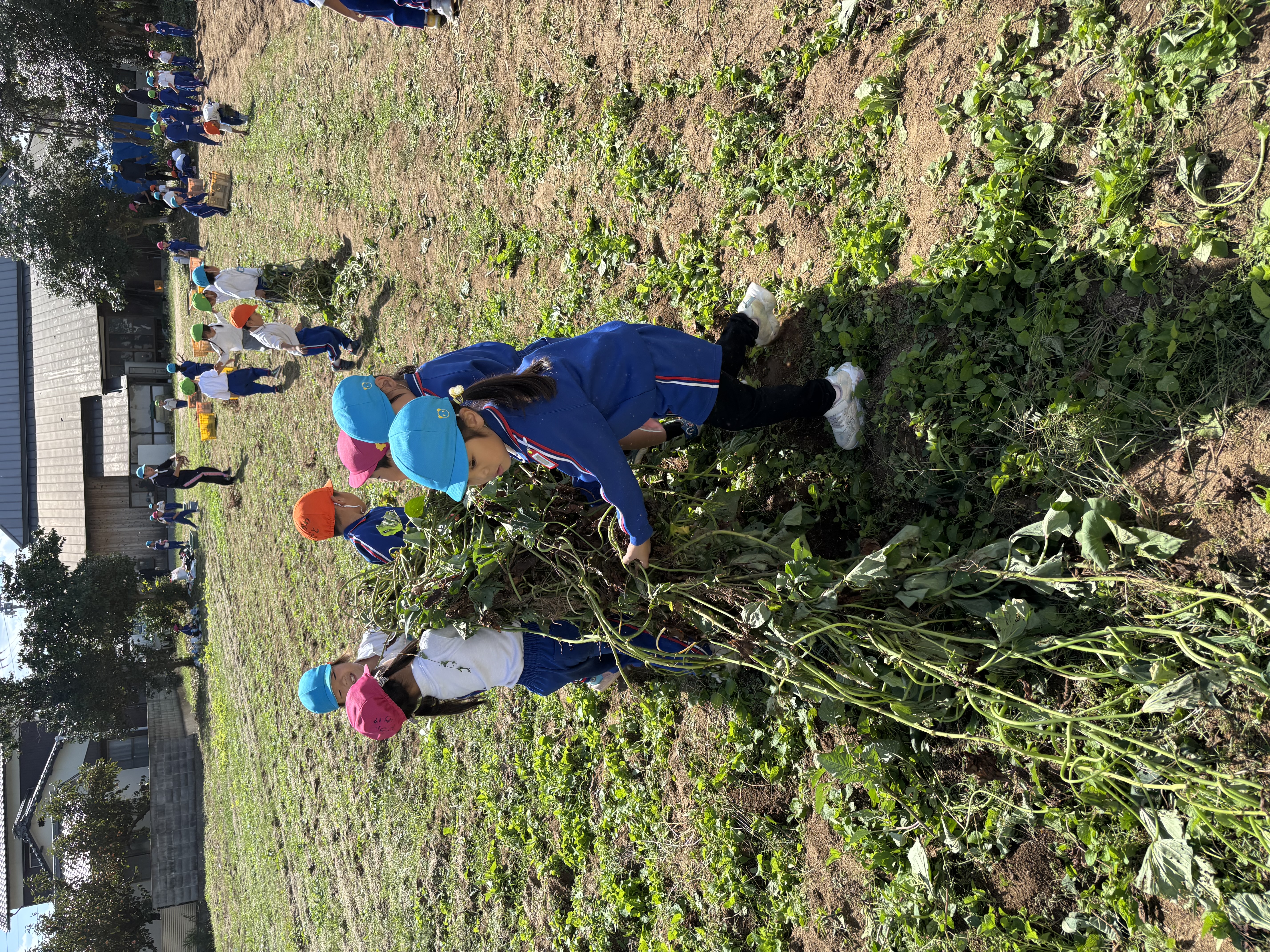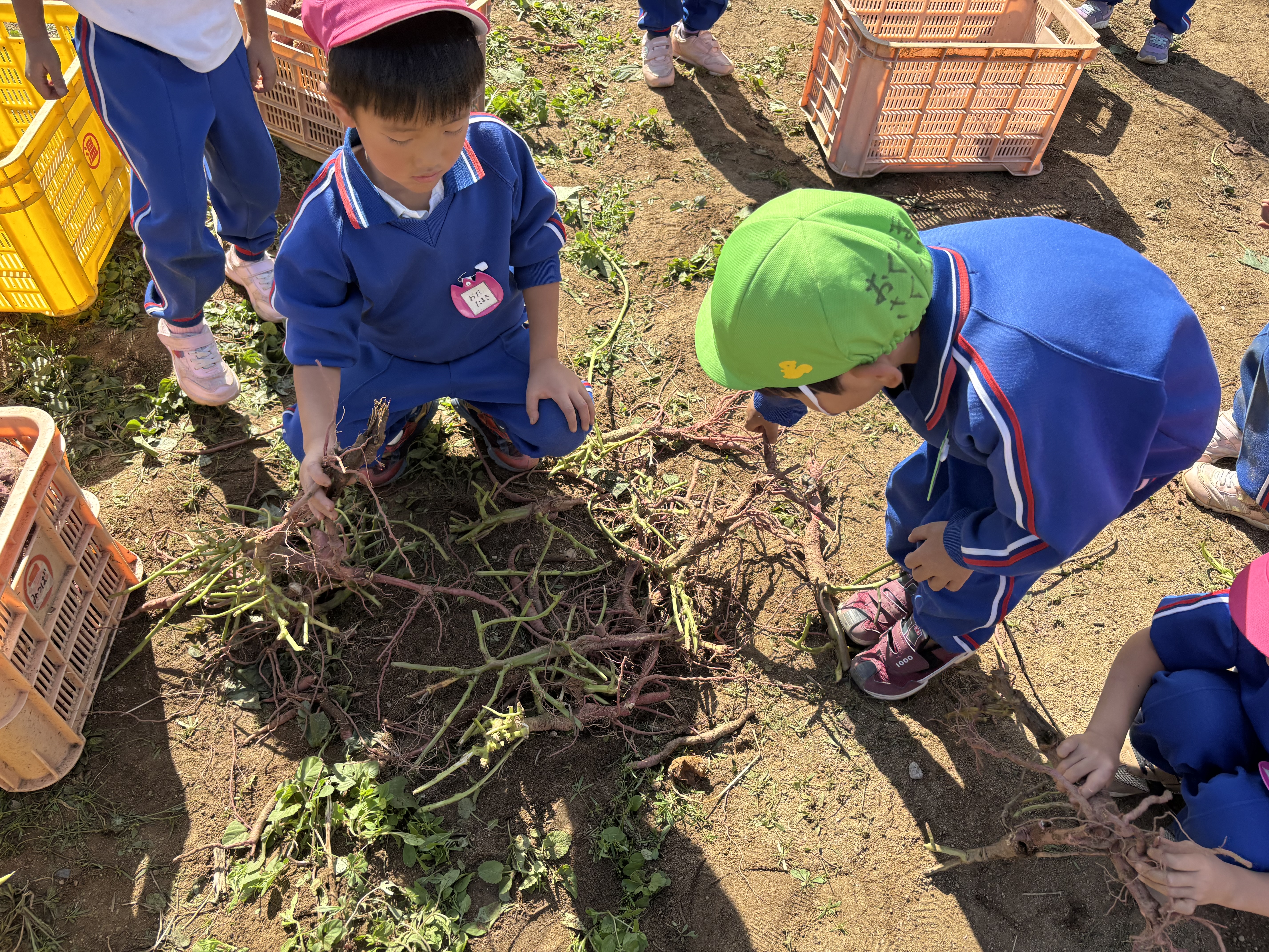 自分達が掘ったあとは、年少さん、プレ年少さん達のお手伝いです!小さい子が掘りやすいようにギリギリまで掘って「いいよ!ひっぱってごらん!」と言う優しい女の子もいました。どの学年の子もニコニコでいい顔のさつまいも掘りでした。