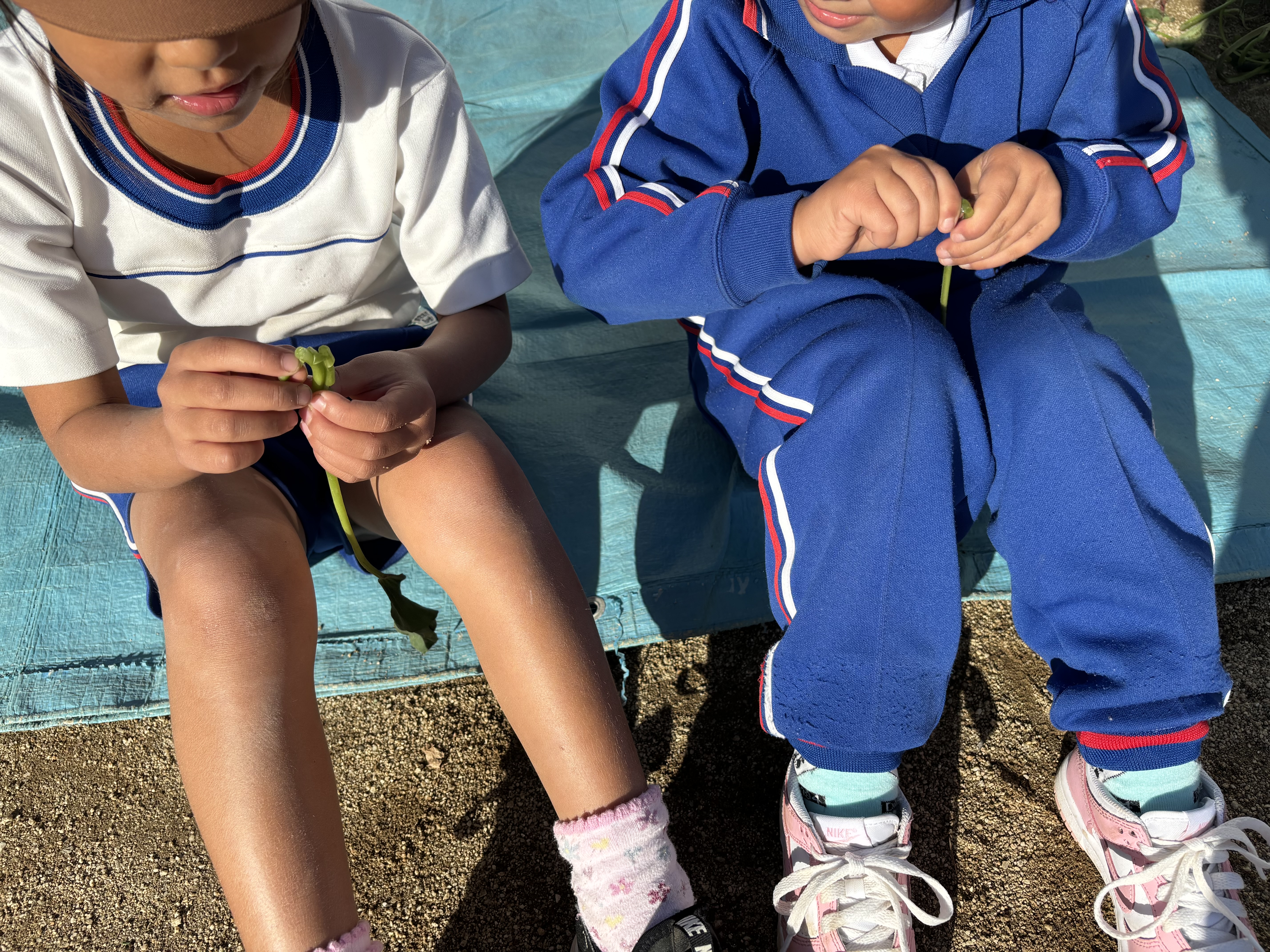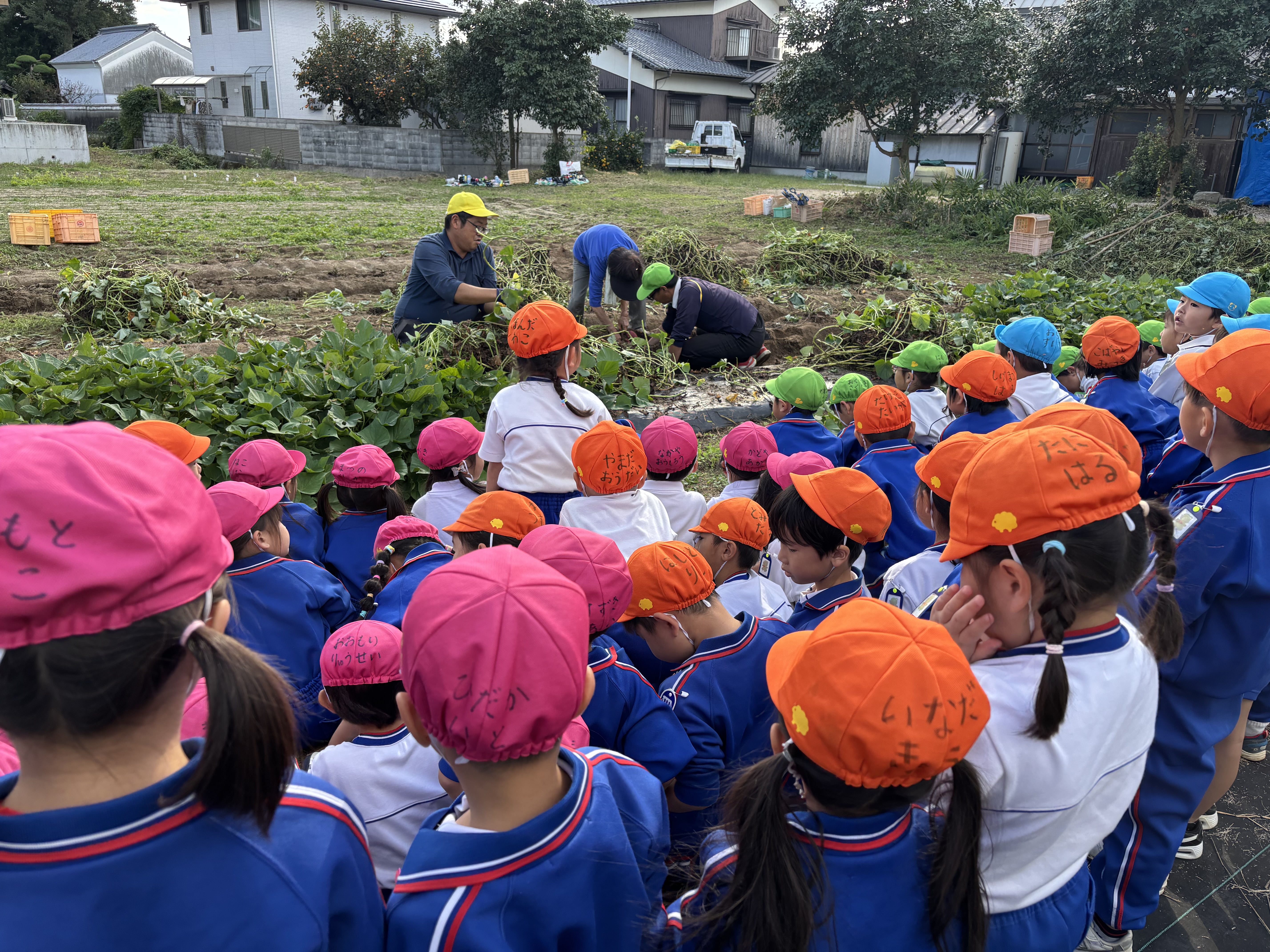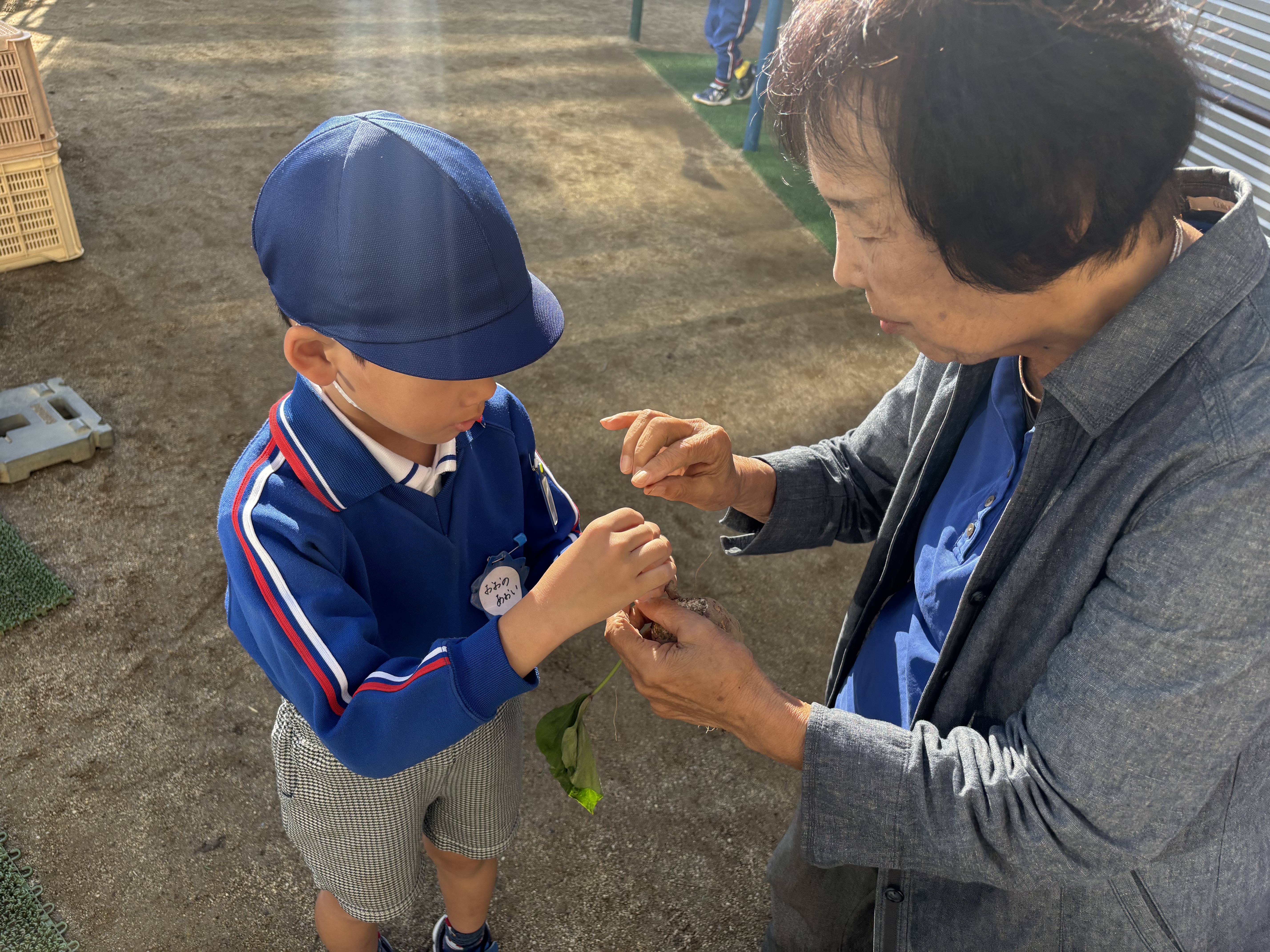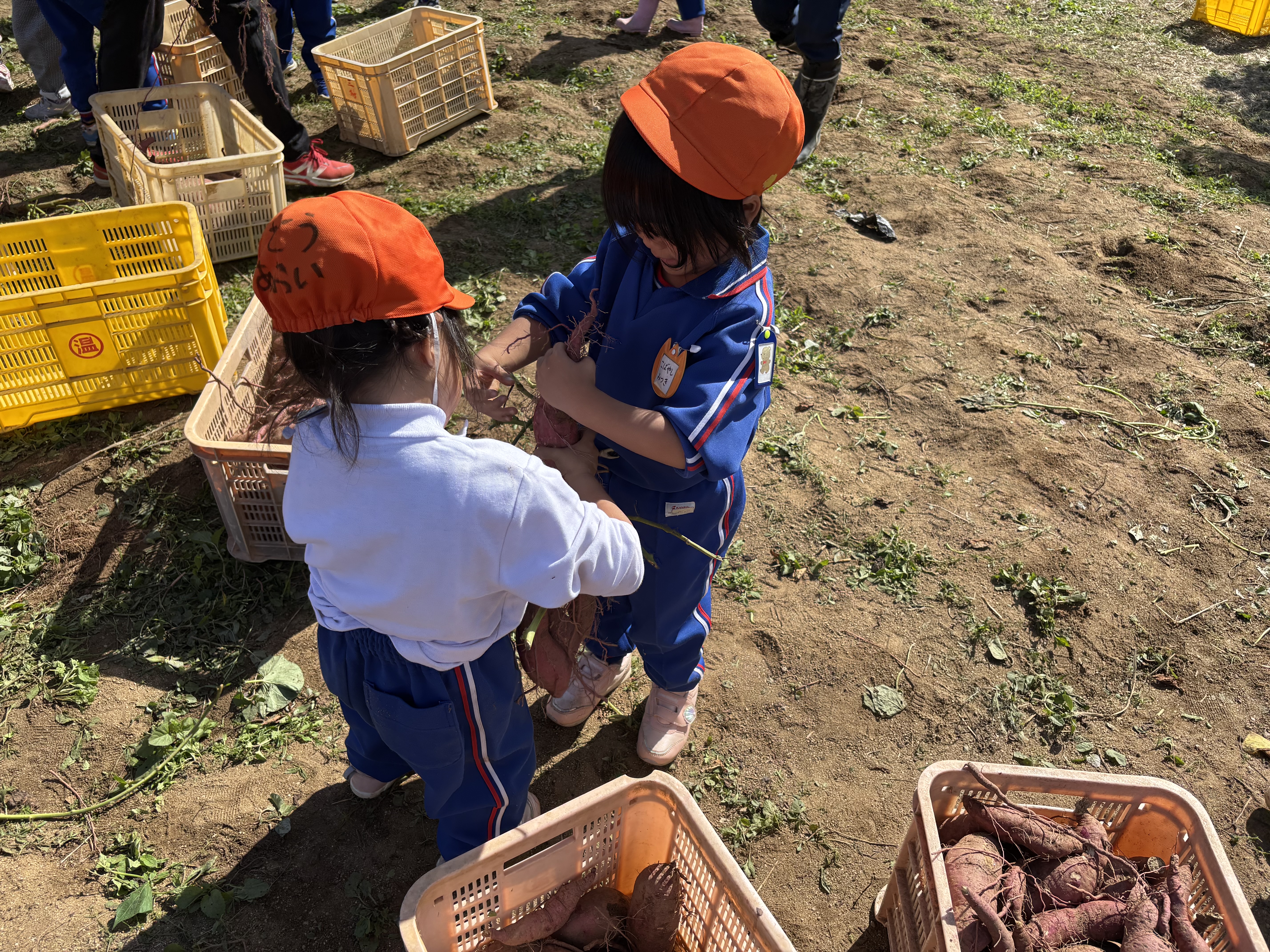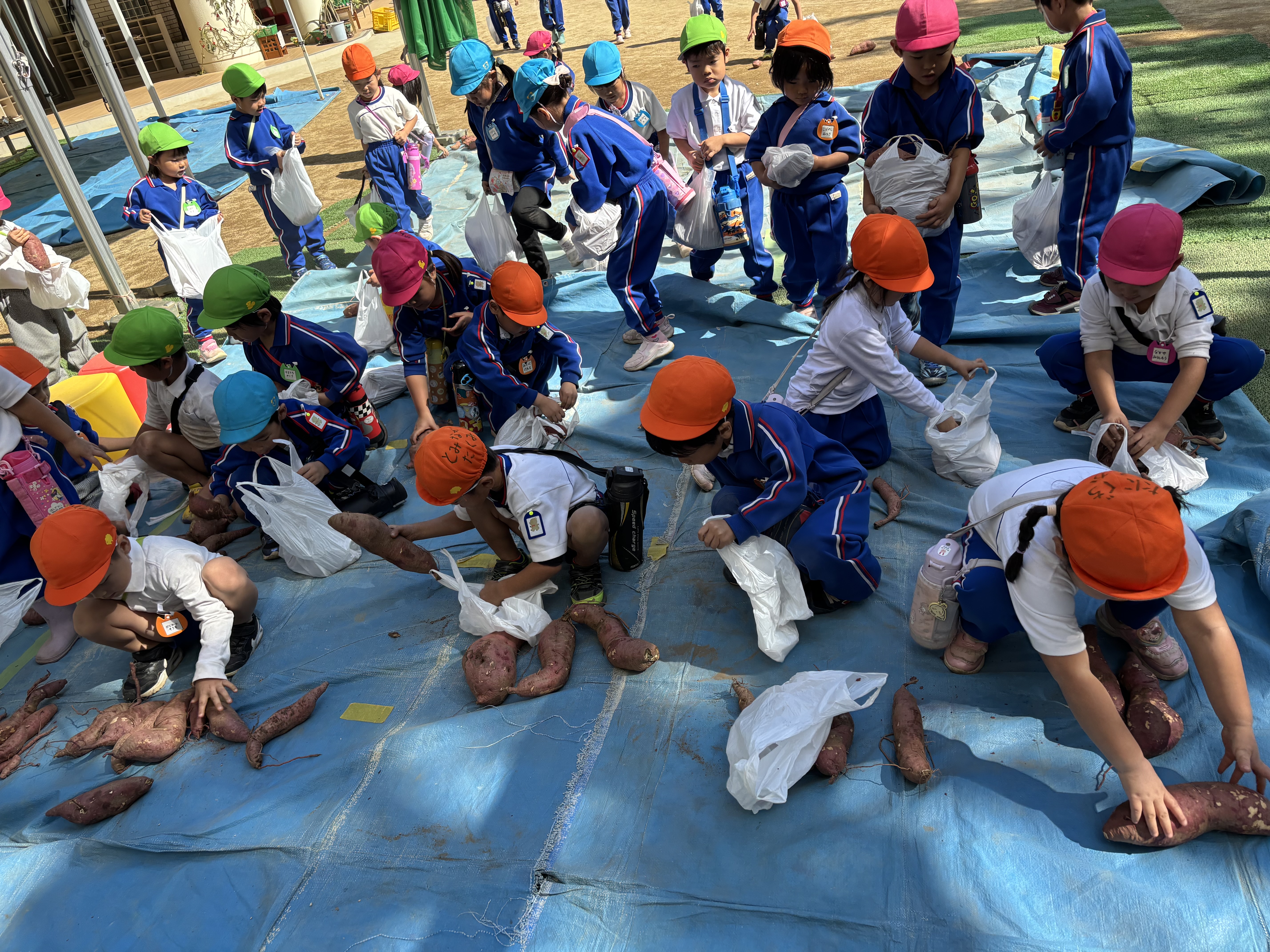 自分達が掘ったあとは、年少さん、プレ年少さん達のお手伝いです!小さい子が掘りやすいようにギリギリまで掘って「いいよ!ひっぱってごらん!」と言う優しい女の子もいました。どの学年の子もニコニコでいい顔のさつまいも掘りでした。