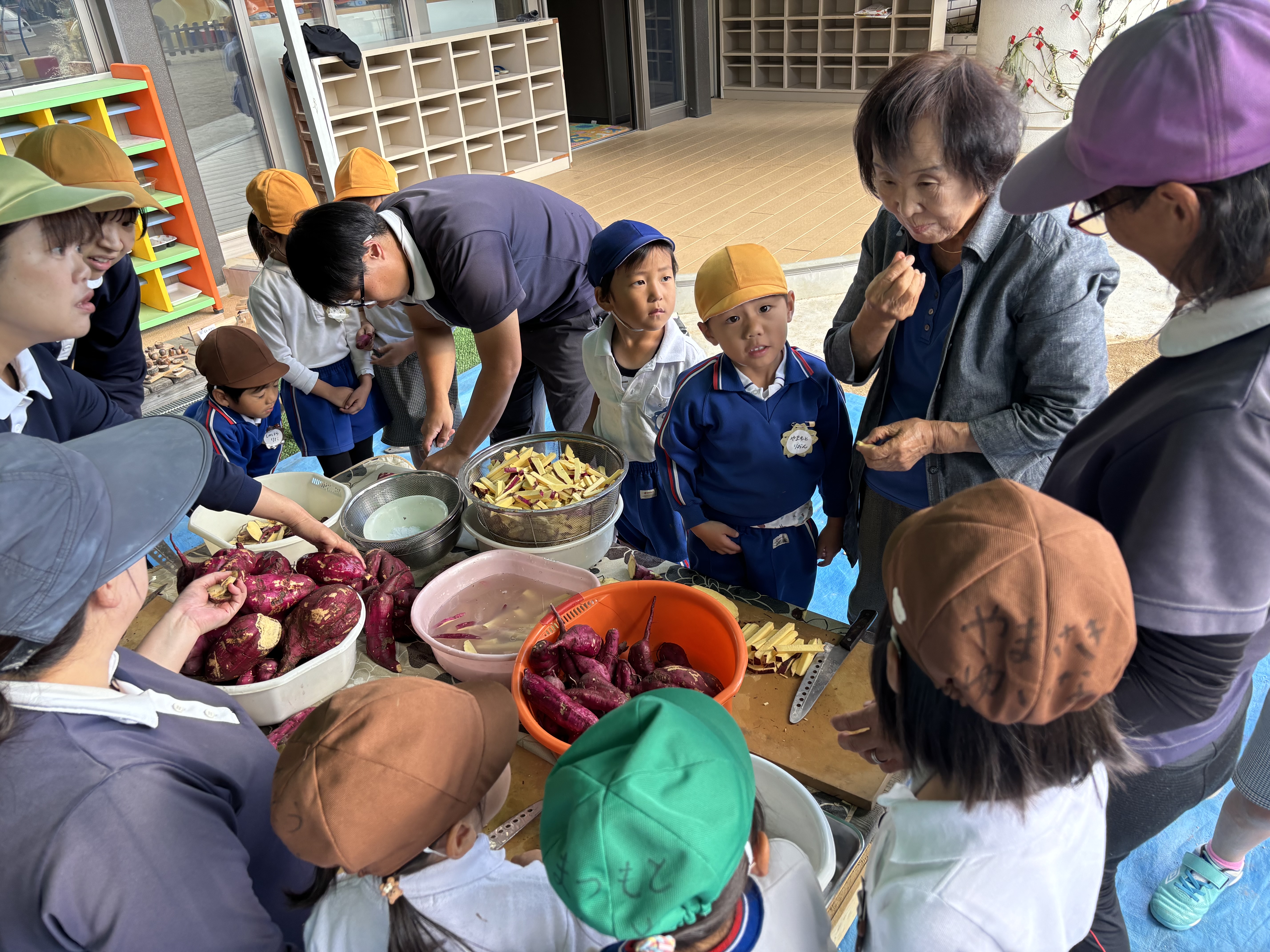 そこへ、古森生生がやってきて、昨日の乾かしているお芋の所に行き「みんなは食べるのが好きだよね」と、一つ芋をとって「今日食べようか!」と言ってくれました。そこからは先生クッキングの時間♪です。さつまいもを切っていると、待ちきれない♥と言わんばかりに子どもたちが集まってきました。お芋を洗ったり、あの先生の切ったお芋は大きい!などとおもしろおかしく話したりしながら準備しました。