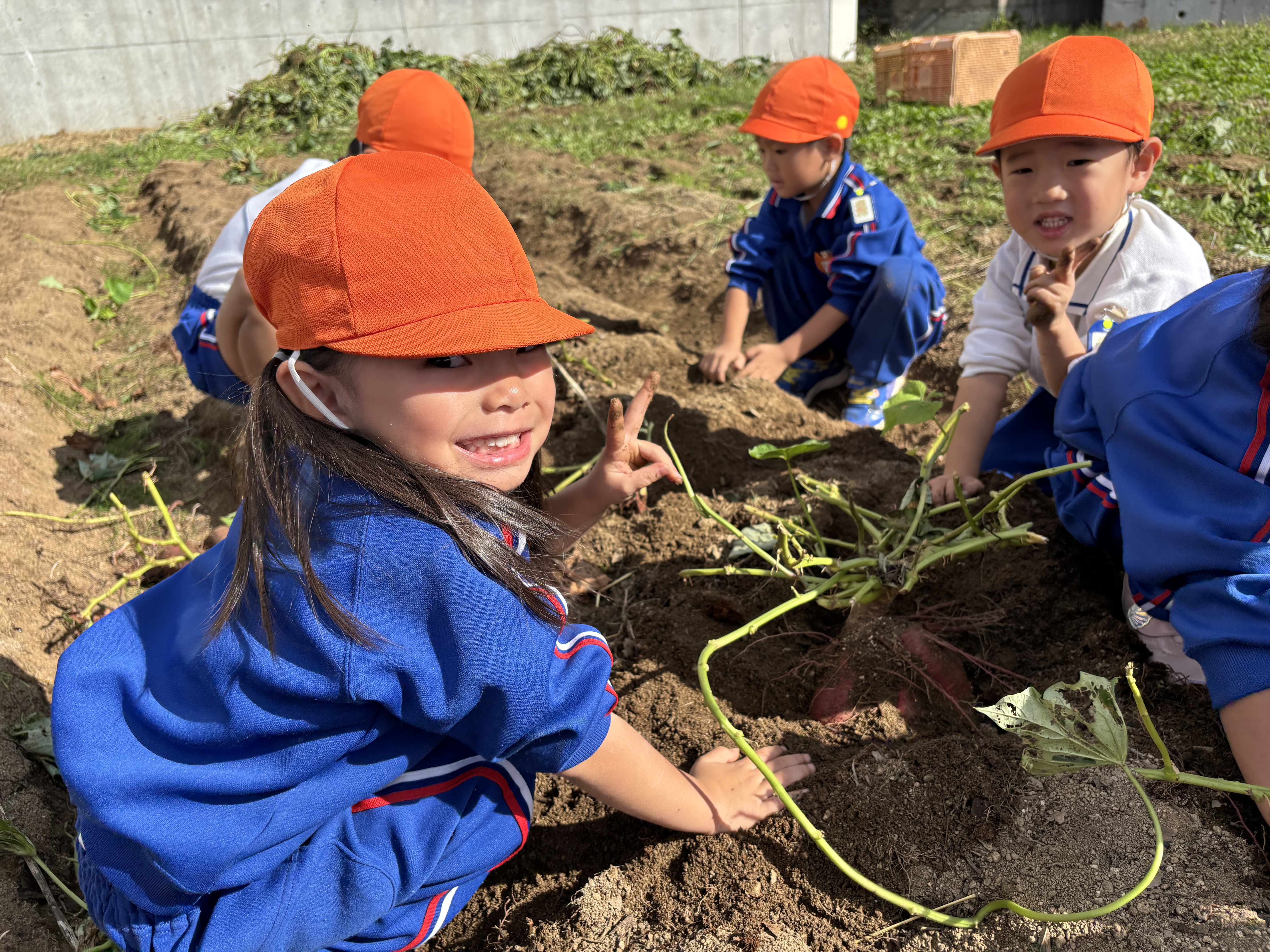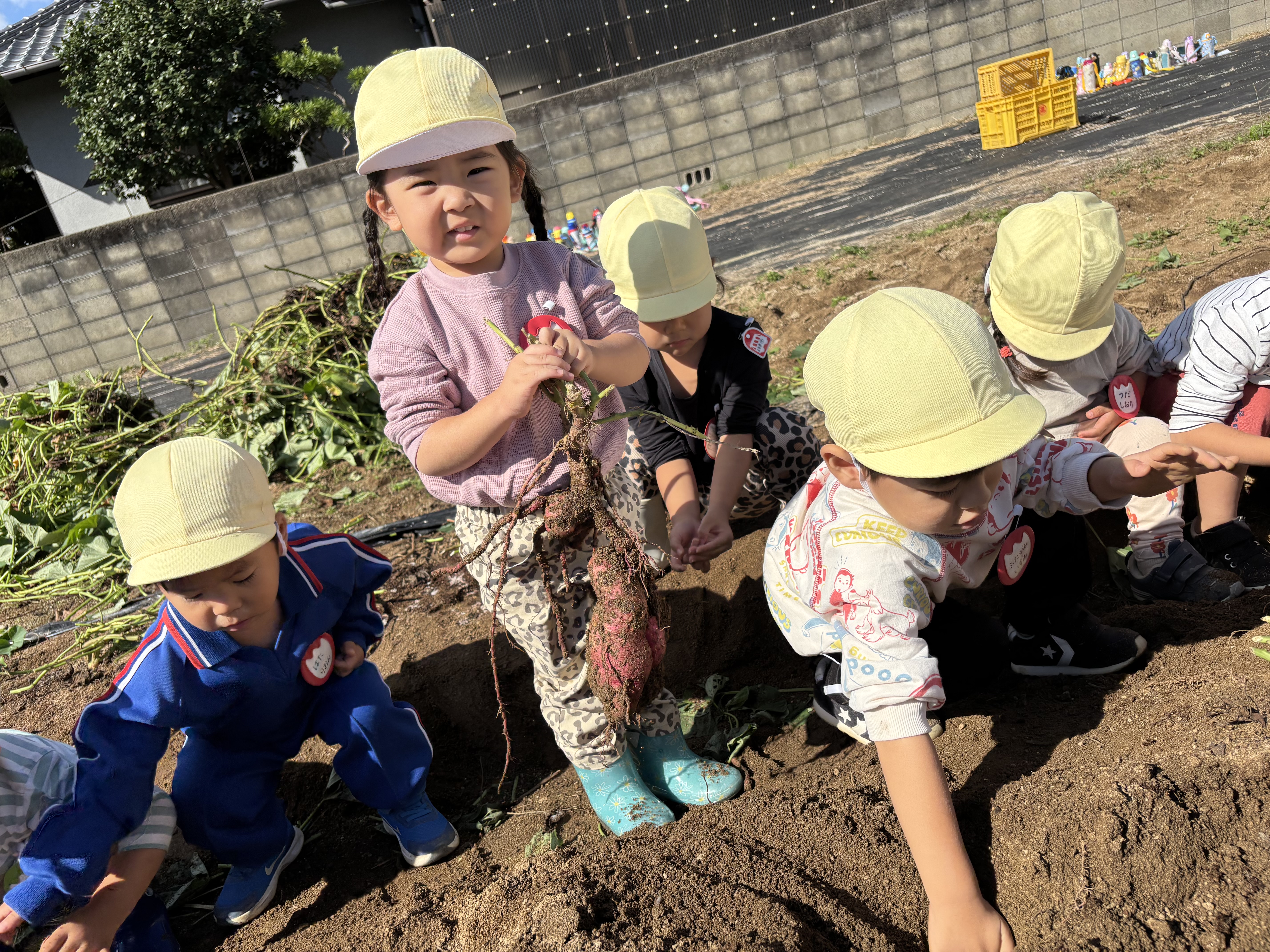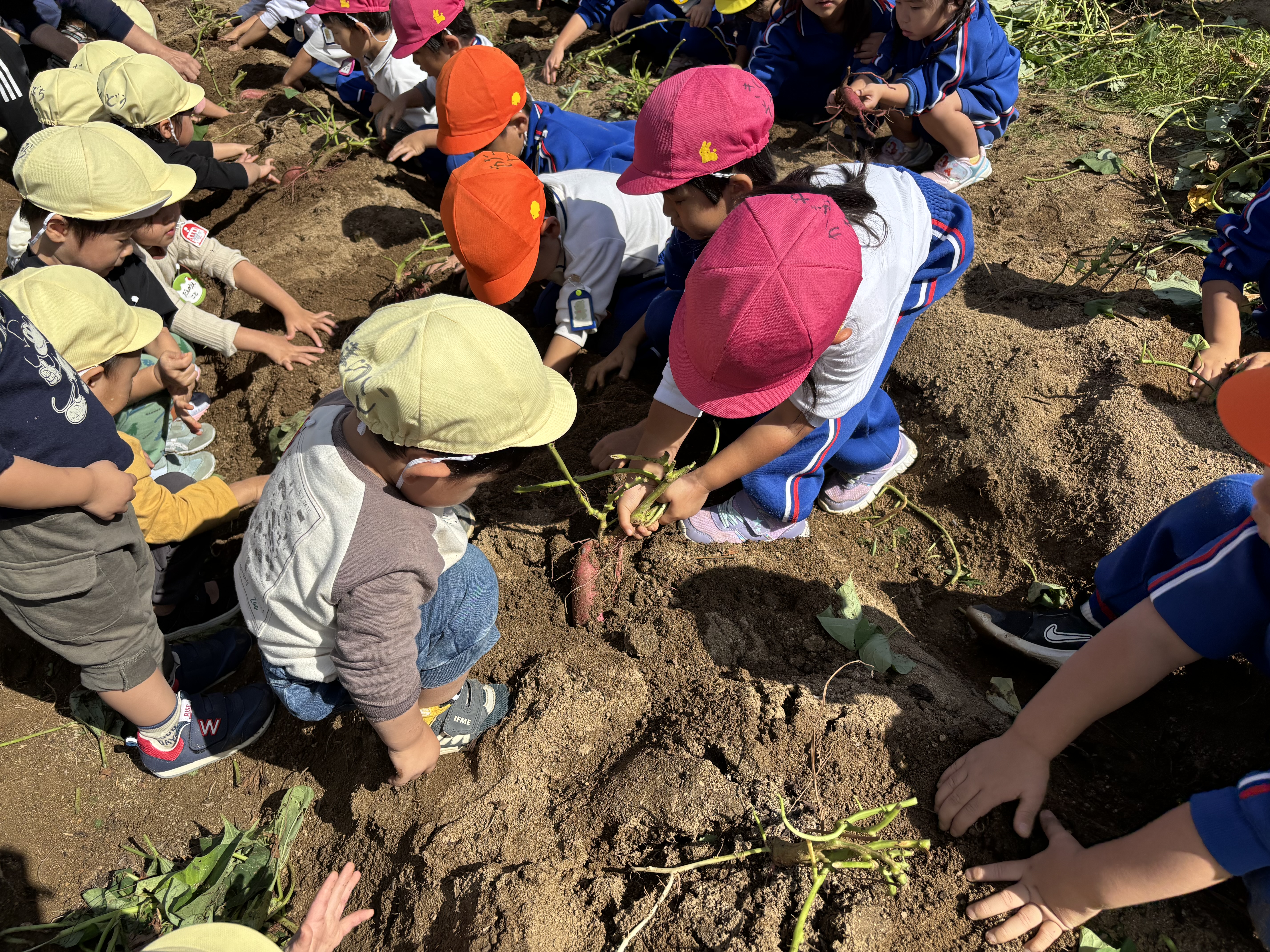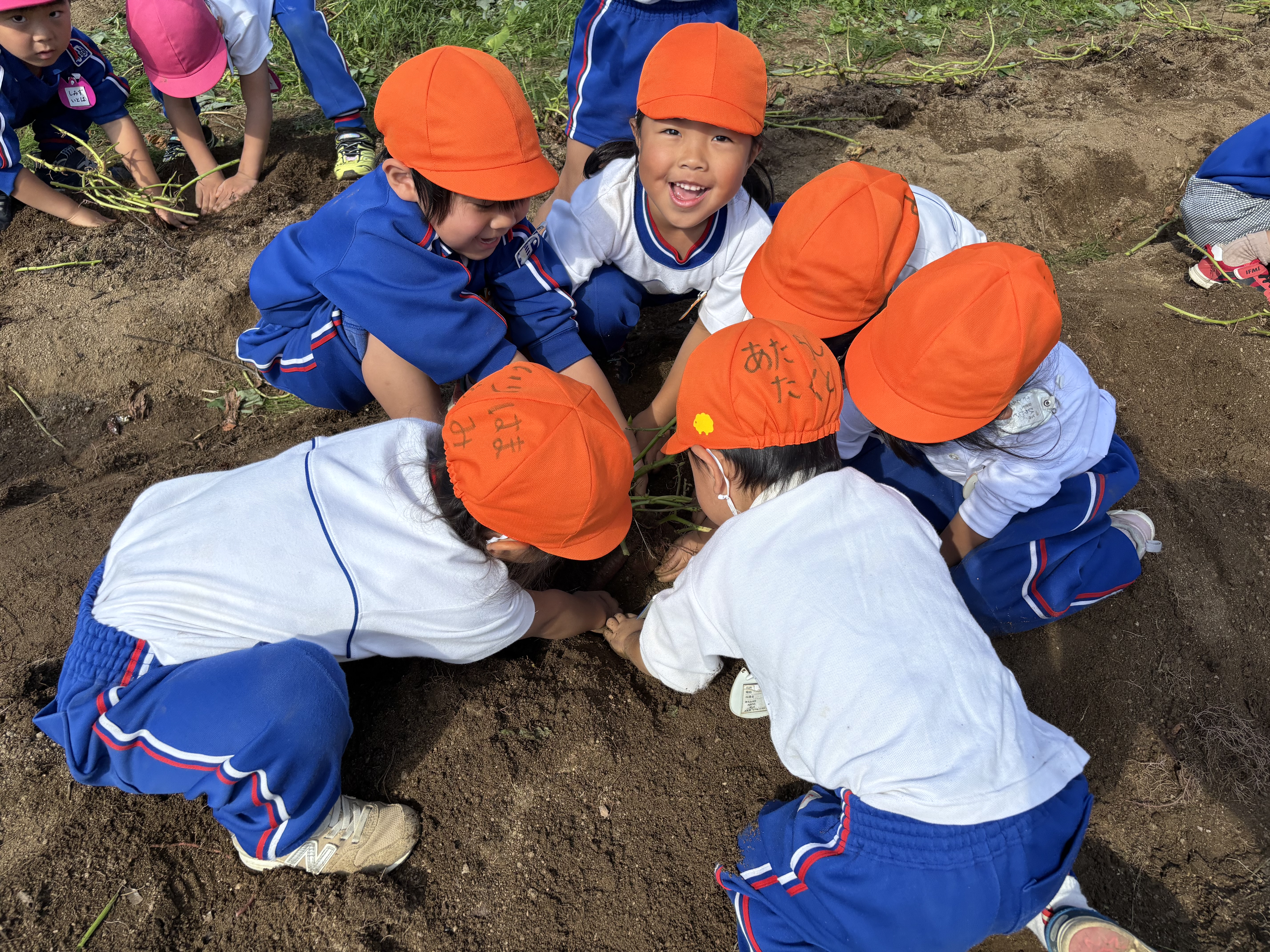 芋のでき方や栄養のもらい方、さつまいもは何を植えたらできるのかなど、しっかり話しを聞いたあと、さあ!力を合わせて掘っていきます。「私達の手は今日はモグラの手だ~!」と言いながら、一生懸命掘っていました。あちらこちらで「ごめん!こっちもお願い!」などと気付けば協力し合っていて逞しい子どもたちでした。土が柔らかく掘りやすいというのもありましたが、みんな目がキラキラ⭐︎一生懸命な姿でした。