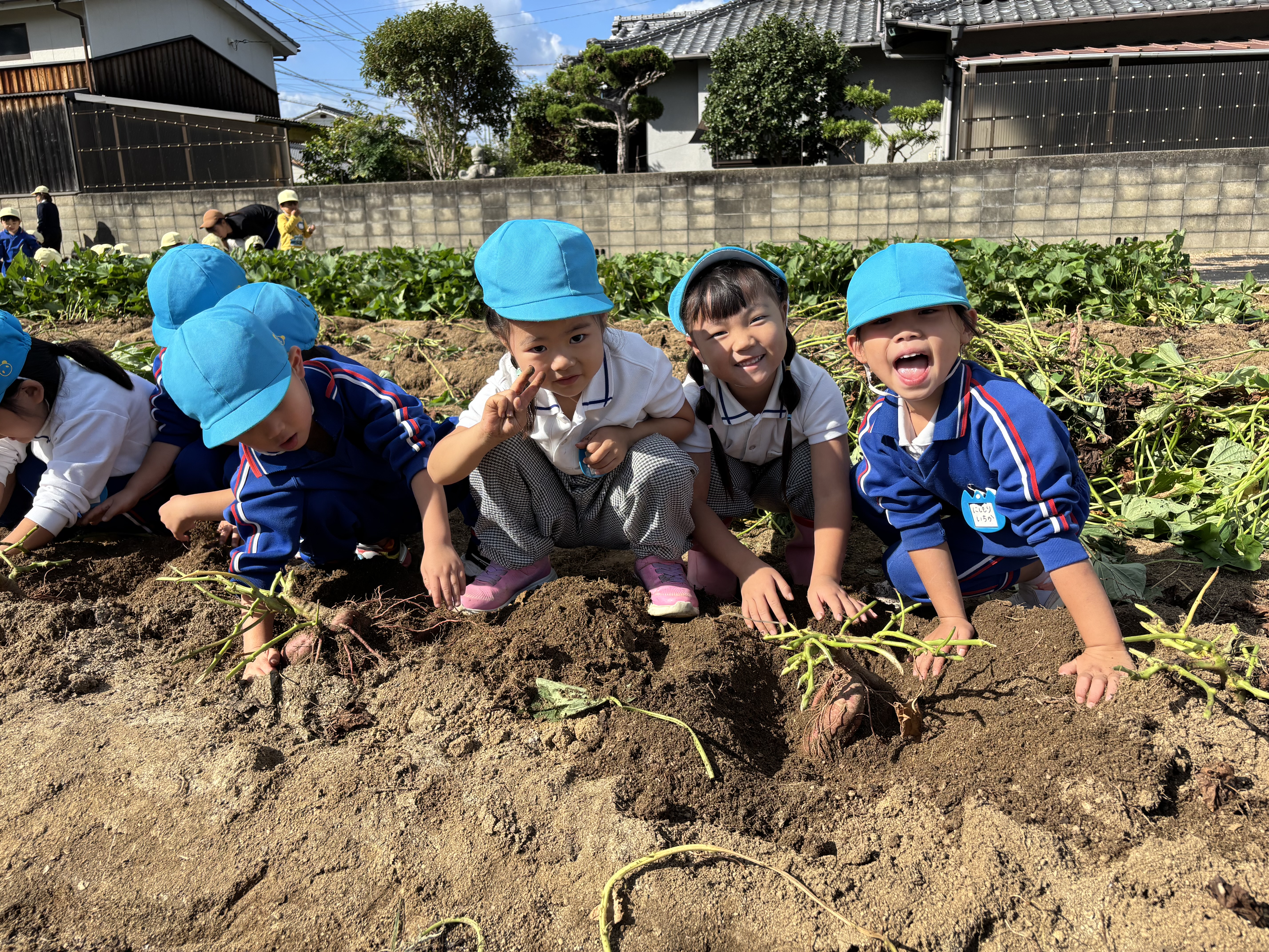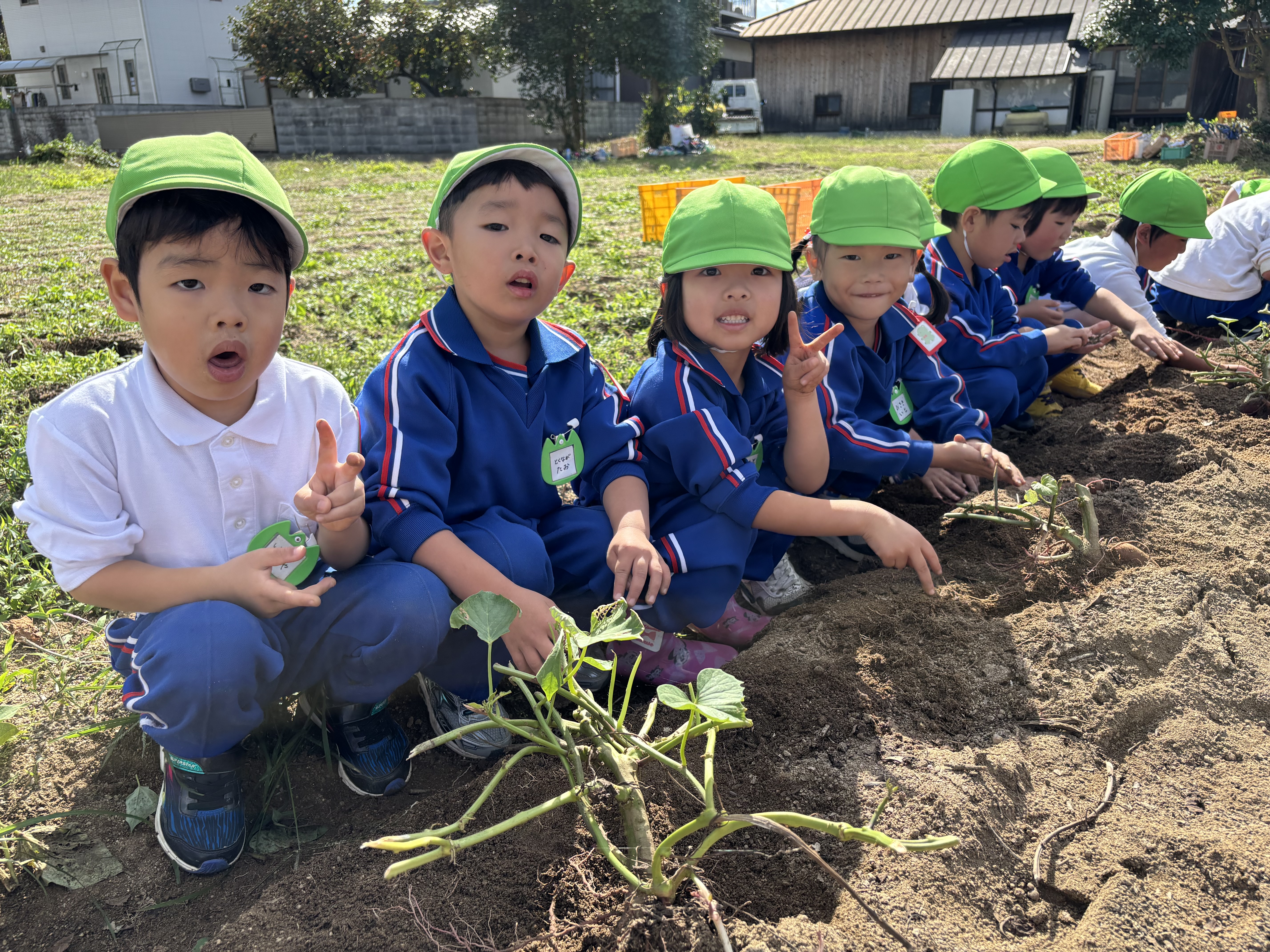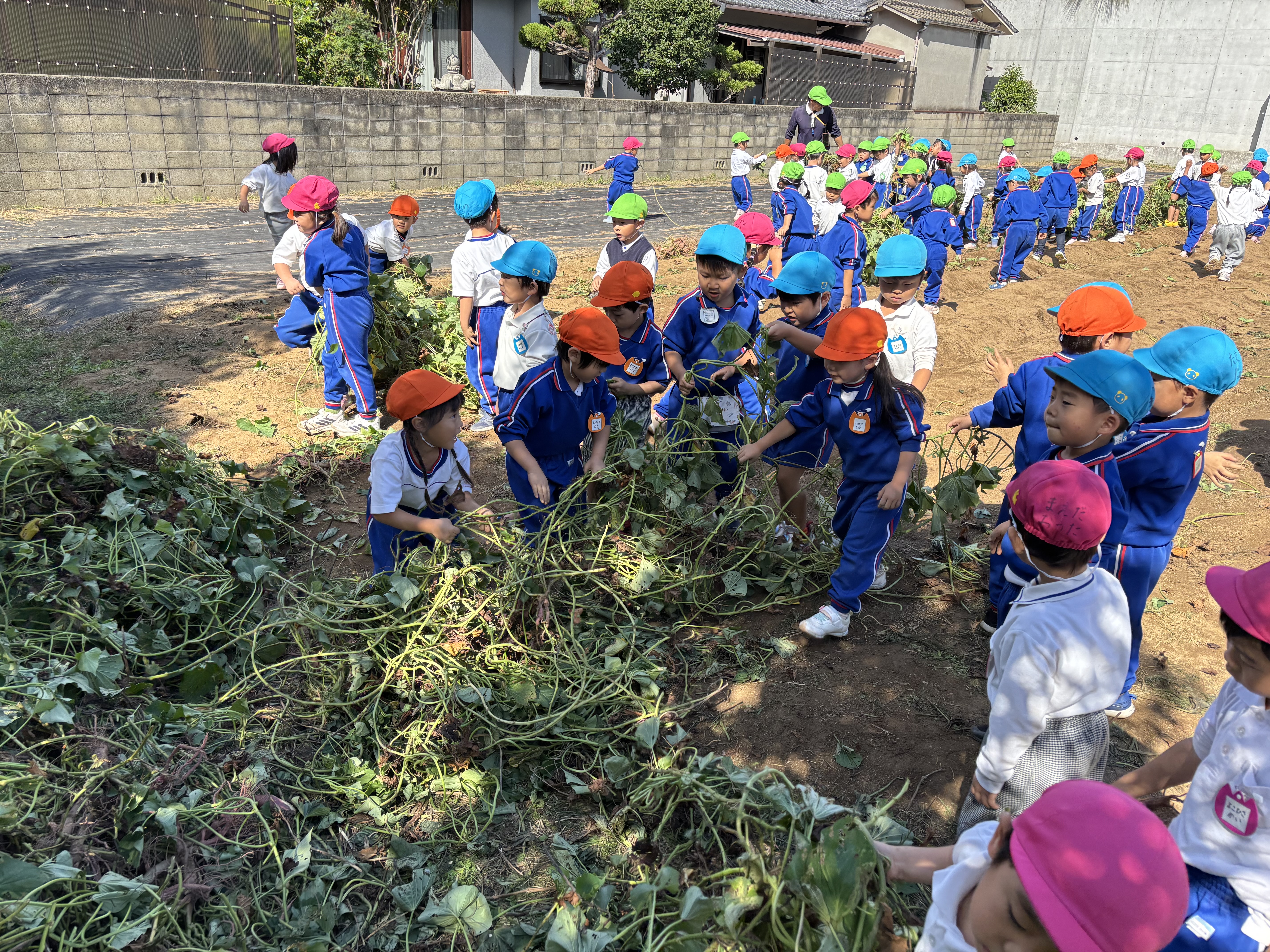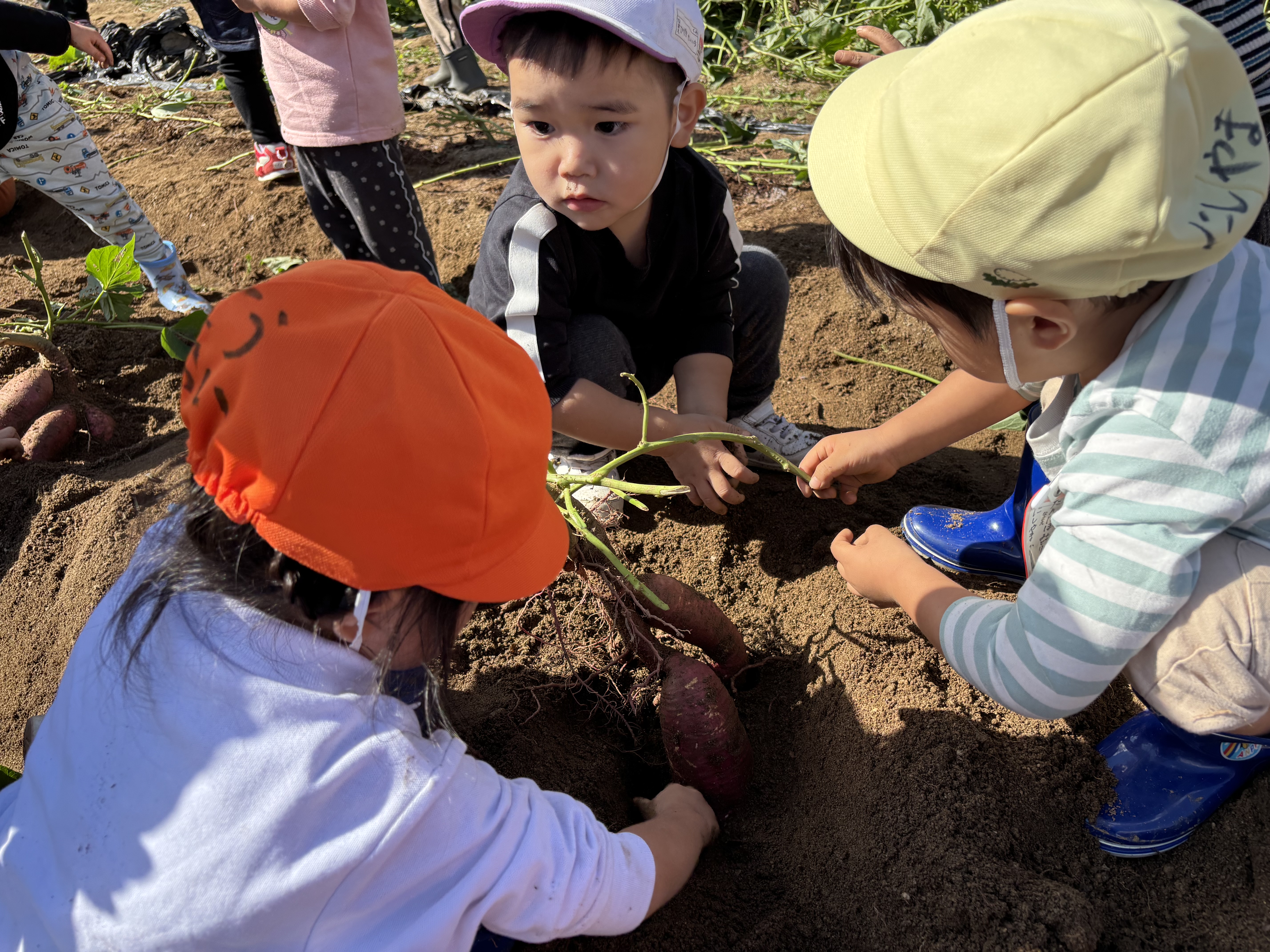 芋のでき方や栄養のもらい方、さつまいもは何を植えたらできるのかなど、しっかり話しを聞いたあと、さあ!力を合わせて掘っていきます。「私達の手は今日はモグラの手だ~!」と言いながら、一生懸命掘っていました。あちらこちらで「ごめん!こっちもお願い!」などと気付けば協力し合っていて逞しい子どもたちでした。土が柔らかく掘りやすいというのもありましたが、みんな目がキラキラ⭐︎一生懸命な姿でした。