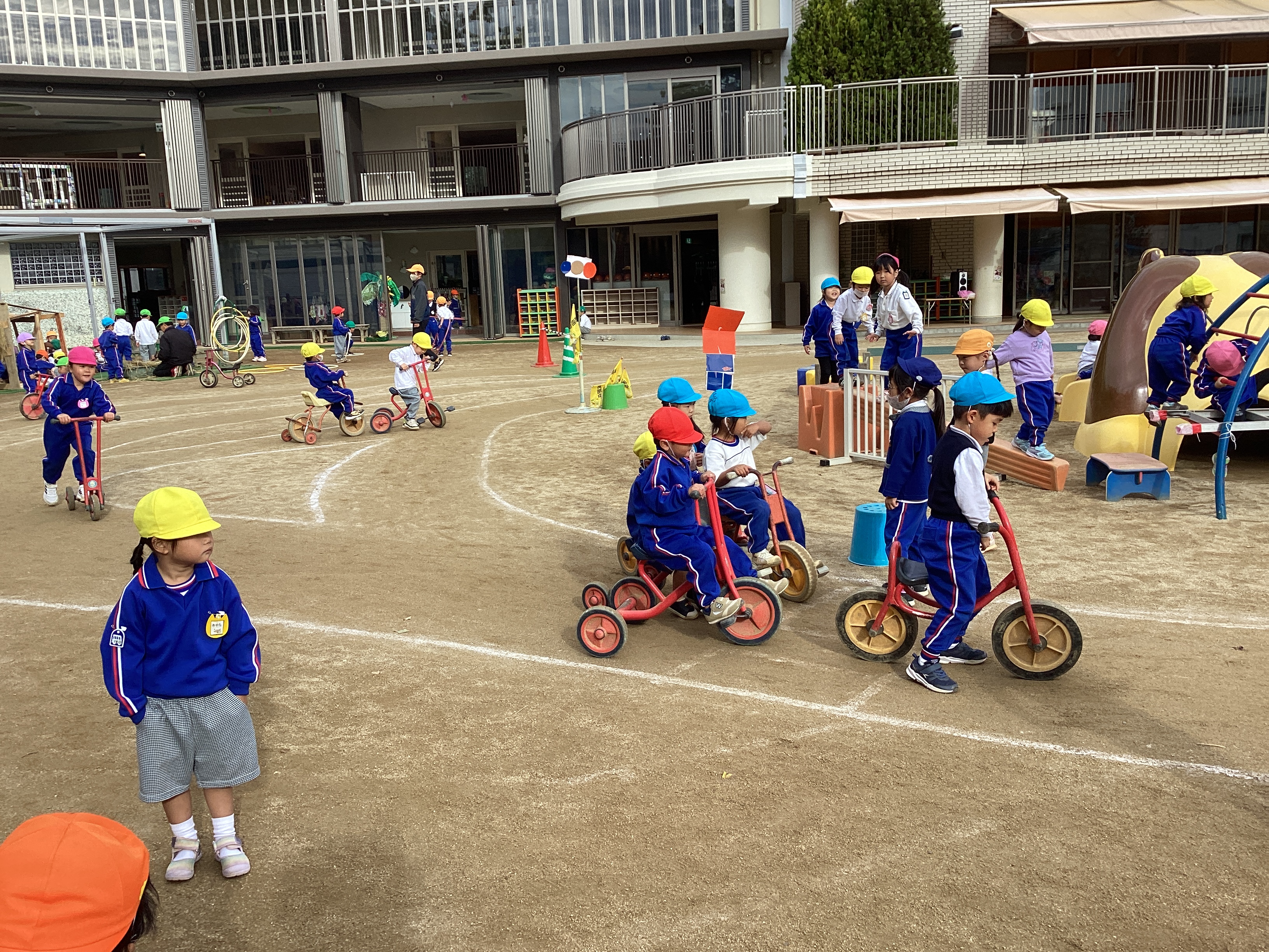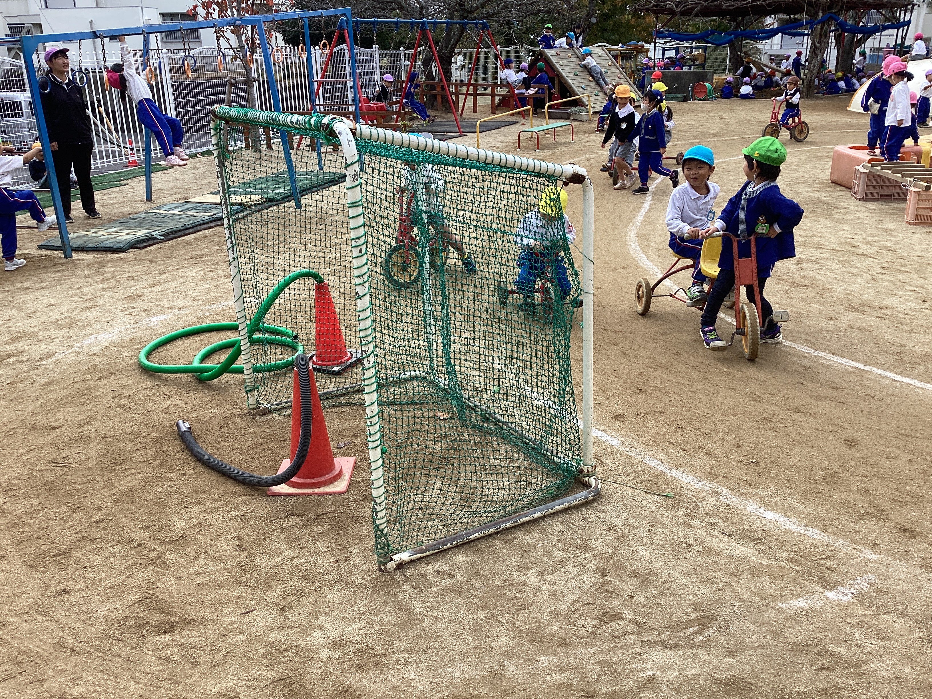 またアスレチックの周囲には道路ができて、自転車の走る道があり、今日も多くの子ども達が三輪車やスケーターなどに乗って走っていました。一方ではそこを渡って砂場などに行きたい子ども達の為に、横断歩道ができ、横断旗が設置されました。その後、信号機が付き、踏切ができ、遮断機が付きました。そして今日はガソリンスタンドができていて、三輪車に乗っている子ども達が給油しに立ち寄っていました。