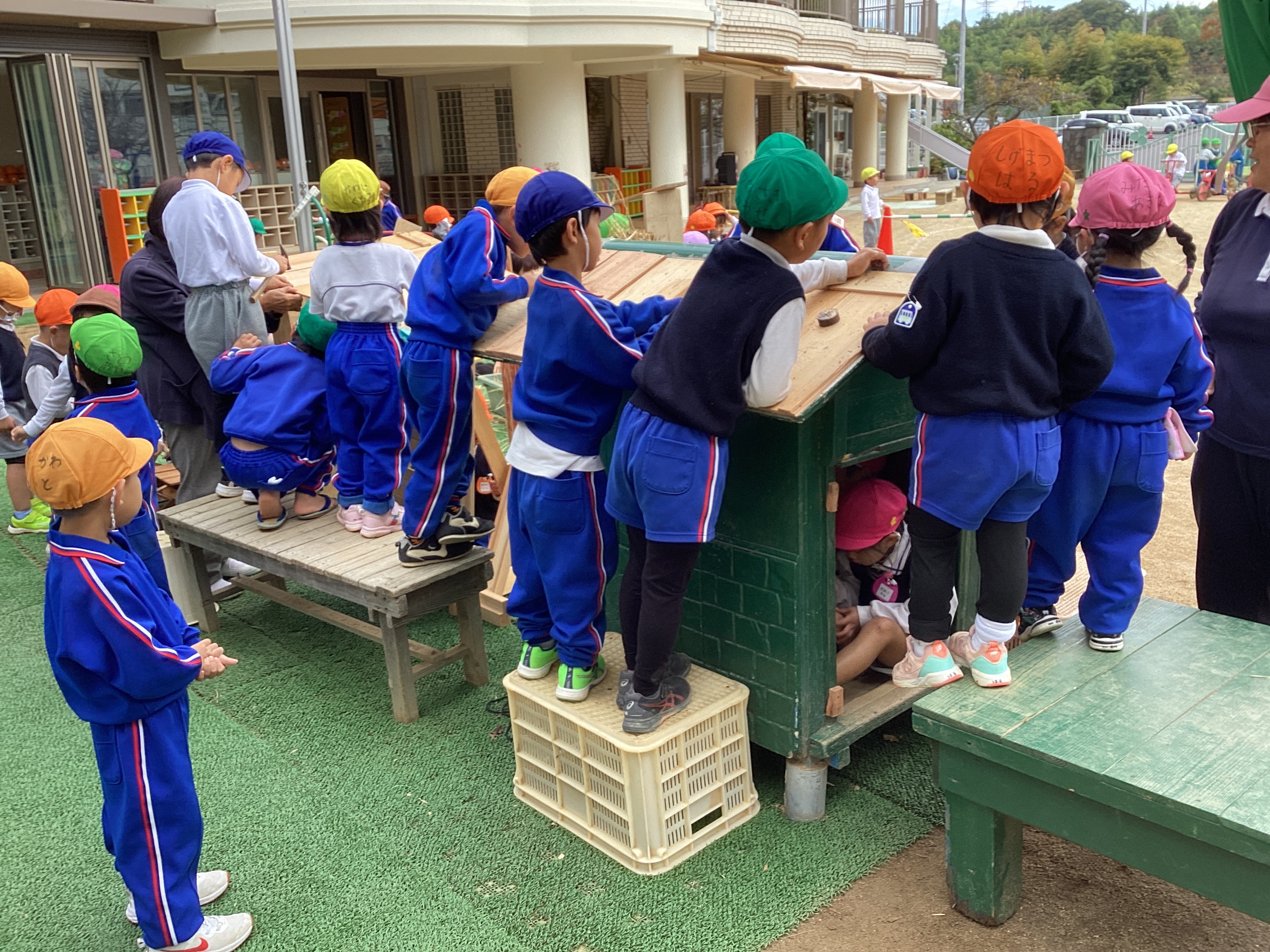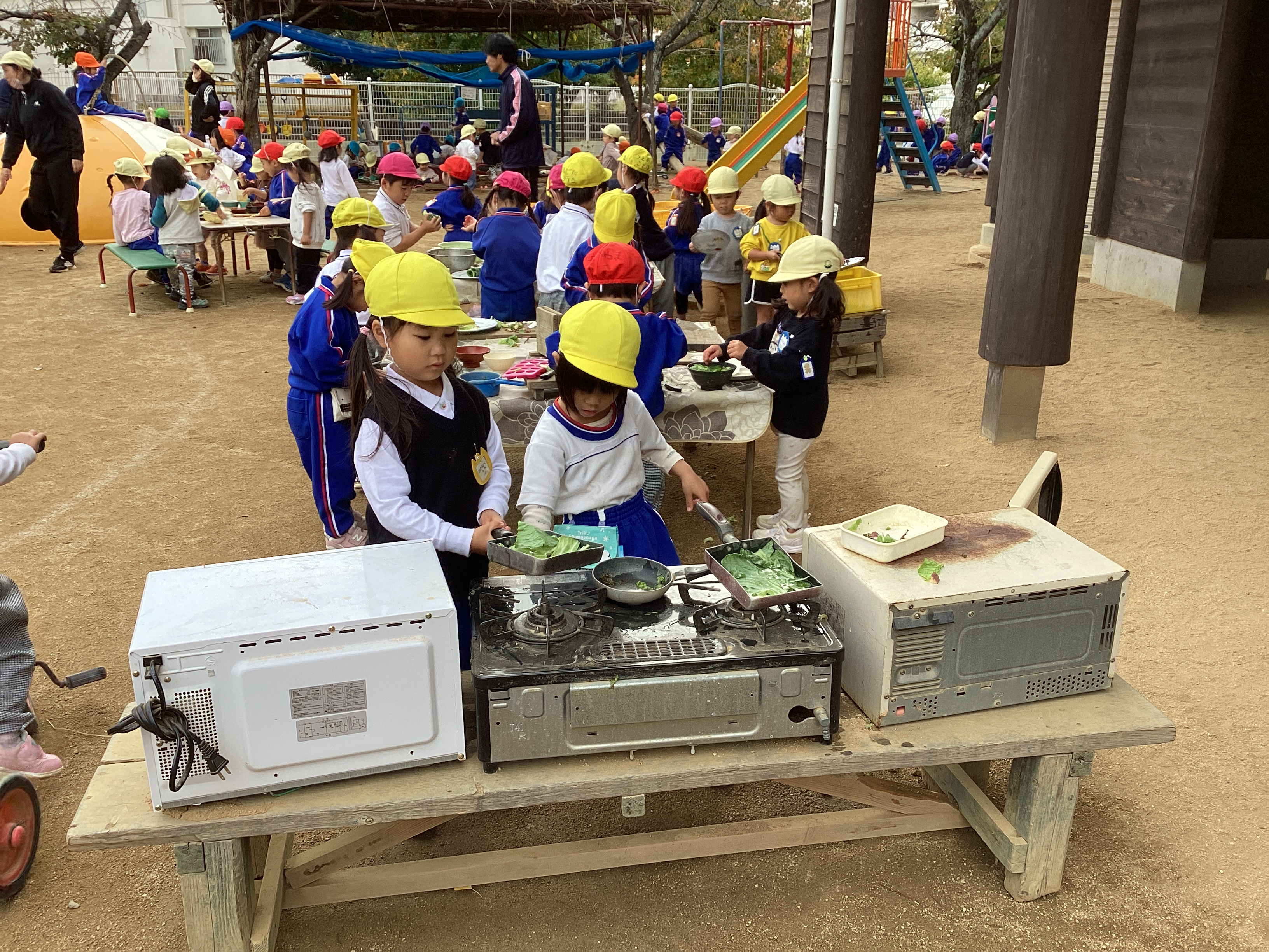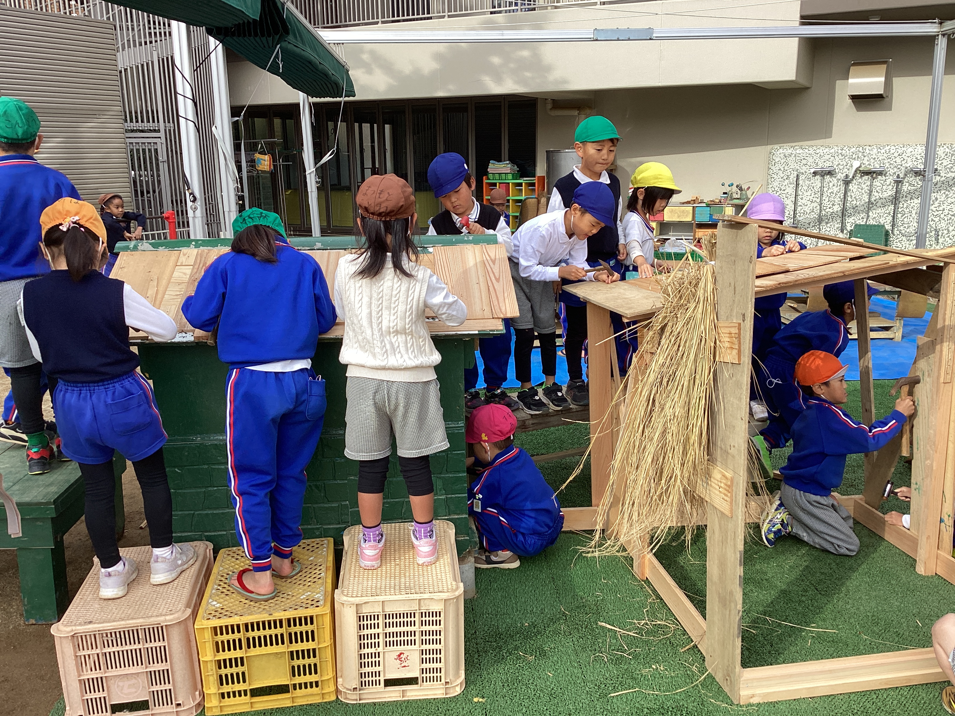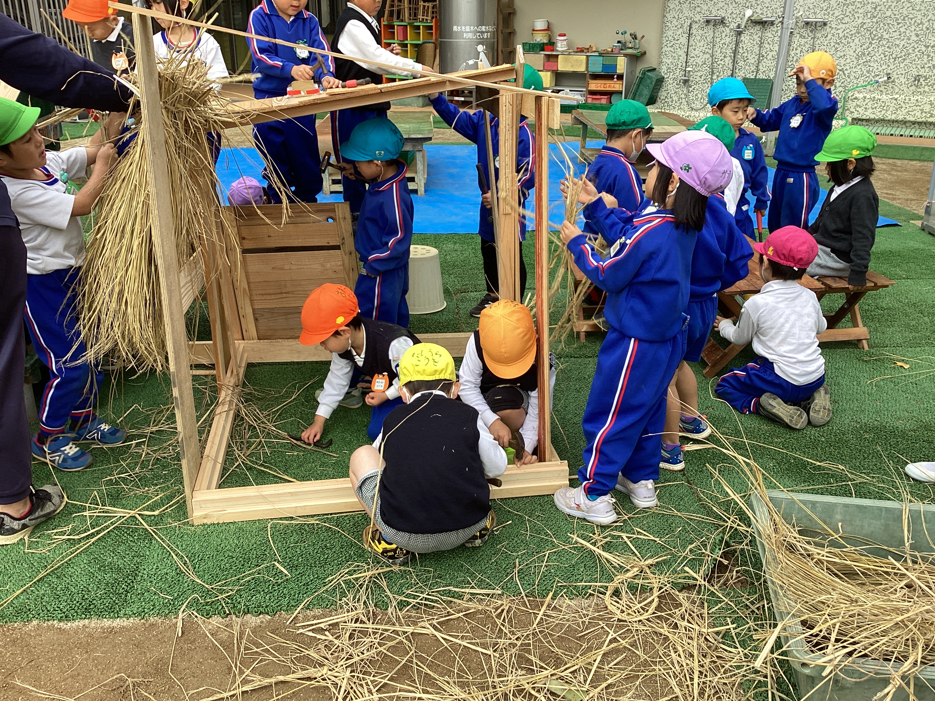 緑の大きなテントの下では、ちびっこ大工さん達が大勢で金づちを持って、「トンカチ」 「トンカチ」とリズムよく釘を打つ音が響かせていました。年長さん達が主でしたが、その中に年少児も入れてもらい、見よう見真似で大工仕事を覚えていました。その横で組み立てた柱の間に渡した竿に年中児が藁を束ねて、かけていました。これは稲木ではなく、みんなのお家の屋根になります。こうして役割分担をしながら1つ1つ完成に向かって行っていることに気付くと共に、年少さん達はこうやって年長・年中さん達の後ろ姿から学んでいるのだと思いました。この木工だけでなく、包丁ままごとでもそうで、年長・年中さん達が作っているお料理を横で見ていて真似をして学んでいっていることに気付きます。