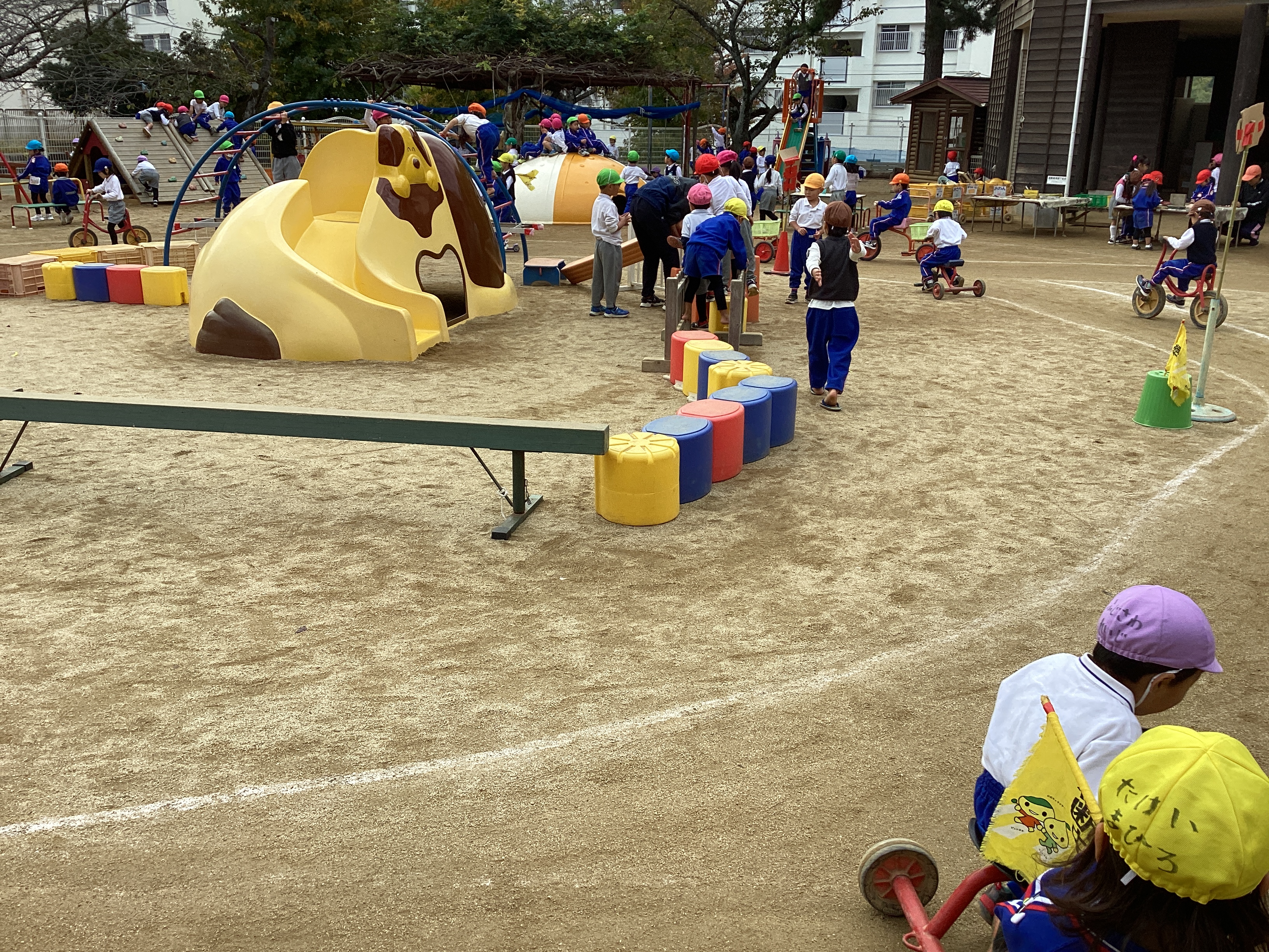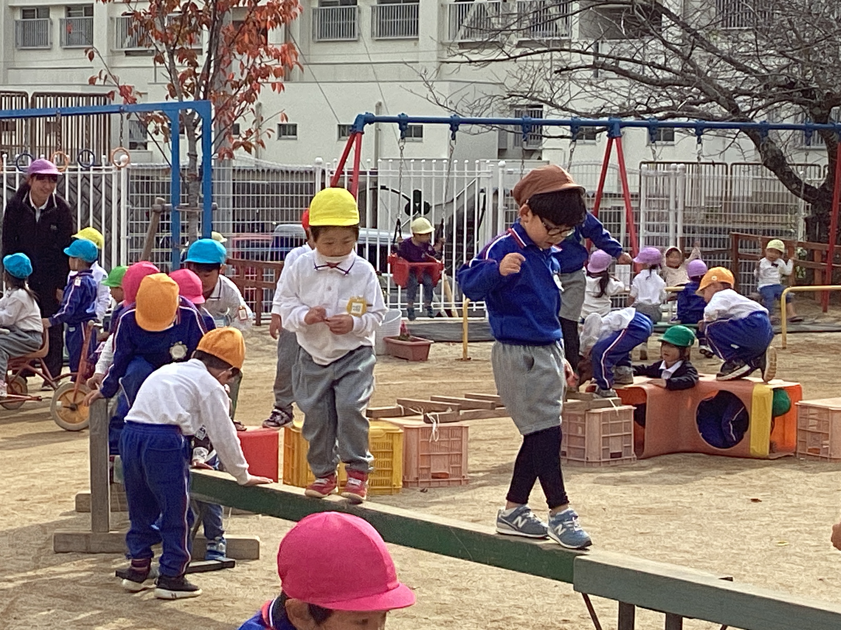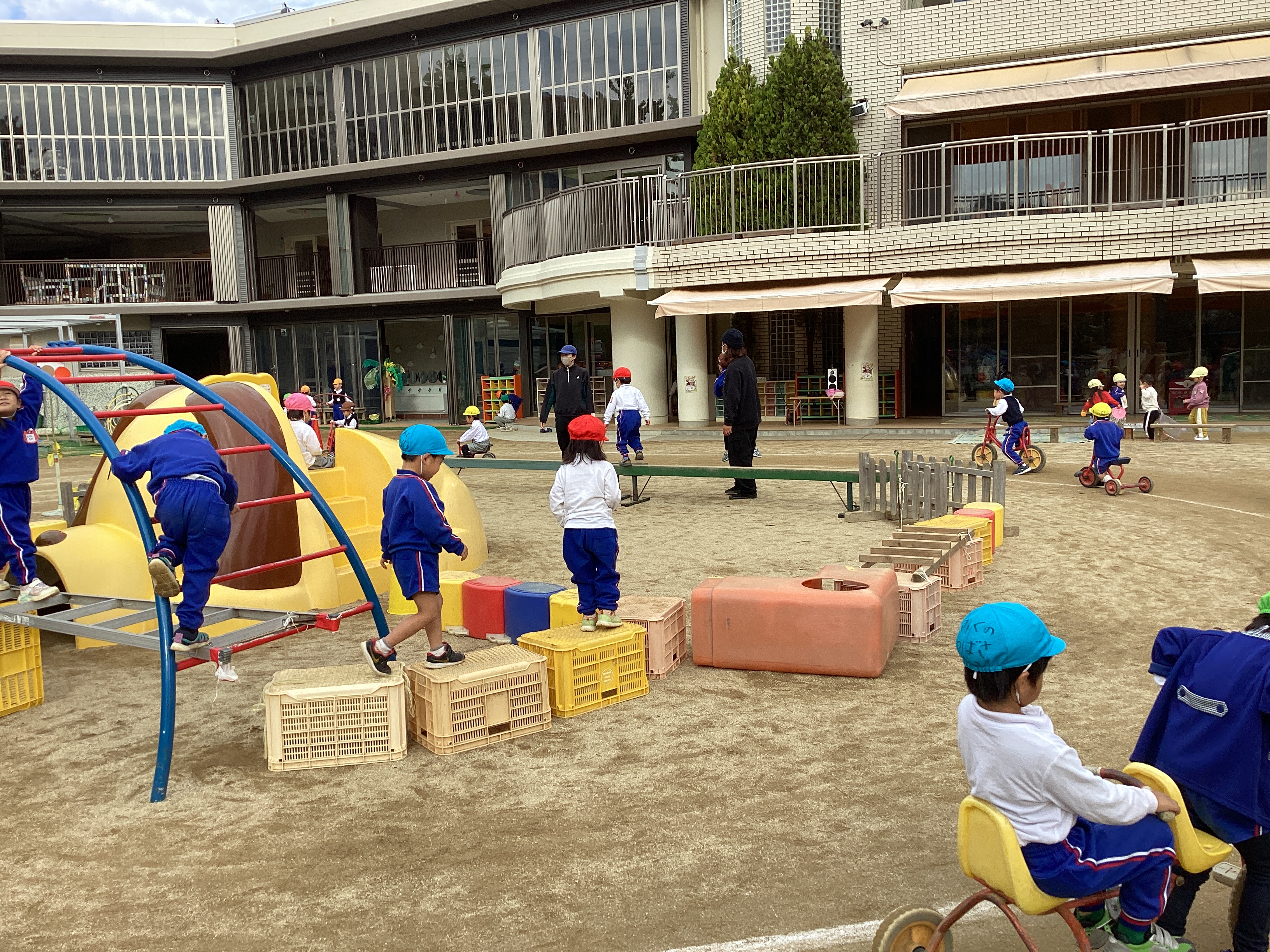 今日はちょっぴり肌寒い日となりましたが、外では、いつも通りの元気な子どもの声が響いていました。運動会を通して、体を存分に動かして遊ぶ楽しさを味わった子ども達にと園庭の中央にできたアスレチック、子ども達の様子に合わせてたいこ橋の下にはしごがついたり、途中に犬の滑り台が入ったり、柵を組み合わせて渡りながら移動できるようにしたり、・・・と考えられ、環境が少しずつ変化してきました。今日も平均台が2つ連なり、長くなっていました。子ども達は環境の変化に敏感で、アスレチックが変化していることにすぐに気付いて、楽しむ姿が見られました。そして経験して慣れてくると平均台をまっすぐに歩いていく子いれば、初心者は蟹さん歩きで渡っていきます。