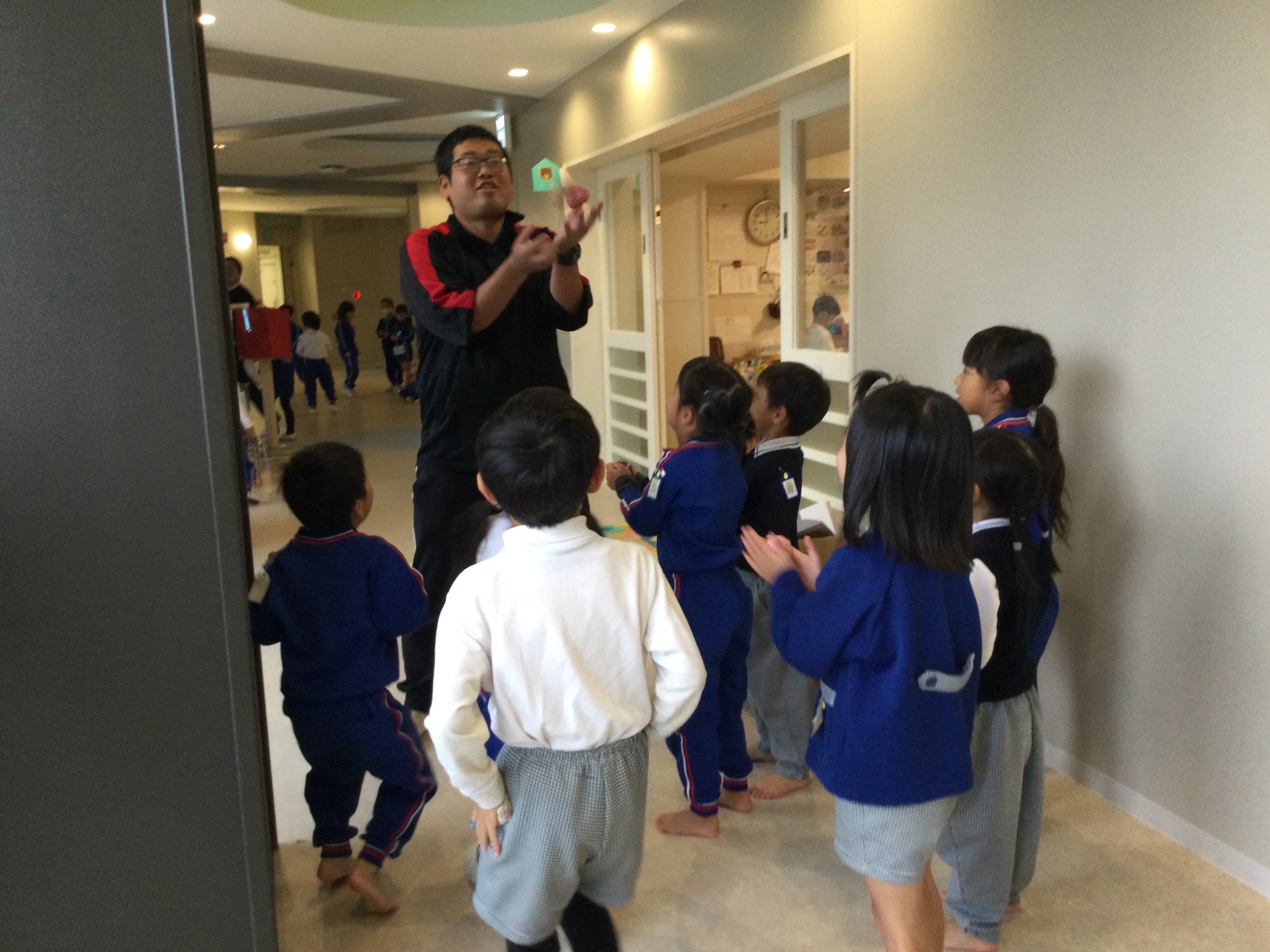 今日は朝から雨が降っていたので大好きな外遊びが出来ず、子ども達は室内で遊んでいました。年長のフロアでは、子ども達が教師がさり気なく出していたお手玉を見つけて遊んでいました。そこへ、園内を回ってくれていた古森先生がお手玉で遊んでいる子ども達に声を掛けてくれました。「古森先生もできる?」という子どもからの誘いに乗って下さり、「できるよ!それ!」と、とっても上手なお手玉を見せてくれました。それを見た子ども達から「オー!」という歓声が上がりました。とっても上手なお手玉を目の前で見た子ども達は、「私もやりたい!」「僕もできる!」と古森先生の真似をして練習を始めました。「高く投げすぎたら、難しいよ」「低く投げるんだよ」と時々アドバイスを古森先生がくれ、「できた!」「こう?」と、子ども達の中でも少しづつ出来る子が出てきました。すると、次は、片手で2個を回す技を見せてくれました。また子ども達から、「すごい!」「やってみたい!」の声があがりました。お手玉が上手な古森先生を見て利激を受けた、たくさんの子ども達がお手玉にチャレンジしていました。