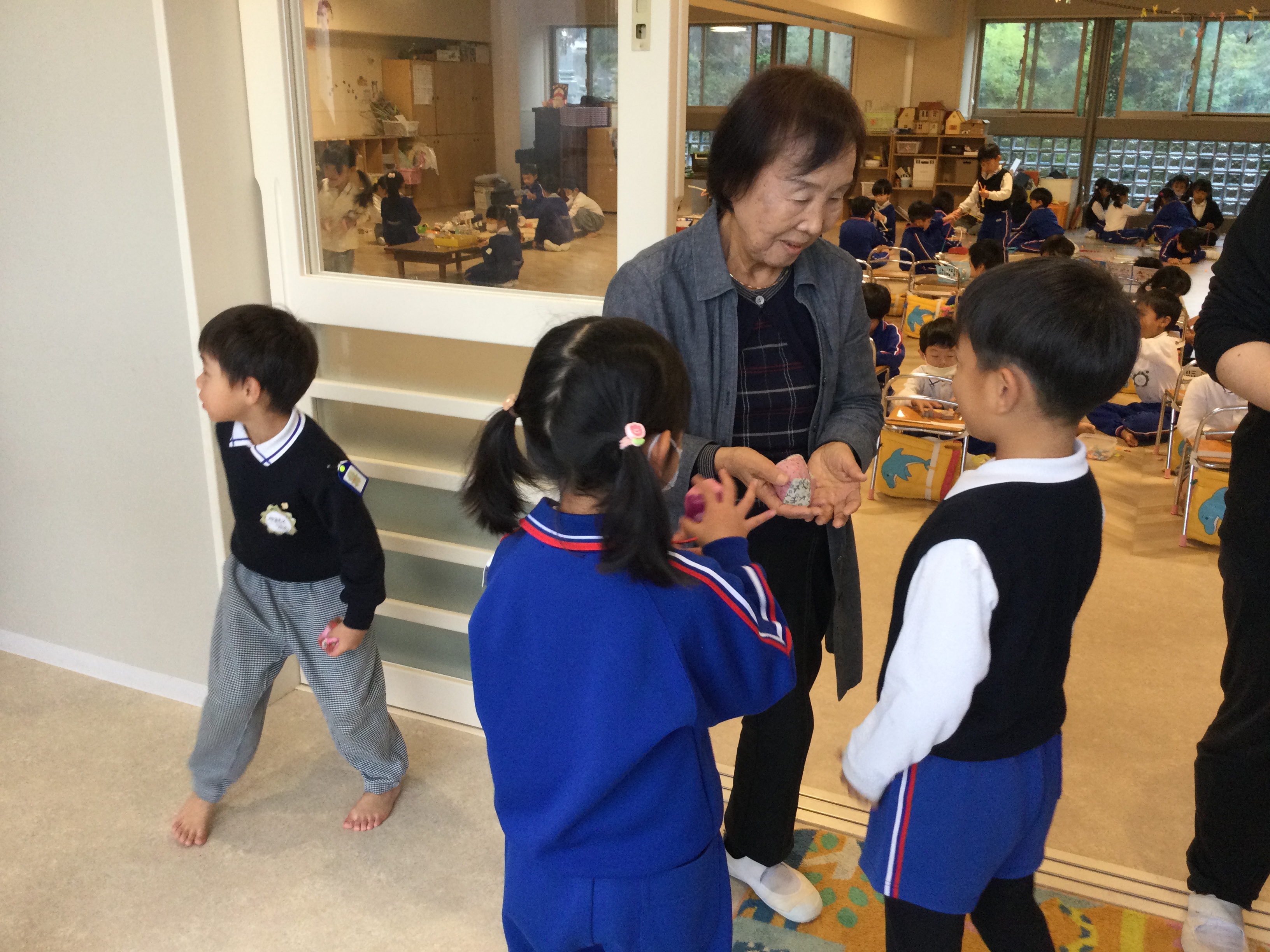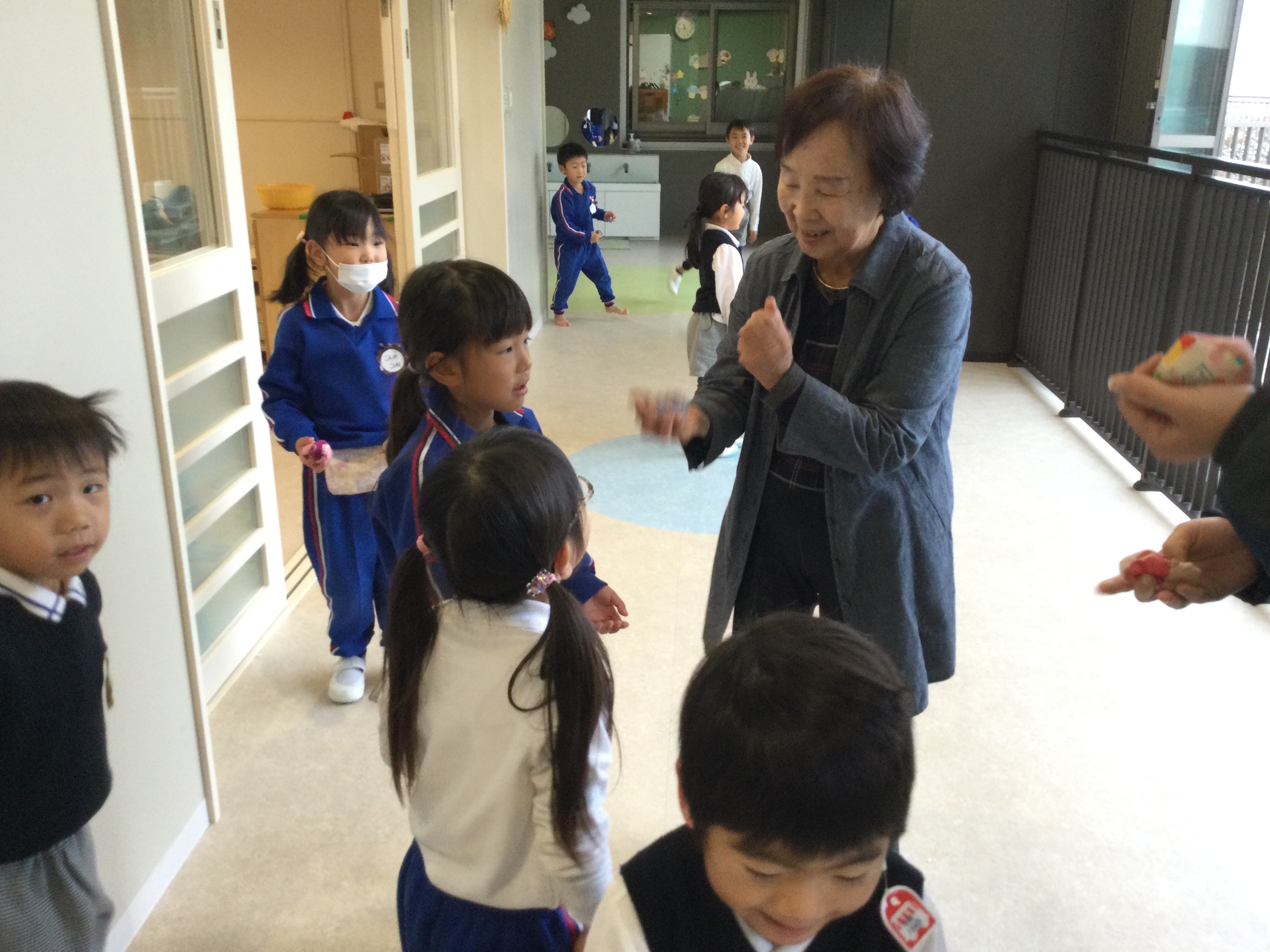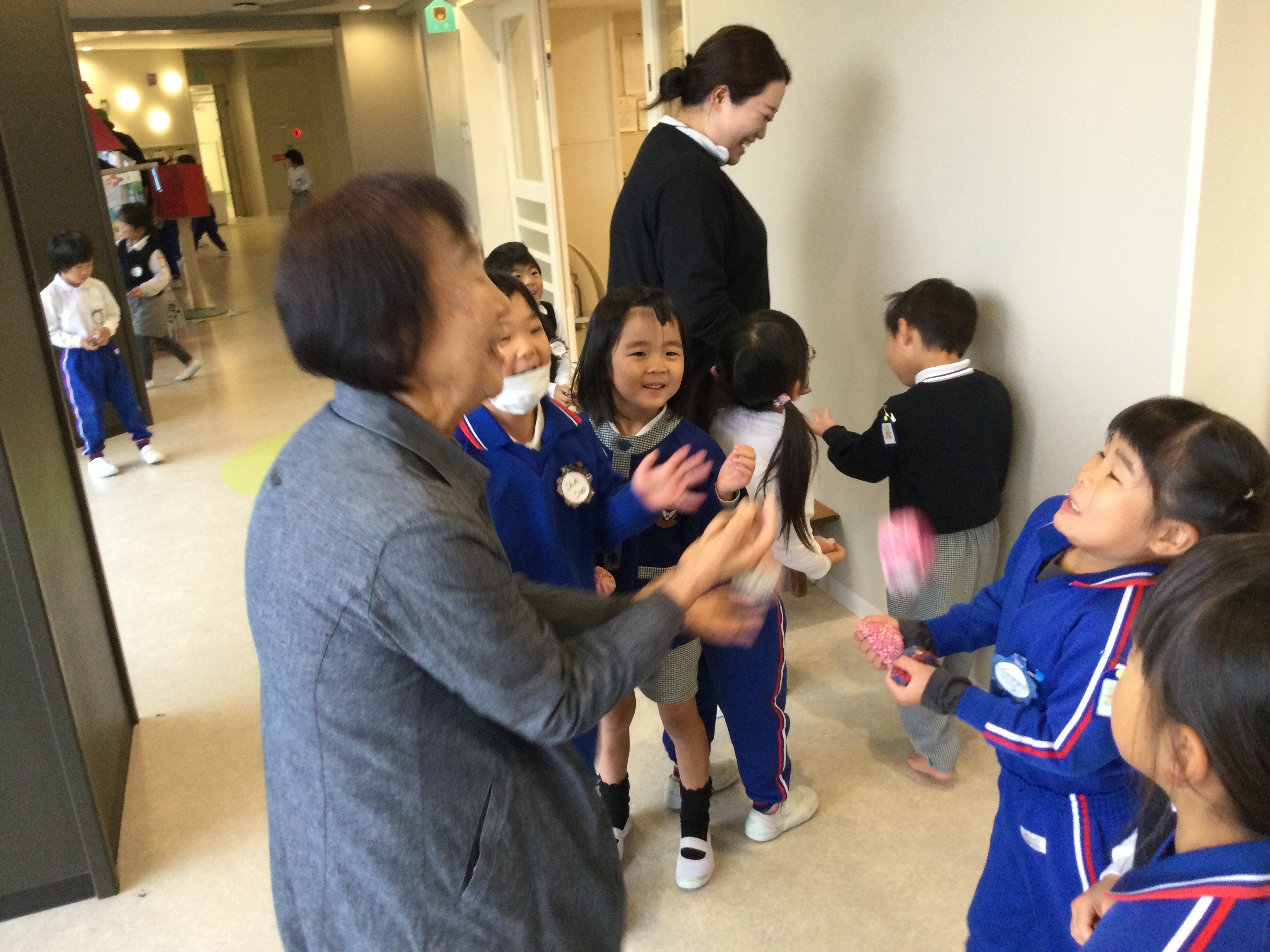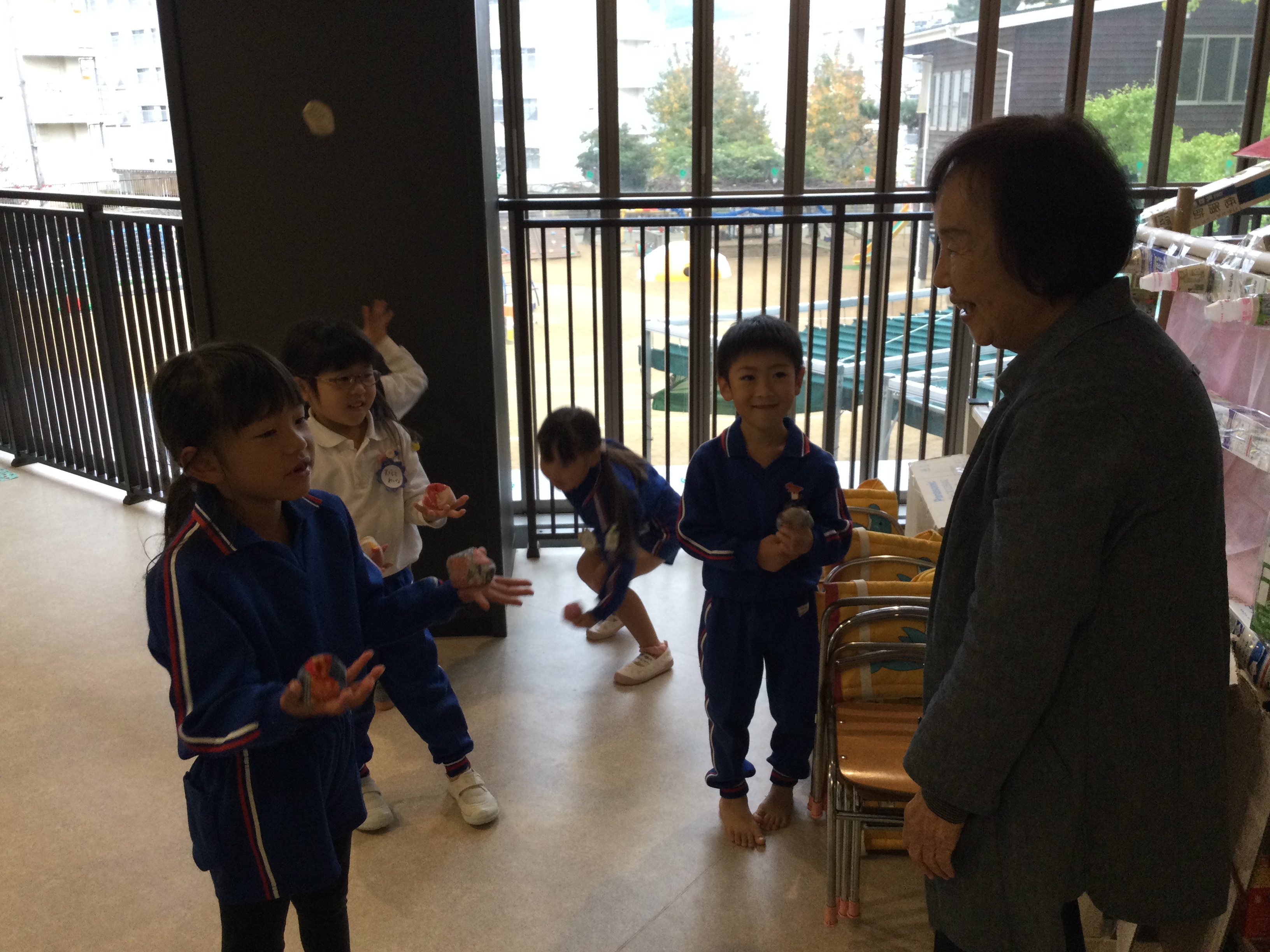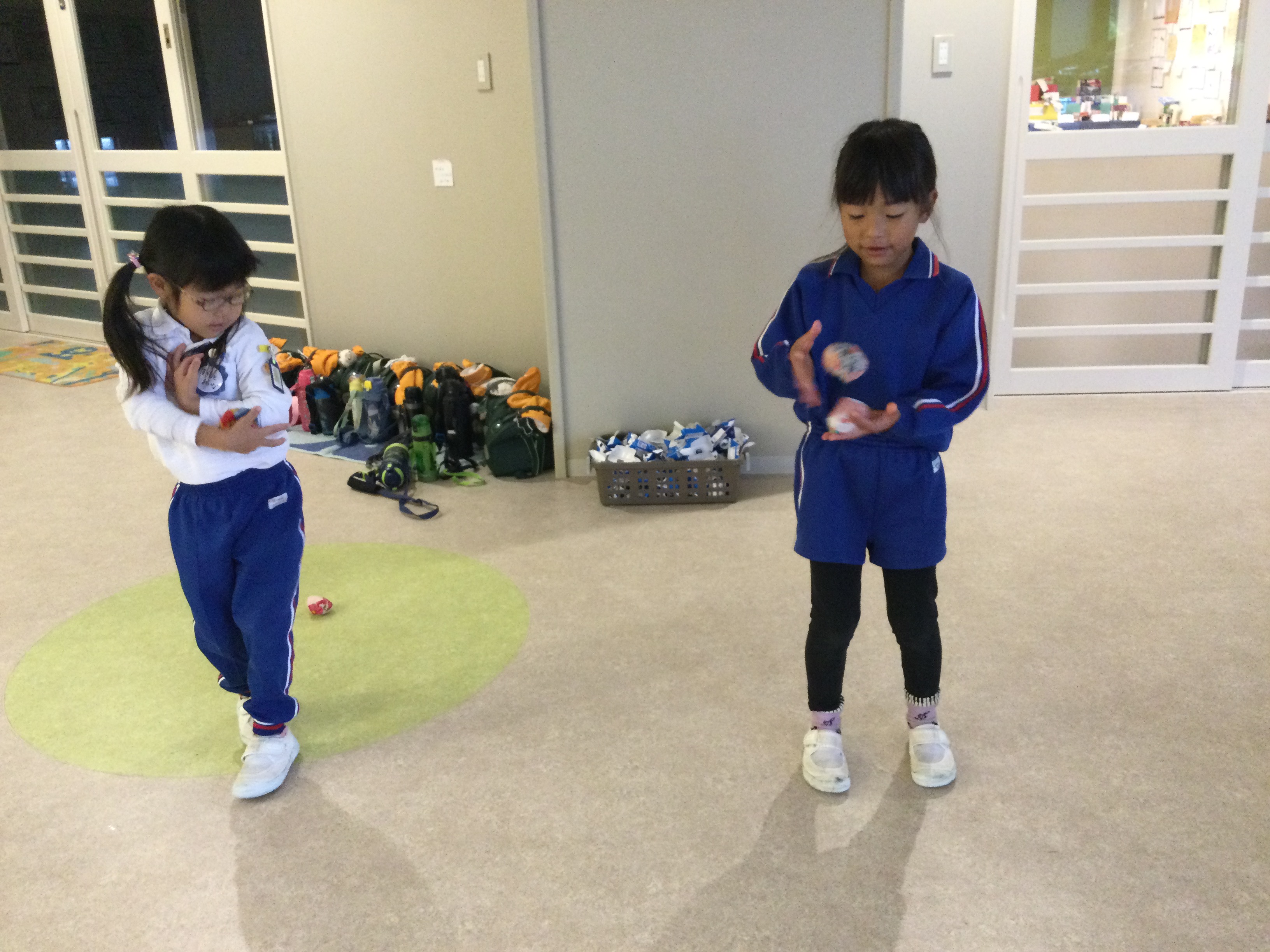 そんなとっても楽しそうな声に寄せられるように、先生達も集まってきました。先生が来るたびに「先生、お手できる?」「古森先生3つも回せるんよ!」と、目をまん丸にして話していました。また、お手玉が苦手な先生を見て「私の方が上手!」と年長児が得意気に投げていました。
