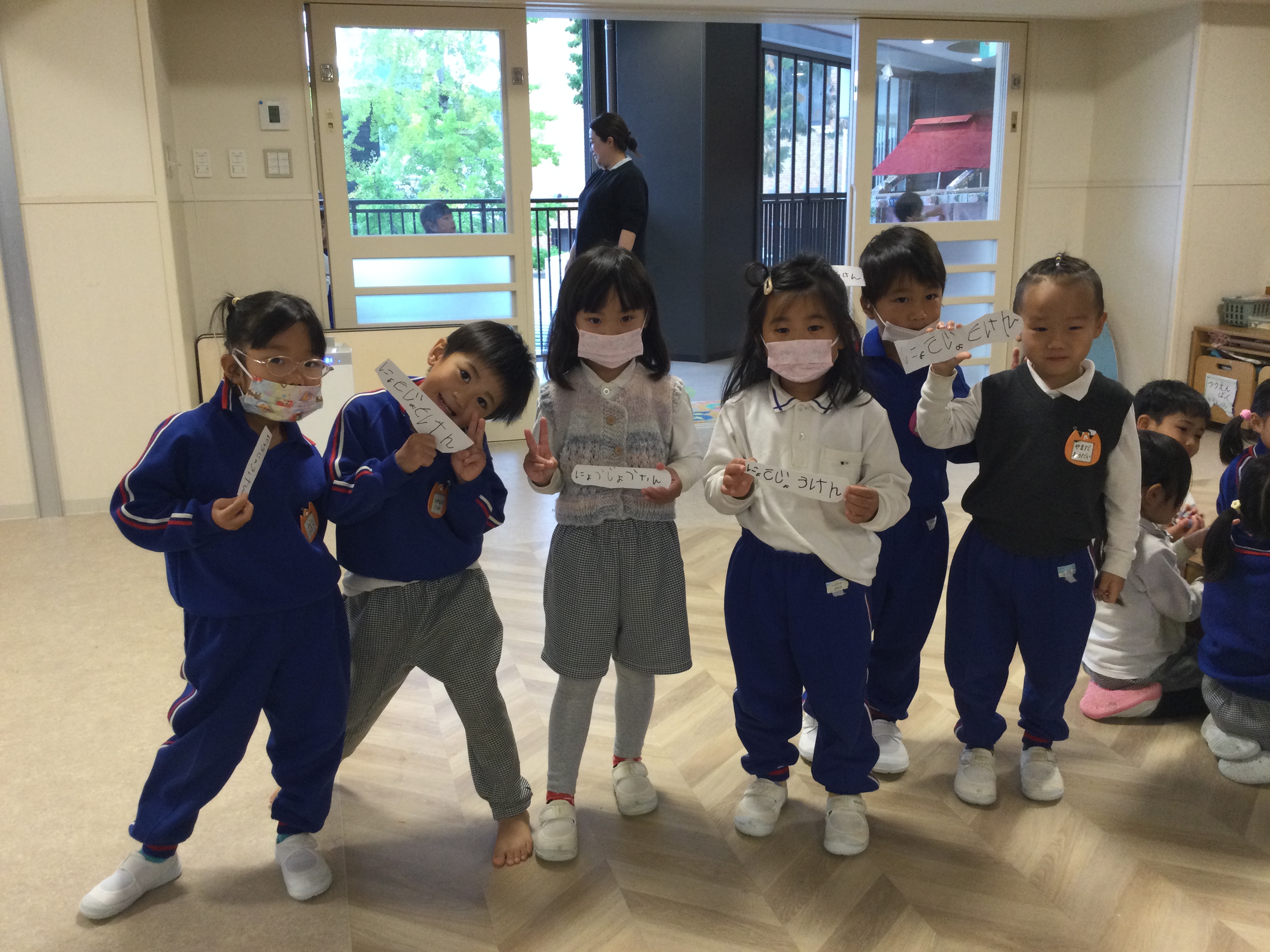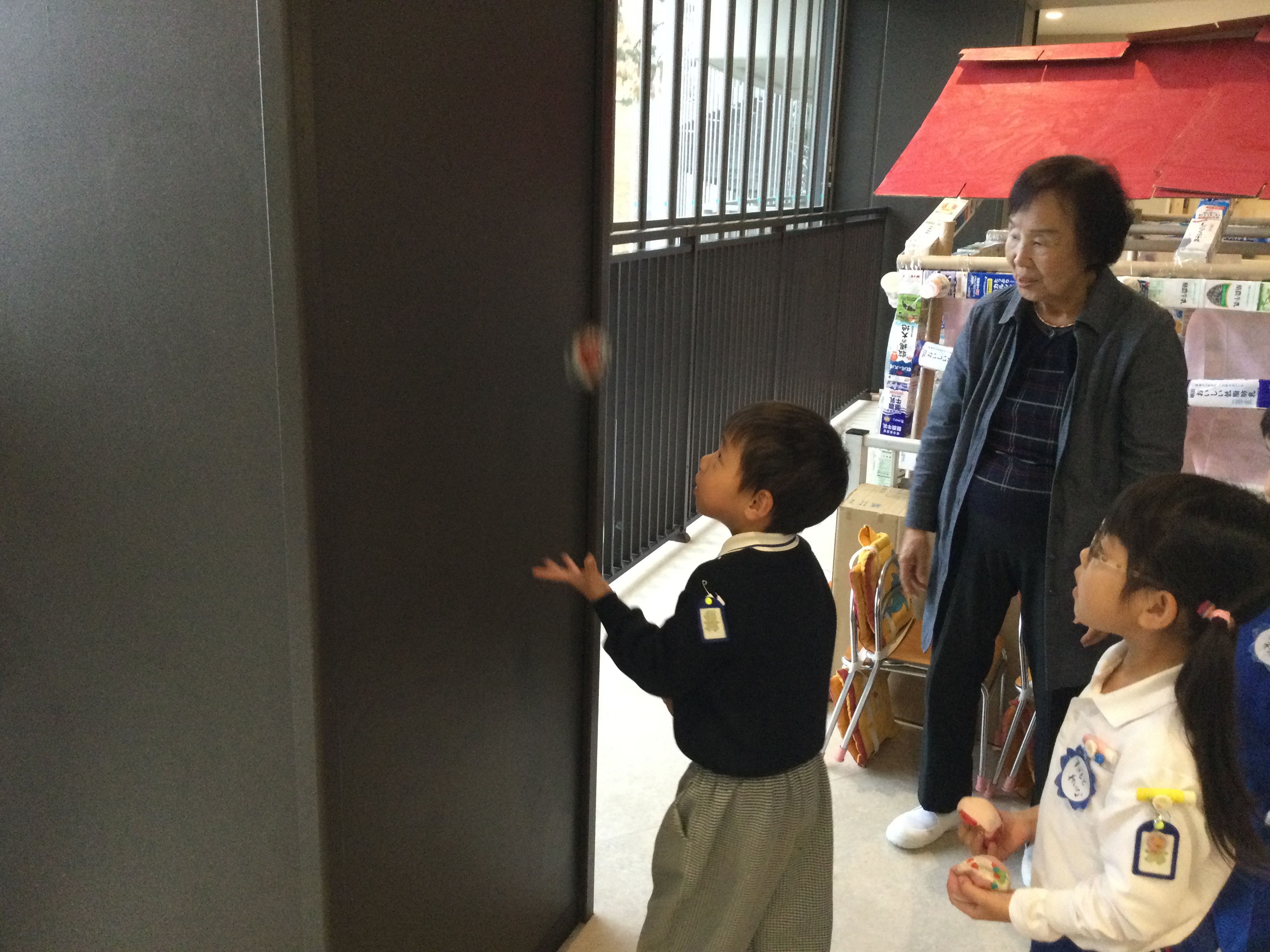 くま組のSちゃんは「私できるよ!」と軽やかに何度も何度もお手玉を回していました。苦手な先生を見つけると、「え!?できんの?」「こうやってするんよ!見よって!」と、得意気に見せた後、「私の真似して!そしたら出来るけん!」と教えていました。気付くと年長のフロアでは、お手玉講習会が開かれていて、いろんなところで教え合ったり、披露したりしてとっても盛り上がっていました。「今日は雨だから、いっぱい練習できるね」と、とっても嬉しそうな子ども達でした。