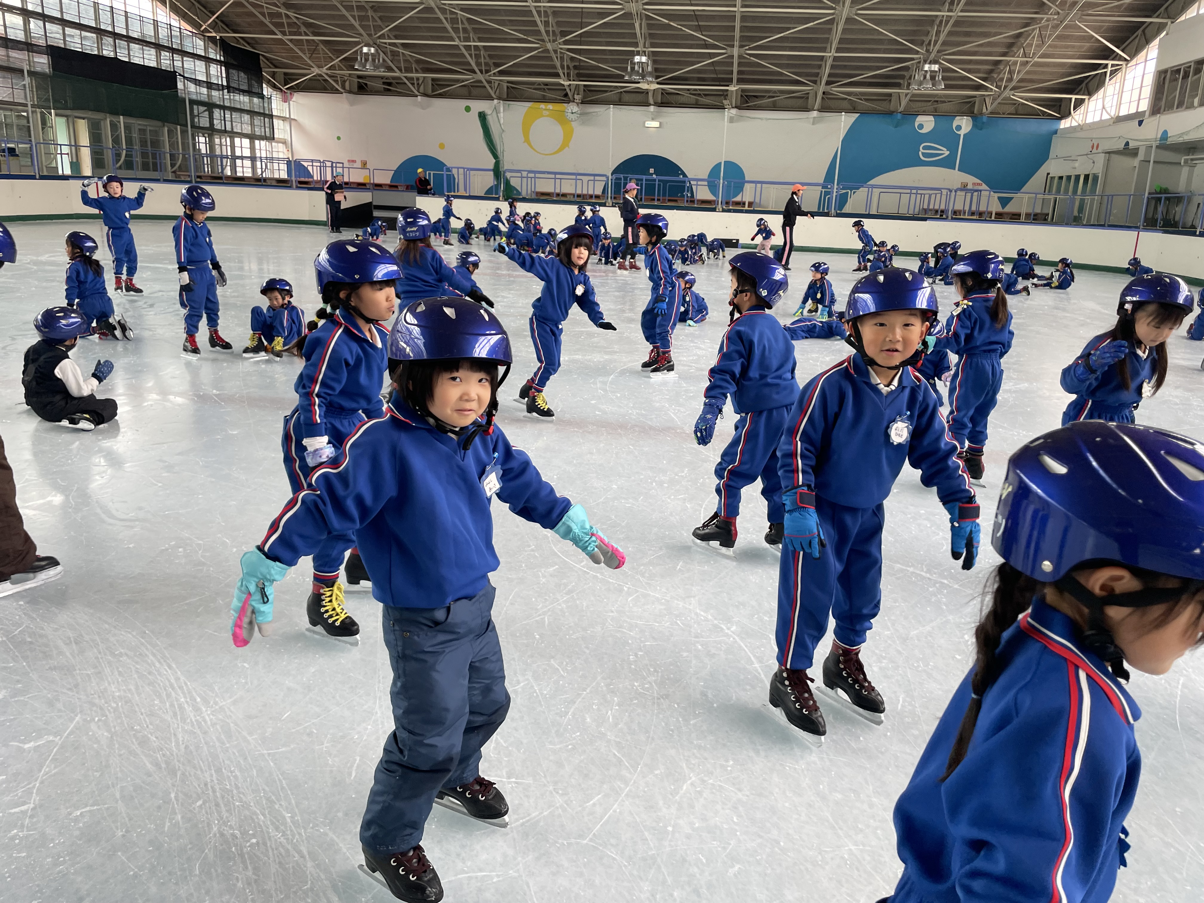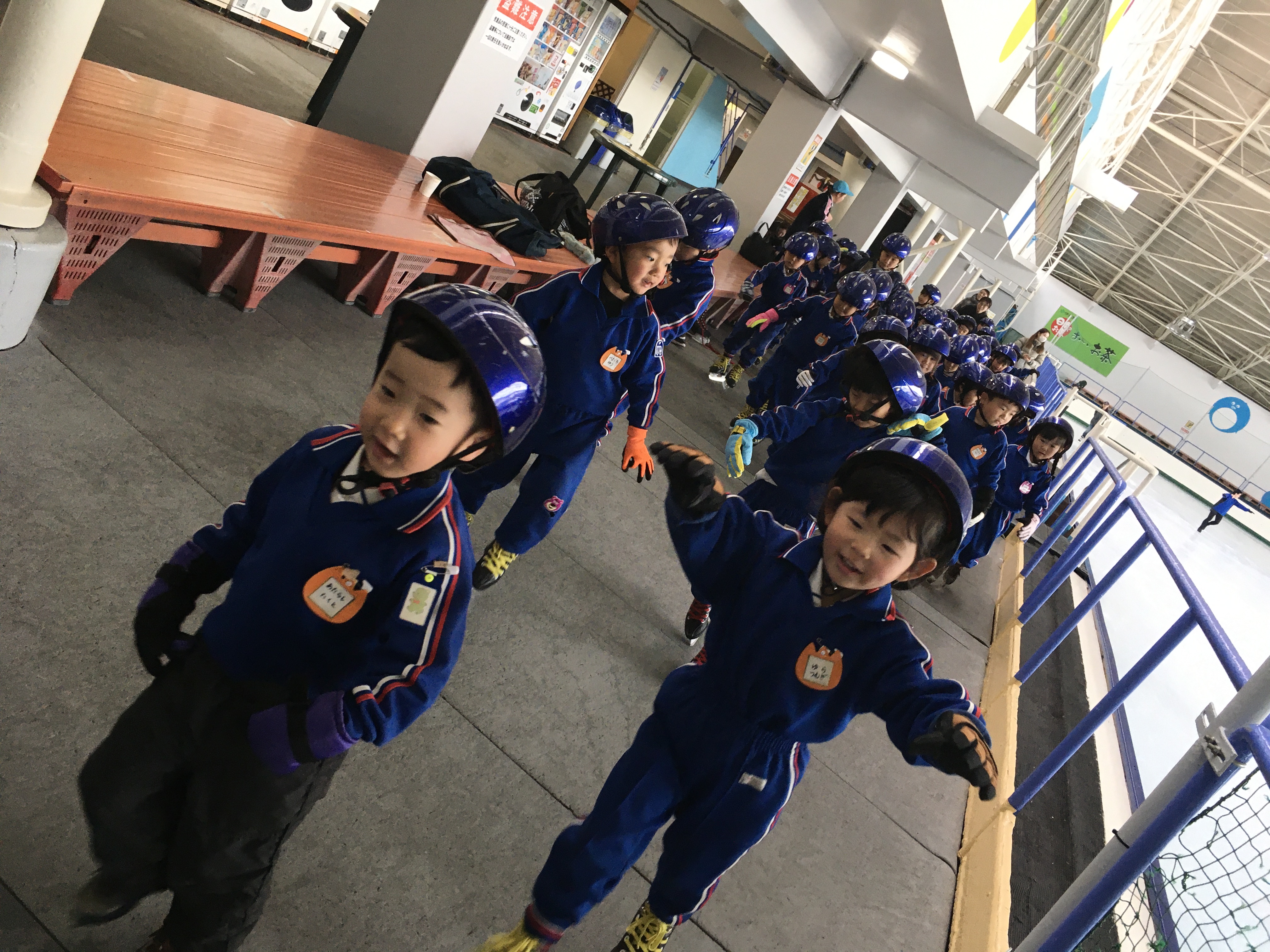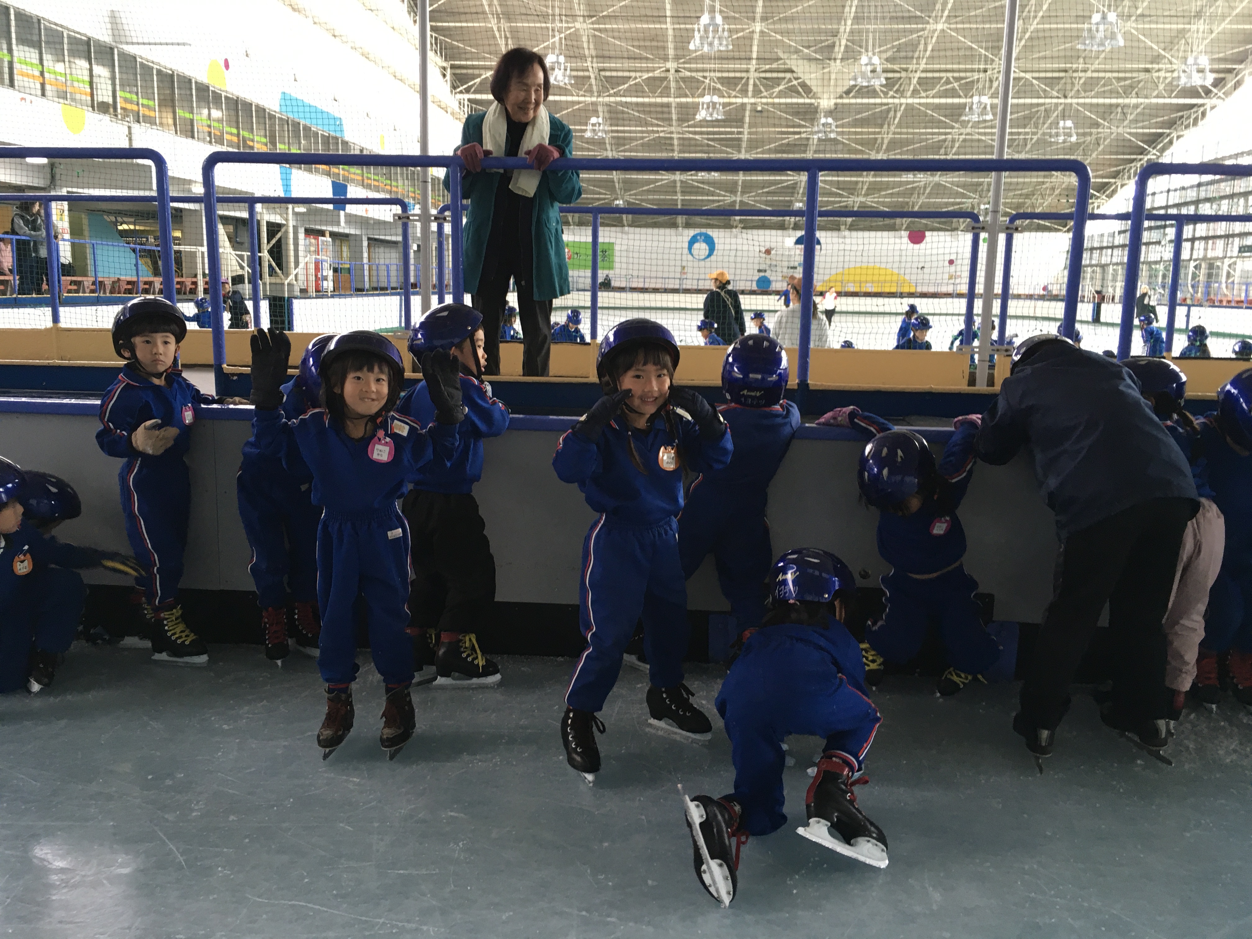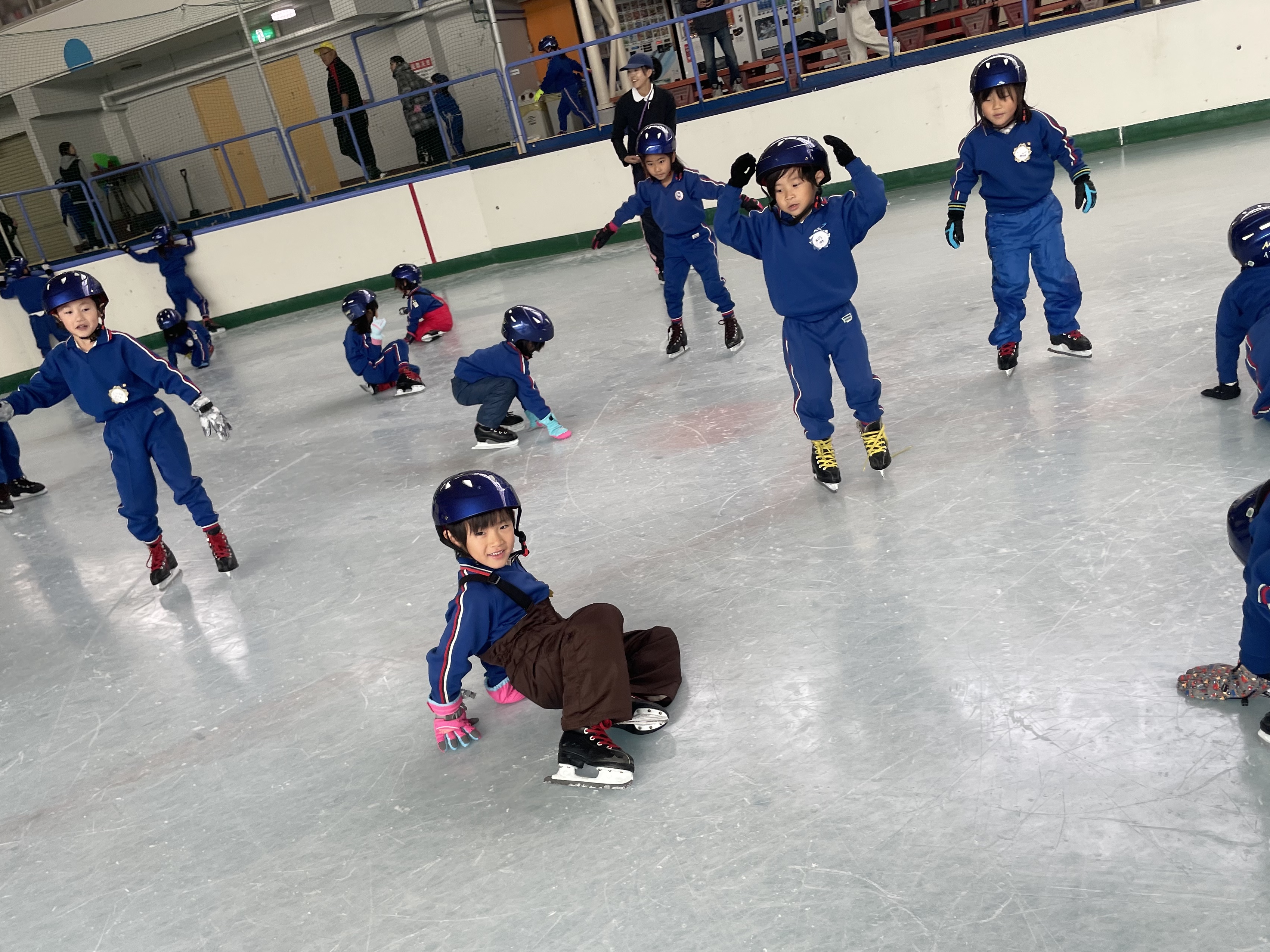 スケート場の指導員さんの指導のもと、まずはその場で足ぶみをしていよいよスケートリンクへまずはハイハイして真ん中に集まりました。ハイハイで進む子ども達はとても可愛らしく壁につかまって立ち上がる時も必死でしたが手拍子に合わせて足ぶみができるようになるととても嬉しそうでした。その後、転んでからの立ち上がり方やスケート靴の刃でリンクを削らないことや友達に刃を絶対にむけない事を約束してメインのスケートリンクで実践しました。転んでも何度も何度も立ち上がってチャレンジする三葉っ子!!ほとんどの子ども達が自分で立つことが出来ました。立つことが出来るたびに「先生見てー!!立てたー!!」とあちこちから元気な声が飛び交って、素敵な写真を沢山撮る事が出来ました。家に帰ってきっと滑ったり立ったり出来た事を話していることと思います。明日は赤コースの年長、年中がアイススケートに行きます。防水の手袋等もう一度準備物の確認をお願いします。