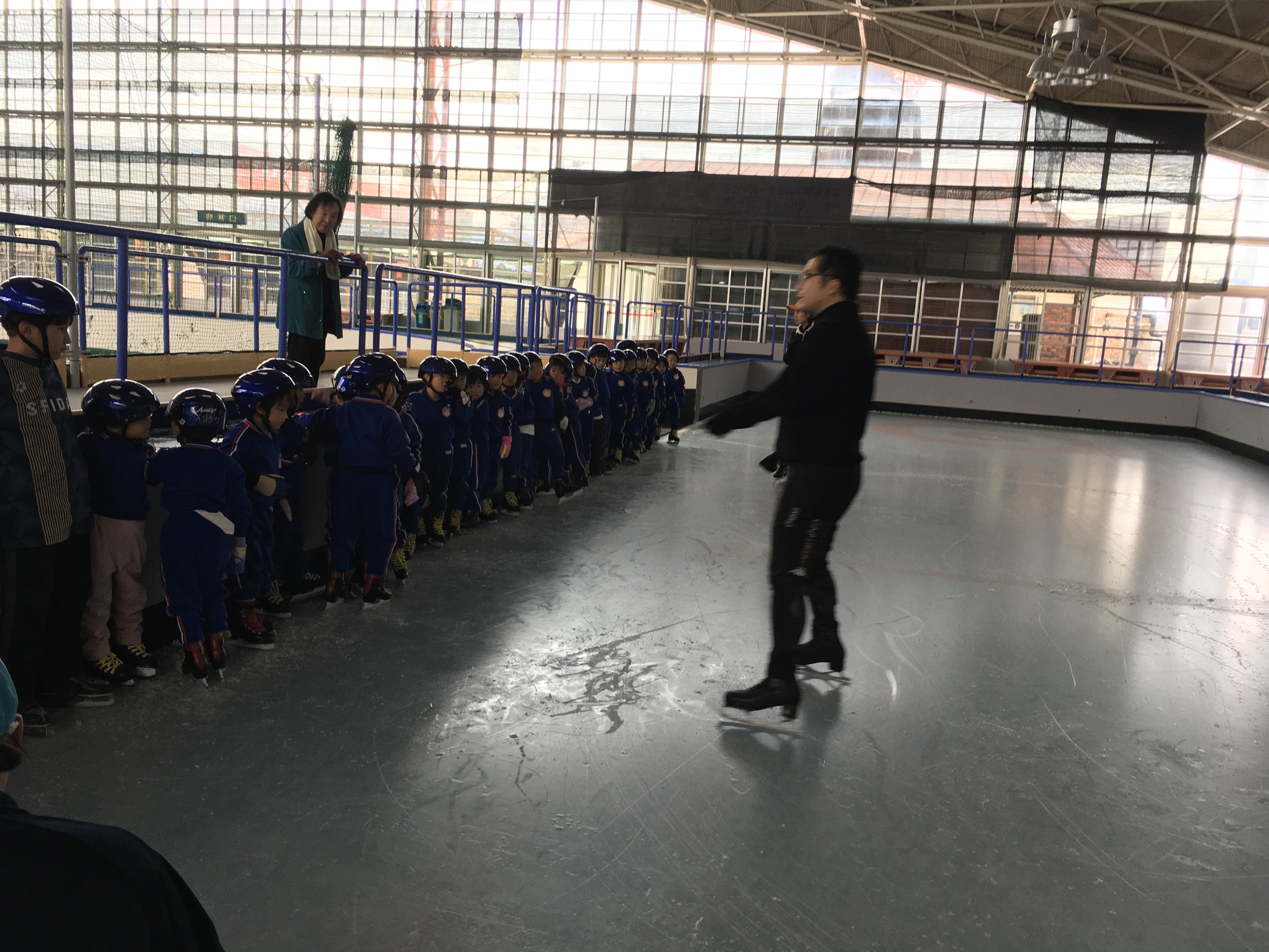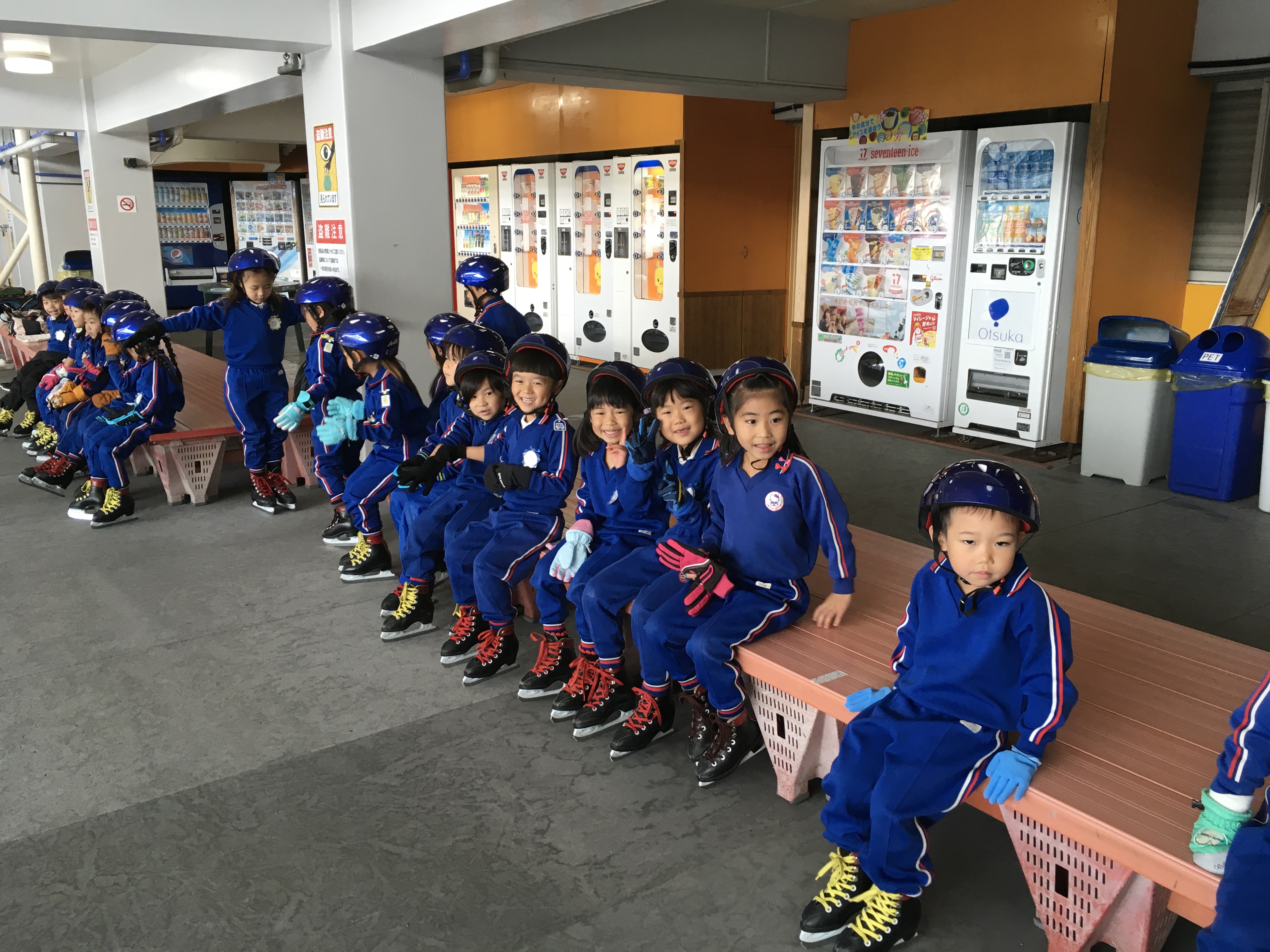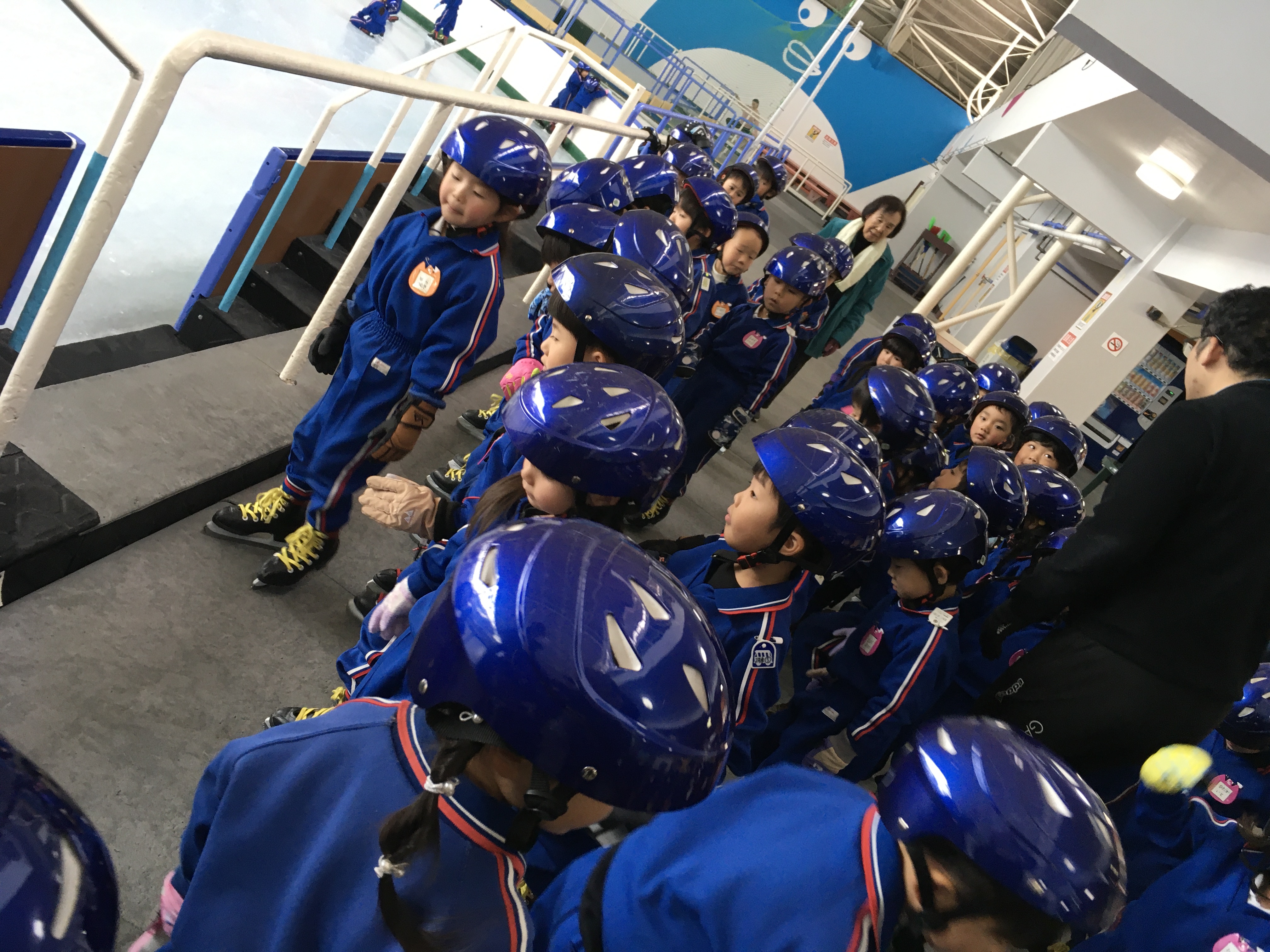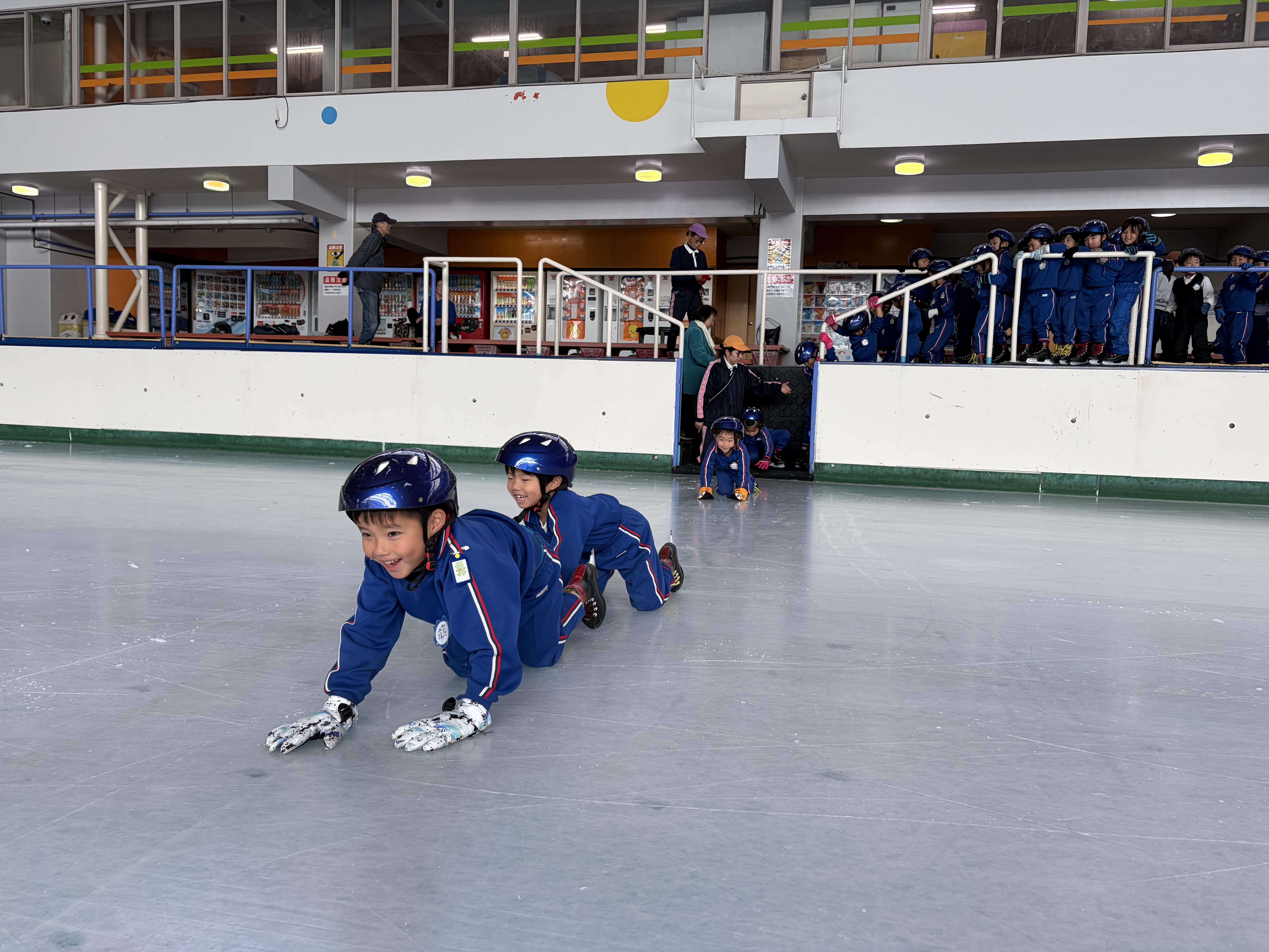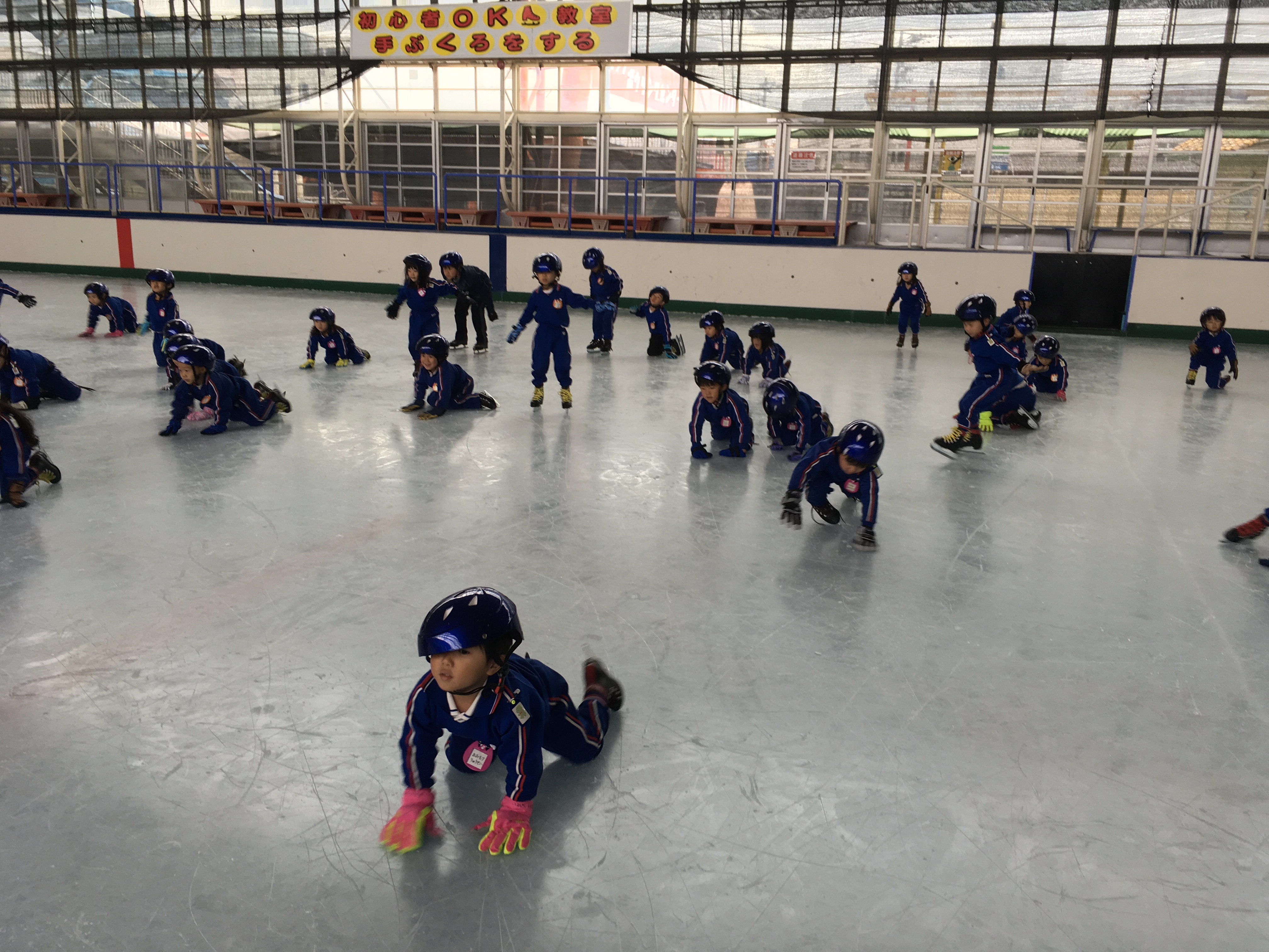 スケート場の指導員さんの指導のもと、まずはその場で足ぶみをしていよいよスケートリンクへまずはハイハイして真ん中に集まりました。ハイハイで進む子ども達はとても可愛らしく壁につかまって立ち上がる時も必死でしたが手拍子に合わせて足ぶみができるようになるととても嬉しそうでした。その後、転んでからの立ち上がり方やスケート靴の刃でリンクを削らないことや友達に刃を絶対にむけない事を約束してメインのスケートリンクで実践しました。転んでも何度も何度も立ち上がってチャレンジする三葉っ子!!ほとんどの子ども達が自分で立つことが出来ました。立つことが出来るたびに「先生見てー!!立てたー!!」とあちこちから元気な声が飛び交って、素敵な写真を沢山撮る事が出来ました。家に帰ってきっと滑ったり立ったり出来た事を話していることと思います。明日は赤コースの年長、年中がアイススケートに行きます。防水の手袋等もう一度準備物の確認をお願いします。