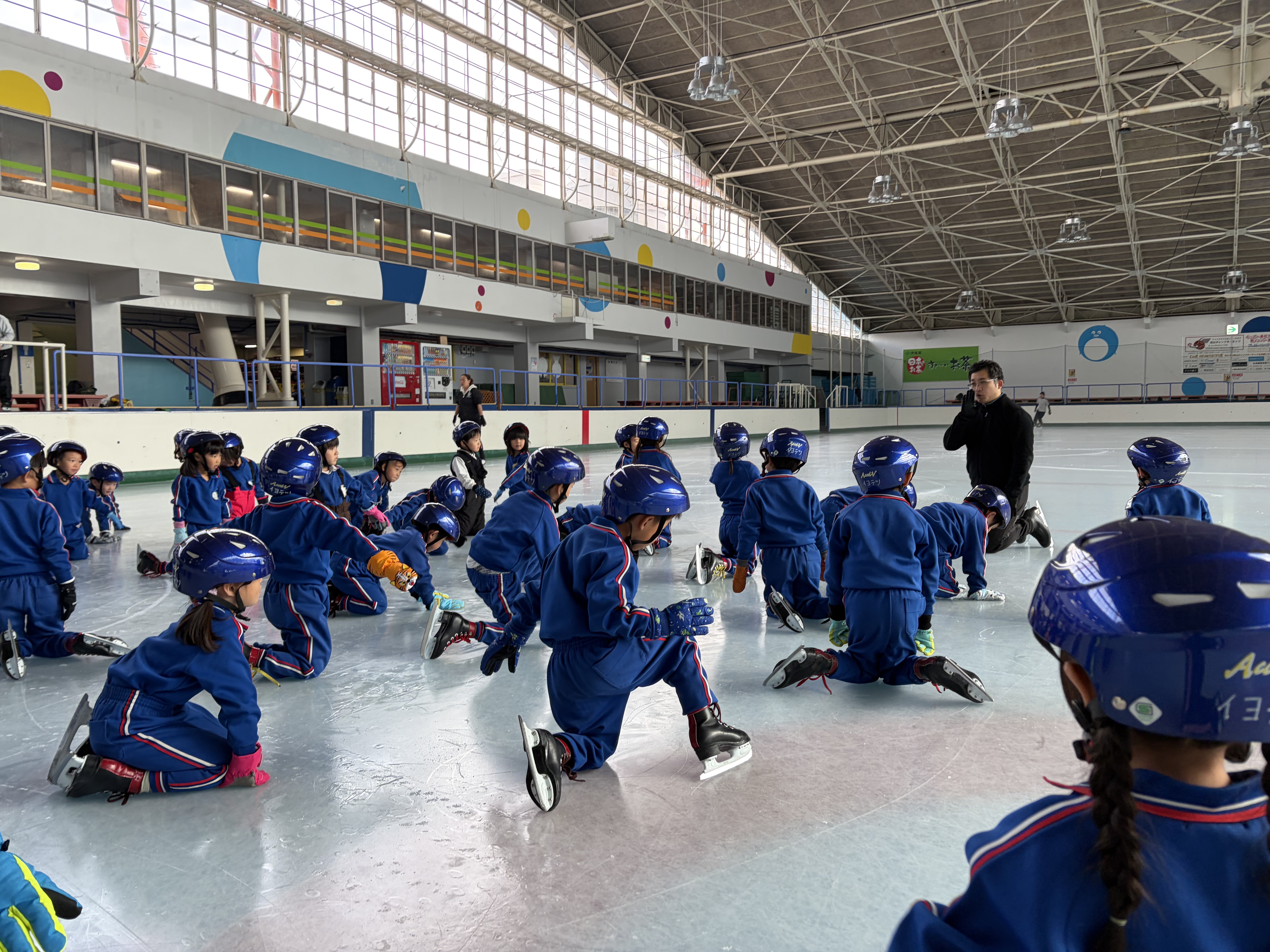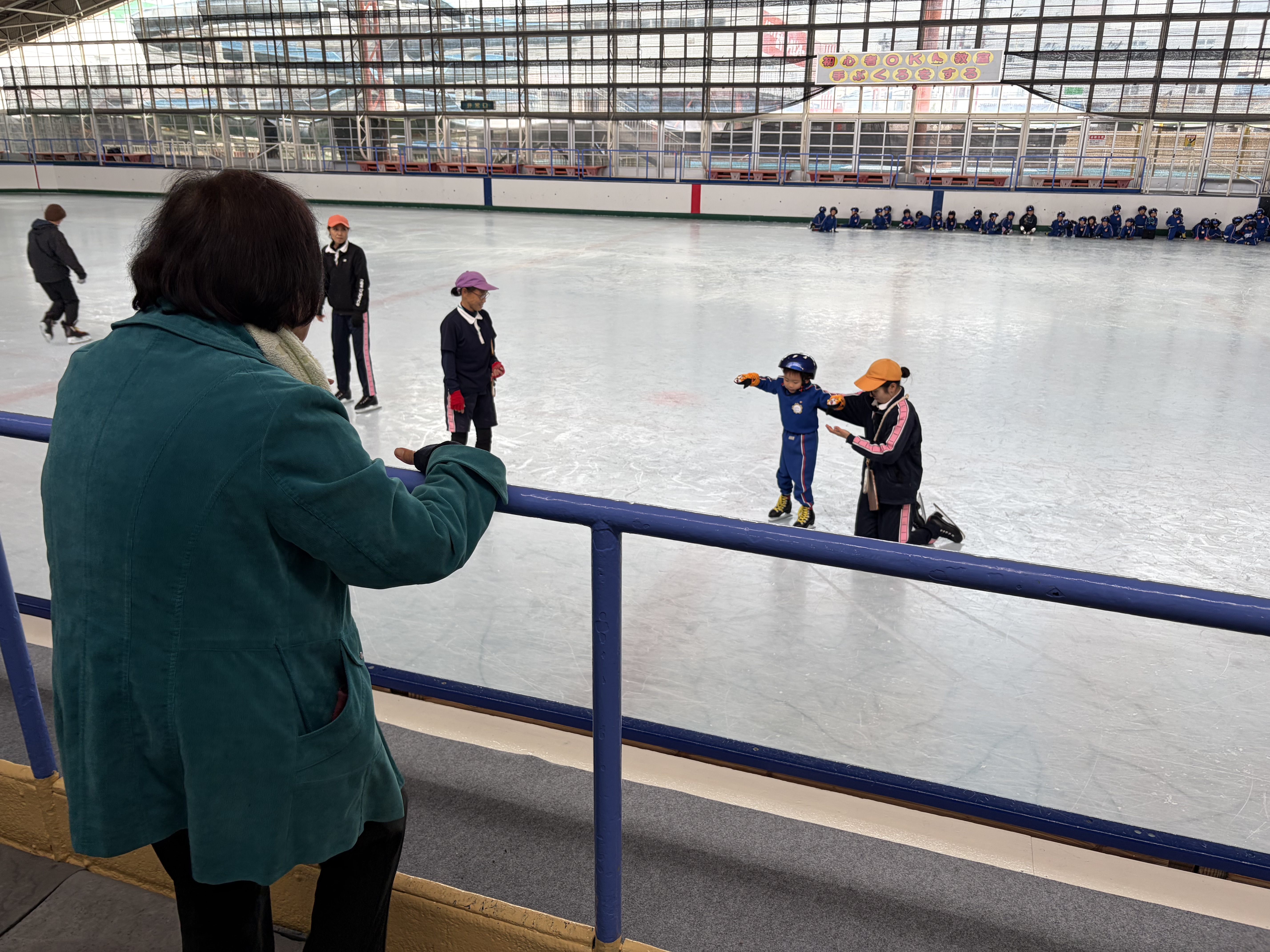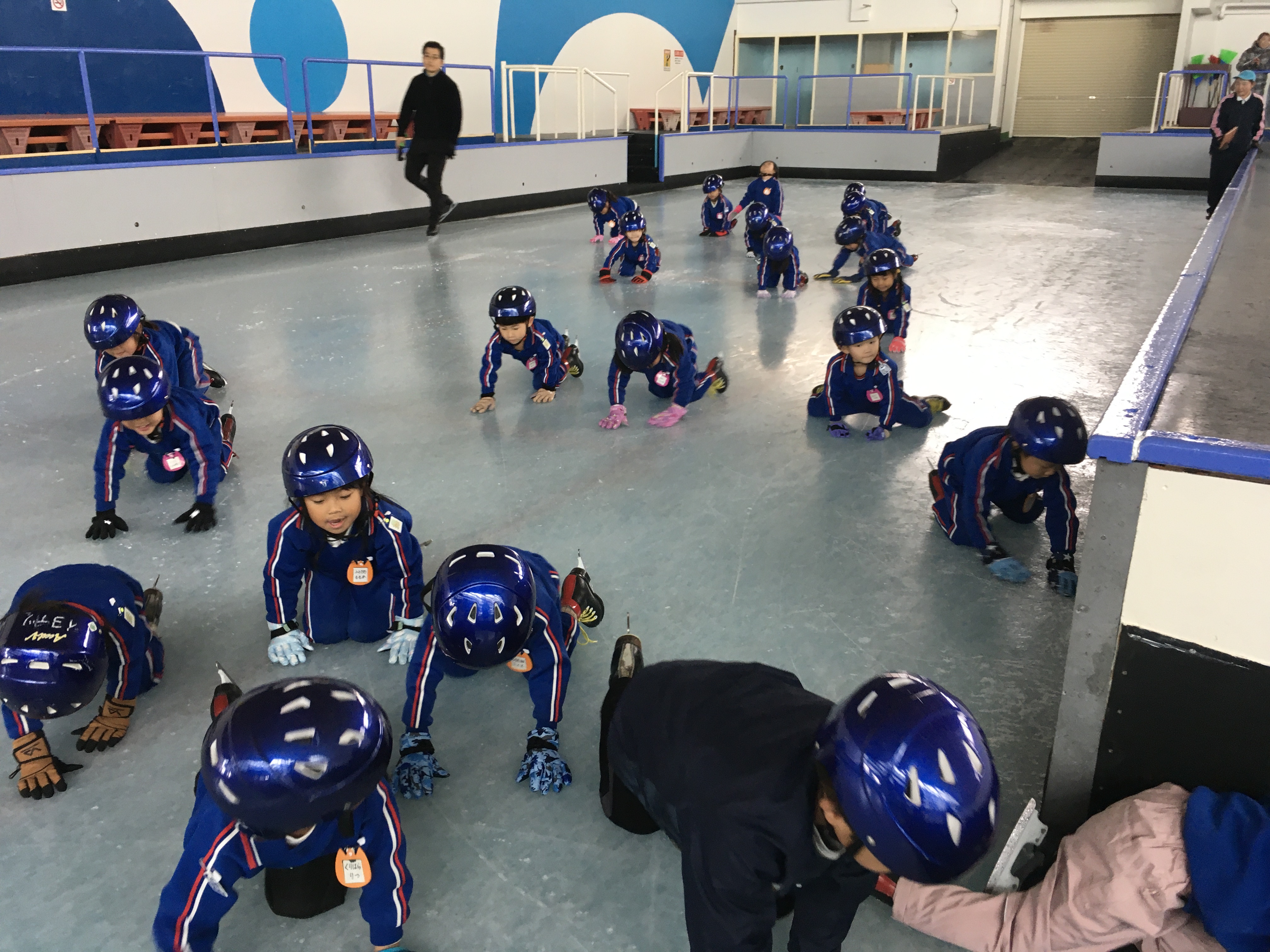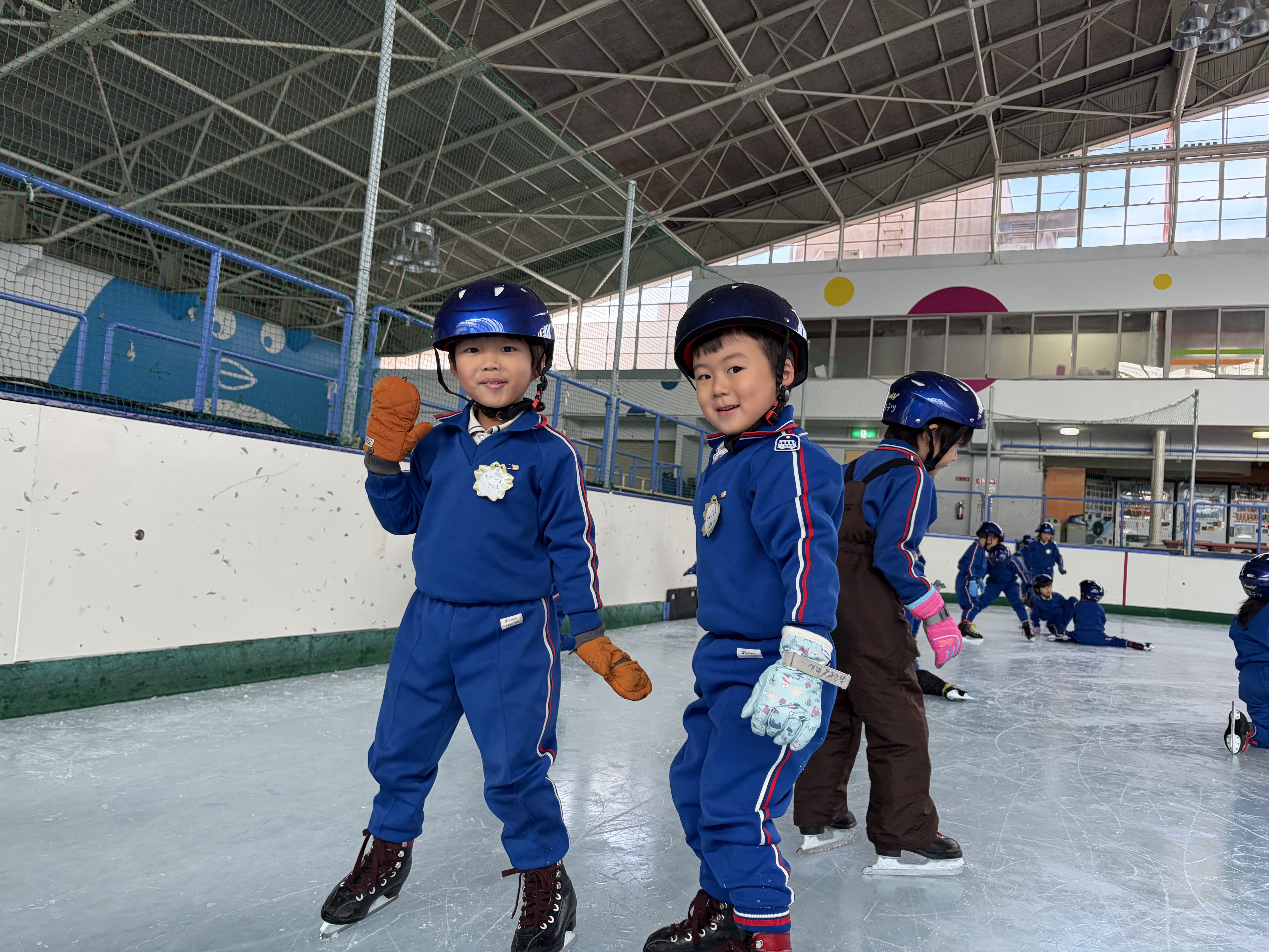 スケート場の指導員さんの指導のもと、まずはその場で足ぶみをしていよいよスケートリンクへまずはハイハイして真ん中に集まりました。ハイハイで進む子ども達はとても可愛らしく壁につかまって立ち上がる時も必死でしたが手拍子に合わせて足ぶみができるようになるととても嬉しそうでした。その後、転んでからの立ち上がり方やスケート靴の刃でリンクを削らないことや友達に刃を絶対にむけない事を約束してメインのスケートリンクで実践しました。転んでも何度も何度も立ち上がってチャレンジする三葉っ子!!ほとんどの子ども達が自分で立つことが出来ました。立つことが出来るたびに「先生見てー!!立てたー!!」とあちこちから元気な声が飛び交って、素敵な写真を沢山撮る事が出来ました。家に帰ってきっと滑ったり立ったり出来た事を話していることと思います。明日は赤コースの年長、年中がアイススケートに行きます。防水の手袋等もう一度準備物の確認をお願いします。