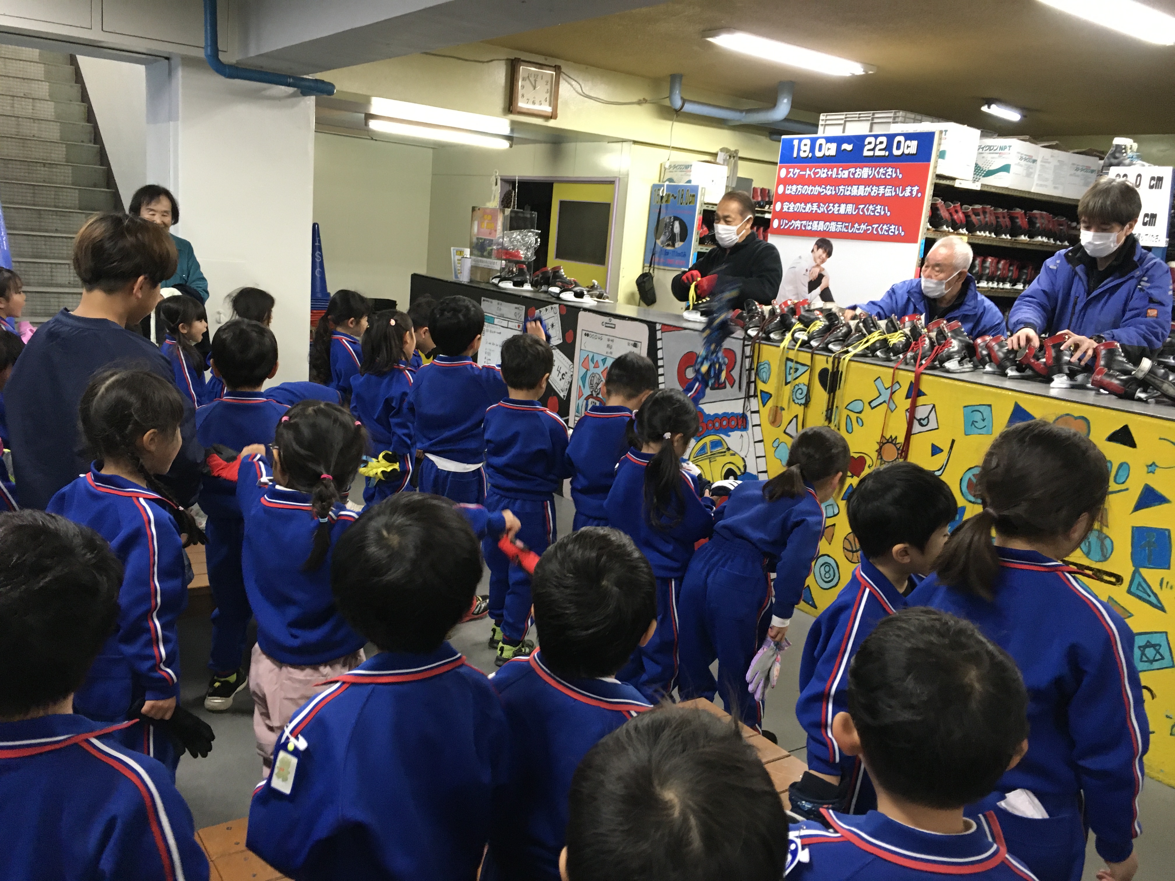 今日は青コースの年長と年中がイヨテツスポーツセンターへアイススケートに行きました。年中児は初めてなので不安になっている子や楽しみにしている子と様々でしたがひとまず落ち着いて荷物の確認や手袋の着脱の練習、スケート靴のサイズを覚えるなど、教師の話を聞きながら一人ひとりの意識がもてるように進めていきました。一番嬉しそうだったのは手袋をつける時です。今日のために新しく買ってもらった子やお兄ちゃんお姉ちゃんが使っていた物を借りてきた子等、手にはめると、「見て見て!!」と嬉しそうに友達と見せ合って早くスケートをしたくてたまらない様子でした。そんな中園長や教師の話をしっかり聞いて行動することを約束して園を出発しました。バスの道中、平和通りのイチョウ並木がとても色鮮やかに色付いていてバスに乗っていた男の子達が「めっちゃ綺麗!」「綺麗やなー」とどこまでも続くイチョウ並木に見とれていました。景色を楽しんでいるとあっという間にイヨテツスポーツセンターに到着しました。