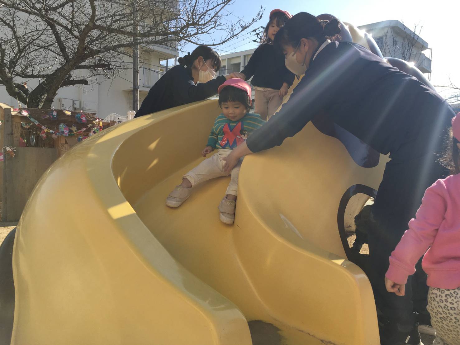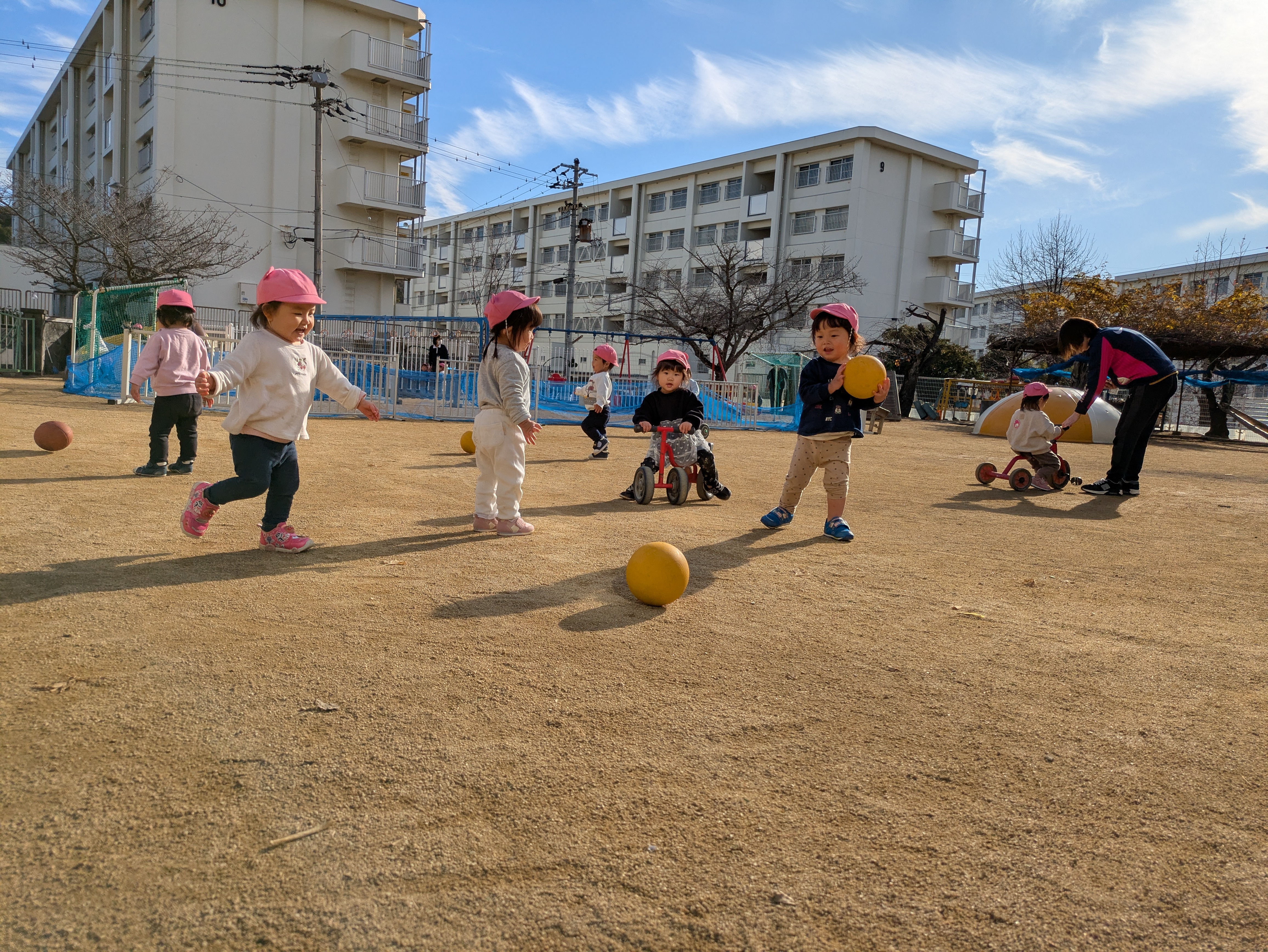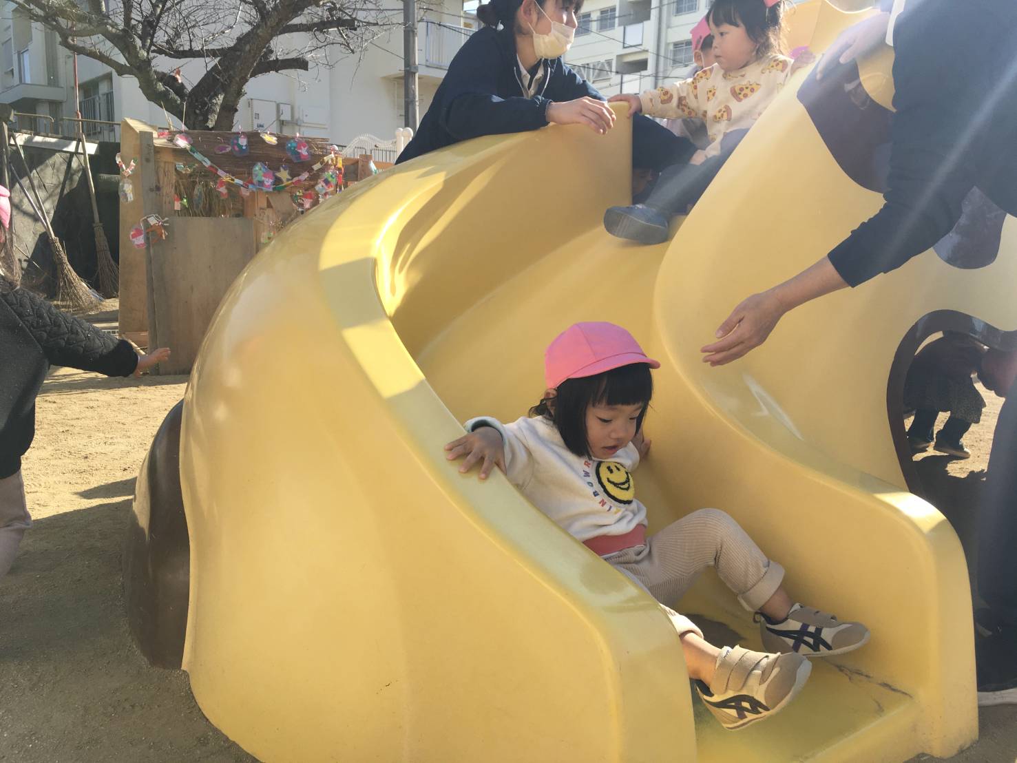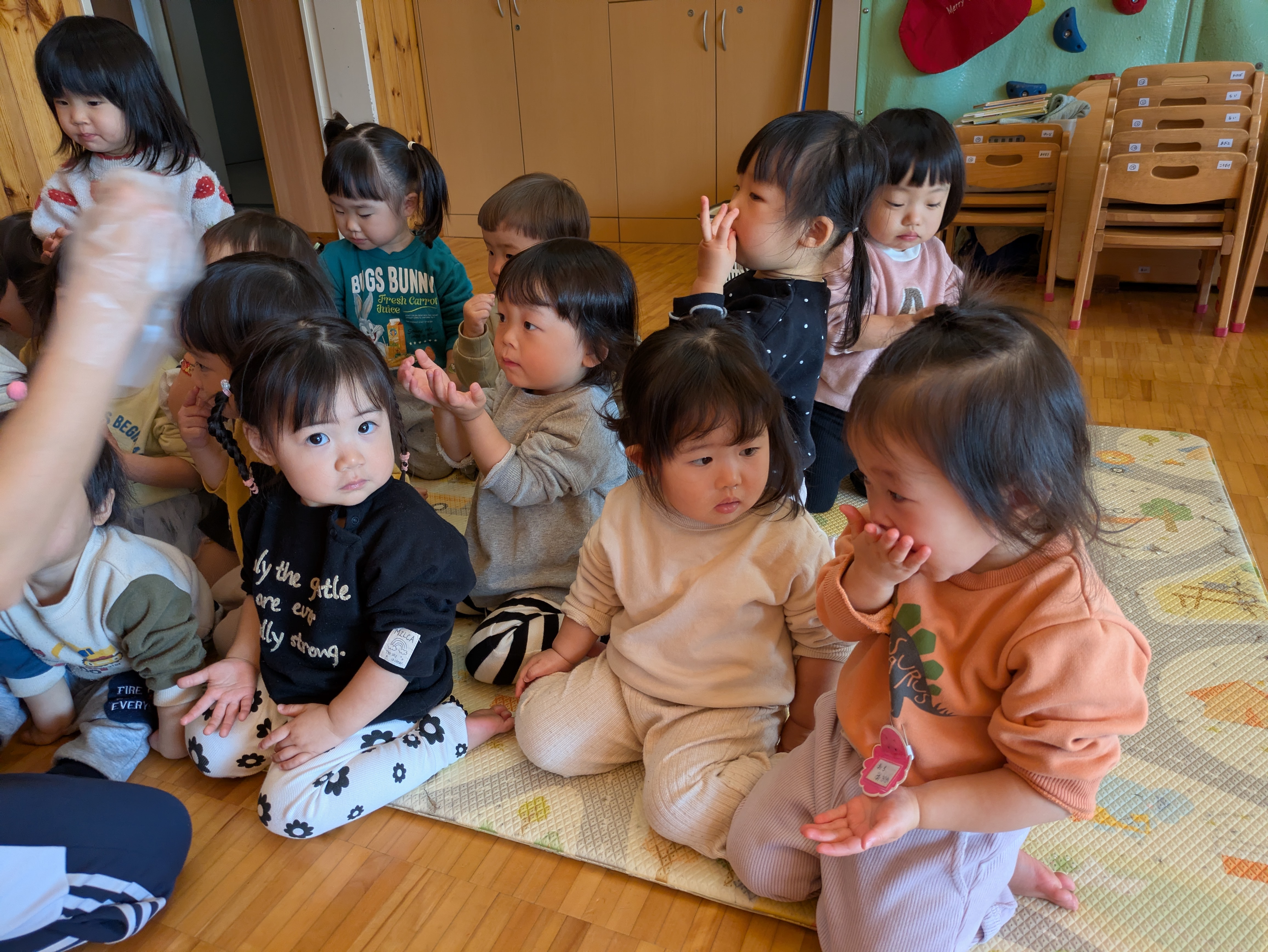 本格的な冬を感じる季節になりましたが、みかん組はお休みする子も少なく、元気いっぱい登園してきています。3階会議室では陽がよく差し込み、ぽかぽかとあたたかさを感じながら過ごしています。先週は園庭でも陽がよく当たる場所で遊ぶことができました。砂遊びをしたり、うさぎ小屋をのぞいたり、犬のすべり台をすべるなど、思い思いに楽しんでいました。