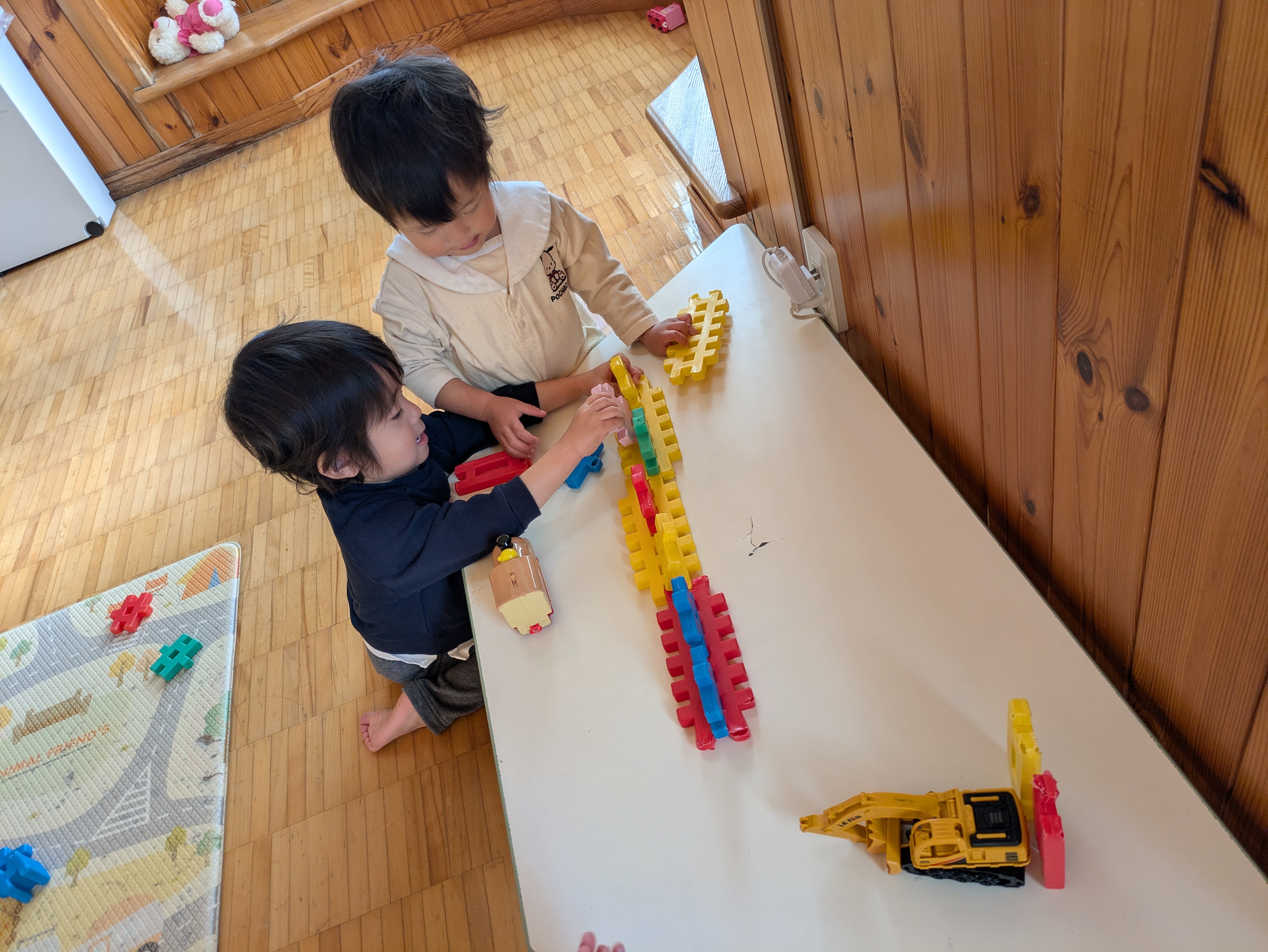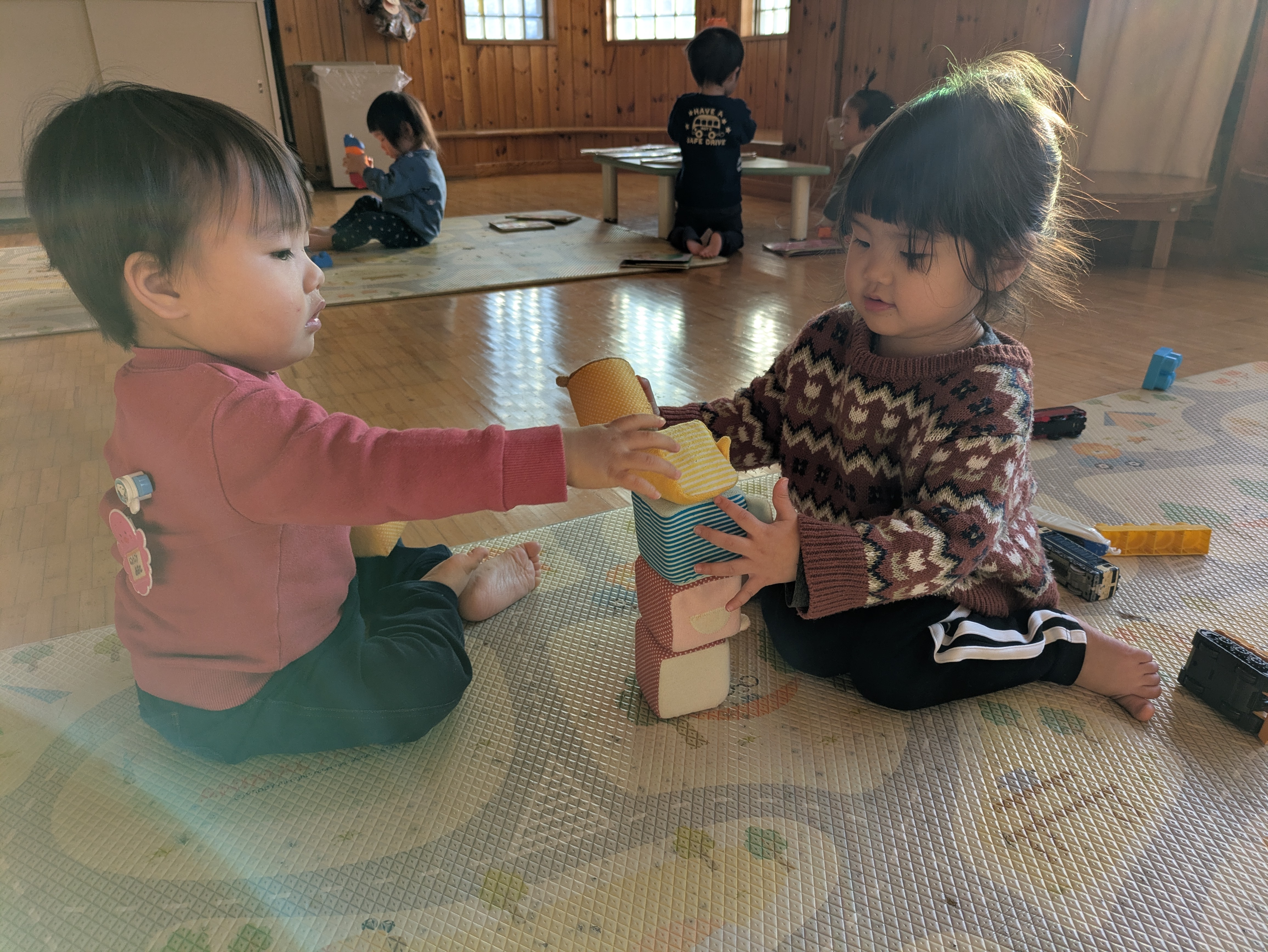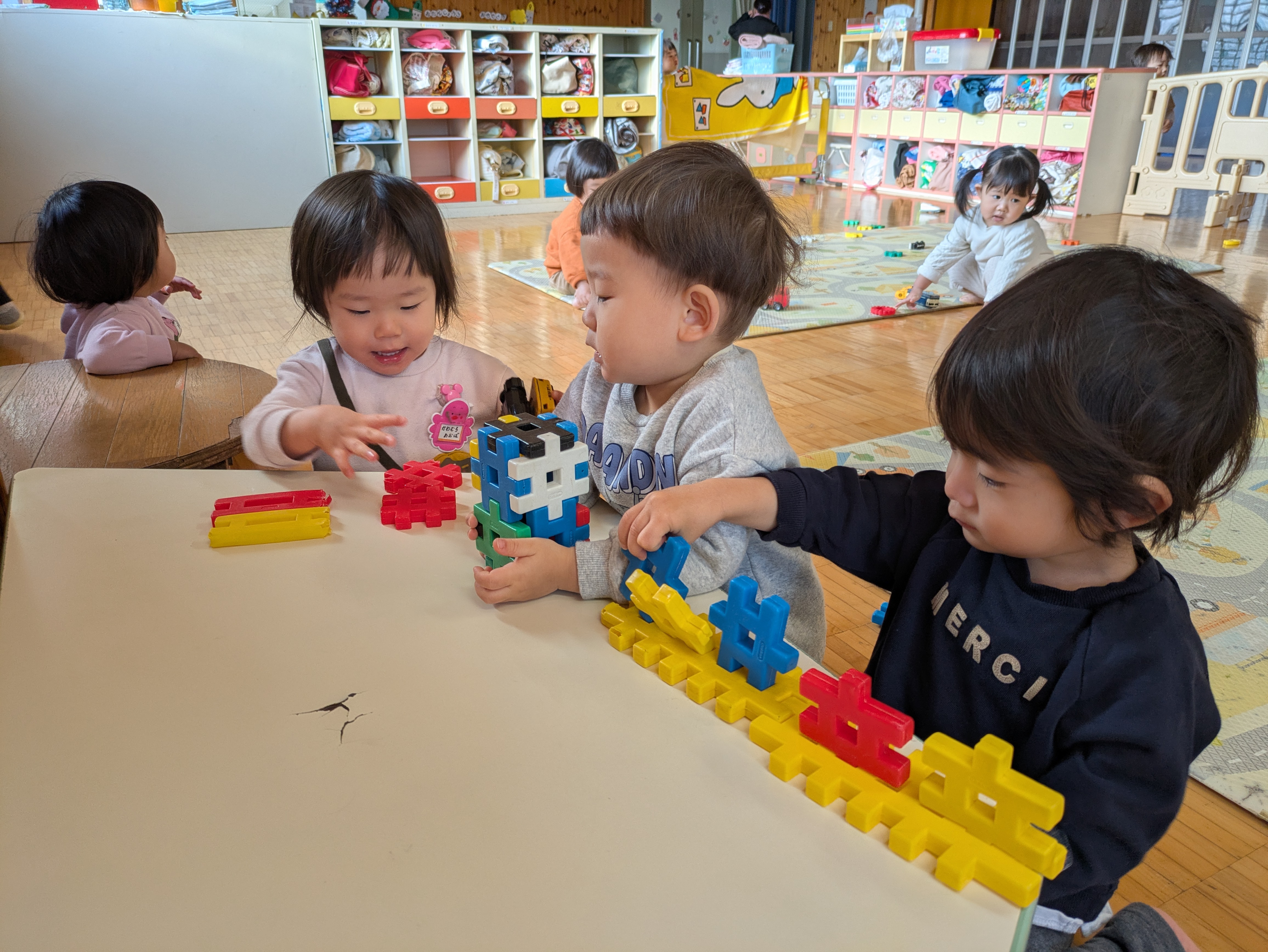 室内ではブロック遊びが進化しつつあります。保育教諭と一緒にくっつけたり、「できないー!」と助けを求めることが多かったですが、いつのまにか自分たちだけで凸凹を思うようにくっつけ、サイコロ状にすることもできるようになってきました。時には友だちが作っているものに自分の持っているブロックをはめていき、共同作品になることも。以前では、自分が遊んでいるものに触れられたり手を加えられると怒る場面がよく見られました。しかし、友だちがしようとしていることをじっと見ていたり、一緒にすることを楽しむ姿も見られるようになりました。もちろん、だめ!いや!触らないで!と拒否することもあります。そんな友だちの行動(泣いたり、大きな声を出したりなど)を見て、慌てて手を引っ込めたり、頭をヨシヨシする姿も見られ、そういう関わりの中で友だちとの距離感や力加減を学んでいっているのでしょう。Kくんはブロックを組み合わせたものを持ってきて「みてー!かいだん。」と見せてくれました。見ると本当に階段のようになっていてびっくり!それを見ていたAくん、Iちゃんも同じようにブロックを合わせてぼくも!わたしも!できたよ!と見せてくれました。こんなこともできるんだと、お互い刺激し合ってるんだなと嬉しく思いました。