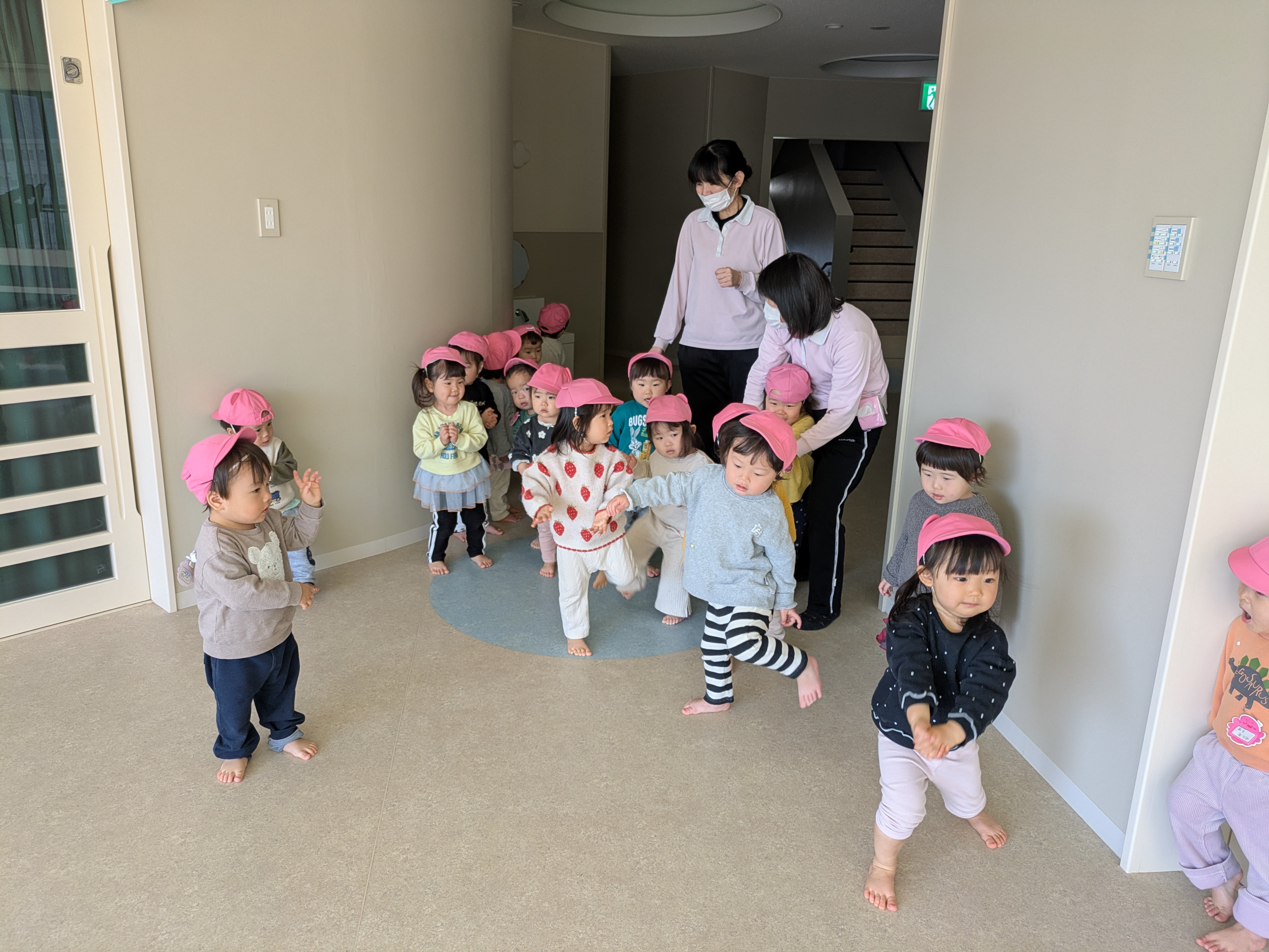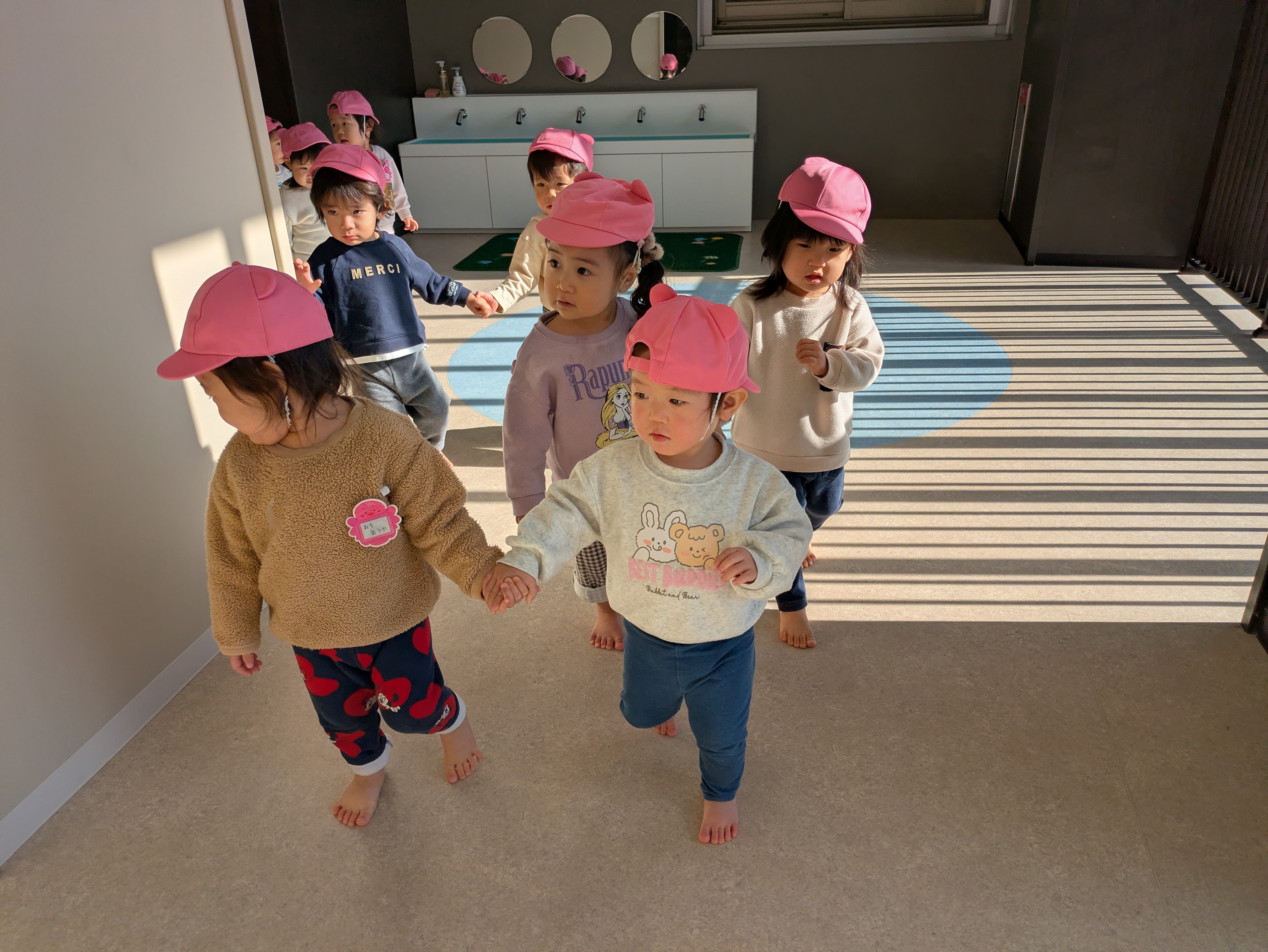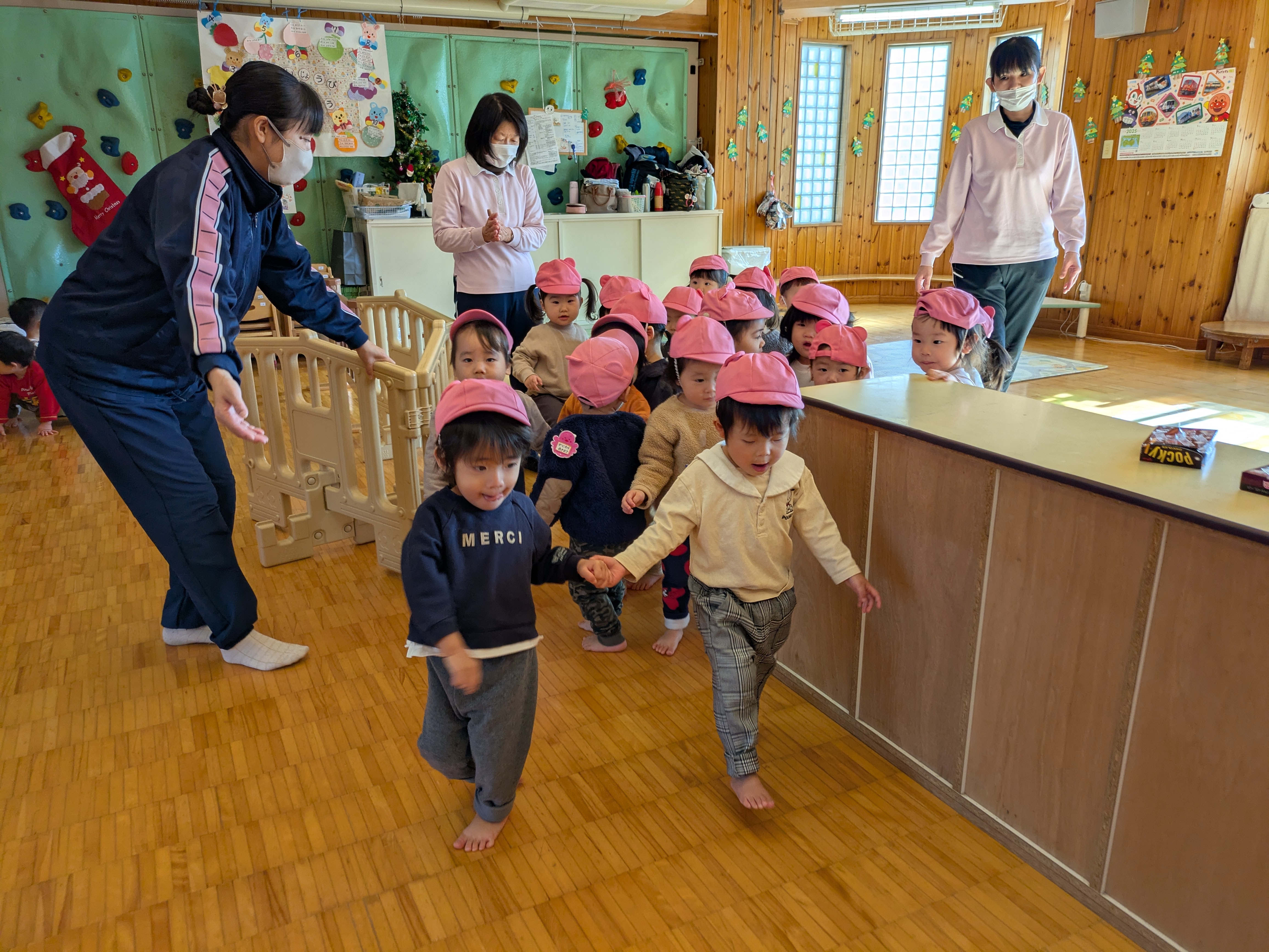 友だちとの関わりが増える中、2人ずつ手をつないでホールまで散歩に行きました。「おててつなぐよー。」と声をかけると、近くにいる友だちに手を伸ばしてぎゅっ!互いに顔を見合わせ笑い合う姿がまた何ともかわいらしかったです。「一緒に行くよ。」「ゆっくりね。」という言葉かけを聞いて、相手の方を見て歩くスピードをゆるめたり、違う方へ行こうとしたりする友だちを『こっちよ。』とリードする姿も見られました。ホールには大きなツリーやお楽しみ会の飾りがあり「きらきらー。」「さんたさん。」「まつぼっくり。」「りんご。」など見たものをはっきりとした言葉で言い合っている子どもたちの姿もありました。