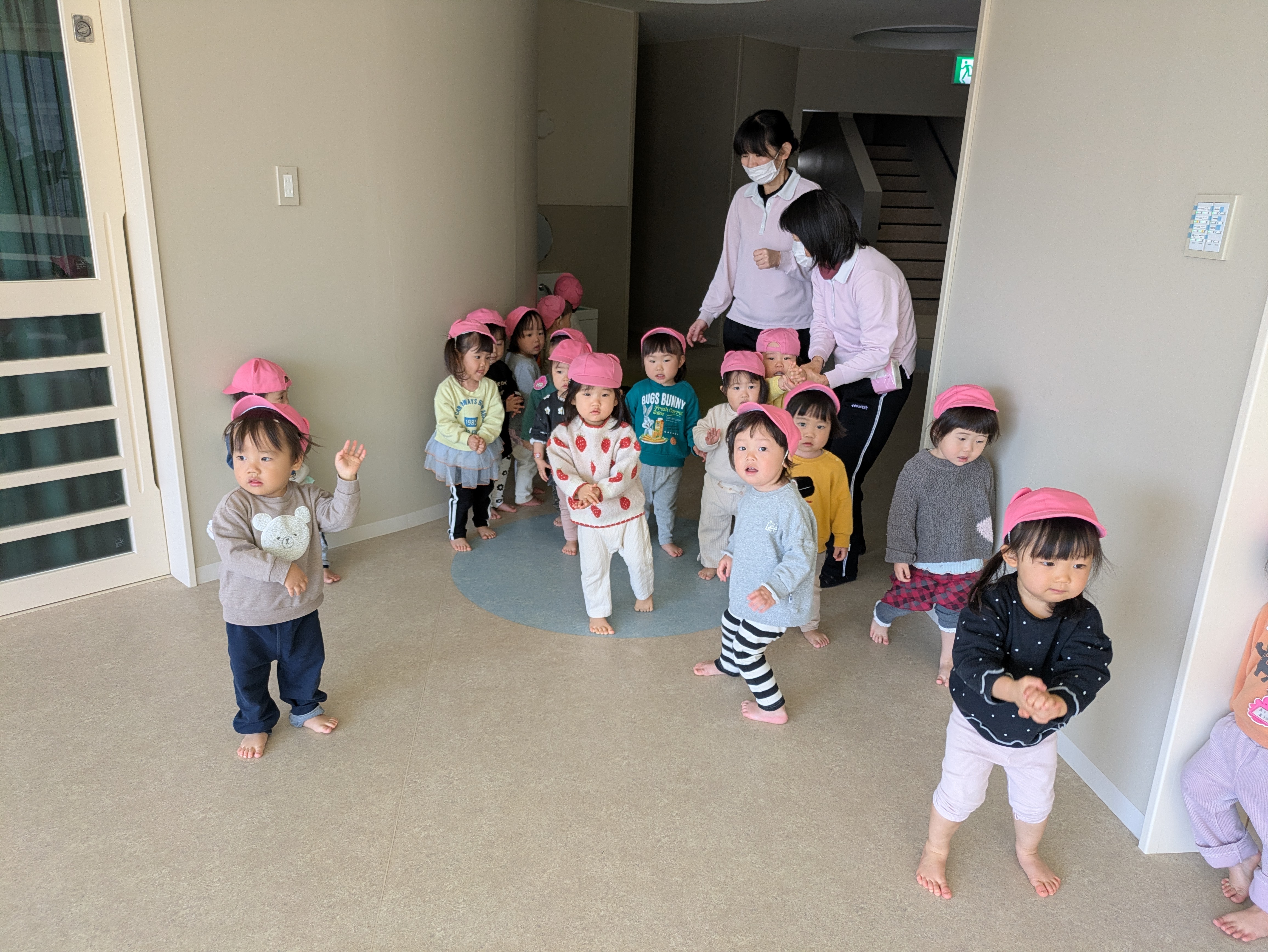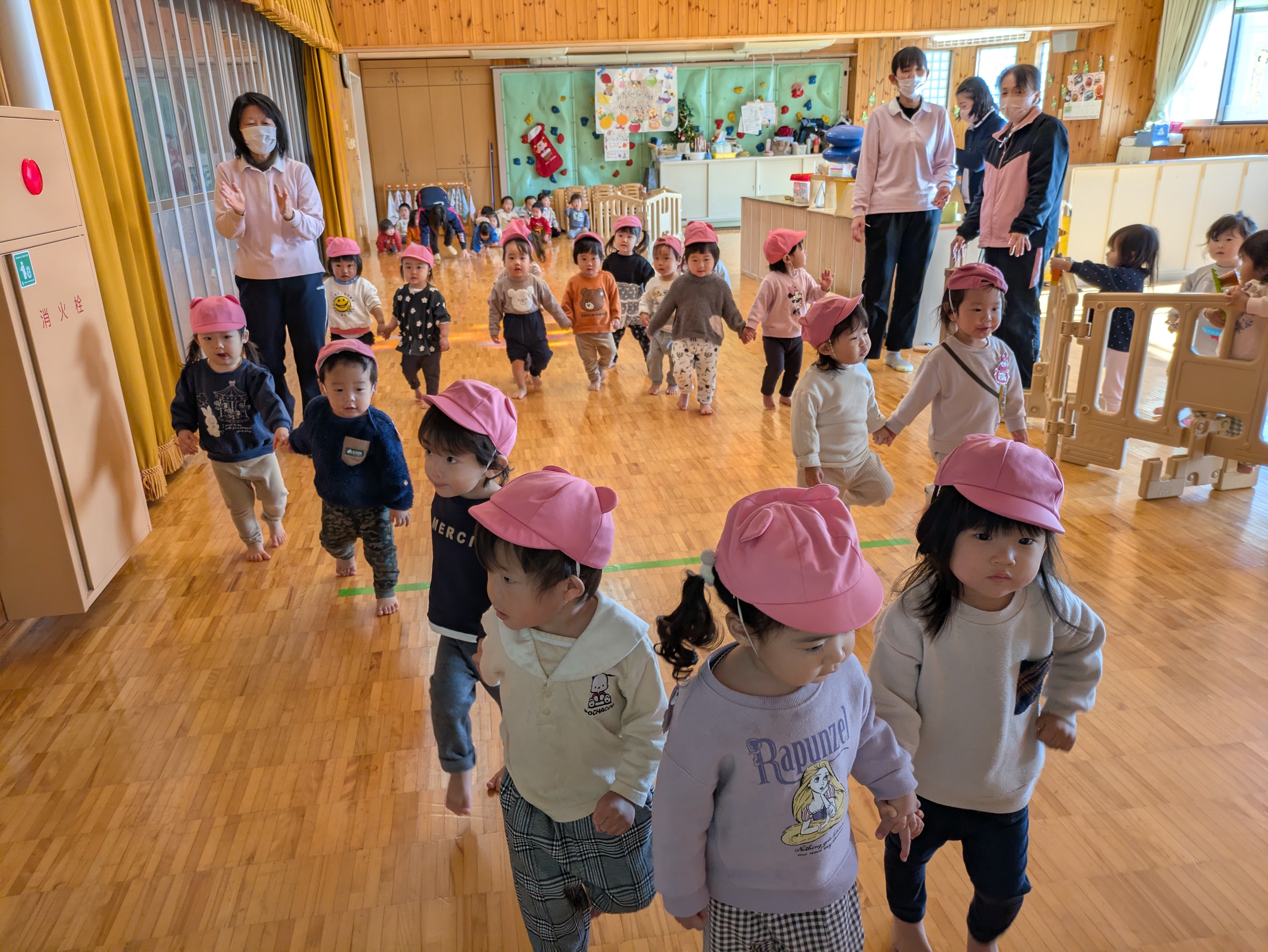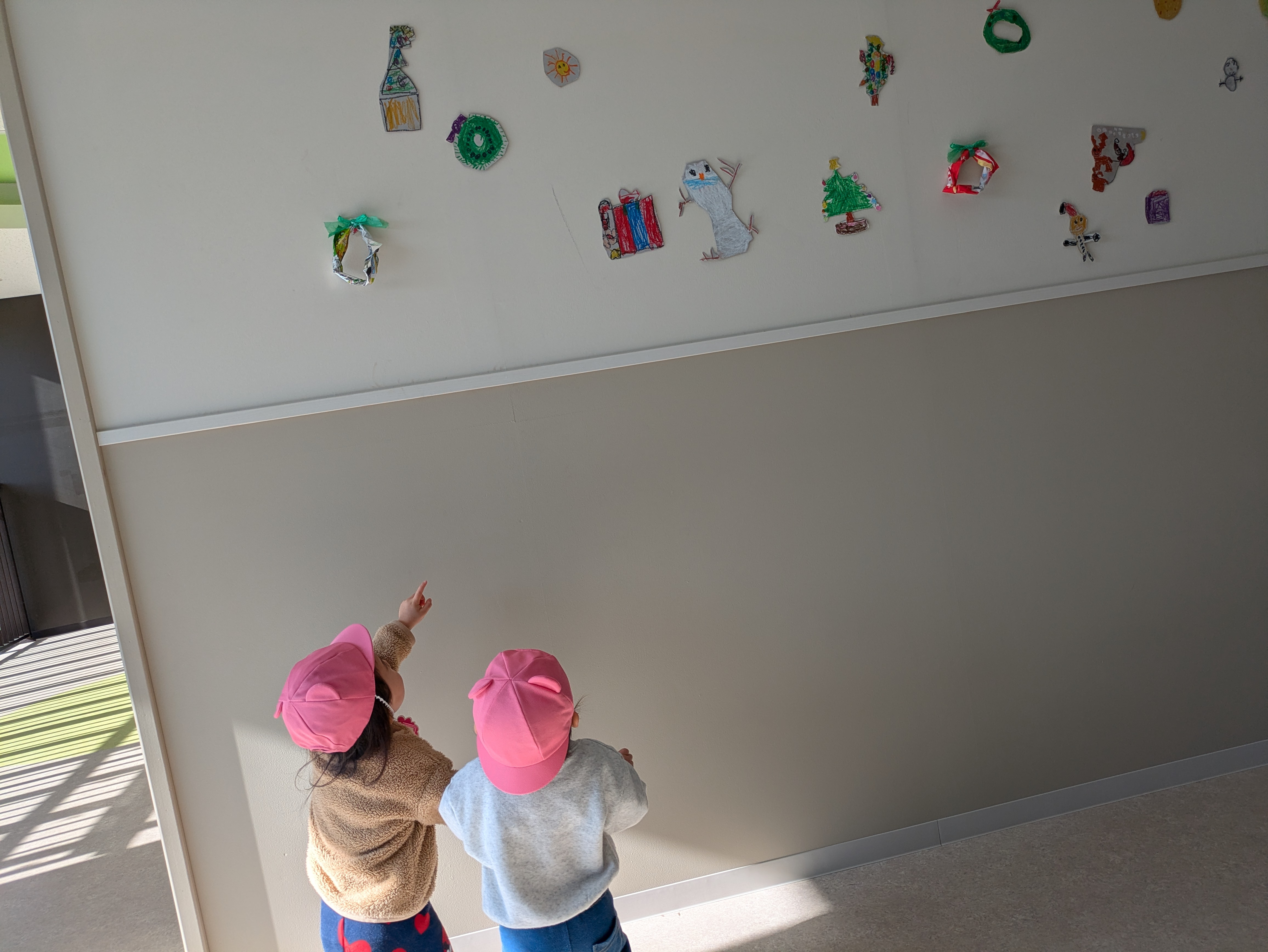 友だちとの関わりが増える中、2人ずつ手をつないでホールまで散歩に行きました。「おててつなぐよー。」と声をかけると、近くにいる友だちに手を伸ばしてぎゅっ!互いに顔を見合わせ笑い合う姿がまた何ともかわいらしかったです。「一緒に行くよ。」「ゆっくりね。」という言葉かけを聞いて、相手の方を見て歩くスピードをゆるめたり、違う方へ行こうとしたりする友だちを『こっちよ。』とリードする姿も見られました。ホールには大きなツリーやお楽しみ会の飾りがあり「きらきらー。」「さんたさん。」「まつぼっくり。」「りんご。」など見たものをはっきりとした言葉で言い合っている子どもたちの姿もありました。