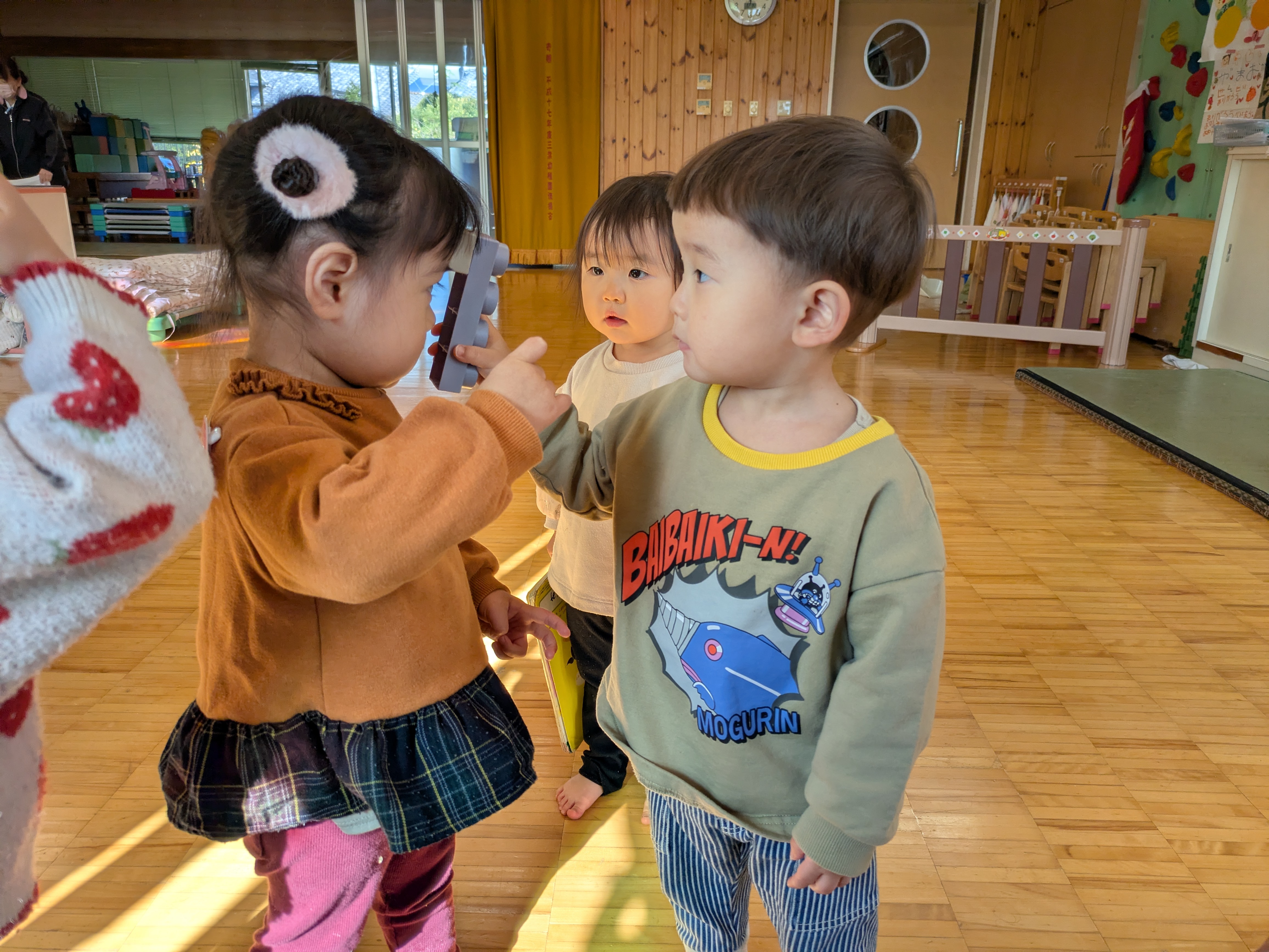 そして、また別のブロックを使っては「せんせー!ピッ!」と何かを作って持ってきました。うーん、何だろう…?と一瞬悩みましたがすぐに体温計だと分かりました。おでこにあてる、毎日使っている体温計。ブロックを体温計に見立てていたのです。友だちや保育教諭のおでこにピッ!「お熱ある?」と聞くと「なーい!」とにっこり。このように日常の身近な物をブロックや廃材などで見立てて遊ぶようにもなり、成長を感じる毎日です。