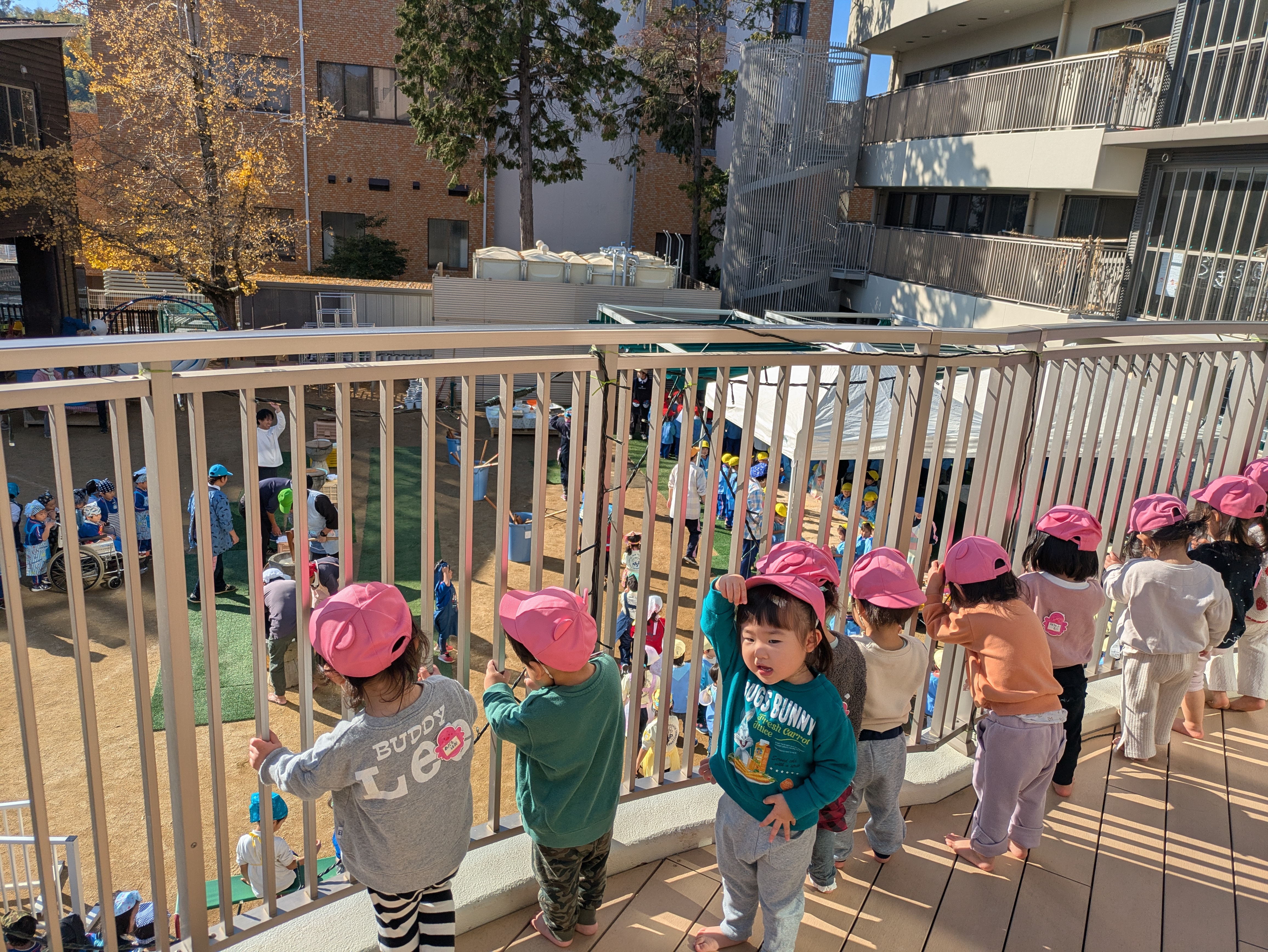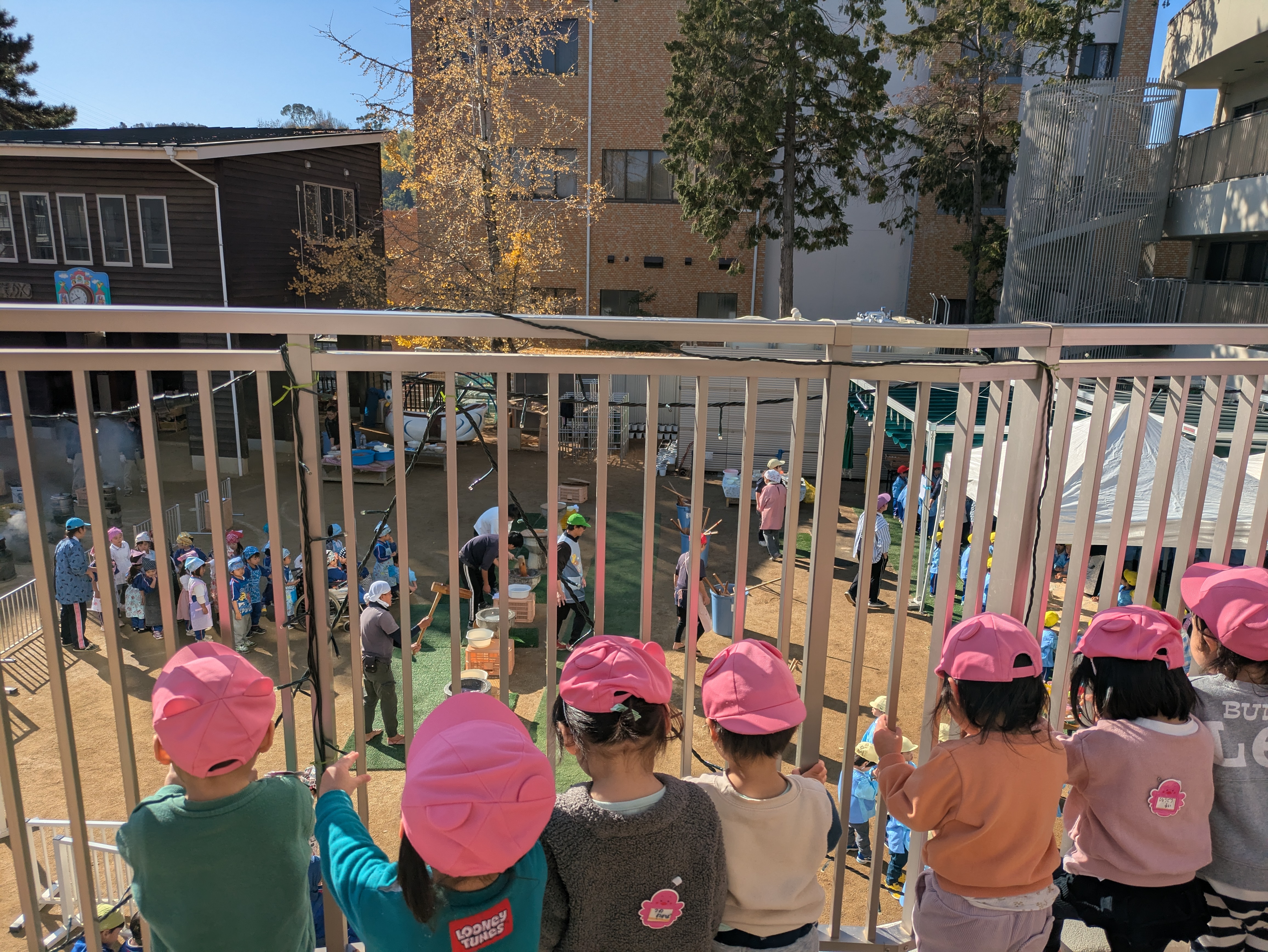 木曜日は幼稚園のもちつきがありました。参加することは難しいですが、よく見える2階のテラスから見させてもらいました。もち米を炊く煙が上がる中、にぎやかな幼稚園児達の動きが見られる園庭を真剣な表情で見つめる子どもたち。「ぺったんしてるね。」と声をかけると、両手を上下にパチンパチンとしたり、腕や足を振り上げて、おもちをつく様子を真似する子もいました。そして炊き上がった、つく前のもち米を少し分けて頂きました。「これなんだ?」と子どもたちに見せると「ごはん!」と大きな声で答える子どもたちは、早くちょうだい!と言わんばかりに両手を『お皿』にして待っていました。「よく噛んでね。」と声をかけられモグモグと動くほっぺたがとてもかわいらしかったです。