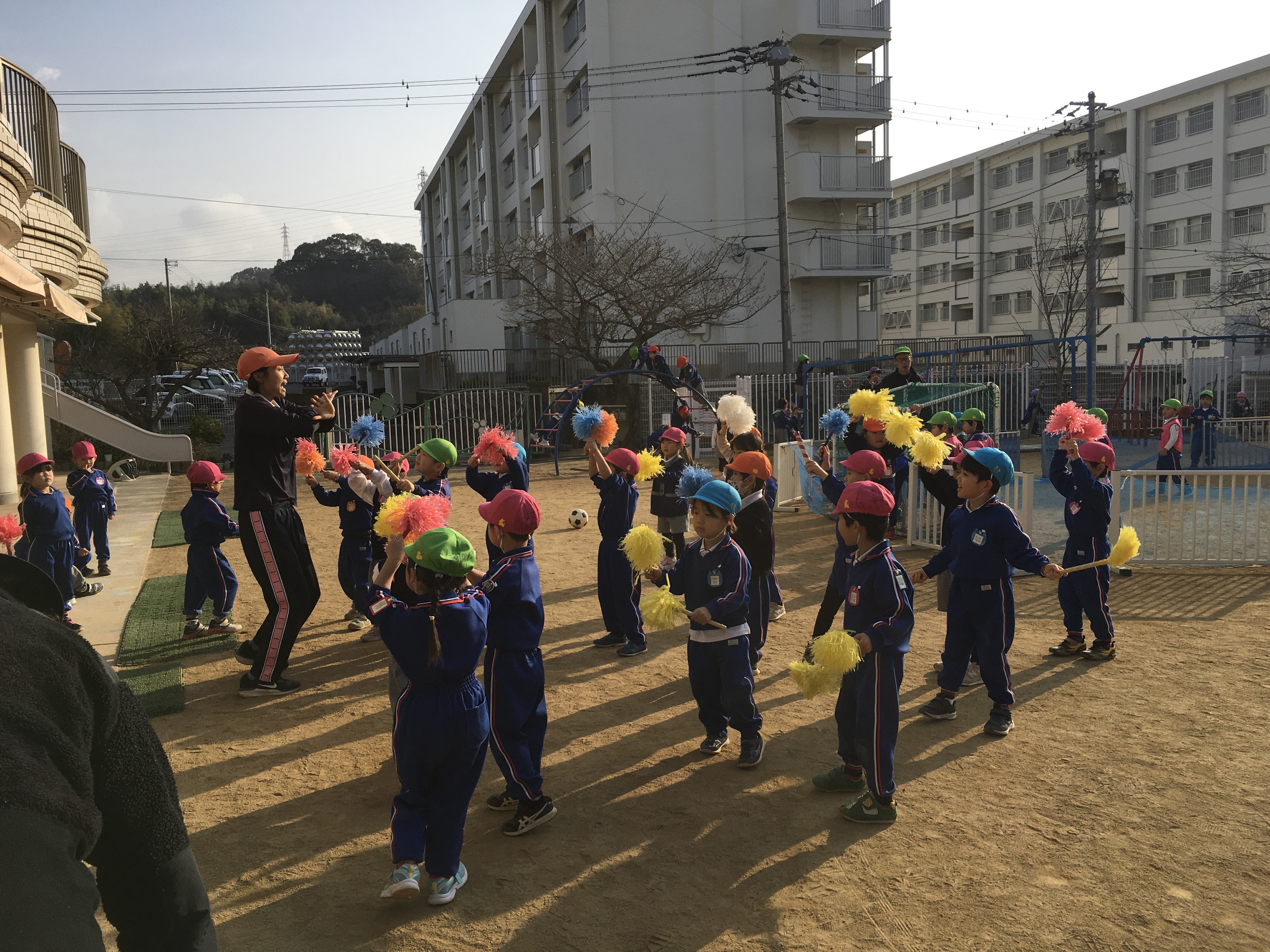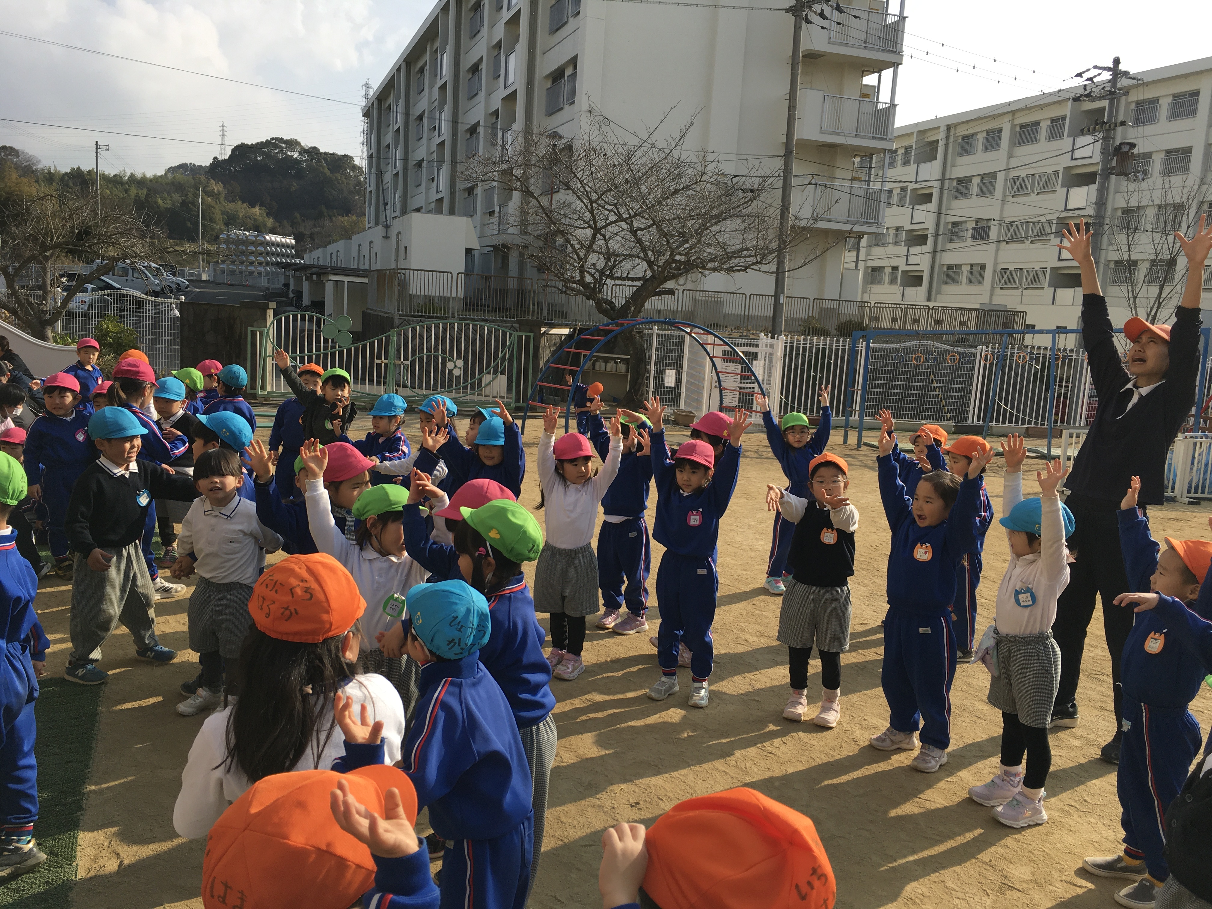 今朝、園庭のデッキから、年中が発表会でするオペレッタの曲が流れているのを子ども達がじーっと聞いていた所に古森先生がやってきて、「何してるの?踊ったらどお?」と声をかけてくれました。今は、教師が一緒に身体を動かして踊る事が大事なのに、子ども達のせっかくのやる気を見逃してしまい、やってしまった・・・と反省。気をとりなおして踊ろうとしていると、「テラスを舞台のように使ったらいいね」と、デッキ位置等を移動して、雰囲気作りをしてもらうと子ども達も一段とやる気で踊り始めました。まだまだ見様見真似ですがやる気だけは誰にも負けない年中!!子ども達と表現を楽しみながら進めていきたいと思います。