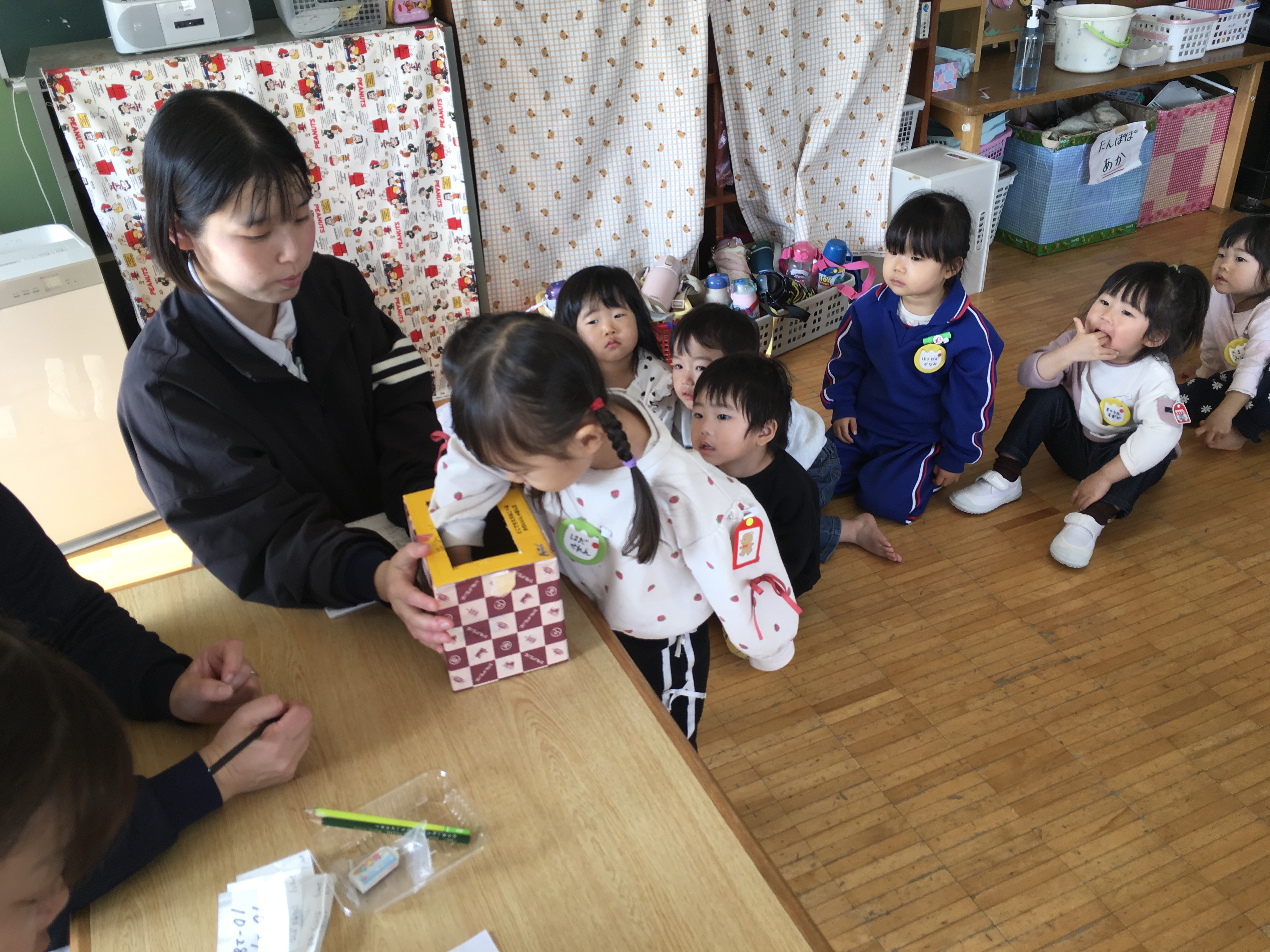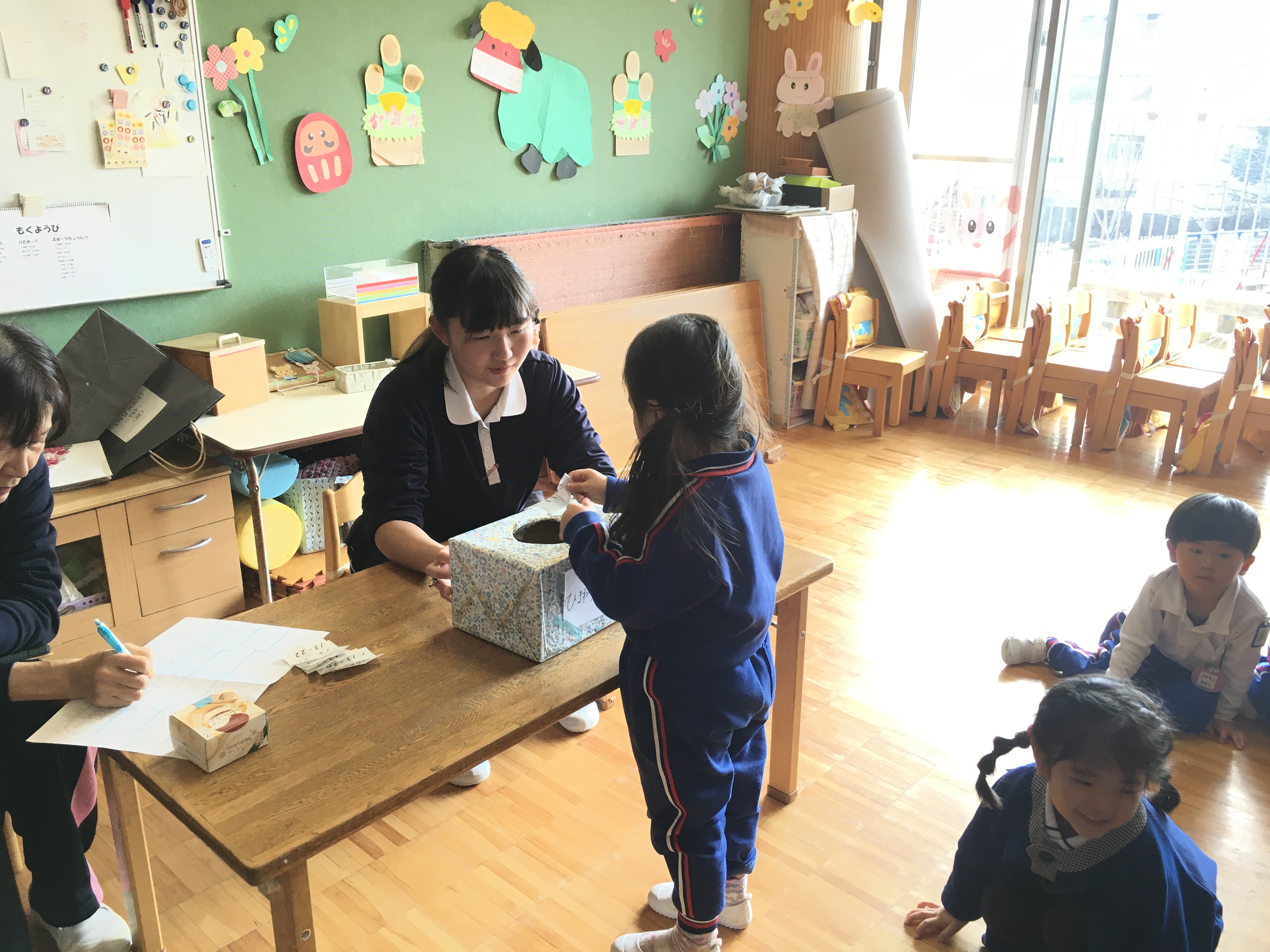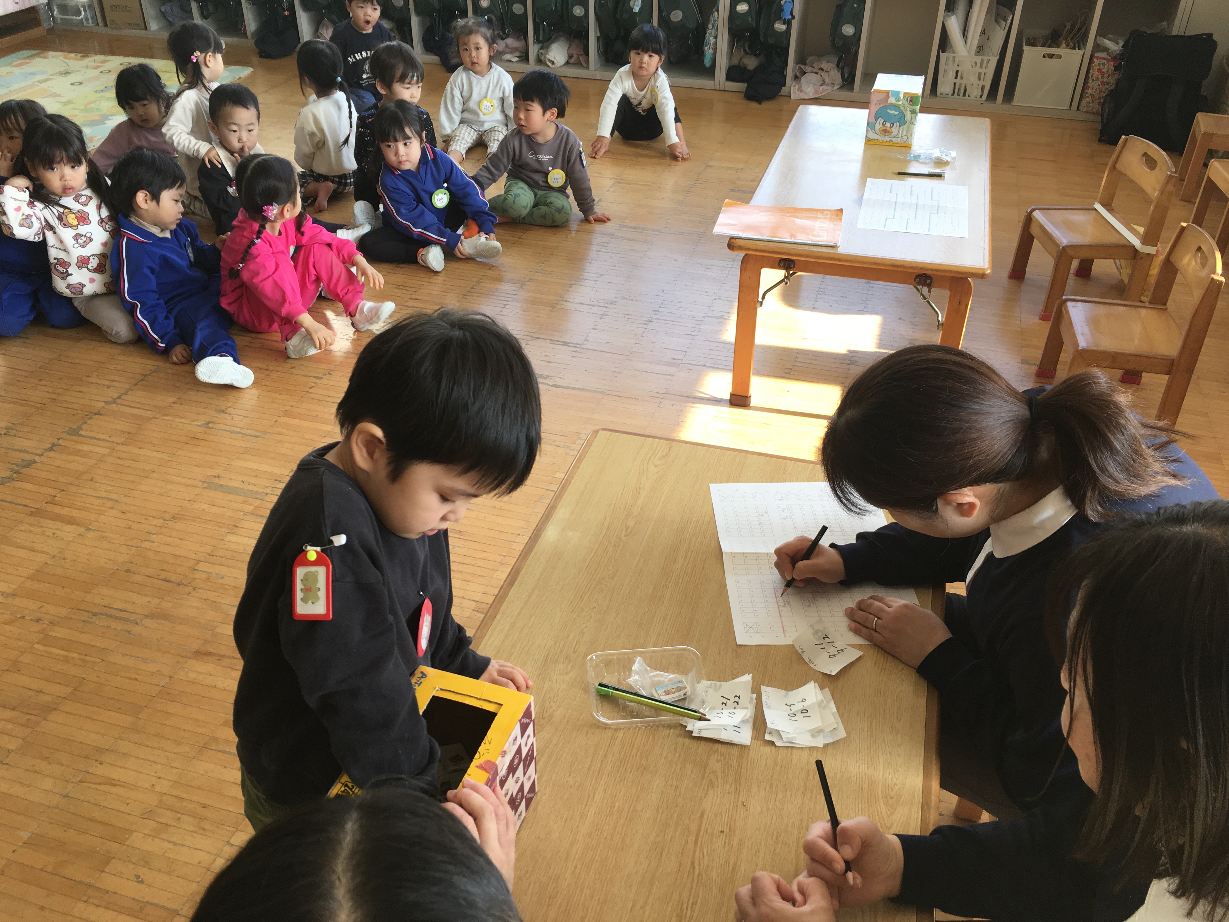 そして今日は、発表会の保護者席決めのくじ引きをしました。間違いなどないように各学年一部屋に集まって行いました。じゃんけんで男の子が先か女の子が先か順番を決めて、くじを1枚づつ引いてその番号がお父さんお母さん達の座席となります。年中は兄弟がいたため、どちらが引くか話し合いです。お姉ちゃんに任せる子もいれば妹、弟に引かせてあげる子もいて、お互いくじを引く所を見守る姿が可愛らしいなぁと思いながら、くじ引きは順調に進みました。今日、欠席の子のくじは担任が責任をもって引かせて頂き、無事に座席を決める事ができました。後日持ち帰る案内状でお確かめください。