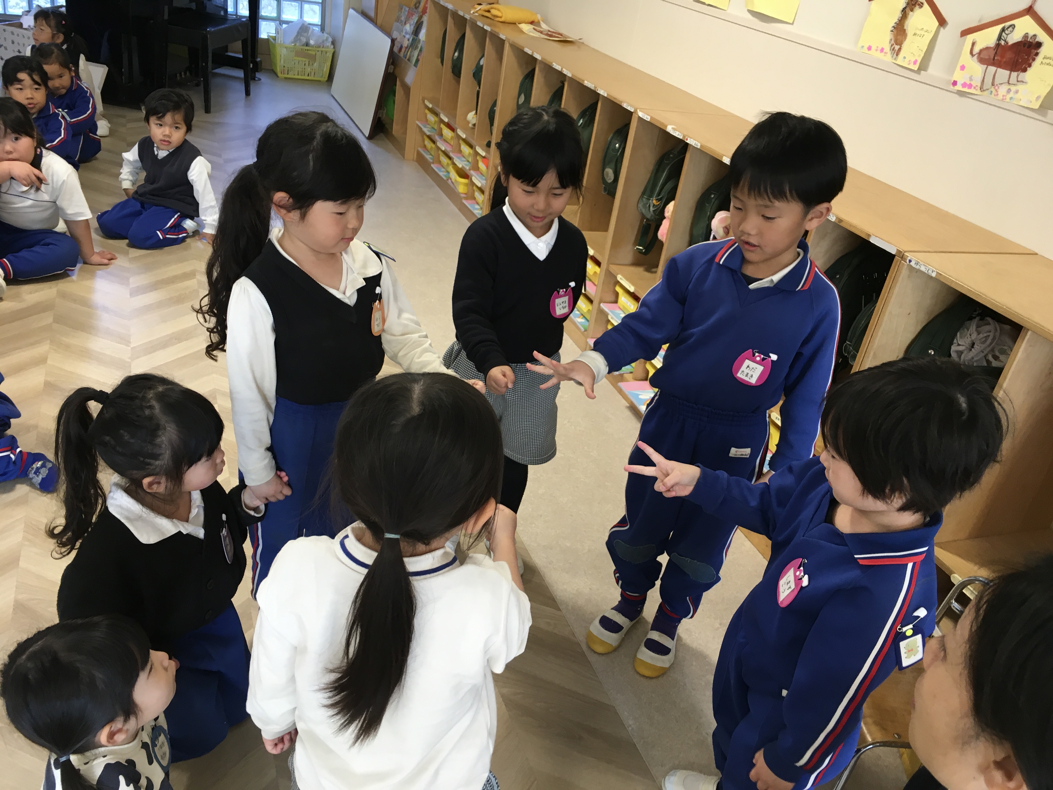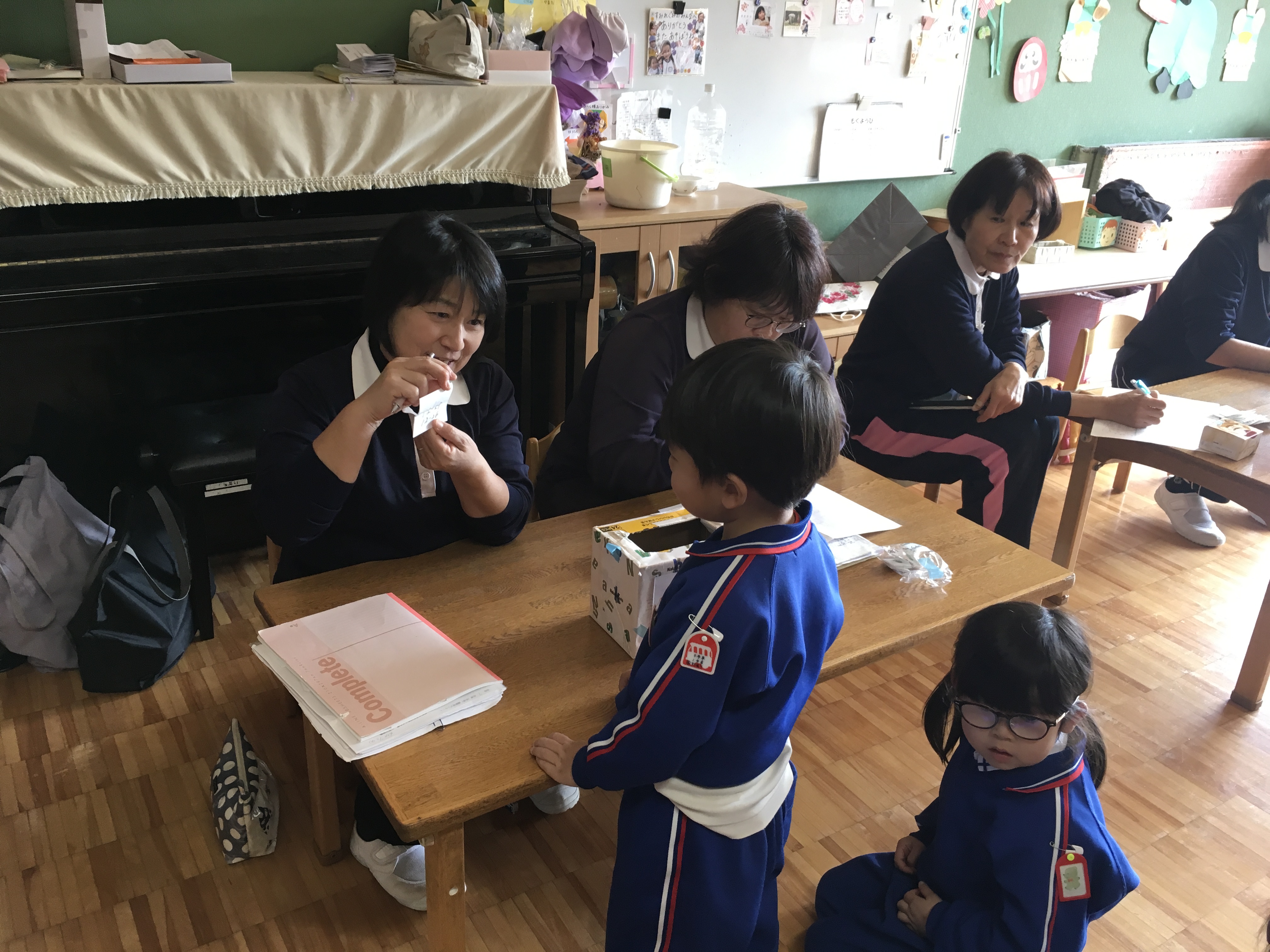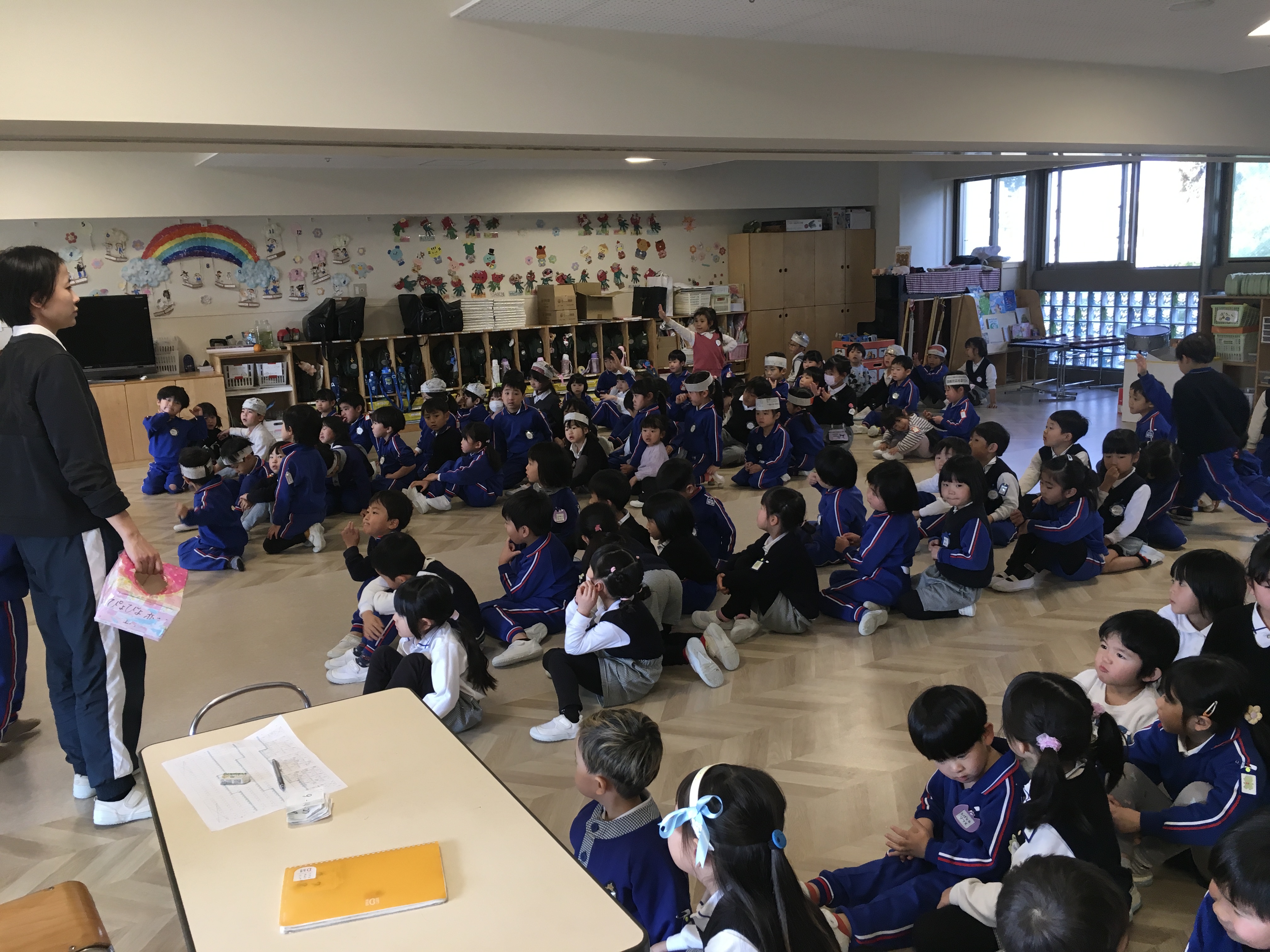 そして今日は、発表会の保護者席決めのくじ引きをしました。間違いなどないように各学年一部屋に集まって行いました。じゃんけんで男の子が先か女の子が先か順番を決めて、くじを1枚づつ引いてその番号がお父さんお母さん達の座席となります。年中は兄弟がいたため、どちらが引くか話し合いです。お姉ちゃんに任せる子もいれば妹、弟に引かせてあげる子もいて、お互いくじを引く所を見守る姿が可愛らしいなぁと思いながら、くじ引きは順調に進みました。今日、欠席の子のくじは担任が責任をもって引かせて頂き、無事に座席を決める事ができました。後日持ち帰る案内状でお確かめください。