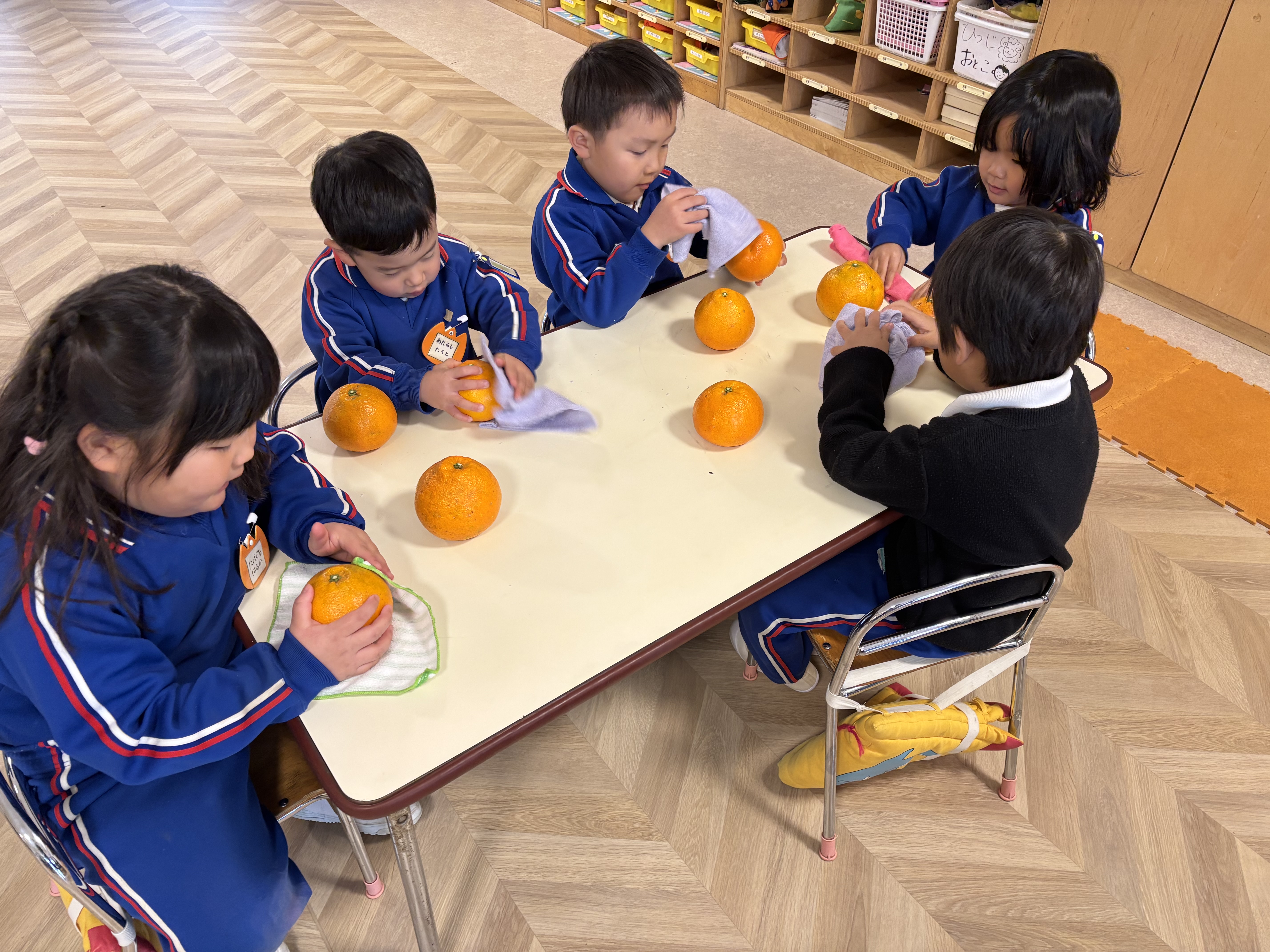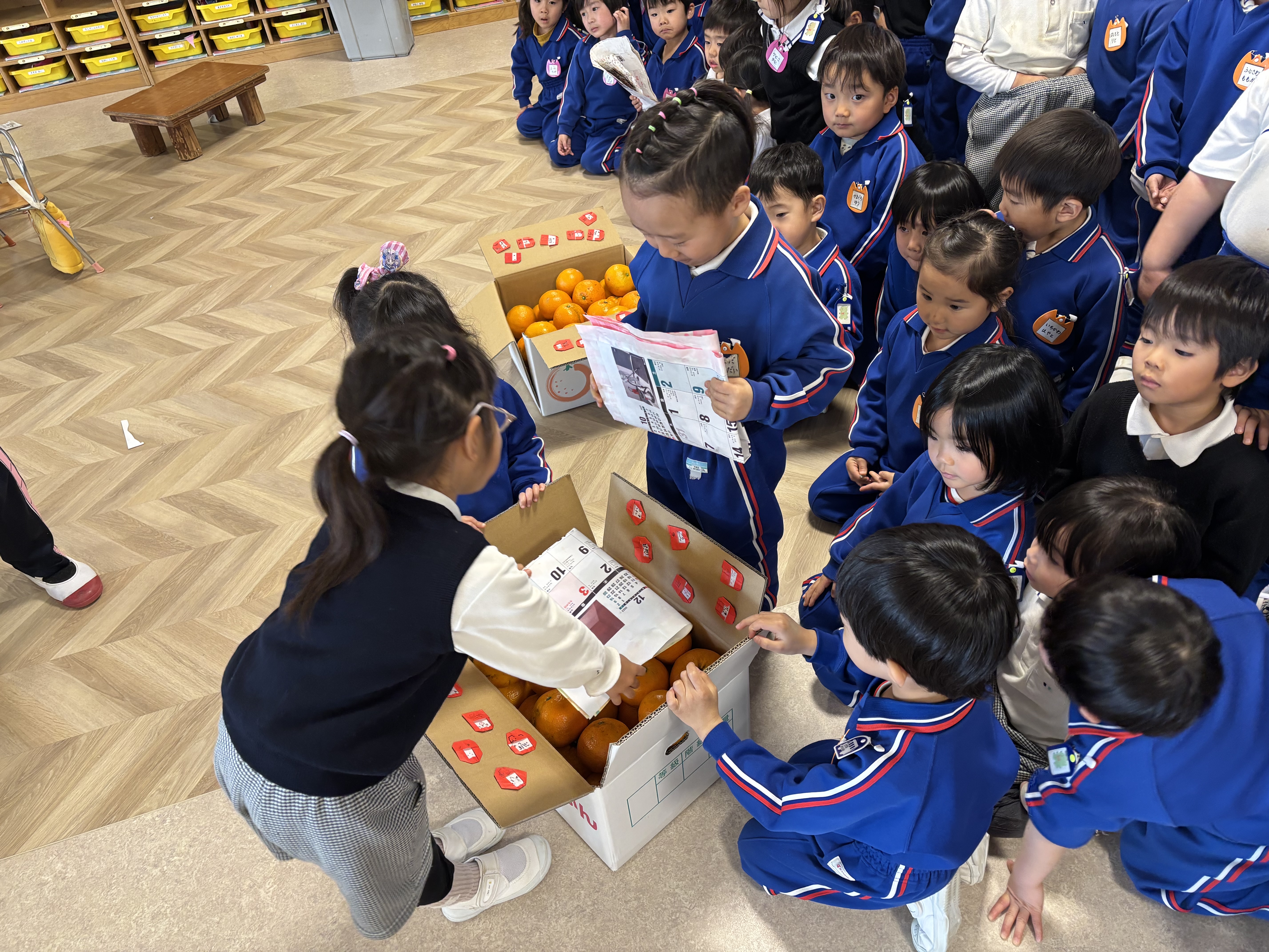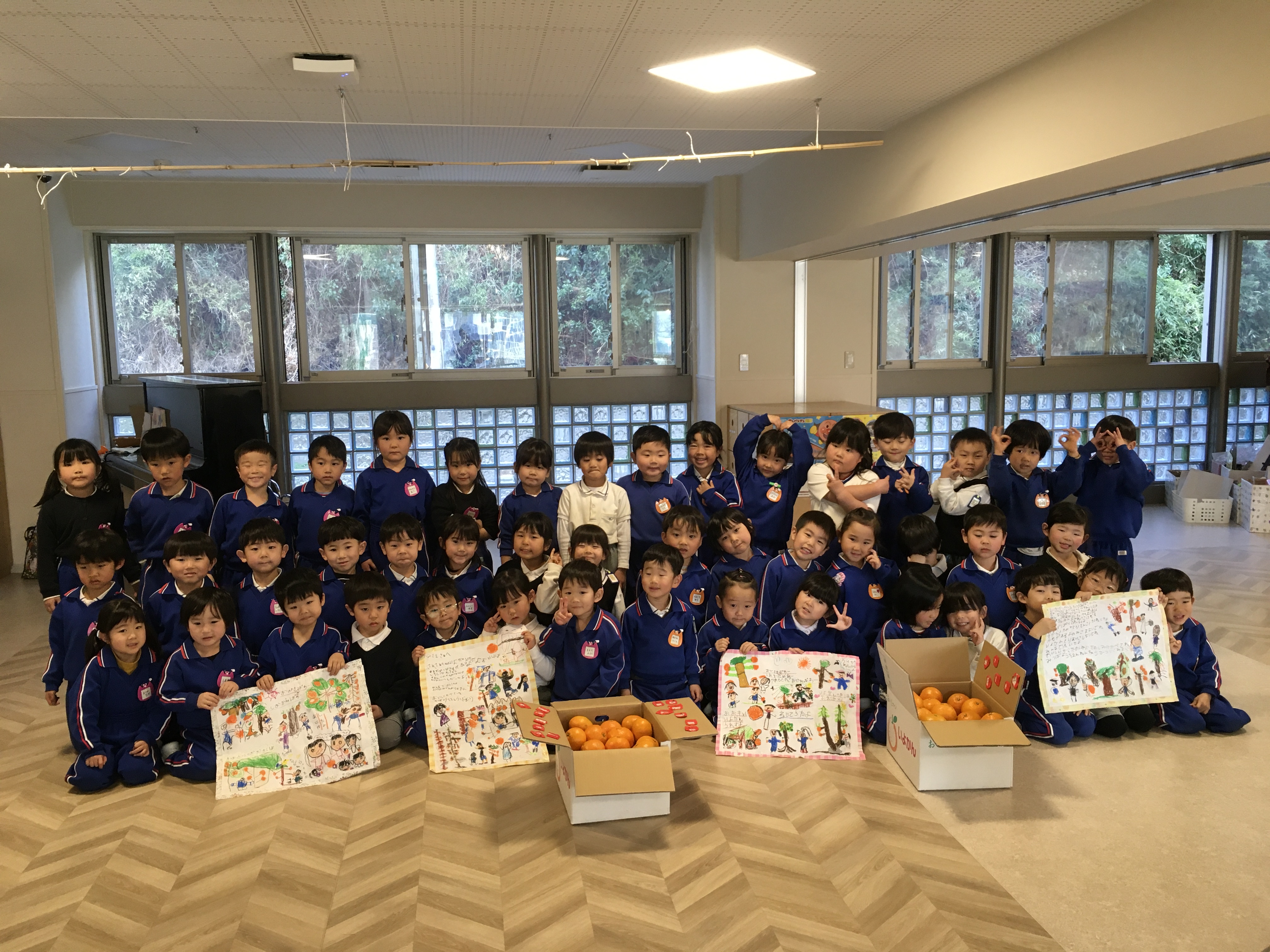 一方、年中組は一昨日さんさんらんどの果樹園で収穫したいよかんを東京の帝京幼稚園等に送る準備を昨日から進めています。美味しそうだと思ういよかんを選んで、ふきんで綺麗に汚れを落とします。するとみるみるうちにピカピカに!!色がより鮮やかになったいよかんはとても美味しそうで食べたくなる気持ちを抑えて今度はお手紙を書きました。自分達が伝えたい事を一生懸命考えながら文字にしていきます。とっても可愛らしいお手紙になりましたので写真で紹介します。見て下さい!!いよかん狩りをしている絵やいよかんを食べている所等々、素敵なお手紙になりました。東京のお友達や先生方に無事届きますように!!